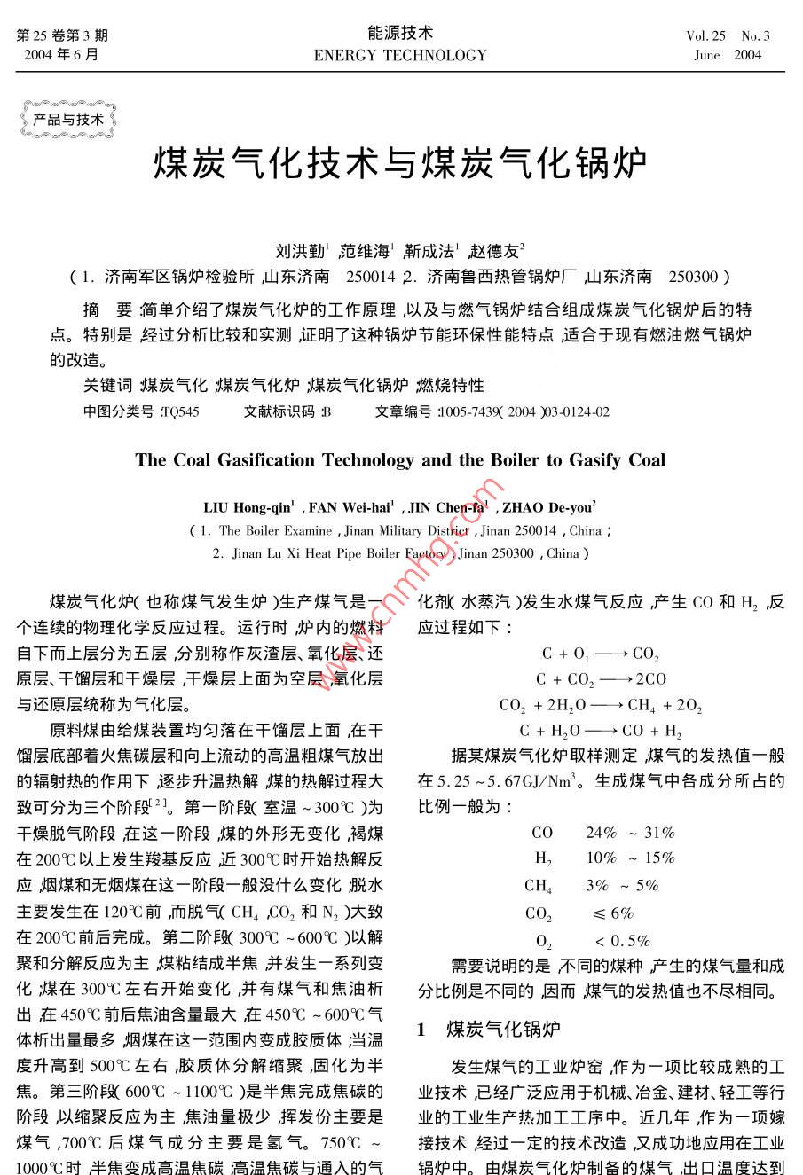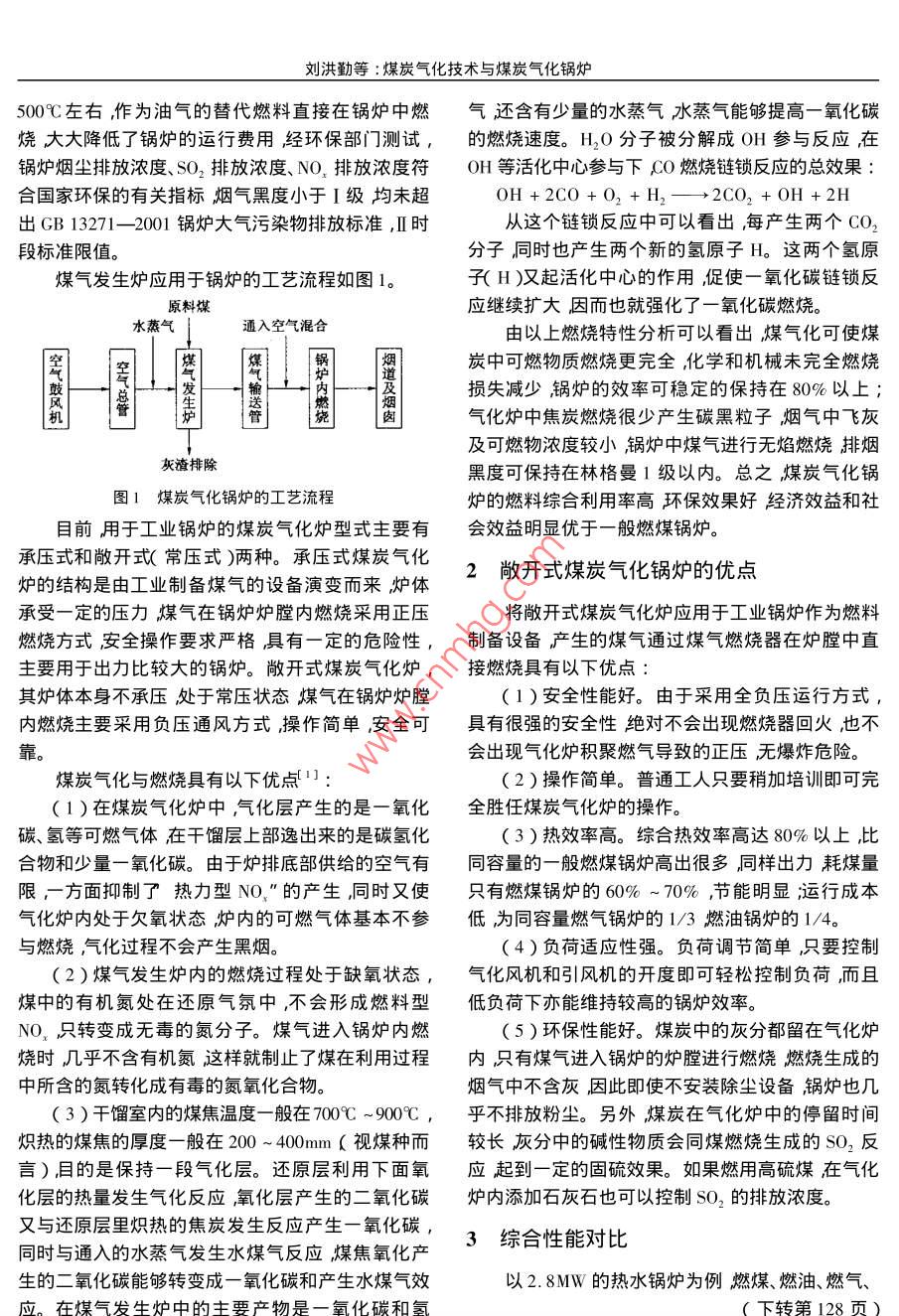 第25卷第3期能源技術(shù)Vol.25 No.3 :2004年6月ENERGY TECHNOLOGYJune 2004, 產(chǎn)品與技術(shù)煤炭氣化技術(shù)與煤炭氣化鍋爐劉洪勤’范維?!煞?趙德友( 1.濟(jì)南軍區(qū)鍋爐檢驗(yàn)所山東濟(jì)南250014 2.濟(jì)南魯西熱管鍋爐廠山東濟(jì)南250300 )摘要簡(jiǎn)單介紹了煤炭氣化爐的工作原理,以及與燃?xì)忮仩t結(jié)合組成煤炭氣化鍋爐后的特點(diǎn)。特別是經(jīng)過(guò)分析比較和實(shí)測(cè),證明了這種鍋爐節(jié)能環(huán)保性能特點(diǎn)適合于現(xiàn)有燃油燃?xì)忮仩t的改造。關(guān)鍵詞煤炭氣化煤炭氣化爐煤炭氣化鍋爐燃燒特性中圖分類號(hào):TQ545文獻(xiàn)標(biāo)識(shí)碼B文章編號(hào):1005-7439( 2004 )03-0124-02The Coal Gasification Technology and the Boiler to Gasify CoalLIU Hong-qin' , FAN Wei-hai' , JIN Chen-fa' , ZHAO De-you'( 1. The Boiler Examine , Jinan Military District ,Jinan 250014 , China ; .2. Jinan Lu Xi Heat Pipe Boiler Factory ,Jinan 250300 , China )煤炭氣化爐(也稱煤氣發(fā)生爐)生產(chǎn)煤氣是一化劑水蒸汽)發(fā)生水煤氣反應(yīng)產(chǎn)生CO和H2 ,反個(gè)連續(xù)的物理化學(xué)反應(yīng)過(guò)程。運(yùn)行時(shí),爐內(nèi)的燃料應(yīng)過(guò)程如下:自下而上層分為五層,分別稱作灰渣層、氧化層、還C +0,→→CO,原層、干餾層和干燥層,干燥層上面為空層氧化層C+CO,-→2CO與還原層統(tǒng)稱為氣化層。CO2 + 2H20一→CH4 + 202原料煤由給煤裝置均勻落在干餾層上面在干C+H20-→CO+H,餾層底部著火焦碳層和向上流動(dòng)的高溫粗煤氣放出據(jù)某煤炭氣化爐取樣測(cè)定煤氣的發(fā)熱值- -般的輻射熱的作用下逐步升溫?zé)峤饷旱臒峤膺^(guò)程大在5.25 ~5.67GJ/Nm。生成煤氣中各成分所占的致可分為三個(gè)階段。第一階段(室溫~ 300C )為比例一般為:干燥脫氣階段在這一階段,煤的外形無(wú)變化褐煤CO24% ~ 31%在200C以上發(fā)生羧基反應(yīng)近300°C時(shí)開(kāi)始熱解反H210% ~ 15%應(yīng)煙煤和無(wú)煙煤在這一階段一般沒(méi)什么變化脫水CH43%~5%主要發(fā)生在120C前,而脫氣( CH4 ,CO2 和N2 )大致CO2≤ 6%在200C前后完成。第二階段( 300C ~ 6009C )以解< 0.5%聚和分解反應(yīng)為主煤粘結(jié)成半焦并發(fā)生一系列變需要說(shuō)明的是不同的煤種產(chǎn)生的煤氣量和成化;煤在300°C左右開(kāi)始變化,并有煤氣和焦油析分比例是不同的,因而煤氣的發(fā)熱值也不盡相同。出在4509C前后焦油含量最大在4509C ~ 600C氣1煤炭氣化鍋爐體析出量最多煙煤在這一范圍內(nèi)變成膠質(zhì)體;當(dāng)溫度升高到500C左右膠質(zhì)體分解縮聚,固化為半發(fā)生煤氣的工業(yè)爐窯作為-項(xiàng)比較成熟的工焦。第三階段(6009C~1100C)是半焦完成焦碳的業(yè)技術(shù),已經(jīng)廣泛應(yīng)用于機(jī)械、冶金、建材、輕工等行;階段,以縮聚反應(yīng)為主焦油量極少揮發(fā)份主要是業(yè)的工業(yè)生產(chǎn)熱加工工序中。近幾年作為一項(xiàng)嫁煤氣,700C后煤氣成分主要是氫氣。750C ~接技術(shù)經(jīng)過(guò)一定的技術(shù)改造,又成功地應(yīng)用在工業(yè)1000C時(shí)半焦變成高溫焦碳高溫焦碳與通入的氣鍋爐中。 由煤炭氣化爐制備的煤氣出口溫度達(dá)到劉洪勤等:煤炭氣化技術(shù)與煤炭氣化鍋爐500C左右,作為油氣的替代燃料直接在鍋爐中燃?xì)膺€含有少量的水蒸氣水蒸氣能夠提高一氧化碳燒大大降低了鍋爐的運(yùn)行費(fèi)用,經(jīng)環(huán)保部門測(cè)試,的燃燒速度。H2O 分子被分解成OH參與反應(yīng)在鍋爐煙塵排放濃度、SO2排放濃度、NO,排放濃度符0H等活化中心參與下CO燃燒鏈鎖反應(yīng)的總效果:合國(guó)家環(huán)保的有關(guān)指標(biāo)煙氣黑度小于I級(jí)均未超OH+2C0+O2+H,-→2C02+0H+2H出GB 13271- -2001鍋爐大氣污染物排放標(biāo)準(zhǔn),II 時(shí)從這個(gè)鏈鎖反應(yīng)中可以看出,每產(chǎn)生兩個(gè)CO2段標(biāo)準(zhǔn)限值。分子同時(shí)也產(chǎn)生兩個(gè)新的氫原子H。這兩個(gè)氫原煤氣發(fā)生爐應(yīng)用于鍋爐的工藝流程如圖1??? H )又起活化中心的作用,促使一氧化碳鏈鎖反原料煤.應(yīng)繼續(xù)擴(kuò)大,因而也就強(qiáng)化了一氧化碳燃燒。水蒸氣通入空氣混合由以上燃燒特性分析可以看出煤氣化可使煤道炭中可燃物質(zhì)燃燒更完全化學(xué)和機(jī)械未完全燃燒鼓一輸及損失減少,鍋爐的效率可穩(wěn)定的保持在80%以上;煙機(jī)肉|氣化爐中焦炭燃燒很少產(chǎn)生碳黑粒子煙氣中飛灰及可燃物濃度較小,鍋爐中煤氣進(jìn)行無(wú)焰燃燒排煙灰渣排除黑度可保持在林格曼1級(jí)以內(nèi)。總之煤炭氣化鍋圖1煤炭氣化鍋爐的工藝流程爐的燃料綜合利用率高環(huán)保效果好經(jīng)濟(jì)效益和社目前用于工業(yè)鍋爐的煤炭氣化爐型式主要有會(huì)效益明顯優(yōu)于--般燃煤鍋爐。承壓式和敞開(kāi)式(常壓式)兩種。承壓式煤炭氣化2敞開(kāi) 式煤炭氣化鍋爐的優(yōu)點(diǎn)爐的結(jié)構(gòu)是由工業(yè)制備煤氣的設(shè)備演變而來(lái)爐體承受一定的壓力煤氣在鍋爐爐膛內(nèi)燃燒采用正壓將敞開(kāi)式煤炭氣化爐應(yīng)用于工業(yè)鍋爐作為燃料燃燒方式,安全操作要求嚴(yán)格,具有-定的危險(xiǎn)性,制備設(shè)備產(chǎn)生的煤氣通過(guò)煤氣燃燒器在爐膛中直主要用于出力比較大的鍋爐。敞開(kāi)式煤炭氣化爐,接燃燒具有以下優(yōu