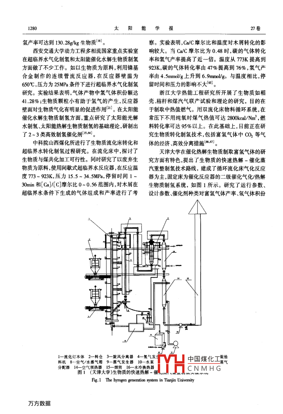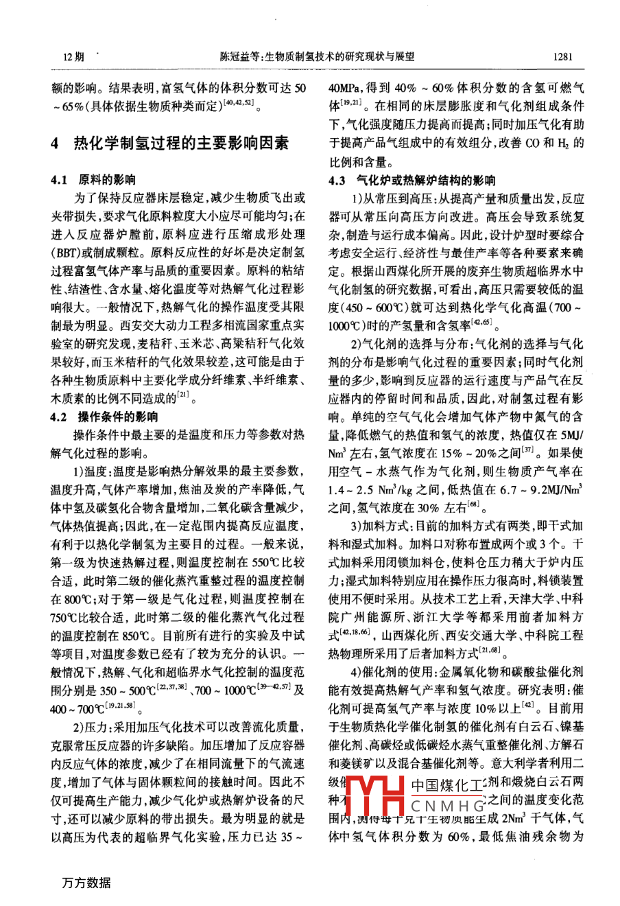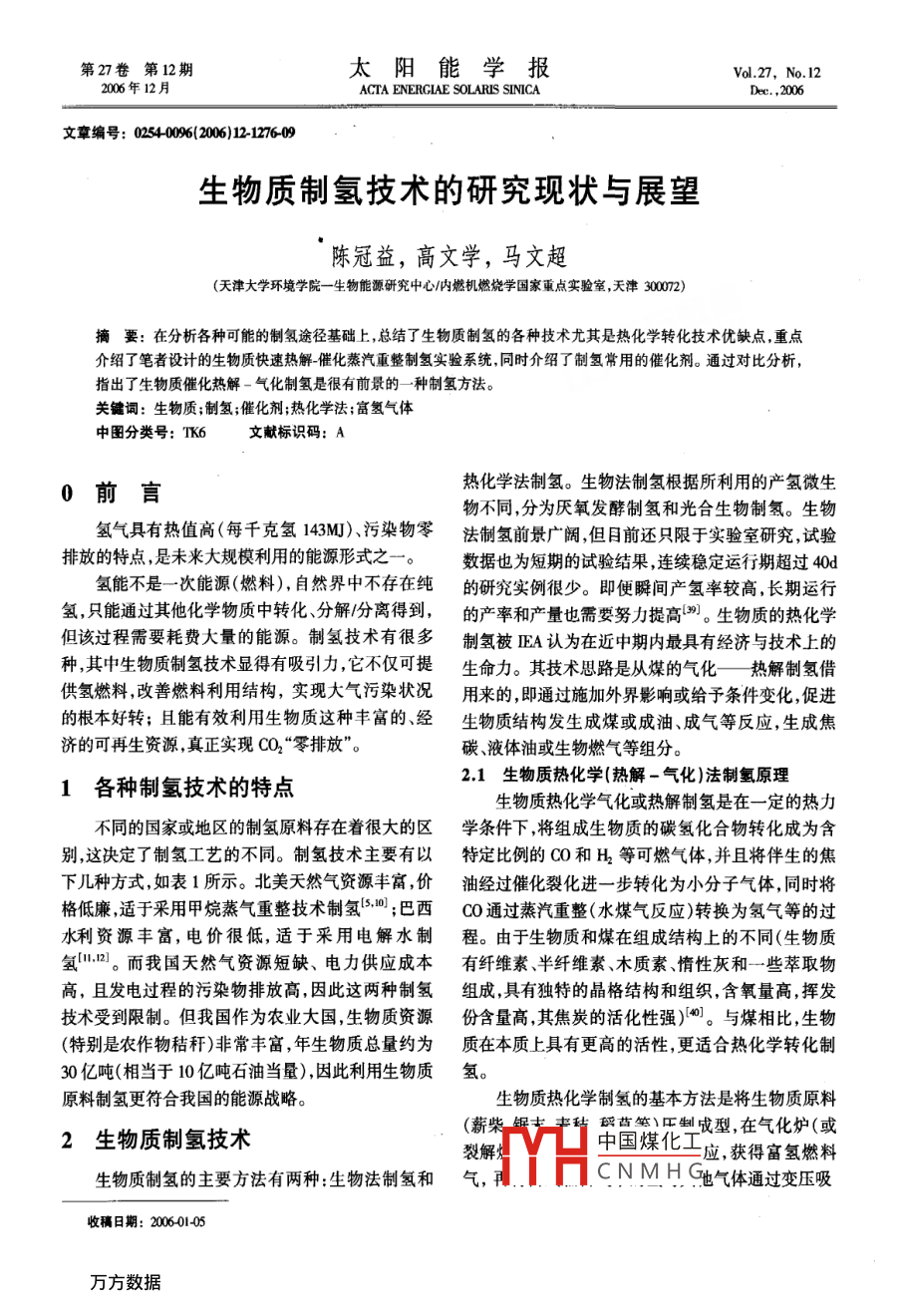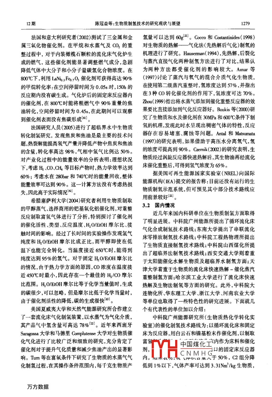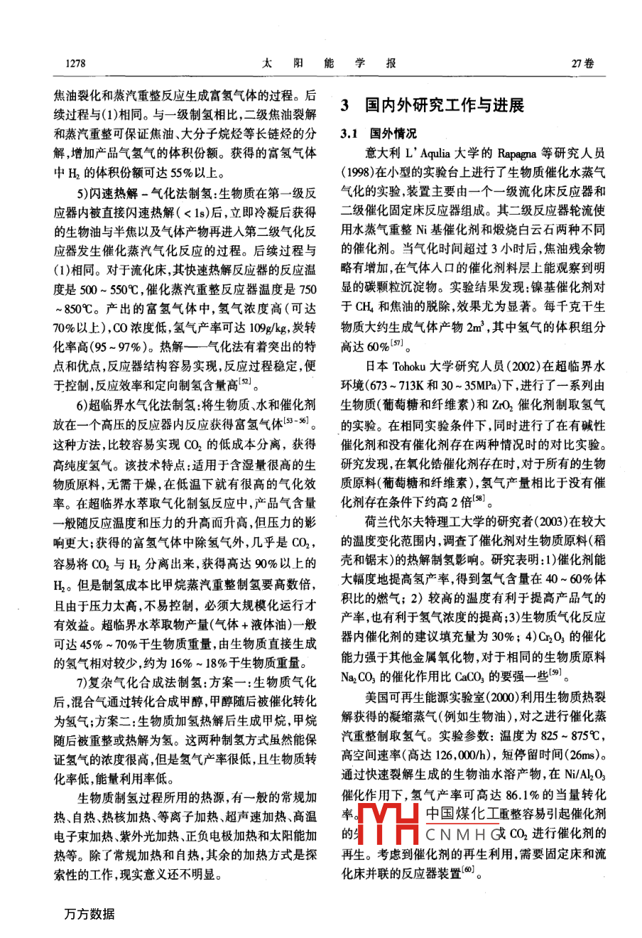 第27卷第12期太陽能學(xué)報Vol 27. No 122006年12月ACTA ENERGIAE SOLARIS SINICAec.,2006文章編號:054009%6(2006)1212760生物質(zhì)制氫技術(shù)的研究現(xiàn)狀與展望陳冠益,高文學(xué),馬文超(天津大學(xué)環(huán)境學(xué)院一生物能源研究中心內(nèi)燃機(jī)燃燒學(xué)國家重點實驗室,天津30002)摘要:在分析各種可能的制氫途徑基礎(chǔ)上,總結(jié)了生物質(zhì)制氫的各種技術(shù)尤其是熱化學(xué)轉(zhuǎn)化技術(shù)優(yōu)缺點,重點介紹了筆者設(shè)計的生物質(zhì)快速熱解-催化蒸汽重整制氫實驗系統(tǒng)同時介紹了制氫常用的催化劑。通過對比分析,指出了生物質(zhì)催化熱解一氣化制氫是很有前景的一種制氫方法。關(guān)鍵詞:生物質(zhì);制氫;催化劑;熱化學(xué)法;富氫氣體中圖分類號:TK6文獻(xiàn)標(biāo)識碼:A0前言熱化學(xué)法制氫。生物法制氫根據(jù)所利用的產(chǎn)氫微生物不同,分為厭氧發(fā)酵制氫和光合生物制氫。生物氫氣具有熱值高(每千克氫143M)污染物零法制氫前景廣闊,但目前還只限于實驗室研究試驗排放的特點,是未來大規(guī)模利用的能源形式之一。數(shù)據(jù)也為短期的試驗結(jié)果,連續(xù)穩(wěn)定運行期超過40d氫能不是一次能源(燃料),自然界中不存在純的研究實例很少。即便瞬間產(chǎn)氫率較高,長期運行氫只能通過其他化學(xué)物質(zhì)中轉(zhuǎn)化、分解份分離得到,的產(chǎn)率和產(chǎn)量也需要努力提高。生物質(zhì)的熱化學(xué)但該過程需要耗費大量的能源。制氫技術(shù)有很多制氫被EA認(rèn)為在近中期內(nèi)最具有經(jīng)濟(jì)與技術(shù)上的種其中生物質(zhì)制氫技術(shù)顯得有吸引力,它不僅可提生命力。其技術(shù)思路是從煤的氣化—熱解制氫借供氫燃料改善燃料利用結(jié)構(gòu),實現(xiàn)大氣污染狀況用來的即通過施加外界影響或給予條件變化,促進(jìn)的根本好轉(zhuǎn);且能有效利用生物質(zhì)這種豐富的、經(jīng)生物質(zhì)結(jié)構(gòu)發(fā)生成煤或成油、成氣等反應(yīng),生成焦?jié)目稍偕Y源,真正實現(xiàn)CO2“零排放”。碳、液體油或生物燃?xì)獾冉M分。1各種制氫技術(shù)的特點21生物質(zhì)熱化學(xué)(熱解一氣化)法制氫原理生物質(zhì)熱化學(xué)氣化或熱解制氫是在一定的熱力不同的國家或地區(qū)的制氫原料存在著很大的區(qū)學(xué)條件下,將組成生物質(zhì)的碳?xì)浠衔镛D(zhuǎn)化成為含別這決定了制氫工藝的不同。制氫技術(shù)主要有以特定比例的CO和H2等可燃?xì)怏w,并且將伴生的焦下幾種方式,如表1所示。北美天然氣資源豐富價油經(jīng)過催化裂化進(jìn)一步轉(zhuǎn)化為小分子氣體,同時將格低廉,適于采用甲烷蒸氣重整技術(shù)制氫;巴西C通過蒸汽重整(水煤氣反應(yīng))轉(zhuǎn)換為氫氣等的過水利資源豐富,電價很低,適于采用電解水制程。由于生物質(zhì)和煤在組成結(jié)構(gòu)上的不同(生物質(zhì)氫"。而我國天然氣資源短缺、電力供應(yīng)成本有纖維素、半纖維素木質(zhì)素情性灰和一些萃取物高,且發(fā)電過程的污染物排放高,因此這兩種制氫組成具有獨特的晶格結(jié)構(gòu)和組織,含氧量高,揮發(fā)技術(shù)受到限制。但我國作為農(nóng)業(yè)大國,生物質(zhì)資源份含量高,其焦炭的活化性強(qiáng))。與煤相比,生物(特別是農(nóng)作物秸稈)非常豐富,年生物質(zhì)總量約為質(zhì)在本質(zhì)上具有更高的活性,更適合熱化學(xué)轉(zhuǎn)化制30億噸(相當(dāng)于10億噸石油當(dāng)量),因此利用生物質(zhì)氫。原料制氫更符合我國的能源戰(zhàn)略。生物質(zhì)熱化學(xué)制氫的基本方法是將生物質(zhì)原料2生物質(zhì)制氫技術(shù)(薪柴YHaE苔第正翻成型,在氣化爐(或裂解中國煤化工應(yīng),獲得富氫燃料生物質(zhì)制氫的主要方法有兩種:生物法制氫和氣,CNMHG氣體通過變壓吸收稿日期:200601405l2期陳冠益等:生物質(zhì)制氫技術(shù)的研究現(xiàn)狀與展望1277表1各種制氫方法比較Table 1 The comparison of each bio-hydrogen generation制氫方法特點(1)目前全世界96%的氫由化石燃料制取(通過天然氣重整或煤的氣化、輕質(zhì)油轉(zhuǎn)化制氫、重油部分氧化法制氫等),制氫效率高,生產(chǎn)技術(shù)與工藝成熟。但制取過程成本大能量轉(zhuǎn)化效率較低,消耗緊缺的化石礦物燃燃料,同時排放CO2,因此只能作為過渡性的制氫技術(shù)料制氫0(2)甲醇轉(zhuǎn)化制氫。工業(yè)甲醇的產(chǎn)量不斷提高價格也比較低廉利用甲醇水蒸汽轉(zhuǎn)化制氫具有裝置規(guī)模小、氫氣生產(chǎn)成本低的特點已成為工業(yè)成熟技術(shù)。但不能實現(xiàn)大規(guī)模甲醇供應(yīng),且其生產(chǎn)過程往往伴隨著嚴(yán)重的環(huán)境污染問題。(1)低價電電解水制氫方法是當(dāng)前氫能規(guī)模制備的主要方法,但目前電耗過高,一般約為4 kWh/Nm,電解水無法達(dá)到商業(yè)化的大規(guī)模利用,只適合氫氣用量較小的場合,難以推廣。制氫6(2)利用可再生太陽能電解水制氫方法無污染適用范圍廣代表了未來的技術(shù)發(fā)展趨勢但成本太高效率也較低,技術(shù)水平需提高,近中期商業(yè)化應(yīng)用難以實現(xiàn)。生物質(zhì)資源豐富、分布廣、可再生。(1)生物質(zhì)熱化學(xué)法制氫的基礎(chǔ)研究較扎實,技術(shù)相對有保證,可根據(jù)需要