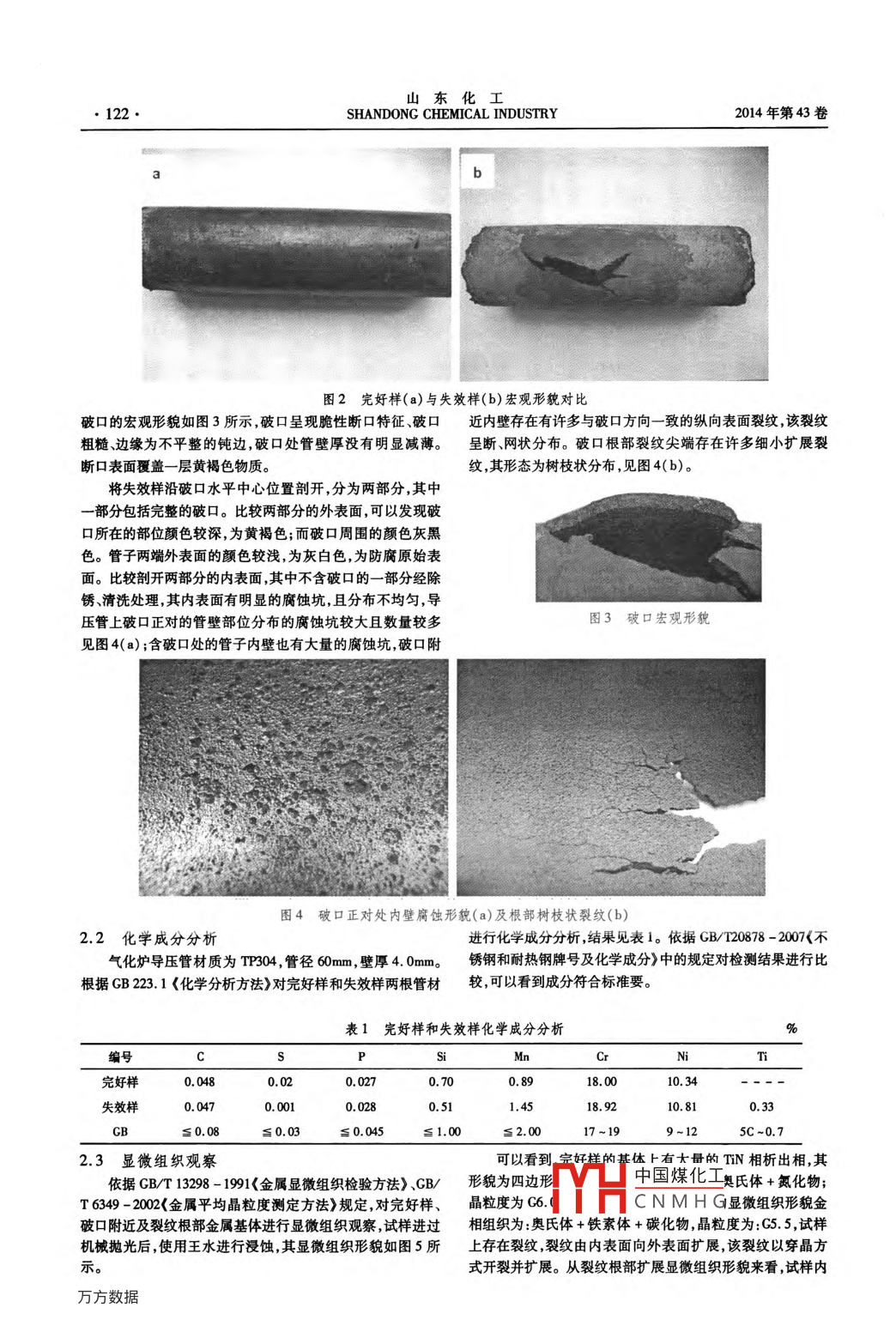 第8期付濤等:德士古氣化爐導(dǎo)壓管失效分析121德士古氣化爐導(dǎo)壓管失效分析付濤,張琦2(1陜西渭河煤化工集團(tuán)有限責(zé)任公司,陜西渭南714000;2.渭南市特種設(shè)備檢驗(yàn)所陜西渭南74000)摘要:對(duì)導(dǎo)壓管完好樣和失效樣進(jìn)行對(duì)比,通過(guò)宏觀形貌觀察、化學(xué)成分分析、破口及裂紋根部宏觀形貌及顯微組織形貌觀察,結(jié)合實(shí)際工況,分析材料失效主要是由應(yīng)力腐蝕引起的,并提出了相應(yīng)的解決方法關(guān)鍵詞:導(dǎo)壓管;腐蝕;失效分析中圖分類號(hào):TQ545文獻(xiàn)標(biāo)識(shí)碼:C文章編號(hào):1008-021X(2014)08-0121-04Failure Analysis of Pressure Tube of Texaco GasifierTao, Zhang Qi(1. Shaanxi Weihe Coal Chemical Corporation Group Ltd, Weinan 7140002. Weinan Special Equipment Inspection, Weinan 714000, Chian)Abstract: The comparison of un -failure and failure pressure tubes wasappearances of the cleavage and the crack were observed. Hardness and chemition were evaluated. Combing theactual working conditions, failure of the pressure tube was caused by stress corrosion, and the solving measurements wereput forwardKey words: pressure tube; corrosion; failure analysis1設(shè)備及失效情況介紹態(tài),介質(zhì)為高壓氮?dú)?與氣化爐爐內(nèi)保持微正壓狀態(tài),爐內(nèi)溫陜西渭河煤化工集團(tuán)有限責(zé)任公司的氣化裝置,是我國(guó)度130℃左右爐外壁溫度220℃左右。氣化爐導(dǎo)壓管在氣引進(jìn)的大型水煤漿加壓氣化裝置建于20世紀(jì)9年代,其化爐正常運(yùn)行時(shí)突然發(fā)生氮?dú)夤芫€爆裂(如圖1所示),導(dǎo)致中一期合成氨目前已運(yùn)行20余年,采用美國(guó)德士古的水煤氣化爐中的高溫混合工藝氣進(jìn)入氮?dú)夤芫€,引起連接法蘭接漿加壓氣化技術(shù)壓力為65MPa的激冷流程。一期裝置配管超溫顏色變紅,存在回火現(xiàn)象置了3臺(tái)氣化爐實(shí)行2開1備,年產(chǎn)合成氨300kt。通過(guò)與完好試樣對(duì)比,對(duì)失效部位的材料進(jìn)行了宏觀形貌觀察化學(xué)成分分析、顯微組織觀察、硬度測(cè)試表面和斷口的宏觀、微觀形貌觀察結(jié)合設(shè)備的實(shí)際工況,最終明確了了該部件的失效原因和機(jī)理并提出相應(yīng)對(duì)策以避免類似情況的發(fā)生。2失效分析2.1宏觀形貌檢驗(yàn)將完好樣與失效樣進(jìn)行宏觀形貌對(duì)比(如圖2所示),可以看到失效樣整體上(徑向和周向)未出現(xiàn)明顯的塑性變形,且未出現(xiàn)明顯的脹粗痕跡。失效樣的中部存在一個(gè)破口,破口張開程度較小,且破口張開的根部存在不規(guī)則分支裂紋,該裂紋呈分枝狀分布。破口周圍管材出現(xiàn)明顯的均勻腐蝕形貌其顏色為深黃褐色破口所在處的管子兩端顏色呈灰白色,為原始防腐表面顏色。說(shuō)明破口的產(chǎn)生與導(dǎo)壓管該段出現(xiàn)的腐蝕有很大關(guān)系。圖1導(dǎo)壓管爆裂形貌氣化爐設(shè)置導(dǎo)壓管,氣化爐導(dǎo)壓管正常運(yùn)行為常溫狀M凵中國(guó)煤化工CNMHG收稿日期:2014-06-10作者簡(jiǎn)介:付濤(1985-),陜西西安人,大學(xué)本科助理工程師從事化工裝置動(dòng)設(shè)備和靜設(shè)備管理及研究山東化工122·SHANDONG CHEMICAL INDUSTRY2014年第43卷b圖2完好樣(a)與失效樣(b)宏觀形貌對(duì)比破口的宏觀形貌如圖3所示,破口呈現(xiàn)脆性斷口特征、破口近內(nèi)壁存在有許多與破口方向一致的縱向表面裂紋,該裂紋粗糙、邊緣為不平整的鈍邊,破口處管壁厚沒(méi)有明顯減薄。呈斷、網(wǎng)狀分布。破口根部裂紋尖端存在許多細(xì)小擴(kuò)展裂斷口表面覆蓋一層黃褐色物質(zhì)。紋,其形態(tài)為樹枝狀分布,見圖4(b)。將失效樣沿破口水平中心位置剖開,分為兩部分,其中一部分包括完整的破口。比較兩部分的外表面,可以發(fā)現(xiàn)破口所在的部位顏色較深,為黃褐色;而破口周圍的顏色灰黑色。管子兩端外表面的顏色較淺,為灰白色,為防腐原始表面。比較剖開兩部分的內(nèi)表面,其中不含破口的一部分經(jīng)除銹、清洗處理,其內(nèi)表面有明顯的腐蝕坑,且分布不均勻,導(dǎo)壓管上破口正對(duì)的管壁部位分布的腐蝕坑較大且數(shù)量較多圖3破口宏觀形貌見圖4(a);含破口處的管子內(nèi)壁也有大量的腐蝕坑,破口附圖4破口正對(duì)處內(nèi)壁腐蝕形貌(a)及根部樹枝狀裂紋(b)2.2化學(xué)成分分析進(jìn)行化學(xué)成分分析,結(jié)果見表1。依據(jù)GB/①20878-2007《不氣化爐導(dǎo)壓管材質(zhì)為TP304,管徑60mm,壁厚40mm。銹鋼和耐熱鋼牌號(hào)及化學(xué)成分》中的規(guī)定對(duì)檢測(cè)結(jié)果進(jìn)行比根據(jù)GB223.1《化學(xué)分析方法》對(duì)完好樣和失效樣兩根管材較,可以看到成分符合標(biāo)準(zhǔn)要。表1完好樣和失效樣化學(xué)成分分析編號(hào)CPCrT完好樣0.04800.0270.7018.00失效樣0.0470.000.0285118.920.08≤0.03≤0.045≤1.≤2.0017~195C~0.72.3顯微組織觀察可以看到宗好樣的甚體右大量的TN相析出相,其中國(guó)煤化工奧氏體+氮化物T649-202(金屬平均晶粒度測(cè)定方法》規(guī)定對(duì)完好樣、晶粒度為6.4CNMHG顯微組織形貌金破口附近及裂紋根部金屬基體進(jìn)行顯微組織觀察試樣進(jìn)過(guò)相組織為:奧氏體+鐵素體+碳化物,晶粒度為C55,試樣機(jī)械拋光后,使用王水進(jìn)行浸蝕,其顯微組織形貌如圖5所上存在裂紋,裂紋由內(nèi)表面向外表面擴