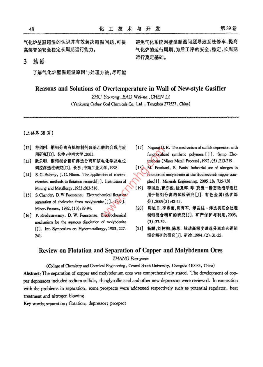 第39卷第5期化工技術與開發(fā)Vol.39 No.52010年5月Technology & Development of Chemical IndustryMay .2010適用技術新型氣化爐壁溫超溫原因與處理祝亞榮,鮑衛(wèi)娜,陳麗(兗礦國泰化工有限公司,山東滕州277527)摘要:為提高裝置的安全穩(wěn)定運行能力,以及系統(tǒng)長周期穩(wěn)定運行,對四噴嘴對置式新型氣化爐爐壁超溫原因進行總結和分析,從設備管理、工藝操作優(yōu)化等方面提出解決問題的處理方法。關鍵詞:氣化爐;超溫;原因中國分類號:TQ 054文獻標識碼:B文章編號:1671-9905(2010)05-0047-02出現凹凸不平的形態(tài),改變了向火面處的合成氣流1工藝流程簡介動方向,部分合成氣會沖刷向火面,原低灰熔點渣本煤氣化工藝屬于氣流床氣化工藝。濃度約層被很快熔掉,合成氣具有的動能使通道兩端的微60%的煤漿通過煤漿給料泵加壓與高壓氧氣(≥弱壓差得以實現, 造成竄氣,從而使壁溫某點突然99.6% )通過4個在同一水平面布置的工藝燒嘴對上升且速率較快,嚴重時短時間內迅速達到350 C噴進入氣化爐,對噴撞擊形成6個特征各異的流動緊急停車值。這時應采取提溫操作,重建穩(wěn)定渣層區(qū)即射流區(qū)撞擊區(qū)撞擊流股、回流區(qū)、折返流區(qū)、并使合成氣流場穩(wěn)定是最有效的處理措施。在實管流區(qū)。利用煤部分氧化(燃燒)釋放熱量,維持在際操作中多次在氣化爐出現因煤種波動造成竄氣該煤種的灰熔點以上溫度進行氣化反應。反應溫度時,采用氣化爐提溫操作均能在較短時間內減緩壁-般約為1300七,反應過程非常迅速,一般在4~溫上漲趨勢并最終降至正常范圍。對于非煤種波10 s完成。動原因造成的竄氣一般采用調整負荷、降低操作溫度、改變氣化爐內流場結構,使熔渣堵住竄氣通道2氣化爐壁溫超溫原因及處理等解決方式。2.1耐火磚 正常減薄造成局部超溫2.3局部過氧造 成超溫在耐火磚使用壽命后期,拱頂溫度已趨于平穩(wěn),在較高的操作壓力及較低的操作負荷下,人爐但爐溫會在較長的時間內呈緩慢上升趨勢。主要是的物料體積流量大幅減少,出燒嘴物料的流速急劇因為氣化爐向火面磚在運行過程中因高溫合成氣的降低,火焰黑區(qū)大大縮短,霧化角度擴大,回流區(qū)縮沖刷、蝕損開停車沖擊等原因,不斷減薄,整體熱阻小,燃燒區(qū)上移,向火面溫度升高,氣化爐上部爐壁不斷減小,以至氣化爐大面積溫度上升。這時應盡溫度隨之升高。同時,燒嘴部位溫度升高,低負荷下量使氣化爐處于穩(wěn)定的操作狀態(tài),加減負荷以及調霧化不好,造成燒嘴部位局部過氧,在局部區(qū)域產生整爐溫時要緩慢,避免大幅度調整造成氣化爐內壁過氧超溫,使拱頂部位壁溫較高(超出正常范圍),氣掛渣層不穩(wěn)定,以至局部突然快速升溫。此時應果化爐上下部溫差較大。這種操作狀態(tài)會在短時間內斷停車、退出系統(tǒng)、檢修換磚。對氣化爐耐火磚造成嚴重損壞。這時應保證操作負2.2局部竄氣造成超溫荷在噴嘴負荷調節(jié)范圍之內,重新調整核算噴嘴速造成局部竄氣的原因較多,在實際操作過程度,以保證霧化效果。中,竄氣多發(fā)生在煤質出現波動之后,一般是渣口基于以上判斷,造成氣化爐壁溫超溫的原因是壓差出現逐漸上升趨勢,整體壁溫出現上升不穩(wěn)定多種多樣的,因此需要在壁溫出現異常征兆時由現現象。導致這種情況出現的原因是,高灰熔點熔渣場操作人員迅速確認超溫部位、溫升速率及實際溫在較低的操作溫度下流動性極差,會使氣化爐渣層度,盡快判斷超溫原因,爭取系統(tǒng)調整時間。提高對收稿日期:2009-11-1748化工技術與開發(fā)第39卷氣化爐壁溫超溫的認識并有效解決超溫問題,可提避免氣化系統(tǒng)因壁溫超溫問題導致系統(tǒng)停車,提高高裝置的安全穩(wěn)定長周期運行能力。氣化爐的運行周期,為后工序的安全、穩(wěn)定、長周期運行奠定基礎。3結語了解氣化爐壁溫超溫原因與處理方法,盡可能Reasons and Solutions of Overtemperature in Wall of New style GasifierZHU Ya-romg , BAO Wei-na ,CHEN Li(Yankuang Cathay Coal Chernicals Co. Ltd. , Tengzhou 277527, China)(上接第38頁)[12]符劍剛. 銅鉬分離有機抑制劑巰基乙酸的合成與應[17] Nagaraj D. R. The mechanism of slfide deression with用研究[D].長沙:中南大學,2001.functionalized synthetic polymers[J]. Symp Elec-[13] 歐樂明. 銅鉬混合精礦浮選分離礦漿電化學及電位trochen (Miner Metall Process) ,1992, (5) :213-219.調控浮選柱研究[D].長沙:中南工業(yè)大學, 1998.[18] M. Poorkani, S. Banisi Industrial use of nitrogen in[14] s. G. Salamy, J. G. Nixon. The aplication of electro-flotation of molybdenite at the Sarcheshmeh a∞pper com-chemical methods to flotation research[J]. Institution ofplex[J]. Minerals Engineering, 2005,18: 735-738.Mining and Metallungy, 1953:503-516.[19]李國勝,曹亦俊,桂夏輝,等.旋流- 靜態(tài)微泡浮選柱[15] s.Chander, D. W Fuerstenau. Electrochemial flotation用于銅鉬分離的試驗研究[J].有色金屬(選礦部separation of chalocite from molybdenite[J]. Int. J. .分),2009(3):42-45.Miner. Prcses, 1982,(10):89-94.[20]周旭日,李春菊,周育軍. 浮選柱-浮選機聯合處理[16] P. Krishnaswamy, D. w. Fuerstenau. Electrochemical銅鉬混合精礦的研究[J].礦產保護與利用,2005,mechanism for the aqueous disolutio of molybdenite(3):37-39.[]. Int. Symposum on Hyomalallurgy, 1983, 227-[21]楊鵬,劉樹貽,陳藎. 脈動高梯度磁選分離難選銅鉬241.混合精礦的研究[J].礦冶,1994,(2):31-35.Review on Flotation and 
