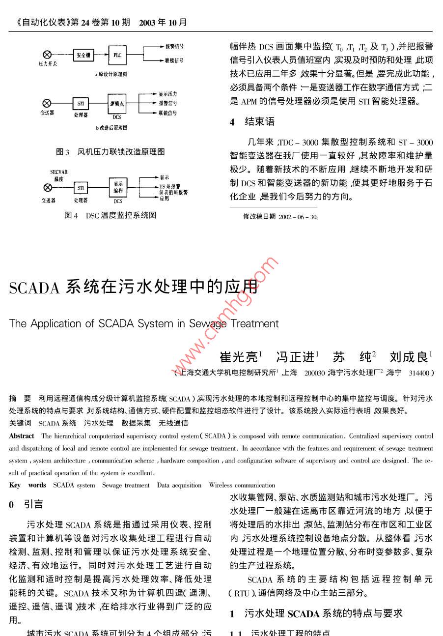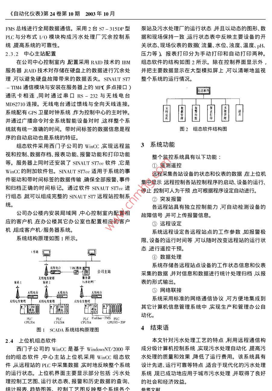 《自動(dòng)化儀表》第24卷第10期2003年10月幅伴熱DCS畫(huà)面集中監(jiān)控(TT,2及T3)并把報(bào)警安全生力開(kāi)關(guān)MaAe信號(hào)引入儀表人員值班室內(nèi)實(shí)現(xiàn)及時(shí)預(yù)防和處理此項(xiàng)原設(shè)計(jì)原理圖技術(shù)已應(yīng)用二年多效果十分顯著。但是要完成此功能必須具備兩個(gè)條件:是變送器工作在數(shù)字通信方式;二示壓邏點(diǎn)報(bào)警信號(hào)是APM的信號(hào)處理器必須是使用S智能處理器。變送器聯(lián)信號(hào)4結(jié)束語(yǔ)b改造后原理圖幾年來(lái),灬C-3000集散型控制系統(tǒng)和ST-3000圖3風(fēng)機(jī)壓力聯(lián)鎖改造原理圖智能變送器在我廠使用一直較好其故障率和維護(hù)量極少。隨著新技術(shù)的不斷應(yīng)用繼續(xù)不斷地開(kāi)發(fā)和研U站報(bào)警制DCS和智能變送器的新功能使其更好地服務(wù)于石值班報(bào)警變送器回化企業(yè)是我們今后努力的方向。圖4DSC溫度監(jiān)控系統(tǒng)圖修改稿日期2002-06-30SCADA系統(tǒng)在污水處理中的應(yīng)用The Application of SCADa System in Sewage Treatment崔光亮!馮正進(jìn)!蘇純2劉成良1上海交通大學(xué)機(jī)電控制研究所上海200030海寧污水處理廠2海寧314400)摘要利用遠(yuǎn)程通信構(gòu)成分級(jí)計(jì)算機(jī)監(jiān)控系統(tǒng) SCADA)實(shí)現(xiàn)污水處理的本地控制和遠(yuǎn)程控制中心的集中監(jiān)控與調(diào)度。針對(duì)污水處理系統(tǒng)的特點(diǎn)與要求對(duì)系統(tǒng)結(jié)構(gòu)、通信方式、硬件配置和監(jiān)控組態(tài)軟件進(jìn)行了設(shè)計(jì)。該系統(tǒng)投入實(shí)際運(yùn)行表明效果良好。關(guān)鍵詞 SCADA系統(tǒng)污水處理數(shù)據(jù)采集無(wú)線通信Abstract The hierarchical computerized supervisory control system( SCADA)is composed with remote communication. Centralized supervisory controlnd dispatching of local and remote control are implemented for sewage treatment. In accordance with the features and requirement of sewage treatmentsystem, system architecture communication scheme hardware composition and configuration software of supervisory and control are designed. The re-ey words SCADA system Sewage treatment Data acquisition Wireless communication0引言水收集管網(wǎng)、泵站、水質(zhì)監(jiān)測(cè)站和城市污水處理廠。污水處理廠一般建在遠(yuǎn)離市區(qū)靠近河流的地方以便于污水處理 SCADA系統(tǒng)是指通過(guò)采用儀表、控制將處理后的水排出泵站、監(jiān)測(cè)站分布在市區(qū)和工業(yè)區(qū)裝置和計(jì)算機(jī)等設(shè)備對(duì)污水收集處理工程進(jìn)行自動(dòng)內(nèi)污水處理系統(tǒng)控制設(shè)備地點(diǎn)分散。從整體看污水檢測(cè)、監(jiān)測(cè)、控制和管理以保證污水處理系統(tǒng)安全、處理過(guò)程是一個(gè)地理位置分散、分布時(shí)變參數(shù)多、復(fù)雜經(jīng)濟(jì)、有效地運(yùn)行。同時(shí)對(duì)污水處理工藝進(jìn)行自動(dòng)的生產(chǎn)過(guò)程系統(tǒng)。化監(jiān)測(cè)和適時(shí)控制是提高污水處理效率、降低處理SCADA系統(tǒng)的主要結(jié)構(gòu)包括遠(yuǎn)程控制單元能耗的關(guān)鍵。 SCADA技術(shù)又稱為計(jì)算機(jī)四遙(遙測(cè)、(RTU)通信網(wǎng)絡(luò)及中心主站三部分,遙控、遙信、遙調(diào))技術(shù)在給排水行業(yè)得到廣泛的應(yīng)1污水處理 SCADA系統(tǒng)的特點(diǎn)與要求用。SCADA系統(tǒng)在污水處理中的應(yīng)用崔光亮簿等①污水處理工程 SCADA系統(tǒng)的遠(yuǎn)程控制站機(jī)按照從站終端的地址發(fā)岀輪詢信息并接收從站發(fā)RTU)般是指污水收集泵站、水質(zhì)監(jiān)測(cè)站、閘門(mén)和污來(lái)的響應(yīng)信息而從站終端則接收主站輪詢的信息并水處理廠等地理位置分布范圍分散不便于集中控根據(jù)要求發(fā)出一系列的響應(yīng)信息。主站采用輪詢的方制,法逐個(gè)與從站通信并對(duì)從站發(fā)來(lái)的信息進(jìn)行匯總和②隨著城市規(guī)模的不斷發(fā)展,整個(gè)系統(tǒng)不斷擴(kuò)處理。數(shù)據(jù)分析存放于主站為各個(gè)分站分配的單元。大要求系統(tǒng)具有易擴(kuò)展性。由上位機(jī)采集這些數(shù)據(jù)分析、處理、存檔再根據(jù)工況③污水治理工程 SCADA系統(tǒng)具有實(shí)時(shí)性對(duì)信計(jì)算比較后通過(guò)無(wú)線通信系統(tǒng)分別發(fā)出各從站的調(diào)控號(hào)應(yīng)保證及時(shí)傳輸對(duì)無(wú)人值守的遠(yuǎn)程站實(shí)現(xiàn)在線遙命令完成調(diào)控任務(wù)控采用西門(mén)子的 Sinaut st是程序控制的站控系統(tǒng)12 SCADA系統(tǒng)總體的要求由硬件們 w telecontrol interface module)模塊和軟件模塊① SCADA系統(tǒng)應(yīng)盡可能保證設(shè)備的先進(jìn)性,適組成適用各種自動(dòng)化的任務(wù)是完整的無(wú)線電通信方應(yīng)計(jì)算機(jī)控制技術(shù)的飛速發(fā)展式對(duì)通過(guò)廣域網(wǎng)連接的過(guò)程進(jìn)行全自動(dòng)監(jiān)視和控制②監(jiān)控組態(tài)軟件具有用戶友好的圖形界面以便該系統(tǒng)可以實(shí)現(xiàn)主站與從站、從站與從站之間數(shù)據(jù)與于用戶的操作。實(shí)時(shí)數(shù)據(jù)庫(kù)應(yīng)具有簡(jiǎn)化對(duì)象間相互作信息的交換。用關(guān)系符合工業(yè)控制數(shù)據(jù)庫(kù