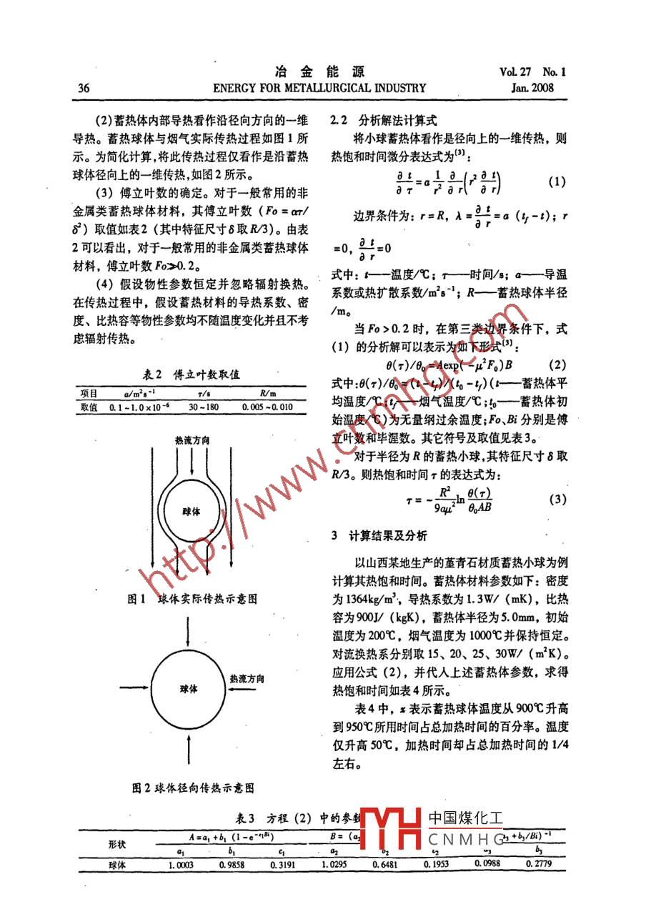VoL 27 No. 1冶金能源Jan.2008ENERGY FOR METALLURGICAL INDUSTRY蓄熱球體熱飽和時(shí)間的分析計(jì)算武紹井陳文仲朱偉素劉利(東北大學(xué)材料與冶金學(xué)院工程熱物理研究所)摘要在簡(jiǎn)化傳熱模型的條件下,用分析解的方法計(jì)算了蒸青石材料的球形蓄熱體的熱飽和時(shí)間,并確定了熱飽和時(shí)間與換熱系數(shù)以及蓄熱體半徑之間的關(guān)系。關(guān)鍵詞蓄熱球體熱飽和時(shí)間分析解法Analytical method of solid sphere regenerator heat saturating timeEngineering Thermal Physics Institute of Northeasten University)Abstract The analytical method is used in calculating heat saturation time of solid sphere cordieriteregenerator with simplified heat transfer mode. The relationships between heat saturation time and heatchange coefficient and regenerator radius are also ascertained.Keywords solid sphere regenerator saturating time analytical method前言2蓄熱體熱飽和時(shí)間的求解換向時(shí)間是蓄熱式燃燒系統(tǒng)中的一個(gè)重要參2.1計(jì)算條件數(shù),它在很大程度上決定著蓄熱體的溫度效率和(1)忽略蓄熱體內(nèi)部熱傳導(dǎo)所需時(shí)間。在熱回收率,同時(shí)對(duì)爐溫波動(dòng)幅度和火焰燃燒狀況蓄熱體與煙氣換熱過(guò)程中,存在兩種熱交換形也有很大影響,因此需要確定合適的換向時(shí)間。式:熱傳導(dǎo)和對(duì)流換熱。熱傳導(dǎo)過(guò)程是熱量從蓄方面,換向時(shí)間增加后,蓄熱體的蓄熱量會(huì)增熱體表面向內(nèi)部傳熱過(guò)程;對(duì)流換熱則是煙氣將加,蓄熱體的溫度相應(yīng)升高,進(jìn)而強(qiáng)化了放熱階熱量傳給蓄熱體表面的傳熱過(guò)程。兩個(gè)過(guò)程的傳段冷空氣與蓄熱體的對(duì)流換熱,可促進(jìn)余熱回收熱熱阻(對(duì)于目前常用的蓄熱小球,一般換熱率的升高。另一方面,換向時(shí)間的增加將使流過(guò)系數(shù)h=10~40W/(m2K),半徑R=5-10mm,蓄熱體的空氣總質(zhì)量不斷升高,在蓄熱量一定的導(dǎo)熱系數(shù)A=1~3W/(mK))見(jiàn)表1。情況下,單位質(zhì)量的空氣所能帶走的熱量必然降表1中特征尺寸8取R乃3??梢钥闯?/h>低,就不能維持較高的溫度效率,所以選取合適8/A,即在煙氣與蓄熱體熱交換過(guò)程中,對(duì)流熱阻的換向時(shí)間是非常重要的。蓄熱體的熱飽和占主導(dǎo)地位,也就是說(shuō)熱飽和時(shí)間主要取決于對(duì)時(shí)間也即蓄熱體從換熱開(kāi)始達(dá)到飽和溫度所需的流換熱所用時(shí)間。本計(jì)算將不考慮熱傳導(dǎo)所用時(shí)總時(shí)間,計(jì)算某種蓄熱體材料的熱飽和時(shí)間,對(duì)間即將某一時(shí)刻球體內(nèi)溫度看作均勻分布。確定由此種蓄熱材料組成的蓄熱式燃燒系統(tǒng)的換向時(shí)間有指導(dǎo)意義2。中國(guó)煤化工比較CNMHGm'kW-I日期:2007-06-20傳導(dǎo)熱阻(8A)0.0006~0.0033武紹井(1979—),碩士生:004江寧省沈陽(yáng)市。對(duì)流熱阻(1/h冶金能源VoL 27 No. 1ENERGY FOR METALLURGICAL INDUSTRYJan 2008(2)蓄熱體內(nèi)部導(dǎo)熱看作沿徑向方向的一維2.2分析解法計(jì)算式導(dǎo)熱。蓄熱球體與煙氣實(shí)際傳熱過(guò)程如圖1所將小球蓄熱體看作是徑向上的一維傳熱,則示。為簡(jiǎn)化計(jì)算,將此傳熱過(guò)程僅看作是沿蓄熱熱飽和時(shí)間微分表達(dá)式為球體徑向上的一維傳熱,如圖2所示(3)傅立葉數(shù)的確定。對(duì)于一般常用的非=a:(2月(1)金屬類(lèi)蓄熱球體材料,其傅立葉數(shù)(Fo=am/邊界條件為:r=R,As≠a(y-);r8)取值如表2(其中特征尺寸8取R/3)。由表2可以看出,對(duì)于一般常用的非金屬類(lèi)蓄熱球體=0,9=0材料,傅立葉數(shù)Fo>0.2(4)假設(shè)物性參數(shù)恒定并忽略輻射換熱。式中:溫度/℃;r時(shí)間/s;a—導(dǎo)溫在傳熱過(guò)程中,假設(shè)蓄熱材料的導(dǎo)熱系數(shù)、密系數(shù)或熱擴(kuò)散系數(shù)/m2s;R—蓄熱球體半徑度、比熱容等物性參數(shù)均不隨溫度變化并且不考慮輻射傳熱。當(dāng)Fo>0.2時(shí),在第三類(lèi)邊界條件下,式(1)的分析解可以表示為如下形式):表2傅立葉數(shù)取值e(r)/60=Aexp(-μ2F)B式中:6(T)/=(t-4)/(6-)(蓄熱體平0.1-1.0x100.005~0.010均溫度;一煙氣溫度/℃;—蓄熱體初始溫度^)為無(wú)量綱過(guò)余溫度;Fo、B分別是傅熱流方向立葉數(shù)和畢渥數(shù)。其它符號(hào)及取值見(jiàn)表3。付于半徑為R的蓄熱小球,其特征尺寸8取R/3。則熱飽和時(shí)間r的表達(dá)式為:球體3計(jì)算結(jié)果及分析以山西某地生產(chǎn)的革青石材質(zhì)蓄熱小球?yàn)槔?jì)算其熱飽和時(shí)間。蓄熱體材料參數(shù)如下:密度圖1球體實(shí)際傳熱示意圖為1364kg/m3,導(dǎo)熱系數(shù)為13W/(mK),比熱容為900J/(kgK),蓄熱體半徑為5.0mm,初始溫度為200℃,煙氣溫度為1000℃并保持恒定。對(duì)流換熱系分別取15、20、25、30W/(m2K)。熱流方向應(yīng)用公式(2),并代人上述蓄熱體參數(shù),求得球體熱飽和時(shí)間如表4所示。表4中,x表示蓄熱球體溫度從900℃升高到950℃所用時(shí)間占總加熱時(shí)間的百分率。溫度僅升高50℃,加熱時(shí)間卻占總加熱時(shí)間的1/4左右圖2球體徑向傳熱示意圖表3方程(2)中的參中國(guó)煤化工形狀A(yù)=a1+b1(1-e-)CNMHG+b/B2)1.00030.9858031911.02950.64810.19530.2779VoL 27 No. 1冶金能源Jan 2008ENERGY FOR METALLURGICAL INDUSTRY表4球體蓄熱體熱飽和時(shí)間換熱系數(shù)熱飽和時(shí)間/sW/(m2K)850℃900℃505的y3025.2陽(yáng)科425.025.050512.5半徑/m圖3
