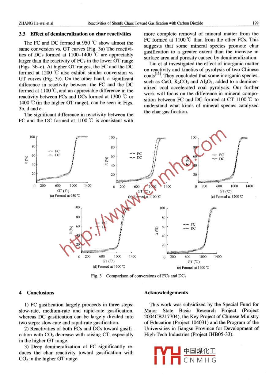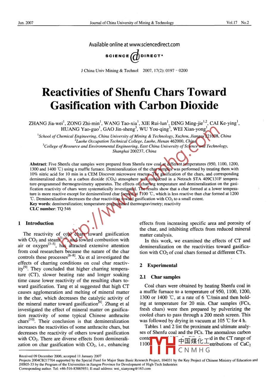 Jun. 2007Journal of China University of Mining & TechnologyVol.17 No.2Available online at www.sciencedirect.comSCIENCE (e doIREcT.J China Univ Mining & Technol 2007, 17(2): 0197 - 0200Reactivities of Shenfu Chars TowardGasification with Carbon DioxideZHANG Jia-wei', ZONG Zhi-min', W ANG Tao-xia', XIE Rui-lun', DING Ming-jie'2, CAI Ke-ying',HUANG Yao-guo', GAO Jin-sheng', WU You-qing , WEI Xian-yong'! School of Chemical Engineering, China University of Mining & Technology, Xuzhou, Jiangsu 221008, ChinaZLuohe Occupation Techrical College, Luohe, Henan 462000, China'College of Resource and Environmental Engineering, East China University of Science and Technology,Shanghai 200237, ChinaAbstract: Five Shenfu char samples were prepared from Shenfu raw coal at different temperatures (950, 1100, 1200,1300 and 1400 C) using a muffle furmace. Demineralization of the char samples was performed by treating them with10% nitric acid for 10 min in a CEM Discover microwave reactor. The gasification of the chars, and correspondingdemineralized chars, in a carbon dioxide (CO2) atmosphere was conducted in a Netzsch STA 409C131F tempera-ture-programmed thermogravimetry apparatus. The effects of charring temperature and demineralization on the gasi-fication reactivity of chars were systematically investigated. The results show that a char formed at a lower tempera-ture is more reactive except for demineralized char formed at 1100 C, which is less reactive than char formed at 1200C. Demineralization decreases the char reactivities toward gasification with CO2 to a small extent.Key words: demineralization; temperature-programmed thermogravimetry; reactivityCLC number: TQ 5461 Introductioneffects from increasing specific area and porosity ofthe char, and inhibiting effects from reduced mineralThe reactivity of coal chars toward gasificationmatter catalysis.with CO2 and steamt- , and toward combustion withIn this work, we examined the effects of CT andair or oxygen', has attracted extensive attentiondemineralization on the reactivities toward gasifica-from coal researchers because the nature of the chartion with CO2 of coal chars formed at different CTs.controls these processes'58. Xu et al investigated theeffects of charring conditions on coal char reactiv-2 Experimentality!. They concluded that higher charring tempera-ture (CT), slower heating rate and longer soaking2.1 Char samplestime cause lower reactivity of the resulting chars to-ward gasification. Tang et al suggested that high CTCoal chars were obtained by heating Shenfu coal incauses agglomeration and melting of mineral mattera muffle fumace to a temperature of 950, 1100, 1200 .in the char, which decreases the catalytic activity of1300 or 1400 C, at a rate of 6 C/min and then hold-the mineral matter toward gasification'o. Zhang et aling at temperature for 20 min. Char samples (FCs,investigated the effect of mineral matter on gasifica-fresh chars) were then prepared by pulverizing thetion reactivity of some typical Chinese anthracitecooled chars to pass through a 200 mesh screen. Thischars. Their conclusion is that demineralizationwas followed by drying in vacuum at 105 C for4 h.increases the reactivities of some anthracite chars, butTables 1 and 2 list the proximate and utimate analy-decreases the reactivity of others toward gasificationses of Shenfu coal and the FCs. The anomalous carbonwith CO2. There are diverse effects from deminerali-conte中國(guó)煤化τdintheCTrangeofzation on char gasification with CO2, i.e., enhancing1100:ntributions of CaC2TYHCNMHGReceived 09 December 2006; accepted 11 January 2007Projects 2004CB217704 supported by the Special Fund for Major State Basic Research Project, 104031 by the Key Project of Chinese Ministry of Education andJHB05-33 by the Program of the Universities in Jiangsu Province for Development of High-Tech IndustriesCorresponding author. Tel: +86-516-83885951; E-mail address: wei xianyong@ 163.com198Journal of China University of Mining & TechnologyVoL.17 No.2and SiC.rapid-rate (higher GT range) gasification. The reac-tivity of FC toward gasification decreases with in-Table 1 Proximate and ultimate analyses of Shenfu coalcreased CT, but there is no significant reactivity dif-Proximate analysisUlimate analysis (daf)S, (d)ference between FCs formed at 1200 C and 1300 CAsVMarCH_Nespecially at higher GTs of the third step. Wu, et al10.196.5037.6680.534.800.89 0.37_obtained similar results from isothermal thermogra-vimetric analysis. Raising the CT decreases porosityTable 2 Proximate and ultimate analyses ofFCs (%)and specific surface area of a FC and thereby de-Ultimate analysis (daf)creases FC reactivity toward gasification'CT(C)-As VMarC____ H Ns,(d)100 n950 10.3096.99 0.30.33 .0.42 .-0- 950C1.93100.310.170.4480- -。- 1100C1200 9.951.90 100.54 0 0.14 0.42--- 1200C300 10.08 1.13100.580.07、60 t-v- 1300C140 10.561.12100.100.03-+- 1400C2.2 Demineralized chars (DCs)40Demineralization was performed by treating FCs20with 10% nitric acid at ca. 50 C for 10 min in a CEMDiscover microwave reactor followed by repeatedwashing with deionized water, until no NO; could be60010001400detected in the wash water, and drying in vacuum atGT(C)105 C for 4 h. Mass recovery of DCs is higher thanFig. 1 Conversions of different FCs at different GTs95%. The ash contents of the DCs with CTs of 950,1100, 1200, 1300 and 1400 C are 4.78%, 2.49%,3.2 Effect of CT on DC reactivities3.98%, 4.98% and 4.06%, respectively.Unlike the FC situation, DC gasification can be di-2.3 Char gasificationvided into two steps, slow-rate (GT range: room tem-The gasification runs were performed in a Netzschperature to 900 C for DC formed at 950 c and to ca.STA 409C131F thermogravimetric analyzer. Each1000 C for DC formed at higher CTS) and rapid-ratechar (ca.15 mg) was heated from room temperature to(higher GT range) gasification, as shown in Fig. 2.1400 C at rate of 20 C/min under a 90 mL/min CO2The reactivity of DC toward gasification generallyflow. The 