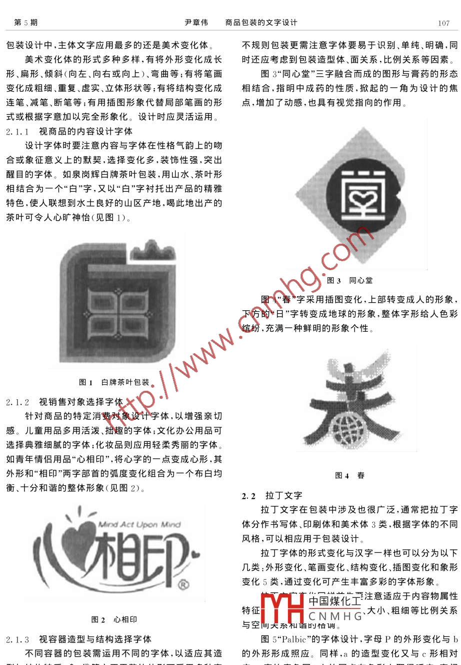 第18卷第5期株洲工學(xué)院學(xué)報Vol.18 No.52004年9月Journal of Zhuzhou Institute of TechnologySep. 2004商品包裝的文字設(shè)計尹章偉(武漢大學(xué),湖北武漢430079)商要:文字是包裝裝潢畫面的要素之一,是傳遞商品信息的視覺語言。包裝的文字設(shè)計必須具有良好的識別性和易讀性。關(guān)鍵詞:商品;包裝;文字;設(shè)計;視覺語言中圖分類號:J524.2文獻(xiàn)標(biāo)識碼:A.文章編號:1008 - 2611(2004)05- 0106-03文字是包裝裝潢畫面的要素之一。裝潢畫面可以確使用商品。如醫(yī)藥品、保健品和家用工具包裝上。不用圖形,卻不可沒有文字。文字是人類文化的結(jié)晶,4)祝愿性文字以祝福、贊美等美好語言來溝通是溝通人與人之間情感的符號。包裝的文字是傳遞商消費者的情感,如枕頭包裝上的“祝您做個好夢”。品的信息,表達(dá)包裝物內(nèi)容的視覺語言,文字醒目、生說明文字往往在人們購買決策中起重要作用,常動是抓住消費者視覺的重要手段,它往往起到畫龍點用印刷字體,以免辨認(rèn)不清而造成誤會,說明應(yīng)簡捷、晴的作用。易讀和易懂。無論是主體文字或說明文字,都必須清楚醒目,并1包裝裝潢畫面的文字類型力求畫面美觀,語言精煉,用詞恰當(dāng),且易讀易記、形美包裝裝潢畫面的文字有二種類型。意達(dá),與特定的商品內(nèi)容相適應(yīng)。1.1 主體文字主體文字主要是指商品的牌名、品名等標(biāo)題字,是2包裝文字的設(shè)計裝飾畫面的主體部分,應(yīng)具有最醒目的視覺效果,無論.主體文字多用書寫體、印刷體、美術(shù)變化體。設(shè)計從面積、位置、色彩、明暗等方面都應(yīng)占有突出的地位,時應(yīng)視具體商品的特定要求,如商品的特質(zhì)性能、傳達(dá)-般安排在包裝的主要展示面上。對象、包裝容器的造型結(jié)構(gòu)、材料與工藝手段等,設(shè)計1.2說明文字出視覺傳達(dá)效果最為合理的方案,以提高其藝術(shù)效果。說明文字主要用來介紹商品的規(guī)格、數(shù)量、型號、現(xiàn)就漢字、拉丁文字和文字編排形式分述如下。成分、產(chǎn)地、用途、功效、使用方法及廣告等。表現(xiàn)形式2.1漢字有如下幾種。我國漢字有悠久歷史,字體造型極富變化,在包裝1)宣傳性文字這類文字 是從目標(biāo)市場消費者的裝潢設(shè)計上是大有發(fā)揮天地的。需求特點出發(fā),強(qiáng)調(diào)該商品給顧客帶來的優(yōu)于同類商我國古代象形文字,既是文字又是標(biāo)志符號圖形。品的優(yōu)點和利益,以引起顧客的注意和興趣,并導(dǎo)致購在表現(xiàn)事物的典型特征,具象和抽象的巧妙結(jié)合,高度買行為。文字內(nèi)容應(yīng)做到誠實、簡潔、生動。提煉的表現(xiàn)方面,對我們進(jìn)行裝潢設(shè)計構(gòu)思、構(gòu)圖、造2)介紹性文字介紹性文字是宣傳性文字的另一型等方面都有值得研究和吸取的地方。種表現(xiàn)形式,主要是幫助顧客認(rèn)識、了解商品的價值和漢字中的篆、隸、楷、行、草等書體都有很好的造型為其帶來的獨特利益與滿足感,從而使其產(chǎn)生購買欲表現(xiàn)力,是包裝裝潢設(shè)計中的生動語言。漢字印刷體的望并導(dǎo)致購買行為。字形|中國煤化工用更為普遍。不同的印刷3)提示性文字這類文字作 用在于幫助消費者正字體MYHCNMH(!有良好的作用。然而在收稿日期:2004-04-21.作者簡分蟊嘉偉(1945- ),男,湖北鄂州人,武漢大學(xué)教授,主要從事印刷工藝與包裝教育方面的研究.本文為2004國際現(xiàn)代包裝學(xué)術(shù)研討會會議論文第5期尹章偉商品包裝的文字設(shè)計107包裝設(shè)計中,主體文字應(yīng)用最多的還是美術(shù)變化體。不規(guī)則包裝更需注意字體要易于識別、單純、明確,同美術(shù)變化體的形式多種多樣,有將外形變化成長時還應(yīng)考慮到包裝造型體、面關(guān)系,比例關(guān)系等因素形、扁形、傾斜(向左、向右或向上)、彎曲等;有將筆畫圖3“同心堂”三字融合而成的圖形與膏藥的形態(tài)變化成粗細(xì)、重復(fù)、虛實、立體形狀等;有將結(jié)構(gòu)變化成相結(jié)合,指明中成藥的性質(zhì),掀起的一角為設(shè)計的焦連筆、減筆、斷筆等;有用插圖形象代替局部筆畫的形點,增加了動感,也具有視覺指向的作用。式或根據(jù)字意加以完全形象化。設(shè)計時應(yīng)靈活運用。2.1.1 視商品的內(nèi)容設(shè)計字體設(shè)計字體時要注意內(nèi)容與字體在性格氣韻上的吻合或象征意義上的默契,選擇變化多,裝飾性強(qiáng),突出醒目的字體。如泉崗輝白牌茶葉包裝,用山水、茶葉形相結(jié)合為一一個“白”字,又以“白”字襯托出產(chǎn)品的精雅特色,使人聯(lián)想到水土良好的山區(qū)產(chǎn)地,喝此地出產(chǎn)的茶葉可令人心曠神怡(見圖1)。圖3同心堂圖4“春”字采用插圖變化,上部轉(zhuǎn)變成人的形象,下方的“日”字轉(zhuǎn)變成地球的形象,整體字形給人色彩繽紛,充滿-種鮮明的形象個性。圖1白牌茶葉包裝2.1.2視銷 售對象選擇字體針對商品的特定消費對象設(shè)計字體,以增強(qiáng)親切感。兒童用品多用活潑、拙趣的字體;文化辦公用品可選擇典雅細(xì)膩的字體;化妝品則應(yīng)用輕柔秀麗的字體。如青年情侶用品“心相印”,將心字的一-點變成心形,其外形和“相印”兩字部首的弧度變化組合為一個布白均圖4