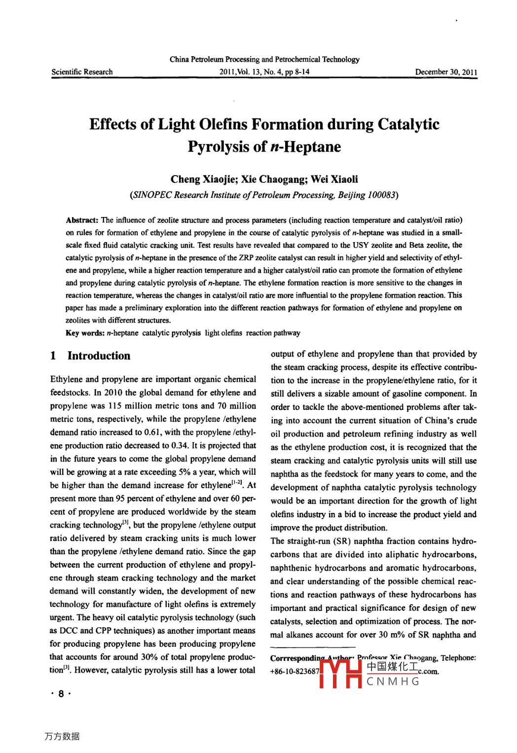 China Petroleum Processing and Petrochemical TechnologyScientifc Research2011,Vol. 13, No. 4, pp 8-14December 30 2011Effects of Light Olefins Formation during CatalyticPyrolysis of n-HeptaneCheng Xiaojie; Xie Chaogang; Wei Xiaoli(SINOPEC Research Institute of Petroleum Processing, Bejing 100083)Abstract: The infuence of zeolite structure and process parameters (including reaction temperature and catalyst/oil ratio)on rules for formation of ethylene and propylene in the course of catalytic pyrolysis of n-heptane was studied in a smal-scale fixed fuid catalytic cracking unit. Test results have revealed that compared to the USY zeolite and Beta zeolite, thecatalytic pyrolysis of n-heptane in the presence of the ZRP zeolite catalyst can result in higher yield and selectivity of ethyl-ene and propylene, while a higher reaction temperature and a higher catalystoil ratio can promote the formation of ethyleneand propylene during catalytic pyrolysis of n-heptane. The ethylene formation reaction is more sensitive to the changes inreaction temperature, whereas the changes in catalyst/oil ratio are more infuential to the propylene formation reaction. Thispaper has made a preliminary exploration into the different reaction pathways for formation of ethylene and propylene onzeolites with different structures.Key words: n-heptane catalytic pyrolysis light olefins reaction pathway1 Introductionoutput of ethylene and propylene than that provided bythe steam cracking process, despite its effective contribu-Ethylene and propylene are important organic chemicaltion to the increase in the propylene/ethylene ratio, for itfeedstocks. In 2010 the global demand for ethylene andstill delivers a sizable amount of gasoline component. Inpropylene was 115 million metric tons and 70 millionorder to tackle the above mentioned problems after tak-metric tons, respectively, while the propylene /ethyleneing into account the current situation of China's crudedemand ratio increased to 0.61, with the propylene /ethyl-oil production and petroleum refining industry as wellene production ratio decreased to 0.34. It is projected thatas the ethylene production cost, it is recognized that thein the future years to come the global propylene demandsteam cracking and catalytic pyrolysis units will still usewill be growing at a rate exceeding 5% a year, which willnaphtha as the feedstock for many years to come, and thebe higher than the demand increase for ethylel-2. Adevelopment of naphtha catalytic pyrolysis technologypresent more than 95 percent of ethylene and over 60 per-would be an important direction for the growth of lightcent of propylene are produced worldwide by the steamolefins industry in a bid to increase the product yield andcracking technology', but the propylene /ethylene outputimprove the product distribution.ratio delivered by steam cracking units is much lowerThe straight-run (SR) naphtha fraction contains hydro-than the propylene /ethylene demand ratio. Since the gapcarbons that are divided into aliphatic hydrocarbons,between the current production of ethylene and propyl-naphthenic hydrocarbons and aromatic hydrocarbons,ene through steam cracking technology and the marketand clear understanding of the possible chemical reac-demand will constantly widen, the development of newions and reaction pathways of these hydrocarbons hastechnology for manufacture of light olefins is extremelyimportant and practical significance for design of newurgent. The heavy oil catalytic pyrolysis technology (suchcatalysts, selection and optimization of process. The nor-as DCC and CPP techniques) as another important meansmal alkanes account for over 30 m% of SR naphtha andfor producing propylene has been producing propylenethat accounts for around 30% of total propylene produc-Corrresponding Anthor' Prnfessonr Xie Chaogang, Telephone:tion'l. However, catalytic pyrolysis still has a lower total+86-10-823687中國煤化工c.com.YHCNMHG8●Cheng Xiajie, et al. Efects of Light Olefns Formation during Catalytic Pyrolysis of n-Heptaneare mainly distributed in the C。C, fraction. Compared2.3 Test methodto other hydrocarbons, normal alkanes are characterized The catalytic pyrolysis of n-heptane was carried out inby a single molecular structure that undergoes reaction a small-scale fixed fluidized catalytic cracking reactoraccording to a simple reaction pathway. By focusing on (ACE), with its catalyst jinventory equating to 9 grams. Athe rules of catalytic pyrolysis reactions of n-alkanes as a definite amount of catalyst was loaded in the reactor, ingroundbreaking point it is possible to help delve into the which the preheated feedstock was injected by means ofchemistry relating to the catalytic pyrolysis reactions of an injection pump to take part in the catalytic cracking re-the SR naphtha. This article intends to use normal heptane action. The compounds remaining inside the catalyst wereas a model compound in the study on the infuence of ze- then stripped out by nitrogen gas prior to coke burningolite structure and process parameters (including reactionunder air fow and regeneration of the catalyst. The reac-temperature and catalyst/oil ratio) on the rules on forma-tion products after passing through the condensation/tion of ethylene and propylene in the course of catalyticcooling system were separated into gascous productspyrolysis of n-heptane in order to provide a reference forand liquid products. The detailed composition of FCCthe development of technology for catalytic pyrolysis ofgas products was obtained through online chromato-naphtha.graphic analysis of gaseous products. The compositionof liquid products after collecting and weighing was ob-2 Experimentaltained through analysis by an off-line chromatograph.The fue gas obtained during burning of coke deposits2.1 Feedstockon the catalyst was routed to the co converter to beThe feedstock applied in the experiments was n-heptanefully transformed into CO, which was then measured(analytic