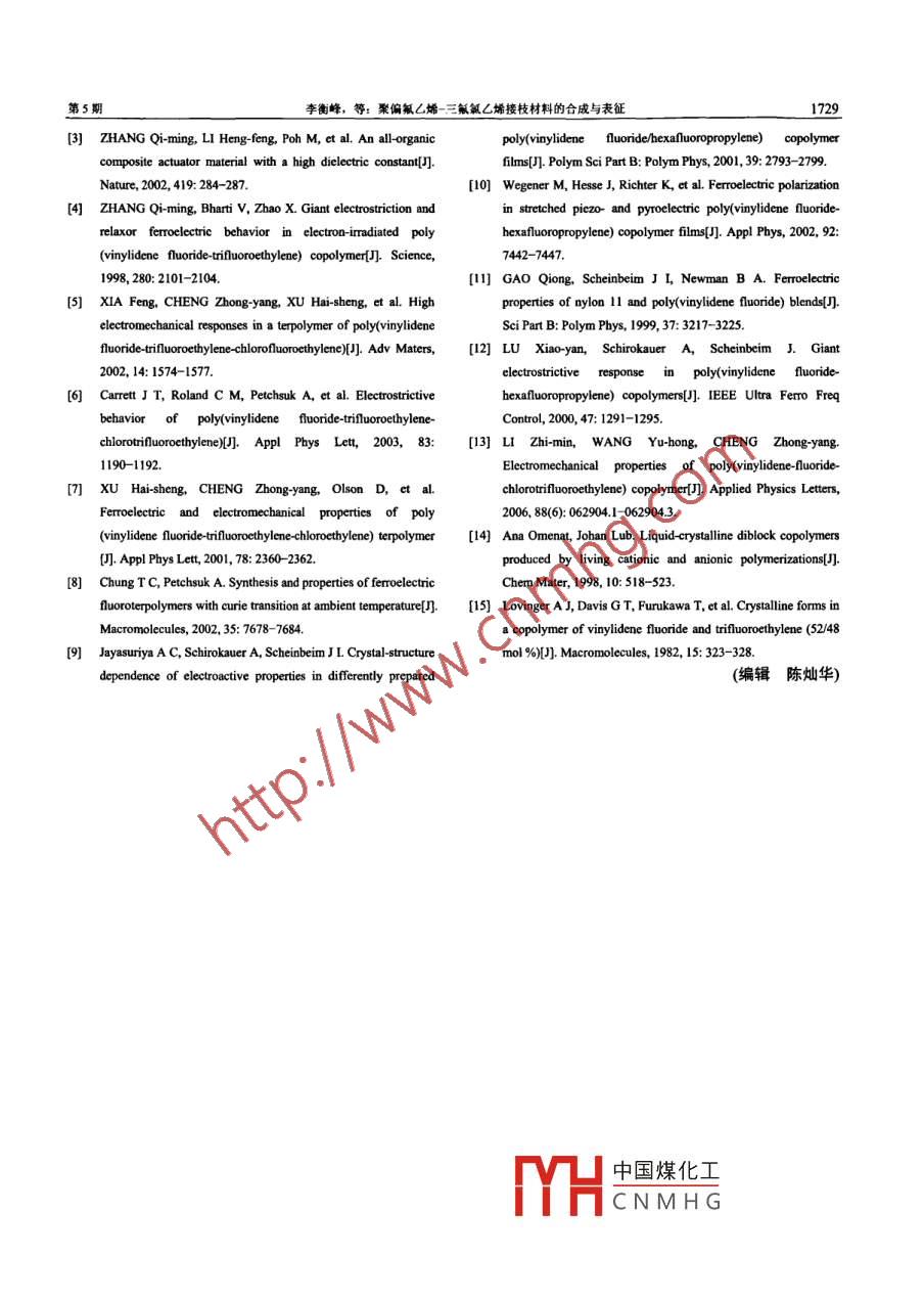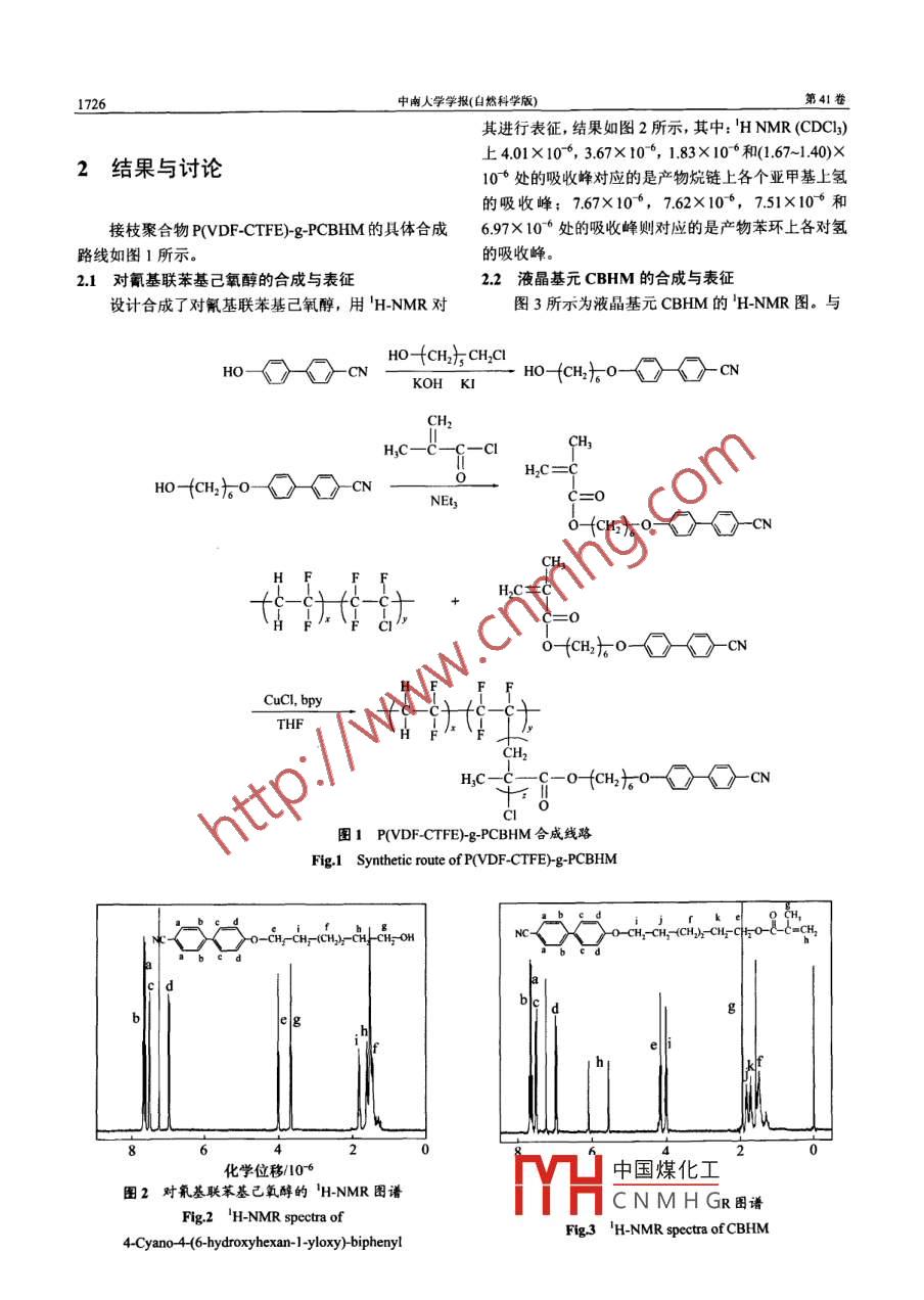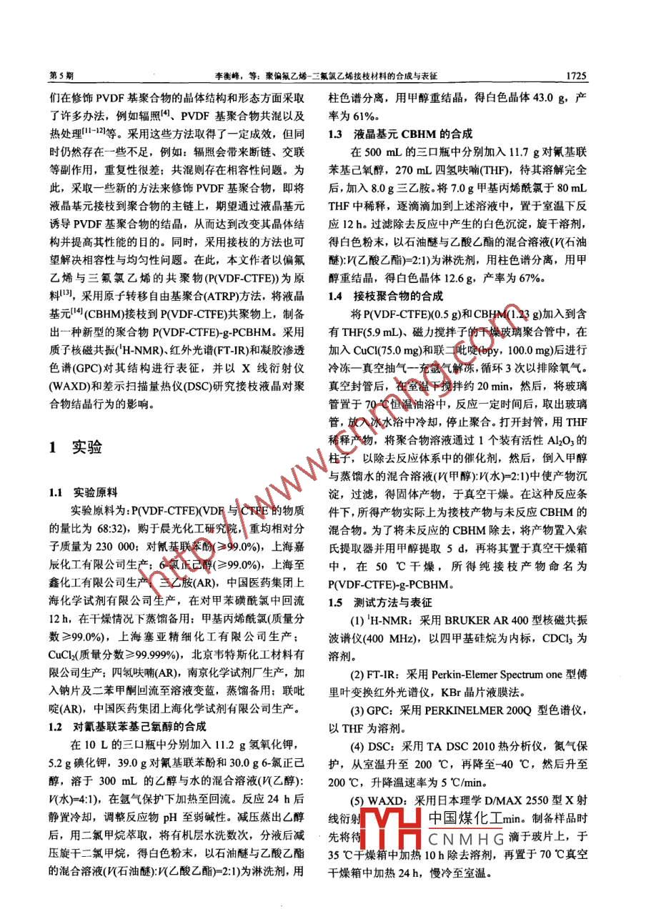第41卷第5期中南大學學報(自然科學版)Vol.41) No.s2010年10月Journal of Central South University (Science and Technology)Oet. 2010聚偏氟乙烯-三氟氯乙烯接枝材料的合成與表征李衡峰'2,郝澤銘',譚凱元',秦牡蘭I(1.中南大學材料科學與工程學院,湖南長沙,410083;2.中南大學粉末冶金國家重點實驗室,湖南長沙,410083)摘要: 以聚偏氟乙烯=氟氯乙烯(polylvinylidene-fluoride-chlorotrifuoroethylene),即P(VDF-CTFE))為引發(fā)劑,采用原子轉移自由基聚合(ATRP),在其主鏈上:接枝液晶6-((4-cyano-4-biphenyl)oxy)hexyl methacrylate(CBHM),合成一種新型的接枝聚合物P(VDF -CTFE)-g-PCBHM。用質子核磁共振('H-NMR)、紅外光譜(FT-IR)、 凝膠滲透色譜(GPC)表征接枝是否成功。并用差示打]描最熱儀(DSC)和廣角X線衍射考察了接枝鏈段對聚合物結晶行為的影響。研究結果表明:在接枝鏈段參與下,聚合物出現了有利于改善材料電致伸縮性的極性β相;這種合成方式也為其他含CTFE的氟聚合物的修飾改性提供了-種可行的方法。關鍵詞:原子轉移自由基聚合;聚偏氟乙烯-三氟氯乙烯;接枝中圖分類號: 0635文獻標志碼: A文章編號: 1672- -7207(2010)05-1724-06Synthesis and characterization of a novel graft copolymerpoly(vinylidene fluoride-co-chlorotrifluoroethylene)-g-poly(-((4-cyano-4-biphenyl)oxy) hexyl methacrylate)LI Heng-feng'2, HAO Ze ming, TAN Kai yuan', QIN Mu-lan'(1. School of Materials Science and Engineering, Central South University, Changsha, 410083, China;2. State Key Laboratory of Powder Metallurgy, Central South University, Changsha 410083, China)Abstract: Using poly(vinylidene-fluoride-chlorotrifluoroethylene) (P(VDF-CTFE)) as the initiator, a novel grafcopolymer of poly(vinvlidene fluoride co-chlorotrifluorothylen-)-g-oly(6-((4 cyano 4-bipheny)oxy) hexyI methacrylate)(P(VDF-CTFE)-g-PCBHM) was synthesized via atom transfer radical polymerization (ATRP). The resultantcopolymerization of P(VDF co-CTFE) was confirmned by 'H NMR, Fourier transform infrared (FT-IR) spectroscopy andgel permeation chromatography (GPC). The influence of PCBHM branch on the crsalization behavior ofP(VDF-CTFE)was investigated using wide angle X-ray diffraction (XRD) and dfferential scanning calorimetry (DSC). The resultsshow that the grafted block is beneficial for polar phase enhancement, and will result in high electrostriction. Thesynthetic approach used here also offers a feasible way to modify other fuoropolymers containing CTFE units.Key words: atom transfer radical polymerization; P(VDF -CTFE); graft電活性聚合物(EAPs)是一~類在外加電場的作用下尤其是聚偏氟乙烯(PVDF)基聚合物2 10。由于它呈現會發(fā)生形變的功能材料,這一特性使得它在執(zhí)行器、出強壓電性和明顯的鐵電性以及柔順性、易加工等特機電、聲電換能器、人造肌肉等領域得到廣泛應用"”。性而備受人們關注??墒?,與壓電陶瓷相比,這些聚近年來,人們研發(fā)了新的、性能優(yōu)異的電活性聚合物,合物'中國煤化于高性能的EAPs,人收稿日期: 2009-10-15; 修回日期: 2010-01-09*TYHCNMHG基金項目:國家自然科學基金貸助項目(50703048)通信作者:李衡峰(1972-), 男,湖南茶陵人,教授,博士生導師,從事功能高分子材料研究;電話: 031-8877873; E-mail: lihengeng@gmail.com第S期李衡峰,等:聚偏氟乙烯-二氟氧乙烯按枝材料的合成與表征1725們在修飾PVDF基聚合物的晶體結構和形態(tài)方面采取柱色譜分離,用甲醇重結晶,得白色晶體43.0 g,產了許多辦法,例如輻照4、PVDF基聚合物共混以及率為 61%。熱處理1-12]等。采用這些方法取得了一定成效,但同1.3 液晶基元CBHM的合成時仍然存在一些不足,例如:輻照會帶來斷鏈、交聯在500 mL的三口瓶中分別加入11.7 g對氰基聯等副作用,重復性很差;共混則存在相容性問題。為苯基己氧醇,270 mL四氫呋喃(THF),待其溶解完全此,采取一些新的方法來修飾PVDF基聚合物,即將后,加入8.0g三乙胺。將7.0 g甲基丙烯酰氯于80 mL液晶基元接枝到聚合物的主鏈上,期望通過液晶基元THF中稀釋,逐滴滴加到上述溶液中,置于室溫下反誘導PVDF基聚合物的結晶,從而達到改變其晶體結應12 h.過濾除去反應中產生的白色沉淀,旋干溶劑,構并提高其性能的目的。同時,采用接枝的方法也可得白色粉末,以石油醚與乙酸厶酯的混合溶液(V(石油望解決相容性與均勻性問題。在此,本文作者以偏氟醚):V(乙酸乙酯)=2:1)為淋洗劑,用柱色譜分離,用甲乙烯與三氟氯乙烯的共聚物(P(VDF-CTFE))為原醇重結晶,得白色晶體12.6g,產率為67%。料),采用原子轉移自由基聚合(ATRP)方法,將液晶.4 接枝聚合物的合成基元4(CBHM)接枝到P(VDF-CTFE)共聚物上,制備將P(VDF-CTFE)(0.5 g)和CBHM(1.23 g)加入到含出一種新型的聚合物P(VDF-CTFE)-g-PCBHM. 采用有THF(5.9 mL).磁力攪拌子的干燥玻璃聚合管中,在質子核磁共振(H-NMR).紅外光譜(FT-JR)和凝膠滲透加入CuCl(75.0 mg)和聯二吡啶(bpy, 100.0 mg)后進行色譜(GPC)對其結構進行表征,并以x線衍射儀冷凍一真空抽氣- - 充氬氣解凍,循環(huán)3次以排除氧氣。(WAXD)和差示掃描量熱儀(DSC)研究接枝液晶對聚真空封管后,在室溫下攪拌約20 min,然后,將玻璃合物結晶行為的影響。管置于70 C恒溫油浴中,反應- -定時間后, 取出玻璃管,放入冰水浴中冷卻,停止聚合。打開封管,用THF稀釋產物,將聚合物溶液通過1個裝有活性Al2O3的1實驗柱子,以除去反應體系中的催化劑,然后,倒入甲醇與蒸餾水的混合溶液(V(甲醇):V(水)=2:1)中使產物沉1.1 實驗原料淀,過濾,得固體產物,于真空干燥。 在這種反應條實驗原料為: P(VDF-CTFE)(VDF與CTFE的物質件下,所得產物實際上為接枝產物與未反