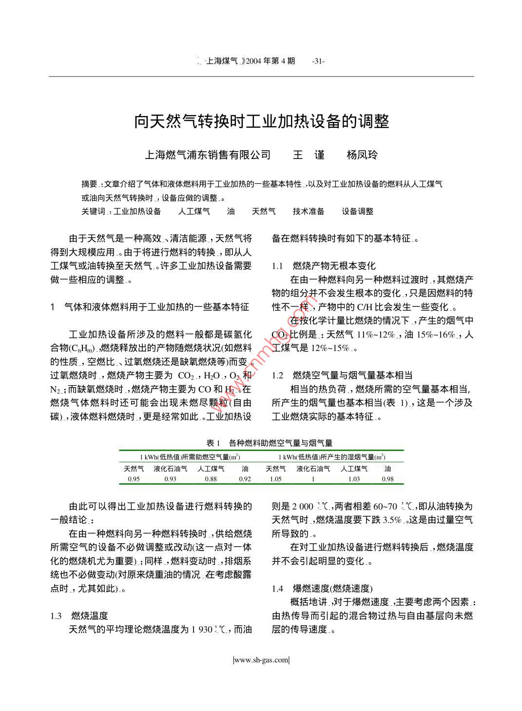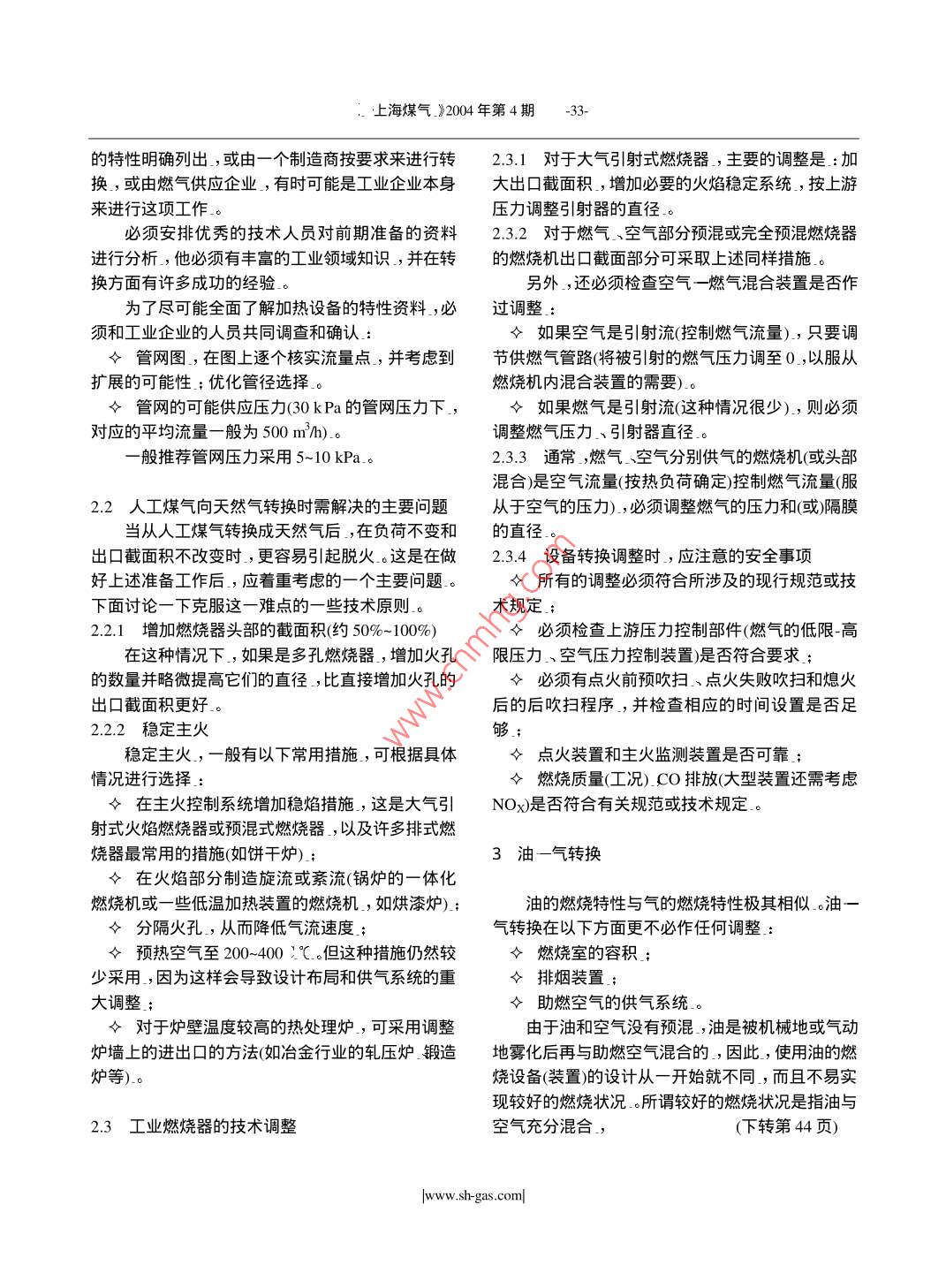上海煤氣_》2004年第4期向天然氣轉(zhuǎn)換時工業(yè)加熱設備的調(diào)整上海燃氣浦東銷售有限公司王謹楊鳳玲摘要:文章介紹了氣體和液體燃料用于工業(yè)加熱的一些基本特性,以及對工業(yè)加熱設備的燃料從人工煤氣或油向天然氣轉(zhuǎn)換時,設備應做的調(diào)整。關鍵詞:工業(yè)加熱設備人工煤氣油天然氣技術準備設備調(diào)整由于天然氣是一種高效、清潔能源,天然氣將備在燃料轉(zhuǎn)換時有如下的基本特征得到大規(guī)模應用。由于將進行燃料的轉(zhuǎn)換,即從人工煤氣或油轉(zhuǎn)換至天然氣。許多工業(yè)加熱設備需要1.1燃燒產(chǎn)物無根本變化做一些相應的調(diào)整。在由一種燃料向另一種燃料過渡時,其燃燒產(chǎn)物的組分并不會發(fā)生根本的變化,只是因燃料的特1氣體和液體燃料用于工業(yè)加熱的一些基本特征性不一樣,產(chǎn)物中的CH比會發(fā)生一些變化。在按化學計量比燃燒的情況下,產(chǎn)生的煙氣中工業(yè)加熱設備所涉及的燃料一般都是碳氫化CO2比例是:天然氣1%-12%,油15%-16%,人合物(CHn)燃燒釋放出的產(chǎn)物隨燃燒狀況(如燃料工煤氣是12%-15%的性質(zhì),空燃比、過氧燃燒還是缺氧燃燒等)而變。過氧燃燒時,燃燒產(chǎn)物主要為CO2,HO,O2和1.2燃燒空氣量與煙氣量基本相當N2;而缺氧燃燒時,燃燒產(chǎn)物主要為CO和H2。在相當?shù)臒嶝摵?燃燒所需的空氣量基本相當,燃燒氣體燃料時還可能會岀現(xiàn)未燃盡顆粒(自由所產(chǎn)生的煙氣量也基本相當(表1),這是一個涉及碳),液體燃料燃燒時,更是經(jīng)常如此。工業(yè)加熱設工業(yè)燃燒實際的基本特征。表1各種燃料助燃空氣量與煙氣量lkWh(低熱值)所需助燃空氣量(m3)kWh低熱值)所產(chǎn)生的濕煙氣量(m)天然氣液化石油氣人工煤氣油然氣液化石油氣人工煤氣油0.880.98由此可以得出工業(yè)加熱設備進行燃料轉(zhuǎn)換的則是2000℃,兩者相差60-70:℃,即從油轉(zhuǎn)換為般結(jié)論天然氣時,燃燒溫度要下跌3.5%。這是由過量空氣在由一種燃料向另一種燃料轉(zhuǎn)換時,供給燃燒所導致的所需空氣的設備不必做調(diào)整或改動這一點對一體在對工業(yè)加熱設備進行燃料轉(zhuǎn)換后,燃燒溫度化的燃燒機尤為重要);同樣,燃料變動時,排煙系并不會引起明顯的變化統(tǒng)也不必做變動(對原來燒重油的情況在考慮酸露點時,尤其如此)1.4爆燃速度(燃燒速度)概括地講,對于爆燃速度,主要考慮兩個因素3燃燒溫度由熱傳導而引起的混合物過熱與自由基層向未燃天然氣的平均理論燃燒溫度為1930℃,而油層的傳導速度。www.sh-gas.com上海煤氣_》2004年第4期因為人工煤氣中H含量一般為30%~40%,天◆燃燒室內(nèi)的壓力然氣或商業(yè)丙烷氣的燃燒速度(約0.4m/s比人工煤◆確定爐膛中的火焰形狀、長度以及溫度的截氣低2~3倍。因此,當工業(yè)加熱設備由人工煤氣轉(zhuǎn)面圖換至天然氣時,如果負荷和燃燒器出口截面不變◇產(chǎn)品的質(zhì)量以及生產(chǎn)數(shù)量方面的相關數(shù)據(jù)有導致脫火的趨勢,應著重考慮采取措施防止脫2.1.1.2燃氣和空氣供應系統(tǒng)火對于燃氣和空氣供應系統(tǒng),需要了解采用預混燃燒器、在引射器附近點火的大氣式◆燃氣調(diào)壓器的特性燃燒器的工業(yè)加熱設備,則有燃燒速度大于混合物◇燃氣供應管的截面積(如在液化石油氣向天出口速度而導致回火的趨勢,應著重考慮采取措施然氣轉(zhuǎn)換時,就非常重要)防止回火◇閥的直徑和特性;◇混合裝置,燃氣負荷可能的變化(如在液化氣2氣一氣轉(zhuǎn)換向天然氣轉(zhuǎn)換時,燃氣負荷就可能減半);◇是否有燃氣引射器,是否要調(diào)整引射器的直2.1轉(zhuǎn)換時的準備工作徑等等。21.1技術準備了解這些情況可能會很煩瑣,但很必要,它是在負荷不變以及需要的助燃空氣量和排放的取得轉(zhuǎn)換成功必不可少的基本條件煙氣量基本相當?shù)那闆r下,燃料轉(zhuǎn)換時并不牽涉到自20世紀60年代以來,法國燃氣公司以及許根本的調(diào)整。然而,為了達到一個成功的轉(zhuǎn)換,必多其它燃氣公司都采用這種重視操作性的方法,使須先對工業(yè)燃燒裝置的運行條件和性能有一個充得轉(zhuǎn)換的成功率一直保持在9%以上.。分的了解,從而可預先知道怎樣根據(jù)新燃料的特性2.1.2資料的管理(利用現(xiàn)存的資料)來進行調(diào)節(jié)以達到成功的轉(zhuǎn)換」先考慮人工煤氣轉(zhuǎn)換成天然氣時,怎樣檢查資21.1.1工業(yè)加熱設備料,這些方法也適用于其它情形對于工業(yè)加熱設備,需要了解以下情況檢查資料時會出現(xiàn)幾種可能性令設備整體的最大功率(裝機功率和有效功率)2.1.2.1資料是最近1-15年間的和最小功率。如果這些數(shù)據(jù)不確定,或者因為設備一般,設備是按可使用各種燃氣而設計的轉(zhuǎn)比較復雜而導致數(shù)據(jù)不全,應立即進行測定換只需考慮怎樣調(diào)節(jié),如壓力調(diào)節(jié),皮膜更換等」◇燃燒機的數(shù)量及其熱負荷制造商應當給出對應于各種燃氣的負荷曲線◇設備類型;和調(diào)整清單?!笕細馀c空氣是分別供應還是預先混合2.122資料是10~25年前的◇額定負荷下,燃氣和空氣的壓力有些設備可能是適用于各種燃氣的,那么只需◇運行模式:全范圍調(diào)節(jié)還是很少調(diào)節(jié)與供應商聯(lián)系,做出相應調(diào)整。有些