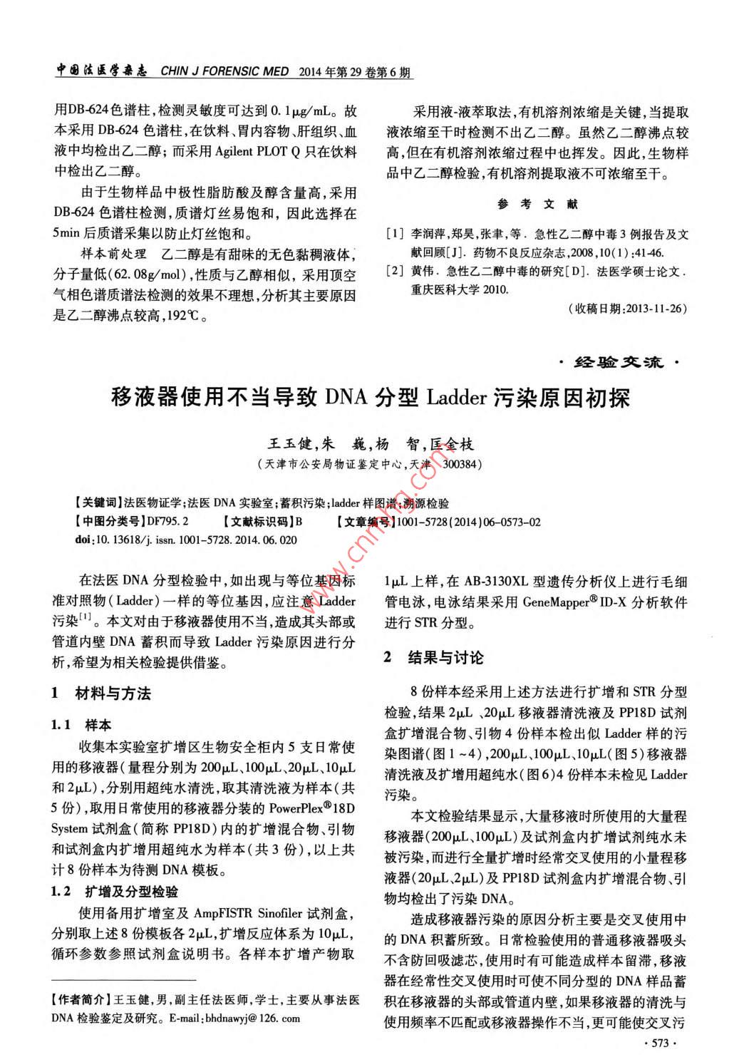 中國法醫(yī)學(xué)來志 CHIN FORENSIC MED2014年第29卷第6期經(jīng)驗(yàn)交流乙二醇中毒死亡檢驗(yàn)1例高慶剛,李占成,艾紹安,常靖2,王磊3(1.榆林市公安局,陜西榆林719000;2公安部物證鑒定中心,北京100038;3.喀什市公安局,新疆喀什84000)【關(guān)鍵詞】法醫(yī)毒物分析;乙二醇;中毒【中圖分類號(hào)】DF795.4【文獻(xiàn)標(biāo)識(shí)碼】B【文章編號(hào)1001-5728(2014)06-0572-02doi:10.16i01-520.0.011案例資料儀器條件:島津Q2010型G/M,I源。DB624彈性毛細(xì)管柱(30m0.25mm0.25m)。進(jìn)樣口溫:張某,男。2013年4月某日,在服用他人提供的250℃;程序升溫:50℃保留1min,以10℃/min升至摻有防凍液的美汁源飲料后死亡提取死者心血、肝120℃后以30℃/min升至260℃,保持10min。離子源組織、胃內(nèi)容物,提取現(xiàn)場(chǎng)喝剩的美汁源飲料及防凍溫:200℃;接口溫:230℃;載氣He,分流比10:1,溶劑液進(jìn)行毒物檢驗(yàn)。切割時(shí)間5.0min,掃描時(shí)間5.0min~19min,掃描范1.1毒物分析檢驗(yàn)圍10~100amu,掃描方式Scan取死者心血2mL、肝組織2g(勻漿)、胃內(nèi)容物1.2檢驗(yàn)結(jié)果2mL、美之源飲料1mL、防凍液1mL,分別加入1g氯化從死者心血、肝組織、胃內(nèi)容物、美之源飲料、防鈉后加入4mL乙酸乙酯提取,振蕩離心,提取有機(jī)相凍液中均檢出乙二醇(圖1、2)。濃縮至約0.1mL供GC/MS分析。1002.52.252.02.001.75151.50101.251.000.50.750.06.07.08.09.010.011.012.013.014.015.016.017.018.06.07.08.09.010.011.0120.04.015.160.018圖1GC/MS分析乙二醇標(biāo)準(zhǔn)溶液圖2GC/MS分析肝組織中乙二醇和甲酸,草酸易很快與鈣結(jié)合形成草酸鈣而沉積。2討論本案例張某在誤服2h后出現(xiàn)頭暈、惡心、嘔吐、2.1乙二醇中毒周身無力、胡言亂語、嗜睡狀態(tài),血壓138/82mmHg;乙二醇俗稱甘醇,是防凍液的主要原料。乙二醇15h后,處于昏睡,呼之不應(yīng),血壓216/135mmHg;24h屬低毒類,人類致死劑量約為1.6g/kg。誤服乙二醇后,心率減慢,深度昏迷,抽搐,嚴(yán)重的代謝性酸中毒在30min~12h內(nèi)發(fā)作,主要癥狀表現(xiàn)為意識(shí)模糊步并血鈣低;30h后死亡,醫(yī)院診斷呼吸衰竭、腎衰竭、態(tài)不穩(wěn)、口齒不清;12h~24h后,高血壓,心跳加速和循環(huán)衰竭、代謝性酸中毒及高鉀血癥。張某的臨床表充血性心臟衰竭;24h~72h后,腰疼、結(jié)晶尿,至無尿現(xiàn)和毒物檢驗(yàn)結(jié)果符合乙二醇中毒的典型特征。而腎衰竭;代謝性酸中毒和低血鈣是乙二醇中毒的典2.2乙二醇檢驗(yàn)型特征12。因?yàn)橐叶荚隗w內(nèi)代謝產(chǎn)物主要是草酸色譜柱選擇乙二醇具有兩個(gè)羥基,其極性較【作者簡(jiǎn)介】高慶剛,男,助理工程師,本科,從事毒物檢驗(yàn)鑒定大本例筆者試用了二種方法(1)采用 Agilent PLOT工作。e-mail:274670722@qq.comQ色譜柱檢測(cè),但檢測(cè)靈敏度低,為1mg/mL;(2)采572中國法醫(yī)學(xué)親志 CHIN FORENSIC MED2014年第29卷第6期用DB624色譜柱,檢測(cè)靈敏度可達(dá)到0.1μg/mL。故采用液液萃取法,有機(jī)溶劑濃縮是關(guān)鍵,當(dāng)提取本采用DB624色譜柱在飲料、胃內(nèi)容物肝組織、血液濃縮至干時(shí)檢測(cè)不出乙二醇。雖然乙二醇沸點(diǎn)較液中均檢出乙二醇;而采用 Agilent PLOT只在飲料高,但在有機(jī)溶劑濃縮過程中也揮發(fā)。因此,生物樣中檢出乙二醇。品中乙二醇檢驗(yàn),有機(jī)溶劑提取液不可濃縮至干。由于生物樣品中極性脂肪酸及醇含量高,采用DB-624色譜柱檢測(cè),質(zhì)譜燈絲易飽和,因此選擇在參考文獻(xiàn)5min后質(zhì)譜采集以防止燈絲飽和。[1]李潤萍,鄭昊,張聿,等.急性乙二醇中毒3例報(bào)告及文樣本前處理乙二醇是有甜味的無色黏稠液體,獻(xiàn)回顧[J].藥物不良反應(yīng)雜志,2008,10(1):4146.分子量低(62.08g/mol),性質(zhì)與乙醇相似,采用頂空[2]黃偉.急性乙二醇中毒的研究[D].法醫(yī)學(xué)碩士論文氣相色譜質(zhì)譜法檢測(cè)的效果不理想,分析其主要原因重慶醫(yī)科大學(xué)2010是乙二醇沸點(diǎn)較高,192℃。(收稿日期:2013-11-26)經(jīng)驗(yàn)交流移液器使用不當(dāng)導(dǎo)致DNA分型 Ladder污染原因初探王玉健,朱巍,楊智,匡金枝(天津市公安局物證鑒定中心,天津300384)【關(guān)鍵詞】法醫(yī)物證學(xué);法醫(yī)DNA實(shí)驗(yàn)室;蓄積污染; ladder樣圖譜;溯源檢驗(yàn)【中圖分類號(hào)DF795.2【文獻(xiàn)標(biāo)識(shí)碼】B【文章編號(hào)】1001-528(2014)06-0573-02doi:10.1368 issn.1001-5728.2014.06.020在法醫(yī)DNA分型檢驗(yàn)中,如出現(xiàn)與等位基因標(biāo)1uL上樣,在AB-3130XL型遺傳分析儀上進(jìn)行毛細(xì)準(zhǔn)對(duì)照物( Ladder)一樣的等位基因,應(yīng)注意 Ladder管電泳,電泳結(jié)果采用 GeneMapperID--X分析軟件污染。本文對(duì)由于移液器使用不當(dāng),造成其頭部或進(jìn)行STR分型。管道內(nèi)壁DNA蓄積而導(dǎo)致 Ladder污染原因進(jìn)行分析,希望為相關(guān)檢驗(yàn)提供借鑒。2結(jié)果與討論1材料與方法8份樣本經(jīng)采用上述方法進(jìn)行擴(kuò)增和STR分型檢驗(yàn),結(jié)果2μL、20μL移液器清洗液及PP18D試劑1.1樣本盒擴(kuò)增混合物、引物4份樣本檢出似 Ladder樣的污收集本實(shí)驗(yàn)室擴(kuò)增區(qū)生物安全柜內(nèi)5支日常使染圖譜(圖4),200L、00L1pL(圖5)移液器用的移液器(量程分別為200L、100L、20L、10L清洗液及擴(kuò)增用超純水(圖6)4份樣本未檢見Ladder和2μL),分別用超純水清洗,