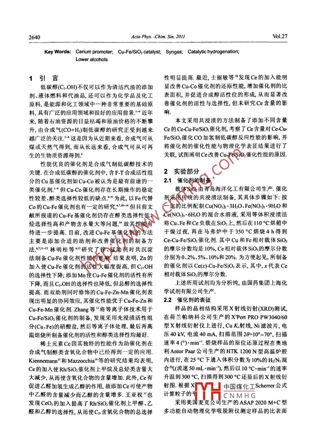 Ce添加對Cu-Fe/SiO2催化合成氣制低碳醇性能的影響