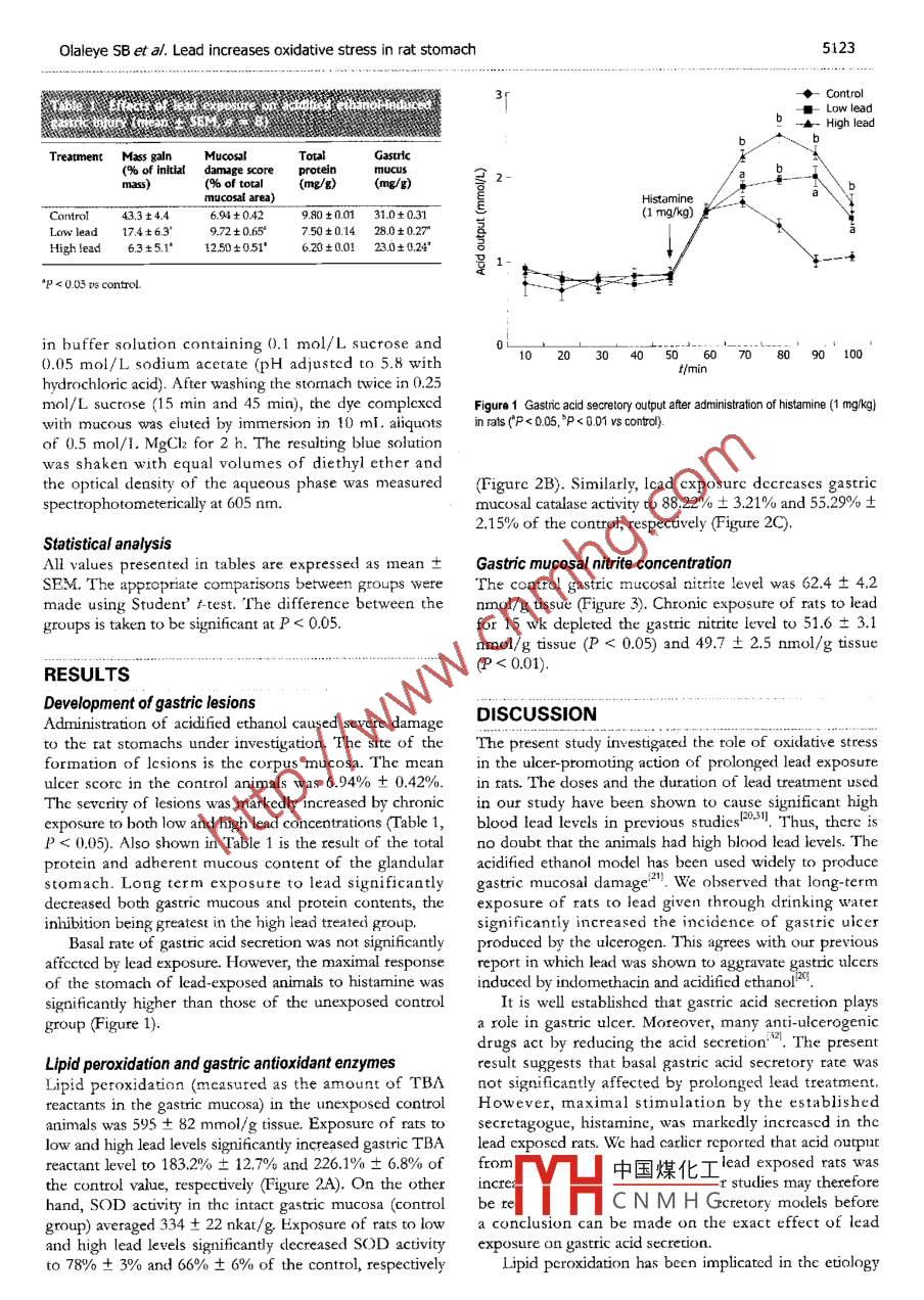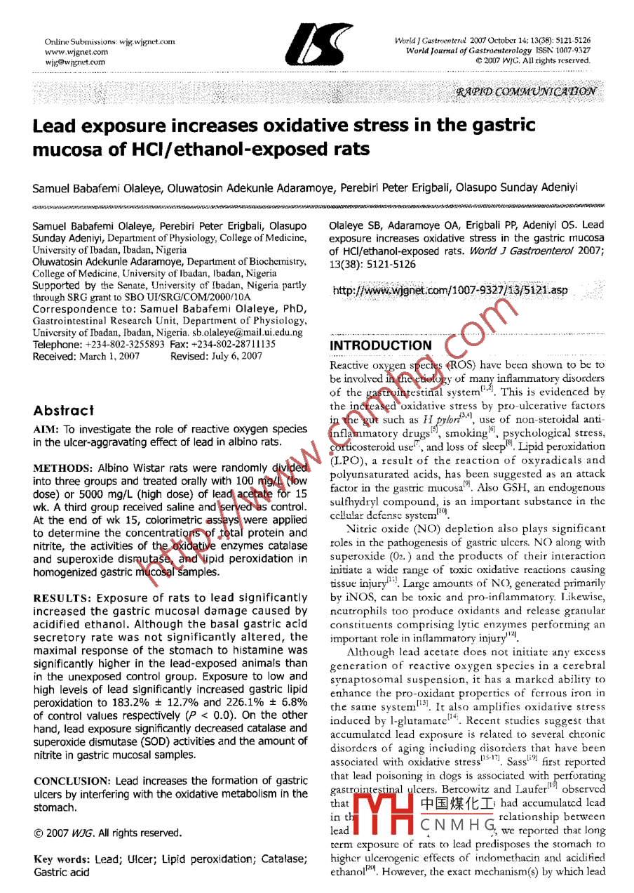Online Submissions: wig wjgnet comWorid Gastroenterol14:1338):51215126logy ISSN 1007-932/G. All rights reserved代 PI COMMMUIGATONLead exposure increases oxidative stress in the gastricmucosa of Hcl/ethanol-exposed ratsSamuel Babafemi Olaleye, Oluwatosin Adekunle Adaramoye, Perebiri Peter Erigbali, Olasupo Sunday AdeniyiSamuel Babafemi Olaleye, Perebiri Peter Erigbali, Olasupo Olaleye SB, Adaramoye OA, Erigbali PP, Adeniyi OS. LeadSunday Adeniyi, Department of Physiology, College of Medicine, exposure increases oxidative stress in the gastric mucosaUniversity of Ibadan, Ibadan, Nigeriaof HCl/ethanol-exposed rats. World J Gastroenterol 2007;Oluwatosin Adekunle Adaramoye, Department of Biochemistry, 13(38):5121-5126College of Medicine, University of Ibadan, Ibadan, NigeriaSupportedbytheSenateUniversityofTbadan,Nigeriapartlyhttp://www.wignet.com/1007-9327/13/5121.aspthrough SRG grant to SBO UISRG/COM/2000/10ACorrespondence to: Samuel Babafemi Olaleye, PhD,Gastrointestinal Research Unit, Department of PhysiologUnivcrsity of Ibadan, Ibadan, Nigeria. sb. olaleye(@mail. ui.edu. ngTelephone:+234802-3255893Fax:+234802-2871l135INTRODUCTIONReceived March 1. 2007Revised: July 6, 2007Reactive oxygen species(ROS) have been shown to be tobe involved in the etiology of many infammatory disordersof the gastrointestinal system. This is evidenced byAbstractthe increased oxidative stress by pro-ulcerative factorsin the gut such as I pylori'use of non-steroidal antiALM: To investigate the role of reactive oxygen species inflammatory drugs sf, smoking 6, psychological stress,in the ulcer-aggravating effect of lead in albino ratcorticosteroid use, and loss of sleep". Lipid peroxidationMETHODS: Albino Wistar rats were randomly divided (PO), a result of the reaction of oxyradicals andwk. a third group received saline and served as control. sulfhydryl compound, is an important substance in theAt the end of wk 15, colorimetric assays were applied ccllular defense systemto determine the concentrations of total protein andNitric oxide(NO)depletion also plays significantnitrite, the activities of the oxidative enzymes catalase roles in the pathogenesis of gastric ulcers. NO along withand superoxide dismutase, and lipid peroxidation in superoxide(Oz )and the products of their interactionhomogenized gastric mucosal samplestissue injury. Large amounts of NO), generated primarilyRESULTS: Exposure of rats to lead significantly by iNOS, can be toxic and pro-inflammatory. Likewise,increased the gastric mucosal damage caused by neutrophils too produce oxidants and release granularacidified ethanol. Although the basal gastric acid constituents comprising lytic enzymes performing arsecretory rate was not significantly altered, the important role in inflammatory injurymaximal response of the stomach to histamine wasAlthough lead acetate does not initiate any excesssignificantly higher in the lead-exposed animals than generation of reactive oxygen species in a cerebralin the unexposed control group. Exposure to low andapiosomauspension, it has a marked abilithigh levels of lead significantly increased gastric lipid enhance the pro-oxidant propertics of ferrous iron inperoxidation to183,2%±127%and226.1%±6.8%of control values respectively (P 0.0). On the other induced by I-glutamatev, amplifies oxidative stressthe same system. It alsehand, lead exposure significantly decreased catalase andaccumulated lead exposure is related to several chronicsuperoxide dismutase(SoD)activities and the amount or disorders of aging inciuding disorders that have beennitrite in gastric mucosal samplesassociated with oxidative stress, Sass first reportedCONCLUSION: Lead increases the formation of gastric that lead poisoning in dogs is associated with perforatingulcers by interfering with the oxidative metabolism in the gastrcers. Bercowitz and Laufer obscrvcdthat中國煤化工 had accumulated lcad1nC 2007 WJG. All rights reserved.leadCNMHG, we reported that longterm exposure of rats to lead predisposes the stomach toKey words: Lead; Ulcer; Lipid peroxidation; Catalase; highcr ulcerogenic effects of indomethacin and acidifiedGastric acidethanol. However, the exact mechanism(s) by which lead5122 ISSN 1007-9327 CN 14-1219/R World J Gastroenterol October 14, 2007 Volume 13 Number 38promotes gastric ulceration is not yet understood. The meter (Watson-Marlow Inc, USA)was passcd through theobjective of the present study thus was to investigate the mouth to the stomach. Tcn minute effuent samples (10.0involvement of ROS in the aggravation of ulceration in t 0. 1 mL each) were collected wia a pyloric cannula andthe stomach of lead-exposed rats.titrated against 0.01 mol/L NaoH using phenolphthaldas indicator. Acidity was expressed in mol/L-/L per minMATERIALS AND METHODSlife. After obtaining a consistent basal acid output, cachanimal was injected wia a femoral vein cannula with eitherChemicals and animals9 g/L NaCl or histamine acid phosphateLead acetate and urethane wcrc obtained from bDhhemicals Ltd, Poole. England. Epinephrinc, 5,5-dithio- Biochemical analysisbis-2-nitrobenzoic acid, hydrogen peroxide, sodium At the cnd of chronic lead exposure, the animals werepentobarbitone, and thiobarbituric acid(TBA)were killed under deep ether anaesthesia and the stomachspurchased from Sigma (St Loius, MO USA). All other wcre removed. Each stomach was cut open through theagents were of analytical grade and were obtaincd from greater curvature, rinsed in normal saline, weighed, andthe British Drug Houses, Poole, UK.homogenized in 10 mL KCl (pH=7. 4). The homogenateYoung male albino Wistar rats(80-90 g) were obtained was subsequently used for total protein estimation. Therom the small animal house, College of Medicine, protein content of the gastric mucosa was estimated by theUniversity of Ibadan, Nigeria. They were randomly divided method of Lowry ef al -using bovine serum albumin as ainto three groups with adequate matching of weight. They standardwere kept in wire 