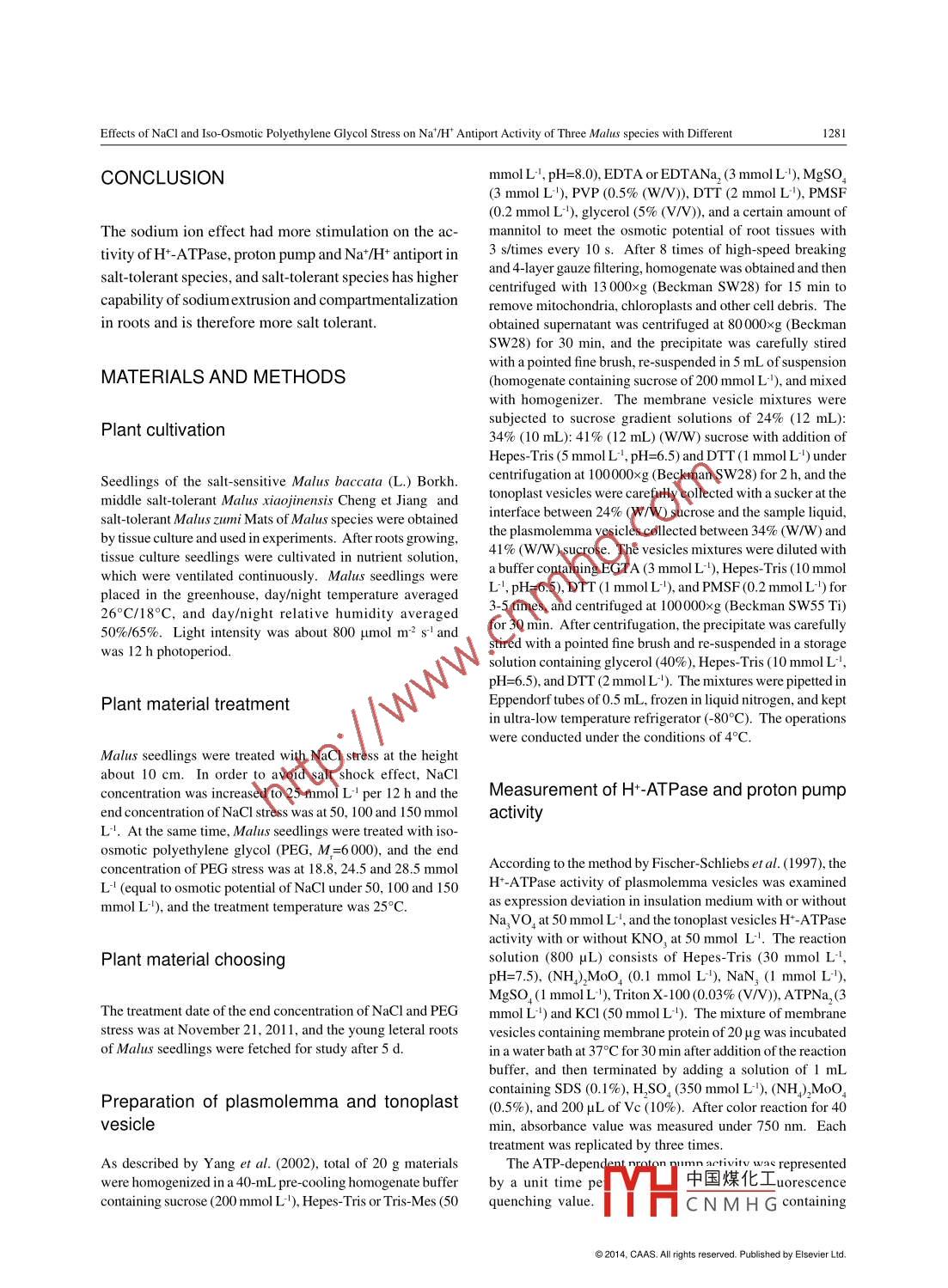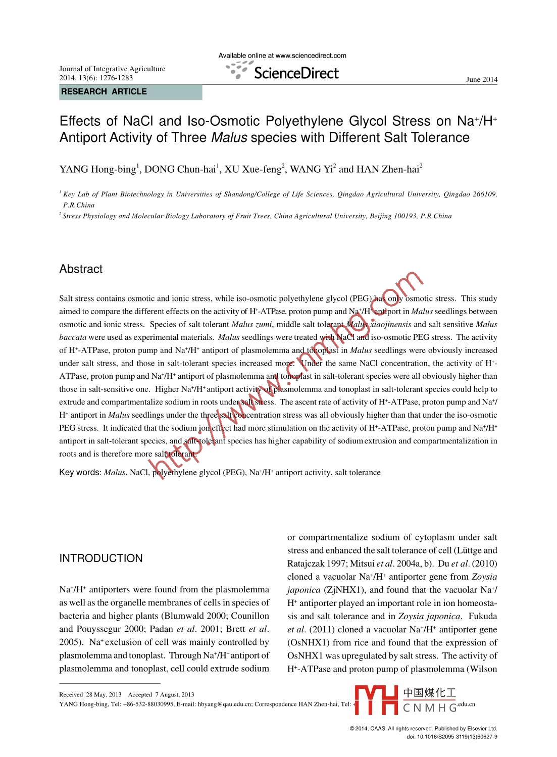 Available online at www. sciencedirect.comJournal of Integrative Agriculture2014, 13(6): 1276- 1283。ScienceDirectJune 2014RESEARCH ARTICLEEffects of NaCl and lso-Osmotic Polyethylene Glycol Stress on Na+/H+Antiport Activity of Three Malus species with Different Salt ToleranceYANG Hong -bing' , DONG Chun-hai, XU Xue feng, WANG Yi2 and HAN Zhen-hai?'Key Lab of Plant Biotechnology in Universities of Shandong/ollege of Life Sciences, Qingdao Agriculural University, Qingdao 266109,P.R.China'Stress Plhysiology and Molecular Biology Laboratory of Fruit Trees, China Agricultural University, Bejing 100193, P.R.ChinaAbstractSalt stress contains osmotic and ionic stress, while iso-osmotic polyethylene glycol (PEG) has only osmotic stress. This studyaimed to compare the different effects on the activity of H-ATPase, proton pump and Na+/H+ antiport in Malus seedlings betweenosmotic and ionic stress. Species of salt tolerant Malus zumi, middle salt tolerant Malus xiaojinensis and salt sensitive Malusbaccata were used as experimental materials. Malus seedlings were treated with NaCl and iso-osmotic PEG stress. The activityof H+-ATPase, proton pump and Na+/H+ antiport of plasmolemma and tonoplast in Malus seedlings were obviously increasedunder salt stress, and those in salt-tolerant species increased more. Under the same NaCl concentration, the activity of H+-ATPase, proton pump and Nat/H+ antiport of plasmolemma and tonoplast in salt-tolerant species were all obviously higher thanthose in salt- sensitive one. Higher Na+/H+ antiport activity of plasmolemma and tonoplast in salt. tolerant species could help toextrude and compartmentalize sodium in roots under salt stress. The ascent rate of activity of H+- ATPase, proton pump and Na+/H+ antiport in Malus seedlings under the three salt concentration stress was all obviously higher than that under the iso-osmoticPEG stress. It indicated that the sodium ion effect had more stimulation on the activity of H*-ATPase, proton pump and Na+/H+antiport in salt-tolerant species, and salt-tolerant species has higher capability of sodium extrusion and compartmentalization inroots and is therefore more salt tolerant.Key words: Malus, NaCl, polyethylene glycol (PEG), Na+/H+ antiport activity, salt toleranceor compartmentalize sodium of cytoplasm under saltstress and enhanced the salt tolerance of cell (Littge andINTRODUCTIONRatajczak 1997; Mitsui et al.2004a, b). Du et al. (2010)cloned a vacuolar Na+/H+ antiporter gene from ZoysiaNa+/H+ antiporters were found from the plasmolemma japonica (ZjNHX1), and found that the vacuolar Na+/as well as the organelle membranes of cells in species of H+ antiporter played an important role in ion homeosta-bacteria and higher plants (Blumwald 2000; Counillonsis and salt tolerance and in Zoysia japonica. Fukudaand Pouyssegur 2000; Padan et al. 2001; Brett et al. et al. (201 1) cloned a vacuolar Na*/H+ antiporter gene2005). Nat exclusion of cell was mainly controlled by(OsNHX1) from rice and found that the expression ofplasmolemma and tonoplast. Through Na+/H+ antiport of OsNHX1 was upregulated by salt stress. The activity ofplasmolemma and tonoplast, cell could extrude sodiumH+-ATPase and proton pump of plasmolemma (WilsonReceived 28 May, 2013 Accepted 7 August, 2013中國煤化工YANG Hong-bing, Tel: +86-532-88030995. E-mail: hbyang@qau.edu.cn; Correspondence HAN Zhen-hai, Tel:.YHCN M H G-edu.cn◎2014, CAAS. All rights reserved. Published by Elsevier Ltd.doi: 10.1016/S2095-3119(13)60627-9Effects of NaCl and Iso-Osmotic Polyethylene Glycol Stress on Na /H* Antiport Activity of Three Malus species with Different1277and Shannon 1995) and tonoplast (Liu et al. 2008) were on salt damage and salt tolerant mechanism in plants.all obviously increased under salt stress; moreover, thatof tonoplast were also increased in some degree underRESULTSwater osmotic stress (Xia et al.2000). Silvaet al. (2010)found that the tonoplast Na+/H+ exchange system ofPopulus euphratica was upregulated and the tonoplastEffects of NaCI and iso-osmotic PEG stressH*-ATPase activity was increased by salt stress. Theon plasmolemma H+-ATPase activity of threeincrease of activity of H+- ATPase and proton pump couldMalus specieshelp to construct the proton electrochemical grads andbecome the basis of Nat/H+ antiport of plasmolemmaTreated with increasing concentration of NaCl andand tonoplast under environmental stress.iso- osmotic PEG, the plasmolemma H+- ATPase activityPeople have found that the tonoplast of CAM plantf M. zumi and M. xiaojinensis was increased (Fig. 1), butMesembryanthemum crsalliumn (Chauhan et al.2000) that of M. baccata was lte increased, especiallyl underand sweet soil plants (Zhang and Blumwald 2001) havethe stress of PEG at 18.8 and 28.5 mmol L'. Under theNa+/H+ antiport activity. And it is believed that the saltsame NaCl concentration, the H+-ATPase activity oftolerance of plants is correlated with the Na+/H+ antiportM. zumi was the highest, followed by M. xiaojinensissactivity. The Na*/H+ antiport activity of plasmolemma and M. baccata, respectively. Bot M. zumi andM. xiao-and tonoplast was found increased under salt stressjinensis increased more than M. baccata under the stress(Allen et al. 1995; Apse et al. 1999).of NaCl at 100 and 150 mmol L and iso-osmotic PEGMalus zumi can maintain normal growth under the sa-(P<0.01). In addition, the H+-ATPase activity of M. xiao-linity of 0.6% of saline alkali soil, which is a salt tolerantjinensis under the stress of NaCl at 150 mmol L' andMalus (Gu et al. 1996). Malus xiaojinensis can bear thethat of M. zumi under the three salt concentration stresssalinity of 0.3% (Zhai et al. 1999), which is a middle saltwas higher than that under the iso-osmotic PEG stress.tolerant Malus; while Malus baccata is a salt sensitiveMalus, and not suitable for saline- alkali soil cultivation(Ma et al. 1992). Salt stress includes osmotic stress andionic stress, while the iso osmotic PEG has only osmoticon tonoplast H+-ATP