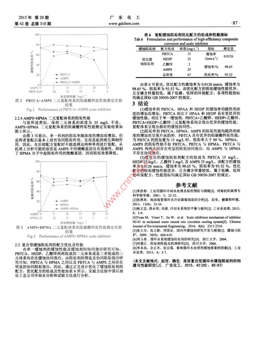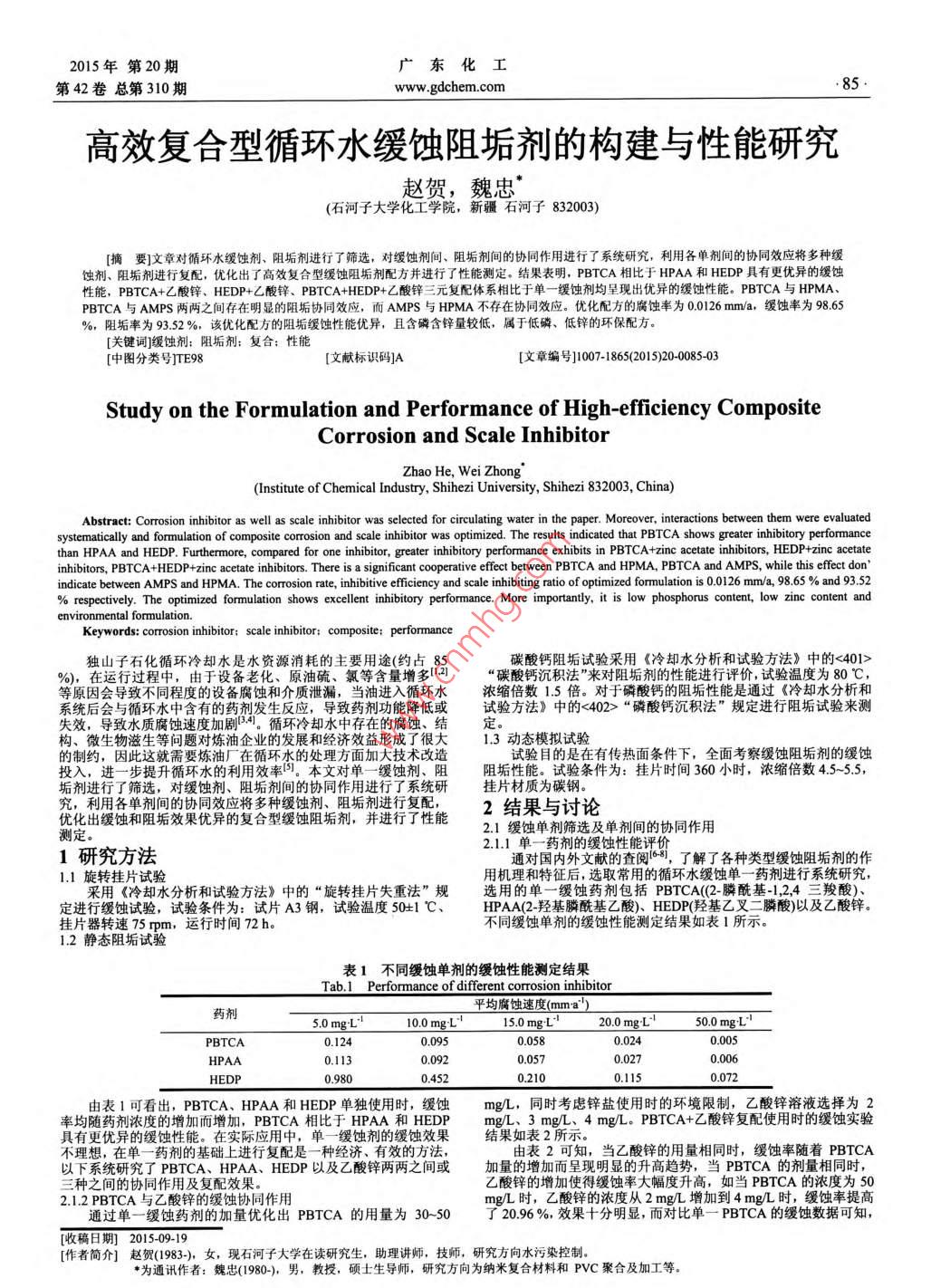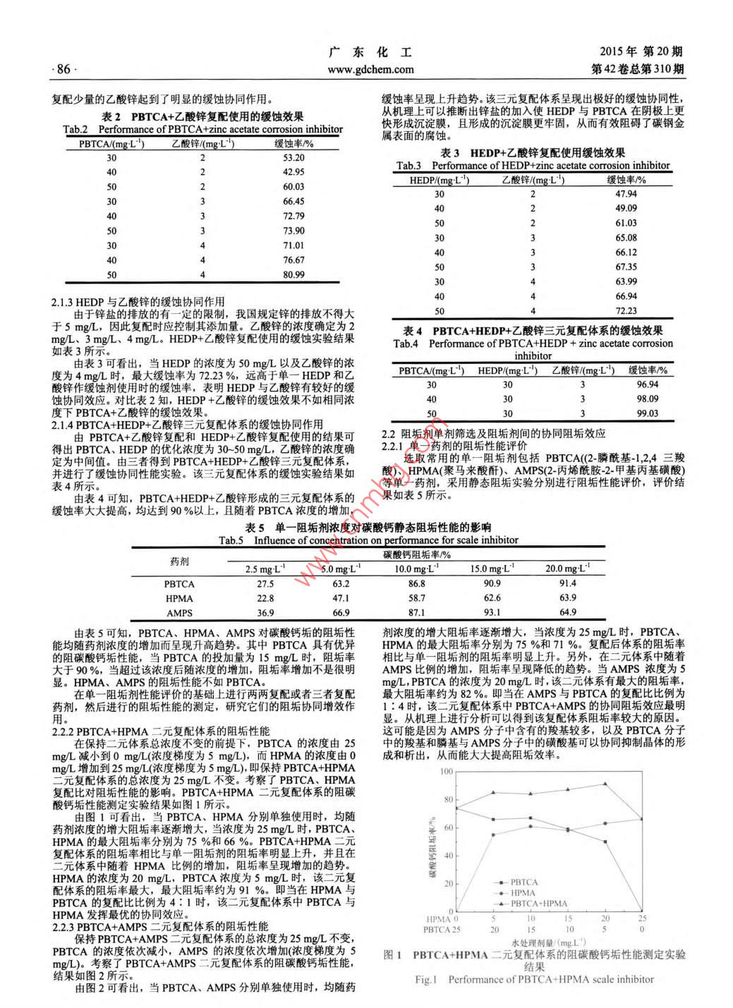 2015年第20期廣東化工第42卷總第310期www.gdchem.com。85.高效復(fù)合型循環(huán)水緩蝕阻垢劑的構(gòu)建與性能研究趙賀,魏忠*(石河子大學(xué)化工學(xué)院,新疆石河子832003)[摘要]文章對(duì)循環(huán)水緩蝕劑、 阻垢劑進(jìn)行了篩選,對(duì)緩蝕劑間、阻垢劑間的協(xié)同作用進(jìn)行 了系統(tǒng)研究, 利用各單劑間的協(xié)同效應(yīng)將 多種緩蝕劑、阻垢劑進(jìn)行復(fù)配,優(yōu)化出了高效復(fù)合型緩蝕阻垢劑配方并進(jìn)行了性能測(cè)定。結(jié)果表明,PBTCA相比于HPAA和HEDP具有更優(yōu)異的緩蝕性能,PBTCA+乙酸鋅、HEDP+乙酸鋅、PBTCA+HEDP+ 乙酸鋅三元復(fù)配體系相比于單-緩蝕 劑均呈現(xiàn)出優(yōu)異的緩蝕性能。PBTCA與HPMA、PBTCA與AMPS兩兩之間存在明顯的阻垢協(xié)同效應(yīng),而AMPS與HPMA不存在協(xié)同效應(yīng)。優(yōu)化配方的腐蝕率為0.0126 mm/a,緩蝕率為98.65%,阻垢率為93.52 %,該優(yōu)化配方的阻垢緩蝕性能優(yōu)異,且含磷含鋅量較低,屬于低磷、低鋅的環(huán)保配方。[關(guān)鍵詞]緩蝕劑:阻垢劑:復(fù)合;性能[中圖分類號(hào)]TE98[文獻(xiàn)標(biāo)識(shí)碼]A[文章編號(hào)]1007-18652015)20-0085-03Study on the Formulation and Performance of High-efficiency CompositeCorrosion and Scale InhibitorZhao He, Wei Zhong(Institute of Chemical Industry, Shihezi University, Shihezi 832003, China)Abstract: Corrosion inhibitor as well as scale inhibitor was selected for circulating water in the paper. Moreover, interactions between them were evaluatedsysteaically and formulation of composite corrosion and scale inhibitor was optimized. The results indicated that PBTCA shows greater inhibitory performancethan HPAA and HEDP. Furthermore, compared for one inhibitor, greater inhibitory performance exhibits in PBTCA+zinc acetate inhibitors, HEDP+zinc acetateinhibitors, PBTCA +HEDP+zinc acetate inhibitors. There is a significant cooperative effect between PBTCA and HPMA, PBTCA and AMPS, while this effect don'indicate between AMPS and HPMA. The corrosion rate, inhibitive eficiency and scale inhibiting ratio of optimized formulation is 0.0126 mm/a, 98.65 % and 93.52% respectively. The optimized formulation shows excellent inhibitorySrfomance.importantly, it is low phosphorus content, low zinc content andenvironmental fomulation.Keywords: corrosion inhibitor; scale inhibitor; composite; performance獨(dú)山子石化循環(huán)冷卻水是水資源消耗的主要用途(約占85碳酸鈣阻垢 試驗(yàn)采用《冷卻水分析和試驗(yàn)方法》中的<401>%),在運(yùn)行過(guò)程中,由于設(shè)備老化、原油硫、氯等含量增多1.2]“碳酸鈣沉積法”來(lái)對(duì)阻垢劑的性能進(jìn)行評(píng)價(jià),試驗(yàn)溫度為80 C,等原因會(huì)導(dǎo)致不同程度的設(shè)備腐蝕和介質(zhì)泄漏,當(dāng)油進(jìn)入循環(huán)水濃縮倍數(shù)1.5 倍。對(duì)于磷酸鈣的阻垢性能是通過(guò)《冷卻水分析和試驗(yàn)方法》中的<402>“磷酸鈣沉積法”規(guī)定進(jìn)行阻垢試驗(yàn)來(lái)測(cè)失效,導(dǎo)致水質(zhì)腐蝕速度加劇.1。循環(huán)冷卻水中存在的腐蝕、結(jié)1.3動(dòng)態(tài)模擬試驗(yàn)構(gòu)、微生物滋生等問(wèn)題對(duì)煉油企業(yè)的發(fā)展和經(jīng)濟(jì)效益形成了很大的制約,因此這就需要煉油廠在循環(huán)水的處理方面加大技術(shù)改造試驗(yàn)?zāi)康氖窃谟袀鳠崦鏃l件下,全面考察緩蝕阻垢劑的緩蝕投入,進(jìn)一步提升循環(huán)水的利用效率5。本文對(duì)單-緩蝕劑、阻阻垢性能。試驗(yàn)條件為:掛片時(shí)間360小時(shí),濃縮倍數(shù)4.5- -5.5,垢劑進(jìn)行了篩選,對(duì)緩蝕劑、阻垢劑間的協(xié)同作用進(jìn)行了系統(tǒng)研掛片材質(zhì)為碳鋼。究,利用各單劑間的協(xié)同效應(yīng)將多種緩蝕劑、阻垢劑進(jìn)行復(fù)配,2結(jié)果與討論優(yōu)化出緩蝕和阻垢效果優(yōu)異的復(fù)合型緩蝕阻垢劑,并進(jìn)行了性能2.1緩蝕單劑篩選及單劑間的協(xié)同作用測(cè)定。2.1.1單一藥劑的緩蝕性能評(píng)價(jià)1研究方法通對(duì)國(guó)內(nèi)外文獻(xiàn)的查閱188,了解了各種類型緩蝕阻垢劑的作1.1旋轉(zhuǎn)掛片試驗(yàn)用機(jī)理和特征后,選取常用的循環(huán)水緩蝕單一藥劑進(jìn)行系統(tǒng)研究,采用《冷卻水分析和試驗(yàn)方法》中的“旋轉(zhuǎn)掛片失重法”規(guī)選用的單一緩蝕藥劑包括PBTCA((2- 膦酰基-1,2,4三羧酸)、定進(jìn)行緩蝕試驗(yàn),試驗(yàn)條件為:試片A3鋼,試驗(yàn)溫度50+1 C、HPAA(2-羥基膦?;宜?、HEDP(羥基乙 叉二膦酸)以及乙酸鋅。掛片器轉(zhuǎn)速75 rpm,運(yùn)行時(shí)間72 h。不同緩蝕單劑的緩蝕性能測(cè)定結(jié)果如表1所示。1.2靜態(tài)阻垢試驗(yàn)表1不同緩蝕單劑的緩蝕性能測(cè)定結(jié)果Tab.1 Performance of different corrosion inhibitor平均腐蝕速度(mma')藥劑5.0 mgL'10.0 mgL1S.0 mgL'20.0 mgL'50.0 mgLPBTCA0.1240.0950.0580.0240.005HPAA0.1130.0570.0270.006HEDP0.9800.452 ,0.2100.115由表1可看出,PBTCA、HPAA和HEDP單獨(dú)使用時(shí),緩饑ng/L, 同時(shí)考慮鋅鹽使用時(shí)的環(huán)境限制,乙酸鋅溶液選擇為2率均隨藥劑濃度的增加而增加,PBTCA相比于HPAA和HEDPmg/L、3 mg/L、4 mg/L. PBTCA+乙酸鋅復(fù)配使用時(shí)的緩蝕實(shí)驗(yàn)具有更優(yōu)異的緩蝕性能。在實(shí)際應(yīng)用中,單一緩蝕劑的緩蝕效果不理想,在單一藥劑的基礎(chǔ)上進(jìn)行復(fù)配是一種經(jīng)濟(jì)、有效的方法,由表2可知,當(dāng)乙酸鋅的