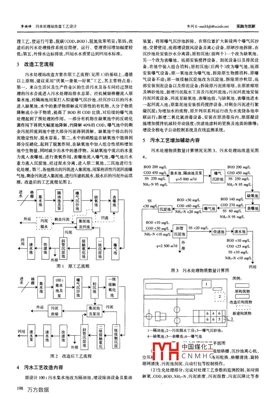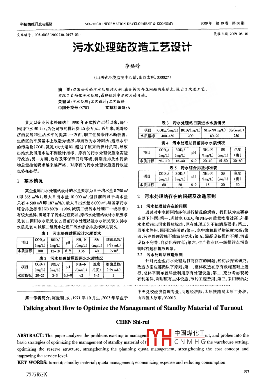 科技情報開發(fā)與經(jīng)濟SCI-TECH INFORMATION DEVELOPMENT & ECONOMY2009年第19卷第30期文章編號:1005-6033(2009 )30-0197-03收稿日期:2009 -08-10污水處理站改造工藝設(shè)計李煥峰(山西省環(huán)境監(jiān)測中心站,山西太原,030027)摘要:以某公司的污水處理站為例,在分析其存在問題的基礎(chǔ)上,提出了改進(jìn)工藝,實現(xiàn)了自動化污水處理,最終達(dá)到中水回用的目的。關(guān)鍵詞:污水處理;工藝設(shè)計;工藝改造中團(tuán)分類號:X703文獻(xiàn)標(biāo)識碼:A某大型企業(yè)污水處理站自1990 年正式投產(chǎn)運行以來.每年表3污水處理站目前進(jìn)水水質(zhì)情況回用中水50萬1,為公司節(jié)約排污費40余萬元。近年來,隨著經(jīng)項目CODg/(mg/L) ]BOD/(mg/L)| NH;-N(mg/L)| Ss/( mg/L)濟的發(fā)展和生活水平的提高,一方面,職工住房條件不斷改善,[水質(zhì)指標(biāo) 40045020080-90250生活區(qū)的平房基本上改造為樓房,早廁改為水沖廁所.造成水中表4污水處理站目前排水水質(zhì)情況的污染物(COD、氨氮)大大增加,超過了原來的設(shè)計負(fù)荷,導(dǎo)致出站水及回用水達(dá)不到設(shè)計指標(biāo),原有的污水處理設(shè)施急需進(jìn)項目CODa1BOD,1HNHr-N ss色度(mg/L)| (mg/L)(mg/L) |(mg/L)| (度)行改造;另-方面,政府及環(huán)保部門對環(huán)境,特別是排放水污染水質(zhì)指標(biāo)50-11018-406-920-4015-50 T 20-60物總量控制要求越來越嚴(yán)格,對原有的污水處理設(shè)施進(jìn)行改進(jìn)表5污水綜合排放標(biāo)準(zhǔn)表也勢在必行。CODa/ BOD3/pH|NH-N ss(mg/L)/(mg/L) I (mg/L(度)1 基本情況水質(zhì)指標(biāo)6020T 6-9↑152050某企業(yè)原污水處理站設(shè)計的水量要求為日平均水量8 750 m'(即365m/h),最大日出水量10000m',但目前的日平均水量.2污水 處理站存在的問題及改造原則只有4500 m2(即187 m?h),最大日出水量6000 m',與國家污水2.1污水處理站存 在的問題綜合排放標(biāo)準(zhǔn)(GB 8978-1996,城鎮(zhèn)二級污水處理廠一級標(biāo)準(zhǔn))通過對中水回用站多年運行情況的觀察,我們認(rèn)為主要存有較大差異.滿足不了污水處理要求。原污水處理站設(shè)計水質(zhì)要求在以下問題:第一,進(jìn)站水COD和NH,-N質(zhì)量濃度過高,外排見表1;回用水水質(zhì)見表2;目前污水處理站進(jìn)水水質(zhì)見表3;排水水水質(zhì)超出國家排放標(biāo)準(zhǔn),原有處理工藝不能滿足要求;第二, .水質(zhì)見表4;城鎮(zhèn)二級污水處理廠污水綜合排放標(biāo)準(zhǔn)見表5?;赜盟S?,回用設(shè)施閑置;第三,水中油和懸浮物濃度太高;第表1污水處理站原設(shè)計水質(zhì)要求I CODa/ BOD/pHNH-NT SS/ T細(xì)菌總數(shù)/四,污泥處理設(shè)施不能滿足要求;第五,混凝設(shè)備操作不便消毒設(shè)備不完善.自動化程度低;第六,生產(chǎn)作業(yè)區(qū)一-級排污 點污染|(mg/L)| (mg/L)《mg/L)| (mg/L) | (個/ mL)物時有超標(biāo)排放現(xiàn)象。水質(zhì)指標(biāo) 100 12~186~9 3.36 .409x102.2 污水處理站改造原則表2污水處理站原回用水水質(zhì)情況針對此企業(yè)污水處理站目前存在的問題,經(jīng)初步探索研究,CODa/ BODNH-NT濁度 細(xì)菌總數(shù)/ ]改造方案應(yīng)遵循以下原則:第一,整體改造在原有設(shè)施基礎(chǔ)上進(jìn)( mg/L)| (mng/L)(mg/L)| (度)| (個/ mL)行,總體平面布置盡量利用原有處理設(shè)施;第二,充分考慮現(xiàn)場水質(zhì)指標(biāo)20-25 3-5 6.5-8- <23-5有利條件,利用原有主體設(shè)施.節(jié)約工程費用;第三,采用新的處中央黨校經(jīng)濟管理專業(yè),助理經(jīng)濟師,太原鐵路局太原工務(wù)段,第一作者簡介:陳世瑞,女.1971年10勝,2003年畢業(yè)于山西省太原市,030013.Talking about How to Optimize the Management of Standby Material of TurnoutCHEN Shi-ruiABSTRACT: This paper analyzes the problems existing in managem中國煤化工u, and probes into thebasic strategies of optimizing the management of standby material of t:YHC N M H G the warehouse stting,optimizing the reserve structure, strengthening the planning quota management, strengthening the cost concept andimproving the service level.KEY WORDS: turmnout; standby material; quota management; economizing expense and reducing consumption197李煥峰污水處理 站改造工藝設(shè)計本刊E-mail:bjb@sxinfo.net實踐與創(chuàng)新理工藝,使運行可靠,脫碳(COD,BOD)、脫氮效果明顯;第四,改裝置;將原曝氣沉沙池拆除,在原位置擴大新建兩個曝氣沉沙造后的污水處理操作系統(tǒng)應(yīng)簡便,運行、管理費用增加幅度較池,交替使用,底部增設(shè)鼓風(fēng)設(shè)備及離心設(shè)備.原曬沙池拆除,在低;第五,外排水達(dá)標(biāo)排放.回用水水質(zhì)要達(dá)到回用水標(biāo)準(zhǔn)。沉沙池處安裝沙水分離器;原初沉池(前兩個)--個改為缺氧池,另一個改為表曝池,底部安裝攪拌設(shè)備、刮泥設(shè)備以及排泥設(shè)3改造工藝流程備,在池中裝人組合填料;原初沉池(后兩個)改為曝氣池,底部污水處理站改造方案在原工藝流程(見圖1)的基礎(chǔ)上,遵循安裝曝氣設(shè)備;原一氧池改為曝氣池.拆除原生物膜填料,原曝以上原則,建議采用“厭氧-兼氧- -好氧"工藝,其主要特點是:氣設(shè)備不動;原一級接觸沉淀池改為沉淀池.拆除原沙粒層,底第-,來白生活區(qū)及生產(chǎn)作業(yè)區(qū)的生活污水及各車間經(jīng)過預(yù)處部安裝刮泥設(shè)備以及排泥設(shè)備;拆除原污泥濃縮塔,在原濃縮塔理的污水合流進(jìn)入污