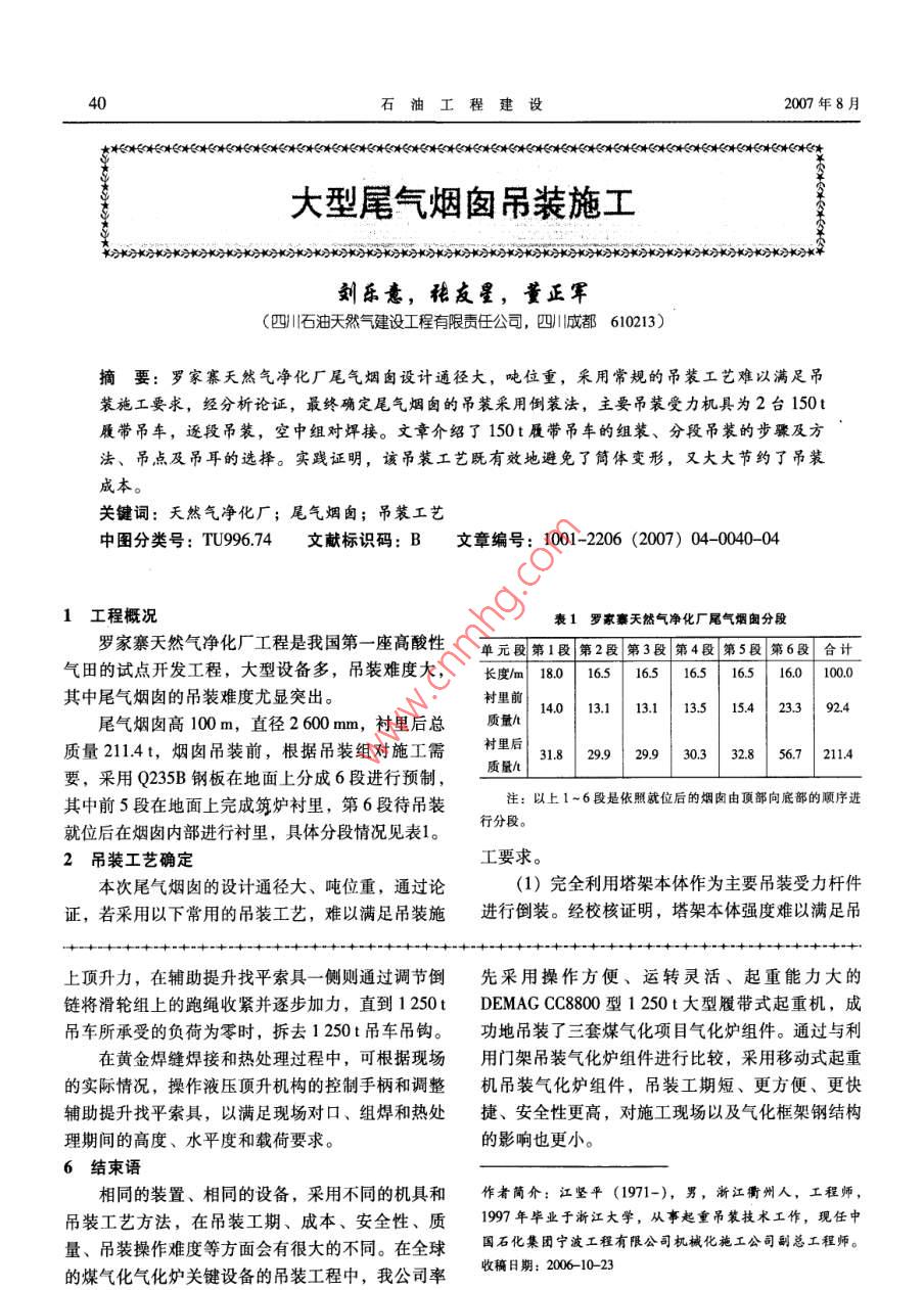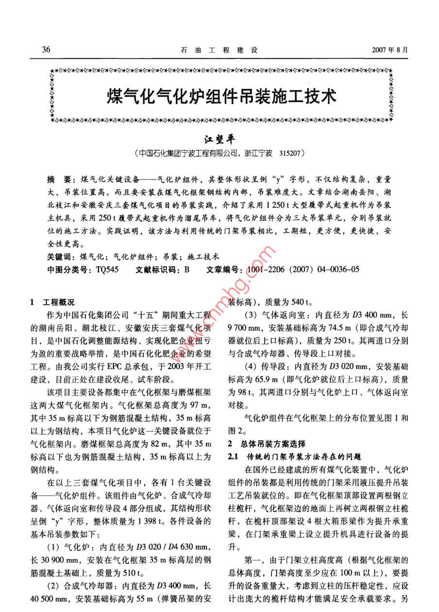 石油工程建設(shè)2007年8月煤氣化氣化爐組件吊裝施工技術(shù)卡方K分水方冰方水方長分水分長方規(guī)分長方X方水分長方水分長方水分水2K分水萬水方K分K》長刀長方長長方水》*分*分*K分*)長》*》*》K》)長》K分K分K》華江堅平(中國石化集團寧波工程有限公司,浙江寧波315207)摘要:煤氣化關(guān)鍵設(shè)備--- 氣化爐組件,其整體形狀呈倒“y”字形,不僅結(jié)構(gòu)復(fù)雜,重量大,吊裝位置高,而且要安裝在煤氣化框架鋼結(jié)構(gòu)內(nèi)部,吊裝難度大。文章結(jié)合湖南岳陽、湖北枝江和安徽安慶三套煤氣化項目的吊裝實踐,介紹了采用1250t大型履帶式起重機作為吊裝主機具,采用250t履帶式起重機作為溜尾吊車,將氣化爐組件分為三大吊裝單元,分別吊裝就位的施工方法。實踐證明,該方法與利用傳統(tǒng)的門架吊裝相比,工期短,更方便,更快捷,安全性更高。關(guān)鍵詞:煤氣化;氣化爐組件;吊裝;施工技術(shù)中圖分類號: TQ545文獻標識碼: B文章編號: 1001-2206 (2007) 04-0036-051工程概況裝標高),質(zhì)量為540t。作為中國石化集團公司“十五”期間重大工程(3)氣體返向室:內(nèi)直徑為D3 400 mm,長的湖南岳陽、湖北枝江、安徽安慶三套煤氣化項9 700 mm,安裝基礎(chǔ)標高為74.5m (即合成氣冷卻目,是中國石化調(diào)整能源結(jié)構(gòu)、實現(xiàn)化肥企業(yè)扭虧器就位后上口標高),質(zhì)量為250t。其兩道口分別為盈的重要戰(zhàn)略舉措,是中國石化化肥企業(yè)的希望與合成氣冷卻器、傳導段上口對接。工程。由我公司實行EPC總承包,于2003年開工(4)傳導段:內(nèi)直徑為D3 020 mm,安裝基礎(chǔ).建設(shè),目前正處在建設(shè)收尾、試車階段。標高為65.9 m (即氣化爐就位后上口標高),質(zhì)量該項目主要設(shè)備都集中在氣化框架與磨煤框架為98t。其兩道口分別與氣化爐上口、氣體返向室這兩大煤氣化框架內(nèi)。氣化框架總高度為97 m,對接。其中35m標高以下為鋼筋混凝土結(jié)構(gòu),35m標高氣化爐組件在氣化框架上的分布位置見圖1和以上為鋼結(jié)構(gòu),本項目氣化爐這一-關(guān)鍵設(shè)備就位于圖2。氣化框架內(nèi)。磨煤框架總高度為82m,其中35 m2總體吊裝方 案選擇標高以下也為鋼筋混凝土結(jié)構(gòu),35 m標高以上為2.1傳統(tǒng)的門架吊裝方法存在的問題鋼結(jié)構(gòu)。在國外已經(jīng)建成的所有煤氣化裝置中,氣化爐在以上三套煤氣化項目中,各有1臺關(guān)鍵設(shè)組件的吊裝都是利用傳統(tǒng)的門架采用液壓提升吊裝備一 氣化爐組件。該組件由氣化爐、合成氣冷卻工藝吊裝就位的。即在氣化框架頂部設(shè)置兩根鋼立器、氣體返向室和傳導段4部分組成,其結(jié)構(gòu)形狀柱桅桿,氣化框架邊的地面上再樹立兩根鋼立柱桅呈倒“y”字形,整體質(zhì)量為1 398t。各件設(shè)備的桿,在桅桿頂部架設(shè)4根大箱形梁作為提升承重基本吊裝參數(shù)如下:梁,在門架承重梁上設(shè)立提升機具進行設(shè)備的提(1)氣化爐:內(nèi)直徑為D3020/D4630mm,升。長30900mm,安裝在氣化框架35m標高層的鋼第一,由于門架立柱高度高(根據(jù)氣化框架的筋混凝土基礎(chǔ)上,質(zhì)量為510t??傮w高度,門架高度至少應(yīng)在100m以上),要提(2)合成氣冷卻器:內(nèi)直徑為D3 400mm,長升的設(shè)備重量大,考慮到立柱的壓桿穩(wěn)定性,應(yīng)設(shè)40500mm,安裝基礎(chǔ)標高為55m(彈簧吊架的安計出龐大的桅桿結(jié)構(gòu)才能滿足安全承載要求。另第33卷第4期江堅平:煤氣化氣化爐組件吊裝施工技術(shù)37又97000作業(yè)無法進行。第四,由于門架提升箱梁安裝高度V94000高,質(zhì)量較重(每件質(zhì)量約80t),仍需要500t級左右的大型吊車才能滿足門架頂部大型提升箱梁的架設(shè)安裝要求,機械費用較高。+84200高溫高壓過湖器5782000受氣化爐組件重量、外形結(jié)構(gòu)和尺寸、運輸?shù)垃F(xiàn)場地面上. V1501路、吊裝機具等諸多條件的限制,無法在設(shè)備制造組焊口包置飛天收集峰.75.000廠內(nèi)完成整臺氣化爐的制造成型工作,必須分成4部分,也就是氣化爐、合成氣冷卻器、氣體返向。1102高空組焊中位置室、傳導段在制造廠制造后,分件運輸?shù)桨惭b現(xiàn)高空組焊口尊置合成氣帝卻幕765000場,在安裝現(xiàn)場進行焊接。2.2利用大型履帶式起重機吊 裝的方案基于門架吊裝氣化爐組件有以上缺點,根據(jù)氣55000化爐組件在氣化框架上的安裝位置和分布特點、吊裝重量、安裝高度、結(jié)構(gòu)尺寸等因素,結(jié)合我公司V49 000大型吊裝裝備、技術(shù)條件和現(xiàn)場特點,經(jīng)過對工彈簧吊架743000期、施工費用、安全各方面的綜合權(quán)衡,決定采用我公司從德國引進的DEMAGCC8800型1250t大735 000型履帶式起重機作為氣化爐組件的吊裝主機具,以250t履帶式起重機作為溜尾吊車,分三大吊裝單34.000元分別吊裝氣化爐組件,即氣化爐、合成氣冷卻器1000 10000 1000 510000以及氣體返向室與傳導段組合件的吊裝就位,在氣256化框架上焊接兩道黃金焊縫拼裝成型。其中氣化圈1氣化爐組件在煤氣化框架上的分布位置立面爐、合成氣冷卻器分別從氣化框架的側(cè)向吊裝進入框架,為此,必須在框架上預(yù)留部分鋼結(jié)構(gòu)梁作為設(shè)備吊裝的入口。氣體返向室與傳導段組合件則直接從框架頂部吊裝穿下。吊裝順序的選擇:因氣化爐是安裝在35 m標高