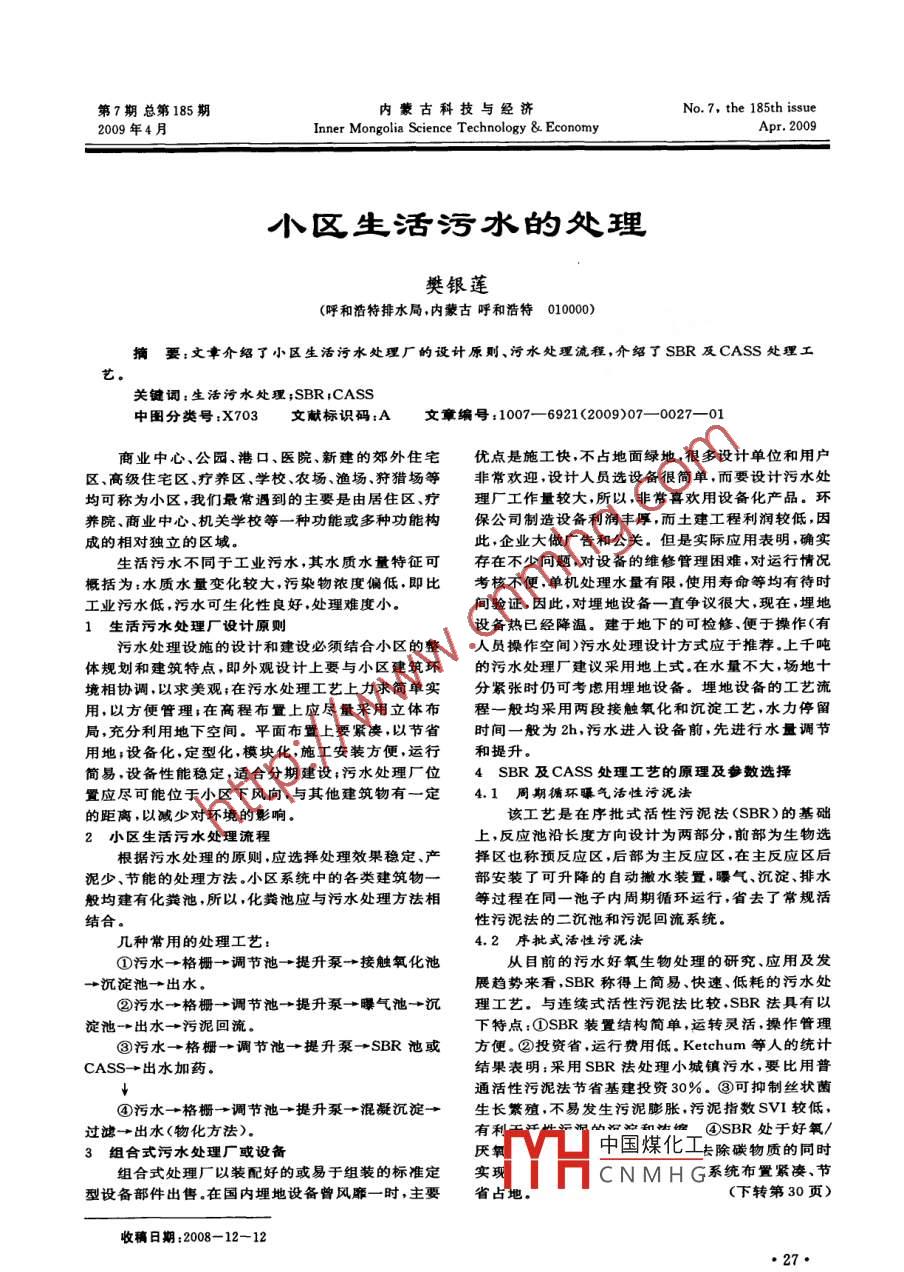 第7期總第185期內(nèi)蒙古科技與經(jīng)濟(jì)No. 7. the 185th issue2009年4月Inner Mongolia Science Technology & EconomyApr.2009小區(qū)生活污水的處理樊銀蓮(呼和浩特排水局,內(nèi)蒙古呼和浩特0000摘要;文章介紹了小區(qū)生活污水處理廠的設(shè)計(jì)原則、污水處理流程,介紹了SBR及CASS處理工藝。關(guān)鍵詞,生活污水處理;SBR,CASS中圖分類號:X703文獻(xiàn)標(biāo)識碼:A .文章編號:1007- -6921 (2009)07- -0027- -01商業(yè)中心、公園、港口、醫(yī)院、新建的郊外住宅優(yōu)點(diǎn)是施工快,不占地面綠地,很多設(shè)計(jì)單位和用戶區(qū)、高級住宅區(qū)、療養(yǎng)區(qū)、學(xué)校、農(nóng)場、漁場狩獵場等非常歡迎,設(shè)計(jì)人員選設(shè)備很簡單,而要設(shè)計(jì)污水處均可稱為小區(qū),我們最常遇到的主要是由居住區(qū)、療理廠工作量較大,所以,非常喜歡用設(shè)備化產(chǎn)品。環(huán)養(yǎng)院、商業(yè)中心、機(jī)關(guān)學(xué)校等- -種功能或多種功能構(gòu)保公司制造設(shè)備利潤豐厚,而土建工程利潤較低,因成的相對獨(dú)立的區(qū)域。此,企業(yè)大做廣告和公關(guān)。但是實(shí)際應(yīng)用表明,確實(shí)生活污水不同于工業(yè)污水,其水質(zhì)水量特征可存在不少問題,對設(shè)備的維修管理困難,對運(yùn)行情況概括為:水質(zhì)水量變化較大,污染物濃度偏低,即比考核不便,單機(jī)處理水量有限,使用壽命等均有待時(shí)工業(yè)污水低,污水可生化性良好,處理難度小。間驗(yàn)證,因此,對埋地設(shè)備一直爭議很大,現(xiàn)在,埋地1生活污水處理廠 設(shè)計(jì)原則設(shè)備熱已經(jīng)降溫。建于地下的可檢修、便于操作(有污水處理設(shè)施的設(shè)計(jì)和建設(shè)必須結(jié)合小區(qū)的整人員操作空間)污水處理設(shè)計(jì)方式應(yīng)于推薦.上千噸體規(guī)劃和建筑特點(diǎn),即外觀設(shè)計(jì)上要與小區(qū)建筑環(huán)的污水處理廠建議采用地上式.。 在水量不大,場地十境相協(xié)調(diào).以求美觀;在污水處理工藝上力求簡單實(shí)分緊張時(shí)仍可考慮用埋地設(shè)備。埋地設(shè)備的工藝流用,以方便管理,在高程布置.上應(yīng)盡量采用立體布程一般均采用兩段接觸氧化和沉淀工藝,水力停留局,充分利用地下空間。平面布置上要緊湊,以節(jié)省時(shí)間一般為2h,污水進(jìn)入設(shè)備前,先進(jìn)行水量調(diào)節(jié)用地;設(shè)備化,定型化,模塊化,施工安裝方便,運(yùn)行和提升.簡易。設(shè)備性能穩(wěn)定,適合分期建設(shè);污水處理廠位SBR及CASS處理工藝的原理及參數(shù)選擇置應(yīng)盡可能位于小區(qū)下風(fēng)向,與其他建筑物有- -定4.1周期循環(huán)曝氣活性污泥法的距離,以減少對環(huán)境的影響●該工藝是在序批式活性污泥法(SBR)的基礎(chǔ)2小區(qū)生活污水處理流程上,反應(yīng)池沿長度方向設(shè)計(jì)為兩部分,前部為生物選根據(jù)污水處理的原則,應(yīng)選擇處理效果穩(wěn)定產(chǎn)擇區(qū)也稱預(yù)反應(yīng)區(qū),后部為主反應(yīng)區(qū),在主反應(yīng)區(qū)后泥少、節(jié)能的處理方法。小區(qū)系統(tǒng)中的各類建筑物一部安裝了可升降的自動撇水裝置,曝氣、沉淀、排水般均建有化糞池,所以,化糞池應(yīng)與污水處理方法相等過程在同一池子內(nèi)周期循環(huán)運(yùn)行,省去了常規(guī)活結(jié)合.性污泥法的二沉池和污泥回流系統(tǒng).幾種常用的處理工藝:4.2 序批式活性污泥法①污水→格柵-→調(diào)節(jié)池- * 提升泵+接觸氧化池從目前的污水好氧生物處理的研究、應(yīng)用及發(fā)→沉淀池- +出水。展趨勢來看,SBR稱得上簡易.快速、低耗的污水處②污水→格柵-→調(diào)節(jié)池→提升泵-一曝氣池-→沉理工藝。與連續(xù)式活性污泥法比較,SBR法具有以淀池→出水→污泥回流。下特點(diǎn):①SBR裝置結(jié)構(gòu)簡單,運(yùn)轉(zhuǎn)靈活,操作管理⑧污水→格柵.→調(diào)節(jié)池- +提升泵→SBR池或方便.②投資省,運(yùn)行費(fèi)用低.Ketchum等人的統(tǒng)計(jì)CASS- +出水加藥.結(jié)果表明;采用SBR法處理小城鎮(zhèn)污水,要比用普通活性污泥法節(jié)省基建投資30%.③可抑制絲狀菌④污水-→格柵→調(diào)節(jié)池- +提升泵+混凝沉淀- +生長繁殖,不易發(fā)生污泥膨脹,污泥指數(shù)SV1較低,過濾→出水(物化方法)。有利④SBR處于好氟/3組合式污水處理廠 或設(shè)備天氧中國煤化工去除碳物質(zhì)的同時(shí)組合式處理廠以裝配好的或易于組裝的標(biāo)準(zhǔn)定實(shí)現(xiàn)YCN M H G系統(tǒng)布置緊湊、節(jié)型設(shè)備部件出售.在國內(nèi)埋地設(shè)備曾風(fēng)靡- -時(shí),主要省占地。(下轉(zhuǎn)第30頁)收稿日期:2008- -12-12●27●總第185期內(nèi)蒙古科技與經(jīng)濟(jì)用的結(jié)果。半焦燃燒時(shí)提高到6X10-*,半焦燃燼時(shí),NO濃度煤中的礦物質(zhì)對NO與半焦的反應(yīng)速率有顯著又恢復(fù)到加煤之前的濃度.本實(shí)驗(yàn)表明,揮發(fā)分中的影響。實(shí)驗(yàn)發(fā)現(xiàn),酸洗脫除礦物質(zhì)的煤其半焦比原煤部分物質(zhì)可以作為還原NO的還原劑,所以,應(yīng)在--半焦的反應(yīng)性小,一些結(jié)果顯示脫灰甚至可使煤半定條件及設(shè)計(jì)下充分利用揮發(fā)分還原NO,從而減少焦的反應(yīng)性降低-