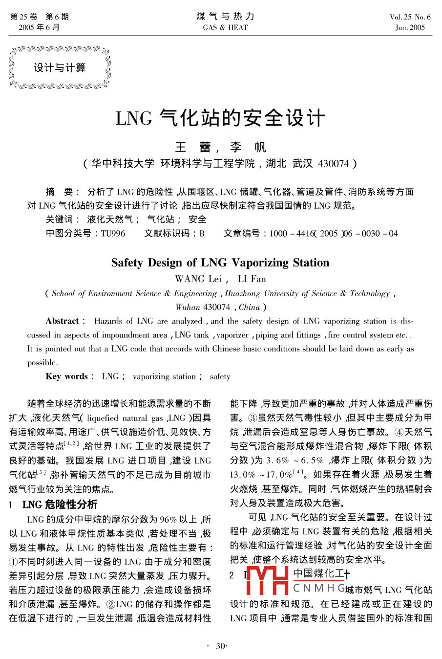 第25卷第6期煤氣與熱力205年6月gas heatJun.20052設計與計算LNG氣化站的安全設計王蕾,李帆華中科技大學環(huán)境科學與工程學院,湖北武漢430074)摘要:分析了LNG的危險性從圍堰區(qū)、LNG儲罐、氣化器、管道及管件、消防系統(tǒng)等方面對LNG氣化站的安全設計進行了討論指出應盡快制定符合我國國情的LNG規(guī)范。關鍵詞:液化天然氣;氣化站;安全中圖分類號:TU996文獻標識碼:B文章編號:1000-4416(2005)6-0030-04Safety Design of LNG Vaporizing StationWANG Lei, li fanSchool of Environment Science Engineering, Huazhong University of Science TechnologyWuhan 430074, China)Abstract: Hazards of LNG are analyzed, and the safety design of LNG vaporizing station is dis-cussed in aspects of impoundment area LNG tank, vaporizer, piping and fittings fire control system etcIt is pointed out that a LNG code that accords with Chinese basic conditions should be laid down as early asKey words: LNG vaporizing station; safety隨著全球經(jīng)濟的迅速增長和能源需求量旳不斷能下降導致更加嚴重的事故并對人體造成嚴重傷擴大液化天然氣( liquefied natural gas LNG)因具害。③雖然天然氣毒性較小,但其中主要成分為甲有運輸效率高、用途廣、供氣設施造價低、見效快、方烷泄漏后會造成窒息等人身傷亡事故。④天然氣式靈活等特點3給世界LNG工業(yè)的發(fā)展提供了與空氣混合能形成爆炸性混合物,爆炸下限(體積良好的基礎。我國發(fā)展LNG進口項目建設ING分數(shù))為3.6%~6.5%爆炸上限(體積分數(shù))為氣化站3]彌補管輸天然氣的不足已成為目前城市13.0%-17.0%4。如果存在著火源極易發(fā)生著燃氣行業(yè)較為關注的焦點火燃燒甚至爆炸。同時氣體燃燒產(chǎn)生的熱輻射會1LNG危險性分析對人身及裝置造成極大危害LNG的成分中甲烷的摩爾分數(shù)為96%以上所可見JNG氣化站的安全至關重要。在設計過以LNG和液體甲烷性質基本類似,若處理不當極程中必須確定與LNG裝置有關的危險根據(jù)相關易發(fā)生事故。從LNG的特性出發(fā)危險性主要有:的標準和運行管理經(jīng)驗對氣化站的安全設計全面①不同時刻進入同一設備的LNG由于成分和密度把關使整個系統(tǒng)達到較高的安全水平。差異引起分層導致LNG突然大量蒸發(fā)壓力驟升。2若壓力超過設備的極限承壓能力,會造成設備損壞TH中國煤化工十CNMHG城市燃氣LNG氣化站和介質泄漏甚至爆炸。②LNG的儲存和操作都是設計的標準和規(guī)范。在已經(jīng)建成或正在建設的在低溫下進行的,一旦發(fā)生泄漏低溫會造成材料性ING項目中通常是專業(yè)人員借鑒國外的標準和國30第6期王蕾等NG氣化站的安全設計第25卷內(nèi)外的管理經(jīng)驗結合工程實際情況進行設計和施b.設置足夠數(shù)量的安全閥安全閥與罐體之間工。常用的國外標準主要有美國標準《液化天然氣設手動截止閥保證儲罐工作壓力在允許范圍內(nèi)LNG)生產(chǎn)、儲存和裝卸標準》NFPA59A)日本內(nèi)筒設安全放空閥連通火炬。外筒泄壓裝置將放部頒標準《一般高壓瓦斯保安法則》等國內(nèi)標準主空氣體引至放空火炬。要有《石油化工企業(yè)設計防火規(guī)范》、《城鎮(zhèn)燃氣設C.每個儲罐的液相管上設2個緊急切斷閥發(fā)計規(guī)范》、《火災自動報警系統(tǒng)設計規(guī)范》等。生意外事故時切斷儲罐與外界的連通防止罐內(nèi)2.1圍堰區(qū)LNG泄漏圍堰區(qū)是指用壓實土、混凝土、金屬等耐低溫材d.每個儲罐設2套相互獨立的液位測量裝置。料在LNG儲罐周圍建造的堤防、護墻或排液系統(tǒng)所e.在儲罐真空夾套層設壓力儀表測量壓力是圍成的區(qū)域。其作用是當LNG泄漏或溢出時將可否在合理范圍內(nèi)燃液體限制在圍堰區(qū)內(nèi)防止進一步擴散當發(fā)生火f.多臺儲罐之間隔離閥的操作水平凈距至少災時阻止火焰向四周蔓延。因此確定圍堰區(qū)容積為0.9m時應考慮LNG儲罐總容積、冬季積雪或其他原因導g.儲罐投入運行時,設溫度檢測儀用來監(jiān)測致圍堰區(qū)蓄液能力下降等多方面因素溫度或作為檢査和校正液位計的工具。2.2LNG儲罐④給設計壓力高于100kPa的儲罐配備相關LNG儲罐安全設計主要有以下幾方面內(nèi)容裝置預防LNG充注過量、液體受熱膨脹造成液位①根據(jù)儲罐容積合理確定安全間距,見表超高以及罐內(nèi)壓力達到安全閥啟動值時液體淹沒安全閥進表1圍堰墻與站區(qū)圍墻之間、儲罐之間的水平凈距⑤為避免罐內(nèi)形成空氣與天然氣的混合物導Tab. 1 horizontal distances from impoundment area to致事故儲罐在首次充注ⅠNG之前或停止使用內(nèi)tation and between tanks部檢修后需要用惰性氣體將罐內(nèi)的空氣或天然氣儲罐容積圍堰墻到站區(qū)圍墻的儲罐之間水平置換出來進行惰化處理8]。V/m'水平凈距最小值凈距最小值/m⑥根據(jù)地質、氣象等資料分析發(fā)生地震、風/m3<0.50.00.0災、雪災等自然災害的可能性及其特征考慮儲罐的0.5≤V/m3<1.93.0抗震和抵御風雪載荷的能力。1.9≤V/m3<7.64.61.52.3氣化器7.6≤Vm<56.87.61.51.5美國標準NFPA59A5將LNG氣化器分為加熱l4.0≤/m3≤265023,0相鄰儲罐公稱直氣化器、環(huán)境氣化器和工藝氣化器3類。其中加熱儲罐公稱直徑的ω7徑之和的J/4且氣化器的氣化熱源是燃料燃燒、電力、鍋爐或內(nèi)燃機265.0