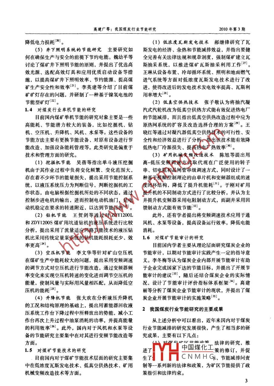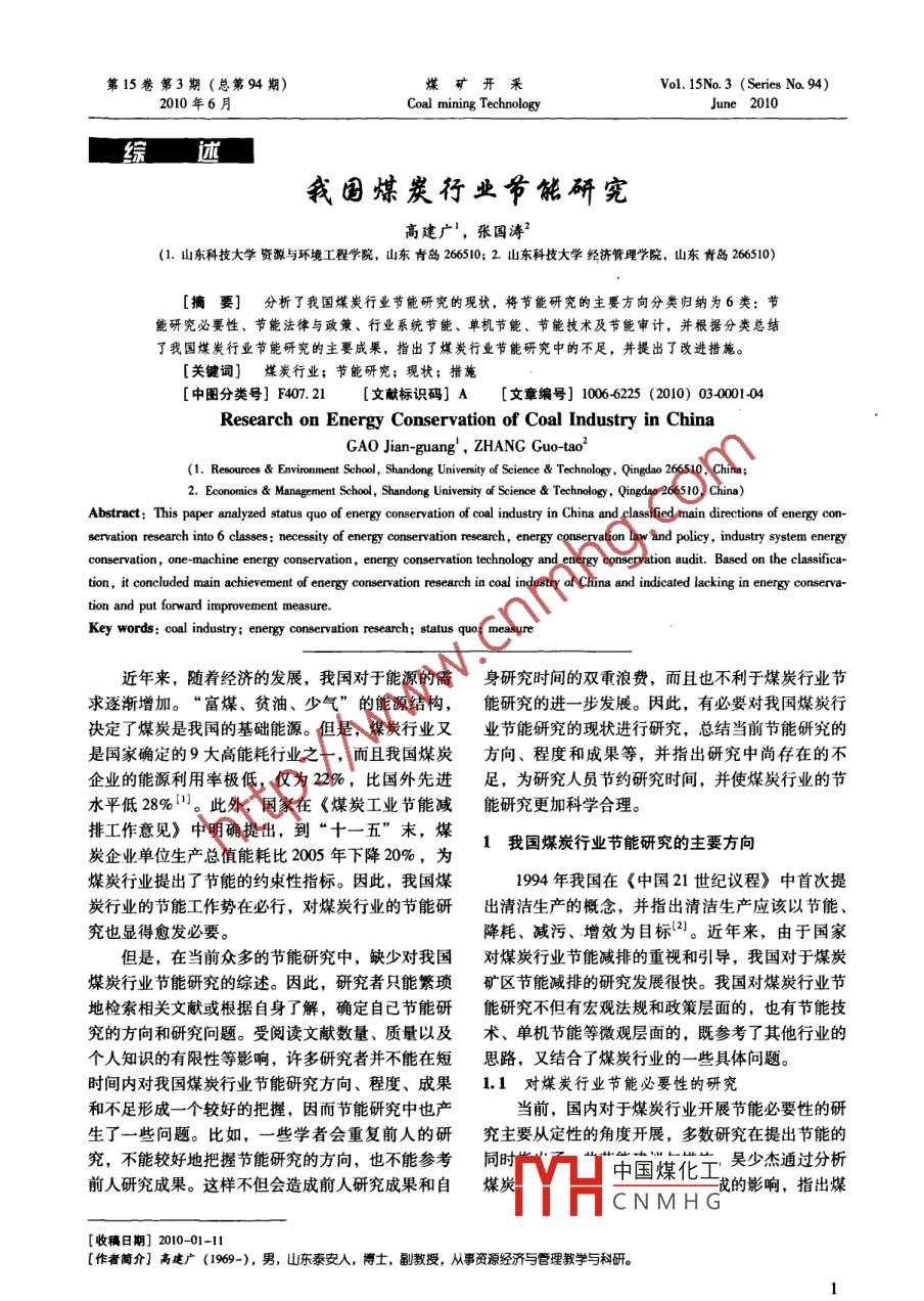 第15卷第3期(總第94期)煤礦開(kāi)采Vol.15No.3 (Series No 94)2010年6月Coal mining TechnologyJune2010四綜I述量我國(guó)煤炭行業(yè)節(jié)能研究高建廣',張國(guó)濤”(1.山東科技大學(xué)資源與環(huán)境工程學(xué)院,山東青島266510; 2.山東科技大學(xué)經(jīng)濟(jì)管理學(xué)院,山東青島266510)[摘要]分析了我國(guó)煤炭行業(yè)節(jié)能研究的現(xiàn)狀,將節(jié)能研究的主要方向分類歸納為6類:節(jié)能研究必要性、節(jié)能法律與政策、行業(yè)系統(tǒng)節(jié)能、單機(jī)節(jié)能、節(jié)能技術(shù)及節(jié)能審計(jì),并根據(jù)分類總結(jié)了我國(guó)煤炭行業(yè)節(jié)能研究的主要成果,指出了煤炭行業(yè)節(jié)能研究中的不足,并提出了改進(jìn)措施。[關(guān)鍵詞]煤炭行業(yè); 節(jié)能研究;現(xiàn)狀;措施[中團(tuán)分類號(hào)] F407. 21[文獻(xiàn)標(biāo)識(shí)碼] A[文章編號(hào)] 1006-6225 (2010) 03-0001.04Research on Energy Conservation of Coal Industry in ChinaGAO Jjan-guang',ZHANG Guo-tao'(1. Resources & Envionment School, Shandong Univernity of Science & Technology , Qingdao 266510, China;2. Economics & Management School , Shandong Univernity of Science & Technology , Qingdao 266510, China)Abstract: This paper analyzed status quo of energy conservation of coal industry in China and cassified main directions of energy con-servation research into 6 classes: necessity of energy conservation research, energy conservation law and policy, industry system energyconservation , one-machine energy conservation, energy conservation technology and energy conservation audit. Based on the casifica-tion, it concluded main achievement of enengy conservation research in coal industry of China and indicated lacking in energy conserva-tion and put forward improvement measure.Key words: coal industry; energy conservation research; status quo; measure近年來(lái),隨著經(jīng)濟(jì)的發(fā)展,我國(guó)對(duì)于能源的需身研究時(shí)間的雙重浪費(fèi),而且也不利于煤炭行業(yè)節(jié)求逐漸增加?!案幻?、貧油、少氣”的能源結(jié)構(gòu),能研究的進(jìn)- 步發(fā)展。因此,有必要對(duì)我國(guó)煤炭行決定了煤炭是我國(guó)的基礎(chǔ)能源。但是,煤炭行業(yè)又業(yè) 節(jié)能研究的現(xiàn)狀進(jìn)行研究,總結(jié)當(dāng)前節(jié)能研究的是國(guó)家確定的9大高能耗行業(yè)之- -,而且我國(guó)煤炭方向、程度和成果等,并指出研究中尚存在的不企業(yè)的能源利用率極低,僅為22%,比國(guó)外先進(jìn)足,為研究人員節(jié)約研究時(shí)間,并使煤炭行業(yè)的節(jié)水平低28%”。此外,國(guó)家在《煤炭工業(yè)節(jié)能減能研究更加科學(xué)合理。排工作意見(jiàn)》中明確提出,到“十一五”末,煤1我國(guó)煤炭行 業(yè)節(jié)能研究的主要方向炭企業(yè)單位生產(chǎn)總值能耗比2005年下降20%,為煤炭行業(yè)提出了節(jié)能的約束性指標(biāo)。因此,我國(guó)煤1994年我國(guó)在《中國(guó)21世紀(jì)議程》中首次提炭行業(yè)的節(jié)能工作勢(shì)在必行,對(duì)煤炭行業(yè)的節(jié)能研出清潔生產(chǎn)的概念,并指出清潔生產(chǎn)應(yīng)該以節(jié)能、究也顯得愈發(fā)必要。降耗、減污、增效為目標(biāo)2。近年來(lái),由于國(guó)家但是,在當(dāng)前眾多的節(jié)能研究中,缺少對(duì)我國(guó)對(duì)煤炭行業(yè)節(jié)能減排的重視和引導(dǎo),我國(guó)對(duì)于煤炭煤炭行業(yè)節(jié)能研究的綜述。因此,研究者只能繁瑣礦區(qū)節(jié)能減排的研究發(fā)展很快。我國(guó)對(duì)煤炭行業(yè)節(jié)地檢索相關(guān)文獻(xiàn)或根據(jù)自身了解,確定自已節(jié)能研能研究不但有宏觀法規(guī)和政策層面的,也有節(jié)能技究的方向和研究問(wèn)題。受閱讀文獻(xiàn)數(shù)量、質(zhì)量以及術(shù)、 單機(jī)節(jié)能等微觀層面的,既參考了其他行業(yè)的個(gè)人知識(shí)的有限性等影響,許多研究者并不能在短思路,又結(jié)合了煤炭行業(yè)的一-些具體問(wèn)題。時(shí)間內(nèi)對(duì)我國(guó)煤炭行業(yè)節(jié)能研究方向、程度、成果1.1 對(duì)煤炭行業(yè)節(jié)能必要性的研究和不足形成--個(gè)較好的把握,因而節(jié)能研究中也產(chǎn)當(dāng)前,國(guó)內(nèi)對(duì)于煤炭行業(yè)開(kāi)展節(jié)能必要性的研生了一些問(wèn)題。比如,一些學(xué)者會(huì)重復(fù)前人的研究主要從定性的角度開(kāi)展,多數(shù)研究在提出節(jié)能的究,不能較好地把握節(jié)能研究的方向,也不能參考同時(shí)中國(guó)煤化主,吳少杰通過(guò)分析前人研究成果。這樣不但會(huì)造成前人研究成果和自煤炭求的影響,指出煤TYHCNMHG[收稿日期] 2010-01-11[作者簡(jiǎn)介]高建廣(1969-), 男,山東泰安人,博士,副教授,從事資源經(jīng)濟(jì)與管理教學(xué)與科研??偟?4期煤礦開(kāi)采2010年第3期炭行業(yè)當(dāng)前肩負(fù)著煤炭開(kāi)采和節(jié)能減排的雙重任1.3對(duì)煤炭行業(yè)系統(tǒng)節(jié)能 的研究務(wù),并提出了節(jié)能減排的方法措施2)。陳金偉認(rèn)目前我國(guó)煤炭行業(yè)系統(tǒng)節(jié)能的研究主要集中在為實(shí)現(xiàn)能源資源節(jié)約,是擺在煤炭企業(yè)面前的重大通風(fēng)系統(tǒng)、排水系統(tǒng)、礦區(qū)供熱系統(tǒng)、供電系統(tǒng)和課題和迫切任務(wù),并提出通過(guò)結(jié)構(gòu)調(diào)整