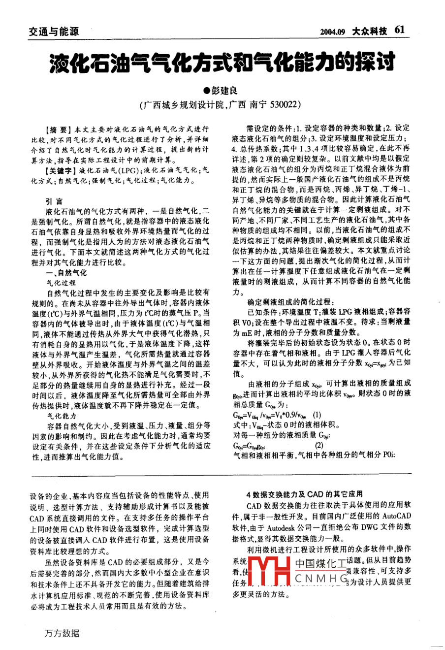 交通與能源200109大眾科技61滴化石油氣氣化方式和氣化能力的探討●彭建良(廣西城鄉(xiāng)規(guī)劃設計院,廣西南寧53002)【摘要】本文主要對液化石油氣的氣化方式進行需設定的條件:1.設定容器的種類和數(shù)量;2.設定比較,對不同氣化方式的氣化過程進行了分析,并詳細液態(tài)液化石油氣的組分;3.設定環(huán)境溫度和設定壓力;介紹了自然氣化時氣化能力的計算過程,提出新的計4.總傳熱系數(shù);其中1、3、4項比較容易確定,在此不再算方法,指導在實際工程設計中的前期計算。詳述,第2項的確定則較復雜。以前文獻中均是以假定鍵字】液化石油氣(LPG);液化石油氣氣化;氣液態(tài)液化石油氣的組分為丙烷和正丁烷混合液體為前化方式;自然氣化;強制氣化;氣化過程;氣化能力。提的然而實際上一般國產(chǎn)液化石油氣的組成不是丙烷和正丁烷的混合物,而是丙烷、丙烯、異丁烷、丁烯-1引言異丁烯、異烷等多物質(zhì)的混合物。因此計算液化石油氣液化石油氣的氣化方式有兩種,一是自然氣化,二自然氣化能力的關鍵就在于計算一定剩液組成。對不是強制氣化。所謂自然氣化,就是指容器中的液態(tài)液化同產(chǎn)地、不同廠家、不同工藝生產(chǎn)的液化石油氣,其中各石油氣依靠自身顯熱和吸收外界環(huán)境熱量而氣化的過種物質(zhì)的組成均不相同。以前,當液化石油氣的組成不程,而強制氣化是指用人為的方法對液態(tài)液化石油氣是丙烷和正丁烷兩種物質(zhì)時,確定剩液組成只能采取近進行氣化。下面本文就簡述這兩種氣化方式的氣化過似估算的辦法,其結果往往偏差較大。本文就重點討論程并對其氣化能力進行比較。下這方面的問題,提出漸次氣化的簡化過程,從而計自然氣化算出在任一計算溫度下任意組成液化石油氣在一定剩氣化過程液量時的剩液組成,從而計算不同容器的自然氣化能自然氣化過程中發(fā)生的主要變化及影響是比較有力規(guī)則的。在尚未從容器中往外導出氣體時容器內(nèi)液體確定剩液組成的簡化過程溫度(t℃)與外界氣溫相同壓力為C時的蒸氣壓P。當知條件:環(huán)境溫度T;灌裝LPG液相組成;容器容容器內(nèi)的氣體被導出時,由于液體溫度(t℃)與氣溫相積vo;設在整個導出過程中液溫不變。待求:當剩液量同,液體不能通過傳熱從外界大氣中獲得氣化潛熱,只為mE時,液相的分子分數(shù)和質(zhì)量分數(shù)。有消耗自身的顯熱用以氣化,于是液體溫度下降,這樣將灌裝完畢后的初始狀態(tài)設為狀態(tài)0。在狀態(tài)0時液體與外界氣溫產(chǎn)生溫差,氣化所需熱量就通過容器容器中存在著氣相和液相。由于IPG灌人容器后氣化壁從外界吸收。開始液體溫度與外界氣溫之間的溫差量不大,可以認為此時的液相分子分數(shù)x=xm為已知較小,從外界所獲得的氣化熱不能滿足氣化需要時,不值足部分的熱量繼續(xù)用自身的顯熱進行補充。經(jīng)過一段由液相的分子組成x可計算出液相的質(zhì)量組成時間以后,液體溫度降至氣化所需熱量可全部由外界進而計算出液相的平均比體積v。則狀態(tài)0時的液傳熱提供時,液體溫度就不再下降并穩(wěn)定在一定值相總質(zhì)量Co為氣化能力容器自然氣化大小,受到液溫、壓力、液量、組分等式中:V畫-狀態(tài)0時的液相體積因素的影響和制約。因此在考慮氣化能力時,通常均要對每一種組分的液相質(zhì)量設定有關條件,并在這些設定條件下分析氣化的適應G=C(2)性,進而推算出氣化能力值。氣相和液相相平衡,氣相中各種組分的氣相分PO:設備的企業(yè),基本內(nèi)容應當包括設備的性能特點、使用4數(shù)據(jù)交換能力及CAD的其它應用說明、選型計算方法、支持輔助形成計算書以及能被CAD數(shù)據(jù)交換能力往往取決于具體使用的應用軟CAD系統(tǒng)直接調(diào)用的文件。在支持多任務的操作平臺件屬于非一般性開發(fā)。目前國內(nèi)廣泛使用的 AutoCAD上同時使用CAD軟件和設備選型軟件,完成計算選型軟件由于 Autodesk公司一直拒絕公布DWG文件的數(shù)的設備被直接調(diào)人CAD軟件進行布置,這是使用設備據(jù)格式顯得其數(shù)據(jù)交換能力一般。資料庫比較理想的方式。利用微機進行工程設計所使用的眾多軟件中操作雖然設備資料庫是CAD的必要組成部分,又是今系統(tǒng)中國煤化工話題。但從目前趨勢后需要完善的部分然而國內(nèi)大多數(shù)中小型企業(yè)在意識看雖兼容性、可支持多和技術條件上還不具備開發(fā)它的能力。但隨著建筑給排任務CNMHG為設計人員提供更水計算機應用標準、規(guī)范的不斷完善,使用設備資料庫多更靈活的方法。必將成為工程技術人員常用而且是有效的方法。62大眾科技200409交通與能源P-容器內(nèi)導出氣體的密度(kgm)。式中:P一第i種組分的飽和蒸氣壓力。二、強制氣化氣相的總壓P氣化過程強制氣化分為氣相導出和液相導出兩種方式。由由式(3)(4)可計算出氣相各組分的分子分數(shù)x。于氣相導出方式在氣化過程中熱量損失嚴重,氣化能力由各組分的p氣相體積v可計算出各組分的氣相質(zhì)低,目前已很少采用。本文主要討論液相導出方式。量液相導出方式是從裝有液體的容器內(nèi)將液態(tài)液化漸次氣化簡化過程為:瞬時將氣相全部導出,液相石油氣導出送至專設的氣化器中進行氣化。在氣化過程中有一