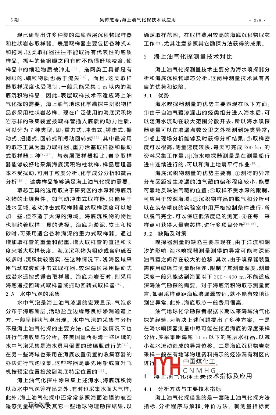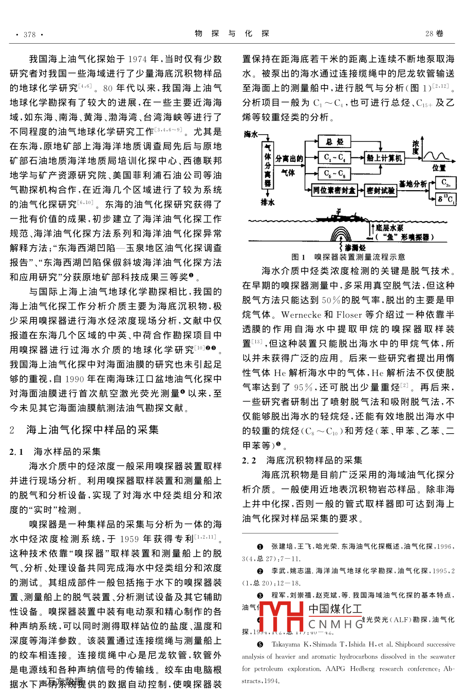 第28卷第5期物探與化探Vol 28. No 52004年10月geophysical & GEOCHEMICAL EXPLORATIONOct,,2004海上油氣化探技術(shù)及應(yīng)用吳傳芝,程同錦,宣玲(中國石油化工集團(tuán)石油勘探開發(fā)研究院石油化探研究所,安徽合肥230022)摘要:海域油氣化探測量指標(biāo)一般為海底沉積物中的烴類及其蝕變產(chǎn)物和海水介質(zhì)中的烴類,以烴類濃度及其蝕變產(chǎn)物為主要測量對(duì)象的油氣化探是評(píng)價(jià)海上油氣遠(yuǎn)景為數(shù)不多的重要方法之一。目前底層水采樣分析與海底沉積物取芯分析已成為海上油氣化探一種有效且相對(duì)經(jīng)濟(jì)的技術(shù)組合,海底沉積物取芯測量和海水嗅探器現(xiàn)場分析是海上油氣化探的主要手段。國內(nèi)外眾多海域油氣化探研究結(jié)果證實(shí),海域油氣化探在含油氣遠(yuǎn)景區(qū)塊識(shí)別和含油氣遠(yuǎn)景構(gòu)造油氣屬性判識(shí)方面可以提供重要的地球化學(xué)信息關(guān)鍵詞:地球化學(xué)檢測;嗅探器;取芯器;海域;油氣化探中圖分類號(hào):P632文獻(xiàn)標(biāo)識(shí)碼:A文章編號(hào):1000-8918(2004)05-0377-05地下油氣藏中的烴類向地表方向運(yùn)移,從而在中烴濃度分析,六七十年代海水中烴濃度檢測活動(dòng)油氣藏上方形成一系列異常效應(yīng)。這是油氣化探的進(jìn)入了一個(gè)高潮,幾乎每一家較大的美國石油公司理論基礎(chǔ),也是被眾多勘探實(shí)踐證實(shí)了的客觀現(xiàn)象。都進(jìn)行了海水中烴濃度的檢測12。20世紀(jì)70年海域油氣藏中的烴類組分同樣會(huì)向上運(yùn)移,形成以代以來,海底沉積物取芯技術(shù)獲得了快速發(fā)展,一些海底沉積物烴濃度及其蝕變產(chǎn)物異常、海水烴濃度原有的取芯工具得到了進(jìn)一步完善,使人們能夠更異常以及海面油膜及海面大氣異常為主的一系列異有效地獲得符合需要的海底沉積物樣品,從而為海常效應(yīng)。海域油氣藏形成的這些異常效應(yīng)已成為海底沉積物的地球化學(xué)分析奠定了基礎(chǔ)。在目前的海上油氣化探的基本檢測對(duì)象。迄今為止,在世界眢上油氣地球化學(xué)勘探中,海底沉積物的地球化學(xué)分大海域進(jìn)行的油氣化探研究,所用的地球化學(xué)檢測析已成為不可缺少的組成部分,有時(shí)甚至只進(jìn)行海技術(shù)主要包括海水烴濃度的現(xiàn)場分析和海底沉積物底沉積物的地球化學(xué)研究,來進(jìn)行地下油氣預(yù)測的取芯測量。早期是通過使用“嗅探器”裝置對(duì)海水從20世紀(jì)60年代至八九十年代,國內(nèi)外一些中的烴濃度進(jìn)行¨實(shí)時(shí)”檢測。20世紀(jì)⑦0年代以石油公司在眾多海域進(jìn)行了大量的油氣化探研究,來,海底取芯技術(shù)的快速發(fā)展使海底沉積物取芯分測區(qū)幾乎遍及世界各大洲大陸邊緣的近海區(qū)域。北析成為海上油氣化探的重要組成部分,使海上油氣海、墨西哥灣、圣·巴巴拉海峽、阿拉斯加灣、非洲西化探分析項(xiàng)目突破了單一旳烴組分和濃度檢測.而部近海以及南美洲大陸邊緣的許多近海區(qū)域,是海能夠像陸上化探一樣,測定沉積物中眾多組分。目上油氣化探研究進(jìn)行得非常集中的地區(qū)。近海油氣前,底層水采樣分析與海底沉積物取芯分析已成為地球化學(xué)檢測活動(dòng)的主體是美國一些石油公司和研海上油氣化探中有效且相對(duì)經(jīng)濟(jì)的技術(shù)組合究機(jī)構(gòu)。海灣石油公司、勘探技術(shù)公司、地球化學(xué)和海上油氣化探概況環(huán)境研究組、國際地球化學(xué)服務(wù)公司以及地球衛(wèi)星公司等在南北美洲近海、非洲西部近海以及澳大利在海洋環(huán)境中應(yīng)用油氣化探技術(shù)尋找油氣富集亞近海的眾多海域進(jìn)行了海水和沉積物烴濃度研區(qū)塊,始于20世紀(jì)50年代后期-。早期是美國究,研究內(nèi)容包括海水溶解烴、游離烴及海底沉積物些油氣地球化學(xué)勘探者采用嗅探器裝置進(jìn)行海水存留H中國煤化工航空測量°°CNMHGO MacDonald I R. Reilly J F Jr, Guinasso N L Jr,et al. A remote-sensing inventory of active oll seeps, Northern Gulf of Mexico. AAPG2 Amos J F. Everett J R Detecting natural marine oil seeps from space: comparison of Landsat, SPOY, seasat, SIR-A, Almaz and ERS-1mgery,Santa Barbara Channel, California, U. S A. AAPG Hedberg research conference: Abstracts, 1994收稿日動(dòng)方數(shù)據(jù)6-26·378·物探與化探我國海上油氣化探始于1974年,當(dāng)時(shí)僅有少數(shù)置保持在距海底若干米的距離上連續(xù)不斷地泵取海研究者對(duì)我國一些海域進(jìn)行了少量海底沉積物樣品水。被泵岀的海水通過連接纜繩中的尼龍軟管輸送的地球化學(xué)研究。80年代以來,我國海上油氣至海面上的測量船中,進(jìn)行脫氣與分析(圖1)2.12地球化學(xué)勘探有了較大的進(jìn)展,在一些主要近海海分析項(xiàng)目一般為C1~C,也可進(jìn)行總烴、C1s+及乙域,如東海、南海、黃海、渤海灣、臺(tái)灣海峽等進(jìn)行了烯等較重?zé)N類的分析。不同程度的油氣地球化學(xué)研究工作。尤其是海水在東海,原地礦部上海海洋地質(zhì)調(diào)查局先后與原地礦部石油地質(zhì)海洋地質(zhì)局培訓(xùn)化探中心、西德聯(lián)邦體分離出的C2-C算機(jī)E地學(xué)與礦產(chǎn)資源研究院、美國菲利浦石油公司等油離氣體C氣勘探機(jī)