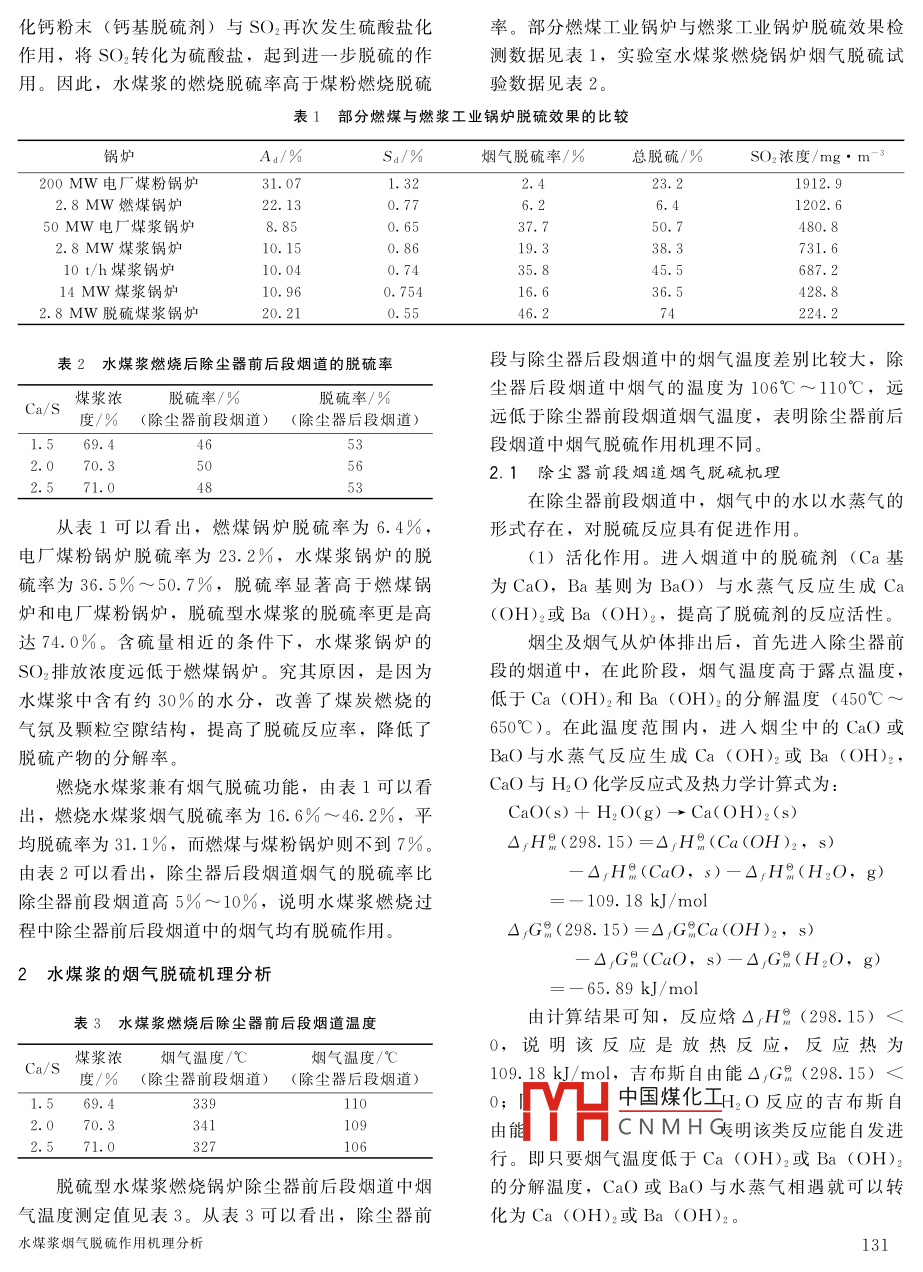 ★節(jié)能與環(huán)?!锼簼{煙氣脫硫作用機(jī)理分析陳占文1王海生2唐海香3(1.冀中能源股份有限公司邢臺(tái)礦,河北省邢臺(tái)市,054026;2.開(kāi)灤集團(tuán)股份有限公司東歡坨礦業(yè)分公司,河北省唐山市,064002;3.華北科技學(xué)院,河北省三河市,065201)摘要通過(guò)燃煤與燃漿鍋爐脫硫效果的分析與比較,論證了水煤漿具有煙道脫硫作用,闡述了水煤漿煙氣脫硫作用機(jī)理。高溫條件下,在除塵器前段煙道脫硫劑吸附水蒸氣生成氫氧化物,再與SO2發(fā)生反應(yīng)生成硫酸鹽,同時(shí),脫硫劑產(chǎn)生粉化,比表面積增加,提高了固—?dú)夥磻?yīng)的接觸碰撞機(jī)率;除塵器后段煙道煙氣溫度接近或低于露點(diǎn)溫度,脫硫劑表面存在水滴或液膜,在液膜或液滴中,脫硫劑與SO2發(fā)生反應(yīng)生成CaSO3或CaSO4,從而實(shí)現(xiàn)了脫硫,減少了SO2排放濃度關(guān)鍵詞水煤漿脫硫率露點(diǎn)煙氣中圖分類(lèi)號(hào)TQ53文獻(xiàn)標(biāo)識(shí)碼AAnalysis of desulphurization mechanism of coal water slurry for flue gasChen Zhanwen, Wang haisheng, Tang haixiang(1. Xingtai Coal Mine, Jizhong Energy Resources Co, Ltd, Xingtai, Hebei 054026, China;2. Donghuantuo Branch Company, Kailuan Group Co, Ltd, Tangshan, Hebei 064002, China3. North China Institute of Science and Technology, Sanhe, Hebei 065201, China)Abstract Through the analysis and the comparison of desulfurization efficiency between coaland slurry combustion boilers, it is proved that the coal water slurry possesses desulfurizationeffect for flue gas. The desulfurization mechanism of coal water slurry for flue gas was expounded. At the higher temperature, desulphurizer absorbs water vapor to form hydroxidein beforethe dust collector, which reacts with SO, to form sulphate. The desulphurizer simultaneously become powder, and the increased specific surface area enhances the contact collision probability ofgas solid reaction. After escaping from dust collector, the flue gas temperature is close to or lower than the dew point temperature, then water droplets or a liquid film cover the surface of desulhurizer. The calcium in the surface water exists in the form of Cat, and SO2 is absorbed by thewater film through diffusion to convert HSO,, which reacts with Ca2 to form CaSO3, achieving the desulfurization and the reduction of So2 emission concentrationds coal water slurry, desulphurization degree, dew point temperature, flue gas水煤漿是一種新型低污染代油燃料,其主要成于爐內(nèi)脫硫反應(yīng)發(fā)生。試驗(yàn)研究證明,水煤漿還具分為約70%的煤、30%的水和少量添加劑,而脫有煙道脫硫功能。分析研究水煤漿的煙道脫硫作用硫型水煤漿中還含有一定量的脫硫劑。水煤漿既保機(jī)進(jìn)水煤漿鍋爐煙道結(jié)構(gòu)、發(fā)揮水煤漿的煙持了煤原有的物理特性,又具有石油一樣的流動(dòng)性道中國(guó)煤化工有重要的現(xiàn)實(shí)意義。和穩(wěn)定性CNMHG與燃泉鍋肥偷雙果的分析與比較與燃煤相比,水煤漿具有明顯的脫硫優(yōu)勢(shì),是水煤漿中煤炭粒度較細(xì),脫硫劑易在水煤漿中均水煤漿燃燒過(guò)程中,會(huì)產(chǎn)生大量的水蒸氣,水勻混合;二是水煤漿中含有約30%的水分,有利蒸氣與煙塵、煙氣一起進(jìn)入煙道后,有利于促進(jìn)氧中國(guó)煤炭第40卷第5期2014年5化鈣粉末(鈣基脫硫劑)與SOε再次發(fā)生硫酸鹽化率。部分燃煤工業(yè)鍋爐與燃漿工業(yè)鍋爐脫硫效果檢作用,將SO2轉(zhuǎn)化為硫酸鹽,起到進(jìn)一步脫硫的作測(cè)數(shù)據(jù)見(jiàn)表1,實(shí)驗(yàn)室水煤漿燃燒鍋爐煙氣脫硫試用。因此,水煤漿的燃燒脫硫率髙于煤粉燃燒脫硫驗(yàn)數(shù)據(jù)見(jiàn)表2表1部分燃煤與燃漿工業(yè)鍋爐脫硫效果的比較Ad/%煙氣脫硫率/%總脫硫/%SO2濃度/mg:m00MW電廠煤粉鍋爐31.0723.21912.92.8MW燃煤鍋爐0MW電廠煤漿鍋爐27681202.62.8MW煤漿鍋爐10.1519.338.3731.610t/h煤漿鍋爐10.04687.214MW煤漿鍋爐0.7542.8MW脫硫煤漿鍋爐20.2146.2表2水煤漿燃燒后除塵器前后段煙道的脫硫率段與除塵器后段煙道中的煙氣溫度差別比較大,除煤漿濃脫硫率/%脫硫率/%塵器后段煙道中煙氣的溫度為106℃~110℃,遠(yuǎn)度/%(除塵器前段煙道)(除塵器后段煙道遠(yuǎn)低于除塵器前段煙道煙氣溫度,表明除塵器前后1.569.4段煙道中煙氣脫硫作用機(jī)理不同70.32.1除塵器前段煙道煙氣脫硫機(jī)理2.571.0在除塵器前段煙道中,煙氣中的水以水蒸氣的從表1可以看出,燃煤鍋爐脫硫率為6.4%,形式存在,對(duì)脫硫反應(yīng)具有促進(jìn)作用電廠煤粉鍋爐脫硫率為23.2%,水煤漿鍋爐的脫(1)活化作用。進(jìn)入煙道中的脫硫劑(Ca基硫率為36.5%~50.7%,脫硫率顯著高于燃煤鍋為CaO,Ba基則為BaO)與水蒸氣反應(yīng)生成Ca爐和電廠煤粉鍋爐,脫硫型水煤漿的脫硫率更是高(OHⅠ)2或Ba(OH)ε,提高了脫硫劑的反應(yīng)活性,達(dá)74.0%。含硫量相近的條件下,水煤漿鍋爐的煙塵及煙氣從爐體排出后,首先進(jìn)入除塵器前SO2排放濃度遠(yuǎn)低于燃煤鍋爐。究其原因,是因?yàn)槎蔚臒煹乐?在此階段,煙氣溫度高于露點(diǎn)溫度水煤漿中含有約30%的水分,改善了煤炭燃燒的低于Ca(OH)2和Ba(OH)2的分解溫度(450℃氣氛及顆粒空隙結(jié)構(gòu),提高了脫硫反應(yīng)率,降低了650℃)。在此溫度范圍內(nèi),進(jìn)入煙塵中的CaO或脫硫產(chǎn)物的分解率。BaO與水蒸氣反應(yīng)生成Ca(OH)2或Ba(OH)2,燃燒水煤漿兼有煙氣脫硫功能,由表1可以看CaO與H2O化學(xué)反應(yīng)式及熱力學(xué)計(jì)算式為出,