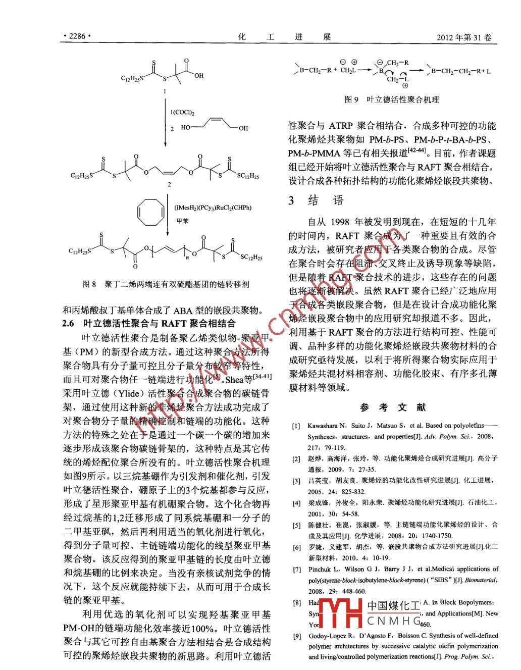 化進展2282·CHEMICAL INDUSTRY AND ENGINEERING PROGRESS2012年第31卷第進展與述評基于RAFT聚合策略合成功能化聚烯烴嵌段聚合物的研究進展毛國梁1,王欣2,寧英男1,馬志(東北石油大學化學化工學院,黑龍江大慶163318;2中國科學院上海有機化學研究所,上海20032摘要:首先介紹了可逆加成-斷裂鏈轉(zhuǎn)移聚合(RAFT)的聚合機理及其常用的RAFT試劑,并與其它兩種活性可控自由基聚合[氮氧化合物媒介的自由基聚合(NMP)和原子轉(zhuǎn)移自由基聚合(ATRP)]進行了簡單的優(yōu)缺點對比。其次,介紹了近些年在基于RAFT聚合制備功能化聚烯烴嵌段聚合物研究中取得的進展,重點綜述了制備功能化聚烯烴嵌段聚合物時所采用的6種方法,包括①烯烴配位聚合與RAFT聚合相結(jié)合;②陰離子聚合與RAFT聚合相結(jié)合;③陽離子聚合與RAFT聚合相結(jié)合;④Clck反應(yīng)與RAFT聚合相結(jié)合;⑤開環(huán)聚合與RAFT聚合相結(jié)合;⑥葉立德活性聚合與RAFT聚合相結(jié)合。最后,對基于RAFT聚合策略設(shè)計合成功能化聚烯烴嵌段聚合物的研究前景與實際應(yīng)用進行了展望關(guān)鍵詞:可逆加成-斷裂鏈轉(zhuǎn)移聚合;功能化聚烯烴;嵌段聚合物中圖分類號:06321;TQ325文獻標志碼:A文章編號:1000-6613(2012)10-2282-06Progress of synthesis of functional polyolefin block copolymers viastrategy based on RaFT polymerizationMAO Guoliang, WANG Xin, NING Yingnan, MA Zhi(School of Chemistry Chemical Engineering, Northeastern Petroleum University, Daqing 163318, HeilongjiangChina; " Shanghai Institute of Organic Chemistry, Chinese Academy of Sciences, Shanghai 200032, China)Abstract: The paper briefly describes the general polymerization mechanism of reversibleaddition-fragmentation chain transfer(RAFT) polymerization and some common RAFT agents. TheRAFT polymerization is compared with other two kinds of active controlled radical polymerizationsNitrogen oxide mediated free radical polymerization(NMP)and atom transfer radical polymerization(ATRP)]. The recent progress of synthesis of functional polyolefin block copolymers on the basis ofRAFt polymerization is reviewed. Six kinds of combined methodologies based on RAFTpolymerization aiming at the synthesis of functional polyolefin block copolymers are introduced:Combination of olefin coordination polymerization and RAFT polymerization, Combination ofliving anionic polymerization and RaFt polymerization, Combination of cationic polymerizationand RAFT polymerization, Combination of Click chemistry and RAFT polymerizationCombination of ring-opening polymerization and RAFT polymerization, (6 Combination of livingolymerization of Ylides and RaFt polymerization. Finally, the prospect of the design and synthesis offunctional polyolefin block copolymers via the strategy based on raFt polymerization is presentedKey words: reversible addition-fragmentation chain transfer polymerization (RAFT); functionalpolyolefin; block copolymers中國煤化工CNMHG收稿日期:201204-19;修改稿日期:201205-17第一作者:七國來(y1),男,工,教授,主要研究方向為有基金項目:國家自然科學基金(20604032,21074146)、黑龍江省留學機合成和金屬有機化學。聯(lián)系人:馬志,博士,研究員,主要研究方歸國人員科學基金(41417837-808016)及黑龍江省教育廳海外學人向為功能化聚烯烴材料、有機軟物質(zhì)材料的設(shè)計、合成、結(jié)構(gòu)與性能科研資助(1154H14)項目。研究。 E-mail mazhi728@icac第10期毛國梁等:基于RAHT聚合策略合成功能化聚烯烴嵌段聚合物的研究進展·2283聚烯烴的功能化是指在聚烯烴鏈上引入極性④避免使用一些昂貴試劑或難以從聚合產(chǎn)物中除去的功能基團或者聚合物鏈段,在保持其原有優(yōu)良性的試劑。因此,利用RAFT聚合與其它聚合方法相能的同時,增加聚烯烴的極性,從而顯著地改善聚結(jié)合,設(shè)計合成各種含有極性聚合物鏈段的新型功烯烴材料的黏附力、表面性能、防護性能、耐溶劑能化聚烯烴材料是一個很有發(fā)展前景的硏究方向。性以及與其它聚合物的混溶性,進而廣泛應(yīng)用于分11RAF聚合機理散劑、乳化劑、穩(wěn)定劑、水溶液中的防泡劑、塑料RAFT聚合是基于可逆鏈轉(zhuǎn)移的一種新型可控的表面修飾、以及聚合物共混物和復合材料的相容自由基聚合,其聚合機理21如圖1所示。它是在劑等材料領(lǐng)域5。嵌段聚合物是將兩種或兩種以上傳統(tǒng)的自由基聚合體系中加入鏈轉(zhuǎn)移劑(CTA:性質(zhì)不同的聚合物鏈段連在一起制備而成的一種特S=C(Z)SR),可以與引發(fā)劑產(chǎn)生的初級自由基殊聚合物,它可以將多種聚合物的性質(zhì)結(jié)合在一起,和增長鏈自由基反應(yīng),生成新的CTA和自由基R得到性能優(yōu)越的聚合物材料。并且這種聚合物的從而重新引發(fā)聚合,通過雙硫酯官能團在非活性自分子量可控、分子結(jié)構(gòu)與組成均可設(shè)計。正是由于由基中間體和活性聚合物鏈之間的轉(zhuǎn)移,使反應(yīng)可這些獨特的性質(zhì),嵌段聚合物引起了眾多研究者的控。其中CTA的性質(zhì)由Z基團和R基團控制。Z關(guān)注。目前嵌段聚合物在生物材料、熱塑性彈性體、是可活化C=S雙鍵對自由基加成的基團,R是易燃料電池、建筑、化工和電子產(chǎn)品等眾多領(lǐng)域得到離去基團。廣泛的應(yīng)用。因此,功能化聚烯烴嵌段聚合物能夠?qū)⒕巯N與其它聚合物鏈段的優(yōu)良性能結(jié)合在一nitiator+ Monomer→+P起,為聚烯烴材料開拓更廣泛的應(yīng)用領(lǐng)域。鼎+s=2)-s=m-s-sR一Pn-S-cz=s+R·1可逆加成-斷裂鏈轉(zhuǎn)