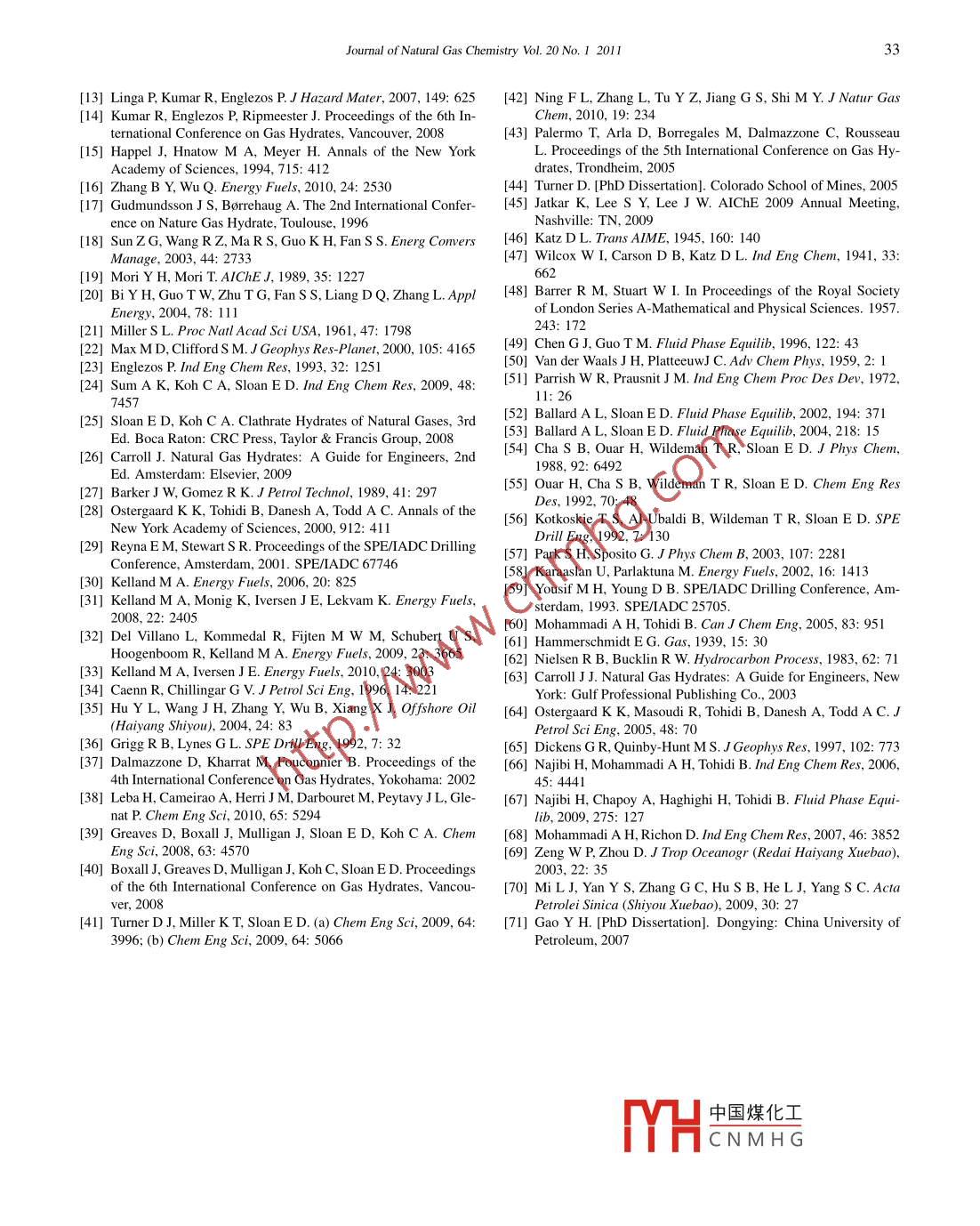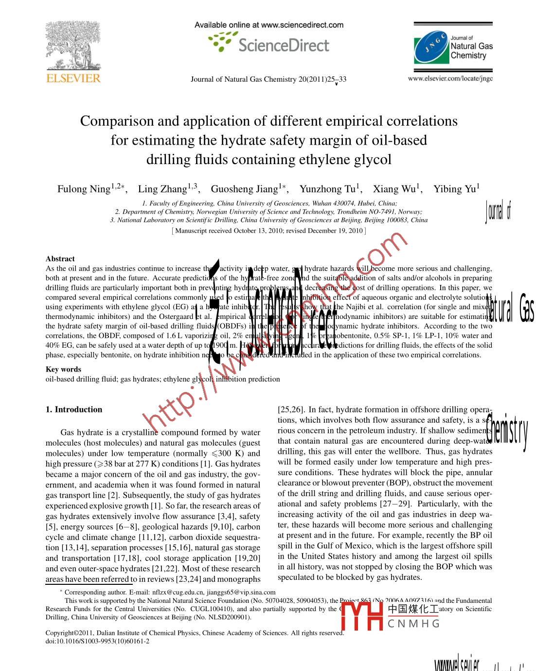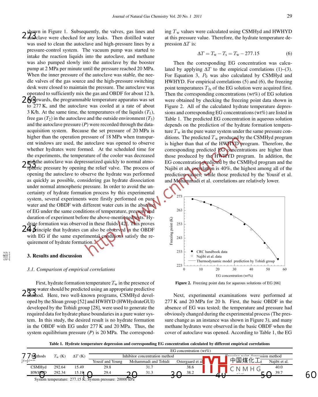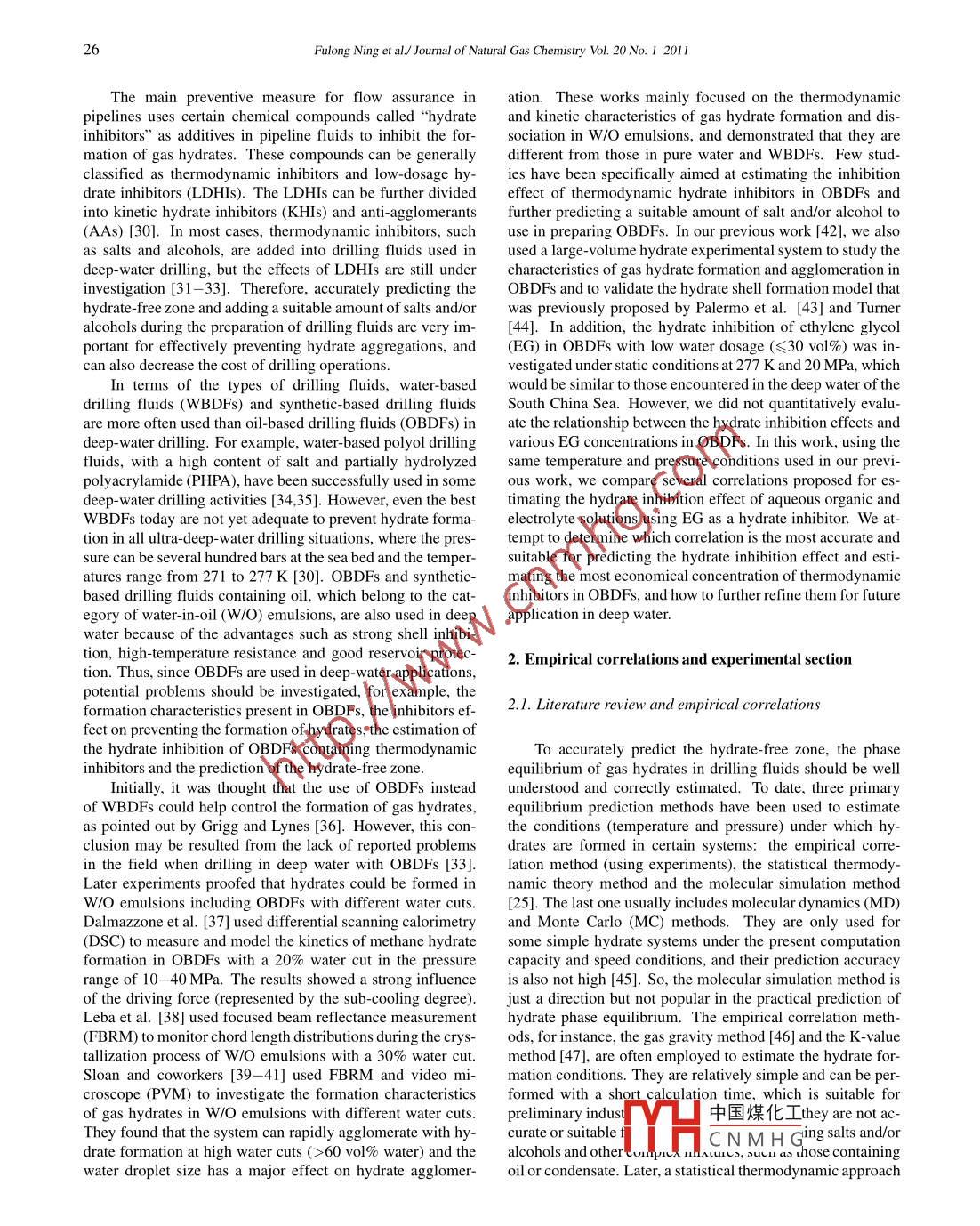 Available online at www.sciencedirect.com| Joumal ofScienceDirect7I Natural GasChemistryEL SEVIERJournal of Natural Gas Chemistry 20(2011)25-33www.elsevier.com/locate/jngcComparison and application of different empirical correlationsfor estimating the hydrate safety margin of oil-baseddrilling fluids containing ethylene glycolFulong Ning1,2*,Ling Zhangl, Guosheng Jiangl*,Yunzhong Tu',Xiang Wu',Yibing Yu'1. Faculty of Engineering, China Universily of Geosciences, Wuhan 430074, Hubei, China;2. Department of Chemistry; Norwegian University of Science and Technology, Trondheim NO-7491, Norway;3. National Laboratory on Scientific Drilling, China University of Geosciences at Beijing, Bejing 100083, ChinaJomd[ Manuscript received October 13, 2010; revised December 19, 2010 ]AbstractAstheoiland! gas idutries contiue to increase thactivity indetp water. a | hydrate hazardsboth at present and in the future. Accurate predictids of the hyprate- free zonChd the suitable addition of salts and/or alcohols in preparingdrilling fluids are particularly important both in prevanting hydnpatcroblsmsanl decreasing the cost of drilling operations. In this paper, wecompared several empirical correlations commonly used o estipa thA ne nhibition effect of aqueous organic and electrolyte solutio$ 1using experiments with ethylene glycol (EG) al a hy ate inhiblc.1hoy that he Najibi et al. correlation (for single and mixetQ[ | 1thermodynamic inhibitors) and the Ostergaard et al. fempirial (reltoind leMt enodynamic inhibitors) are suitable for estimatin V 0|the hydrate safety margin of oil-based drilling fluids (OBDFs) il theptetepee pf thellogynamic hydrate inhibitors. According to the twocorrelations, the OBDF, composed of 1.6 L vaporizin g oil, 2% enpulityih Egqobentonite, 0.5% SP-1, 1% LP-1, 10% water and40% EG, can be safely used at a water depth of up tq 1 900 m. Hdw weryotro nccl urt et tdictions for drilling fluids, the effects of the solidphase, especially bentonite, on hydrate inhibition nled in the application of these two empirical correlations.Key wordsoil-based drilling fluid; gas hydrates; ethylene glycol; inhibition prediction1. Introduction[25,26]. In fact, hydrate formation in offshore drilling opera-tions, which involves both flow assurance and safety, is a sGas hydrate is a crystalline compound formed by waterrious concern in the petroleum industry. If shallow sedimenthat contain natural gas are encountered during deep-watmolecules) under low temperature (normally ≤300 K) anddrilling, this gas will enter the wellbore. Thus, gas hydrateshigh pressure (≥38 bar at 277 K) conditions [1]. Gas hydrates .will be formed easily under low temperature and high pres-became a major concern of the oil and gas industry, the gov-sure conditions. These hydrates will block the pipe, annularernment, and academia when it was found formed in naturalclearance or blowout preventer (BOP), obstruct the movementof the drill string and drilling fluids, and cause serious oper-experienced explosive growth [1]. So far, the research areas ofational and safety problems [27- 29]. Particularly, with thegas hydrates extensively involve flow assurance [3,4], safetyincreasing activity of the oil and gas industries in deep wa-[5], energy sources [6- 8], geological hazards [9,10], carbonter, these hazards will become more serious and challengingcycle and climate change [11,12], carbon dioxide sequestra-at present and in the future. For example, recently the BP oilspill in the Gulf of Mexico, which is the largest offshore spilland transportation [17,18], cool storage application [19,20]in the United States history and among the largest oil spillsand even outer-space hydrates [21,22]. Most of these researchin all history, was not stopped by closing the BOP which wasareas have been referredto in reviews [23,24] and monographsspeculated to be blocked by gas hydrates.“Corresponding author. E-mail: nflzx @ cug edu.cn, jianggs65 @ vip.sina.comThis work is supported by the National Natural Science Foundation (No. 50704028, 50904053), the Praiert 8623 (No 2006A A097 316) and the FundamentalResearch Funds for the Central Universities (No. CUGL1004 10), and also partially supported by the中國煤化Iatory on ScienificDrilling, China University of Geosciences at Beijing (No. NLSD200901).YHCNM HGopyright@201 1, Dalian Institute of Chemical P, ChineAcademy of Sciences. All rights reserved.doi:10.1016/S 10039953(10)60161-226Fulong Ning et al./ Joumal of Natural Gas Chemistry Vol. 20No. 1 2011ation. These works mainly focused on the thermodynamicpipelines uses certain chemical compounds called “hydrate and kinetic characteristics of gas hydrate formation and dis-inhibitors" as additives in pipeline fluids to inhibit the for-sociation in W/O emulsions, and demonstrated that they aremation of gas hydrates. These compounds can be generallydifferent from those in pure water and WBDFs. Few stud-classified as thermodynamic inhibitors and low-dosage hy-ies have been specifically aimed at estimating the inhibitiondrate inhibitors (LDHIs). The LDHIs can be further dividedeffect of thermodynamic hydrate inhibitors in OBDFs andinto kinetic hydrate inhibitors (KHIs) and anti-agglomerantsfurther predicting a suitable amount of salt and/or alcohol to(AAs) [30]. In most cases, thermodynamic inhibitors, suchuse in preparing OBDFs. In our previous work [42], we alsoas salts and alcohols, are added into drilling fluids used inused a large-volume hydrate experimental system to study thedeep- water drilling, but the effects of LDHIs are still undercharacteristics of gas hydrate formation and agglomeration ininvestigation [31-33]. Therefore, accurately predicting theOBDFs and to validate the hydrate shell formation model thathydrate-free zone and adding a suitable amount of salts and/orwas previously proposed by Palermo et al. [43] and Turneralcohols during the preparation of drilling fluids are very im-[44]. In addition, the hydrate inhibition of ethylene glycolp