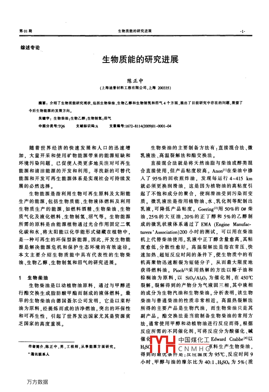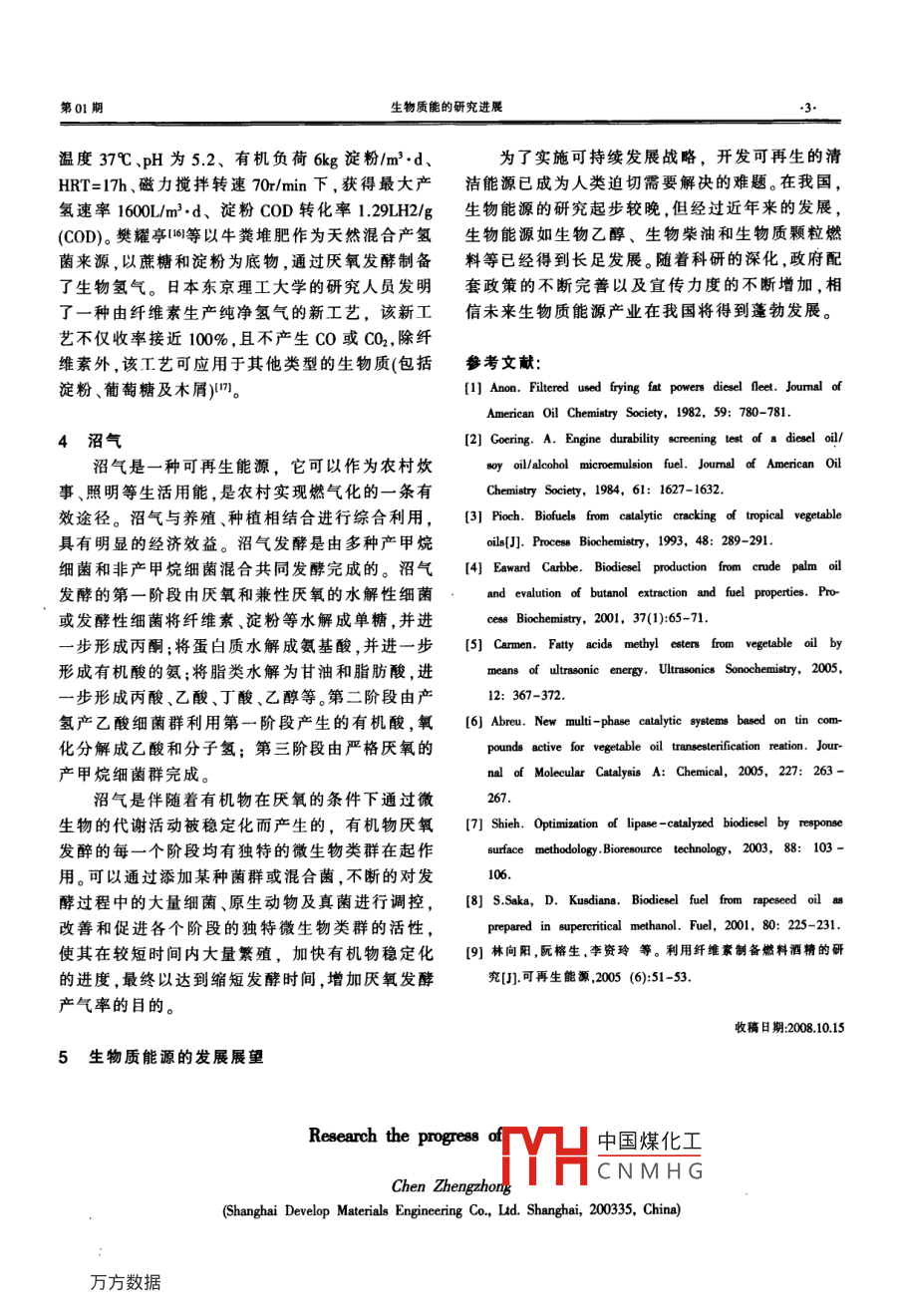 第01期生物質能的研究進展綜述專論生物質能的研究進展陳正中(上海迪普材料工程有限公司,上海20035)摘要:介紹了生物質能研究現(xiàn)狀包括生物柴油生物乙醇和生物制氫和沼氣4個方面提出了目前研究中存在的問題展望了今后生物能源的發(fā)展方向關字:生物柴油;生物乙醉;生物制氫;沼氣中圈分類號TQ文獻標識碼A文章編號:1672-8114200901-00010隨著世界經(jīng)濟的快速發(fā)展和人口的迅速增生物柴油的主要制備方法有:直接混合法、微加,大量開采和使用礦物能源帶來的能源短缺和乳液法、高溫裂解法和酯交換法環(huán)境污染問題,已促使人類更多地關注對可再生直接混合法就是將天然油脂與柴油或醇類混能源和清潔能源的開發(fā)和利用。尋找新的可替代合直接使用,但產(chǎn)品粘度較高。Anon在柴油中摻能源和開發(fā)可再生能源體系是實現(xiàn)社會可持續(xù)發(fā)了95%的回收煎炸油,發(fā)現(xiàn)每運行4-415km展的必然選擇就必須更換潤滑油,這是因為植物油的高粘度引生物能源是指利用生物可再生原料及太陽能起了不飽和成分的聚合,使?jié)櫥褪艿轿廴径兩a(chǎn)的能源,包括生物質能、生物液體燃料及利用質。微乳液法是指用植物油、水、乳化劑等配制出生物質生產(chǎn)的能源,如燃料酒精、生物柴油、生物乳液,可降低產(chǎn)品粘度。 Goering{2用50%的0#柴質氣化及液化燃料、生物制氫、沼氣等。生物能源油,25%的大豆油,20%的正丁醇和5%的乙醇制所需的原料是由能源植物通過光合作用固定二氧成的微乳狀液體系通過了EMA( Engine Manufac化碳和水,將太陽能以化學能形式儲藏在植物中, turers' Association)200小時的測試,可以用在柴油是一種可再生的環(huán)保型新能源。因此,開發(fā)生物能機上代替柴油使用。乳液中正丁醇含量愈高,其粘源是解決能源危機和保護生態(tài)環(huán)境的有效途徑。度愈低,分散性愈好。高溫裂解法是指在常壓、快本文主要介紹生物質能中具有代表性的生物柴速加熱、超短反應時間的條件下,使生物質中的有油、生物乙醇、生物制氫和沼氣的研究進展。機高聚物迅速斷裂為短鏈分子,從而最大限度地獲得燃料油。 Pioch采用熱解的方法以椰子油和1生物柴油棕櫚油為原料,以SiO2/AlAO3為催化劑,在450℃生物柴油是以動植物油原料,通過與甲醇進裂解。裂解得到的產(chǎn)物分為氣液固三相,其中液相行酯交換生成脂肪酸甲酯而制成的液體燃料。最的成分為生物汽油和生物柴油。分析表明,該生物早的生物柴油由德國聶爾公司發(fā)明,它是以菜籽柴油與普通柴油的性質非常相近。高溫熱裂解法油為原料,經(jīng)提煉而成的潔凈燃油。突出的環(huán)保性所得的主要產(chǎn)品是生物汽油,而生物柴油只是其和可再生性,引起了世界發(fā)達國家尤其是資源貧副產(chǎn)品。酯交換法是當前制備生物柴油的常用方乏國家的高度重視。法,通常使用甲醇和動植物油進行反應而得。根據(jù)反應所需的不同催化劑,可將反應分為酸催化、堿催中國煤化工 Edward Crabbe以作者簡介陳正中,男,工程師,從事能源方面研究。HSOCNMHG料生產(chǎn)生物柴油通訊聯(lián)系人得到的最優(yōu)永仵是:漢厘溫度為95℃、反應時間9小時、甲醇與油的摩爾比為40:1、HSO4為5%(質化工中間體2Chemical intermediate200年第01期量比),在此條件下的轉化率為卯7%。 Stavarache可直接把淀粉發(fā)酵成乙醇。公司用此法獲得約等人用超聲波法,油醇比6:1,堿作催化劑,用92%的理論乙醇產(chǎn)率,由此大大降低了生產(chǎn)成本40kHz的超聲波反應10-20分鐘,不需攪拌,所得,而纖維素原料生產(chǎn)燃料乙醇的實用性關鍵在產(chǎn)率可達99%。 Abreu等以Sn(3-羥基-2-甲基-于木糖發(fā)酵,因此找出發(fā)酵的優(yōu)良菌種成了必須4-吡喃酮)2(HO2)2為催化劑,植物油為原料,在首先解決的問題。中國科學院化工冶金研究所生60℃下反應3小時,產(chǎn)率可達93%,且催化劑經(jīng)回化工程國家重點實驗室的劉健、陳洪章、李佐虎等收后性能沒有減弱。 Shieh以固定化脂肪酶為催篩選出樹干畢赤酵母菌7124木糖發(fā)酵乙醇的優(yōu)化劑,用大豆油進行生物柴油的研制,通過五因素良菌種,并優(yōu)化了利用純木糖培養(yǎng)條件。崔凌飛(反應溫度、反應時間酶用量、甲醇和大豆油的摩等選用青霉菌研究纖維素酶二級和三級液體深層爾比、水用量)的正交試驗確定了最佳反應條件。發(fā)酵條件,確定了種子液和發(fā)酵液的配方。通過海saka發(fā)現(xiàn)用超臨界甲醇的方法可以使菜籽油在藻酸鈉固定化樹干畢赤酵母菌增殖細胞,使乙醇4min內(nèi)轉化成生物柴油,轉化率大于95%。其反發(fā)酵濃度提高到20%,但該技術尚未進人生產(chǎn)階應的最佳條件為:反應溫度350℃、壓力30MPa、醇段叫。 DuPont公司一直在研究開發(fā)一種由谷物秸油比為421、反應時間為4min。稈與葉制成的復合糖基質進行分解的新技術,有以上各種制備方法都有優(yōu)缺點。直接混合法較高的生產(chǎn)率,該公司準備采取行動將纖維素乙設備簡單,但植物油黏度高;微乳法雖然解決上述醇推向市場。缺點,但在耐久性試驗中,注射器積炭嚴重,燃燒不完全;高溫熱裂解法雖然工藝簡單,但裂解設備3生物制氫昂貴,且程度難控制;酯交換法催化劑種類多,酸氫氣是一種清潔、高效的能源,有著廣泛的工堿催化劑使用過程中催化劑難處理,分離復雜,脂