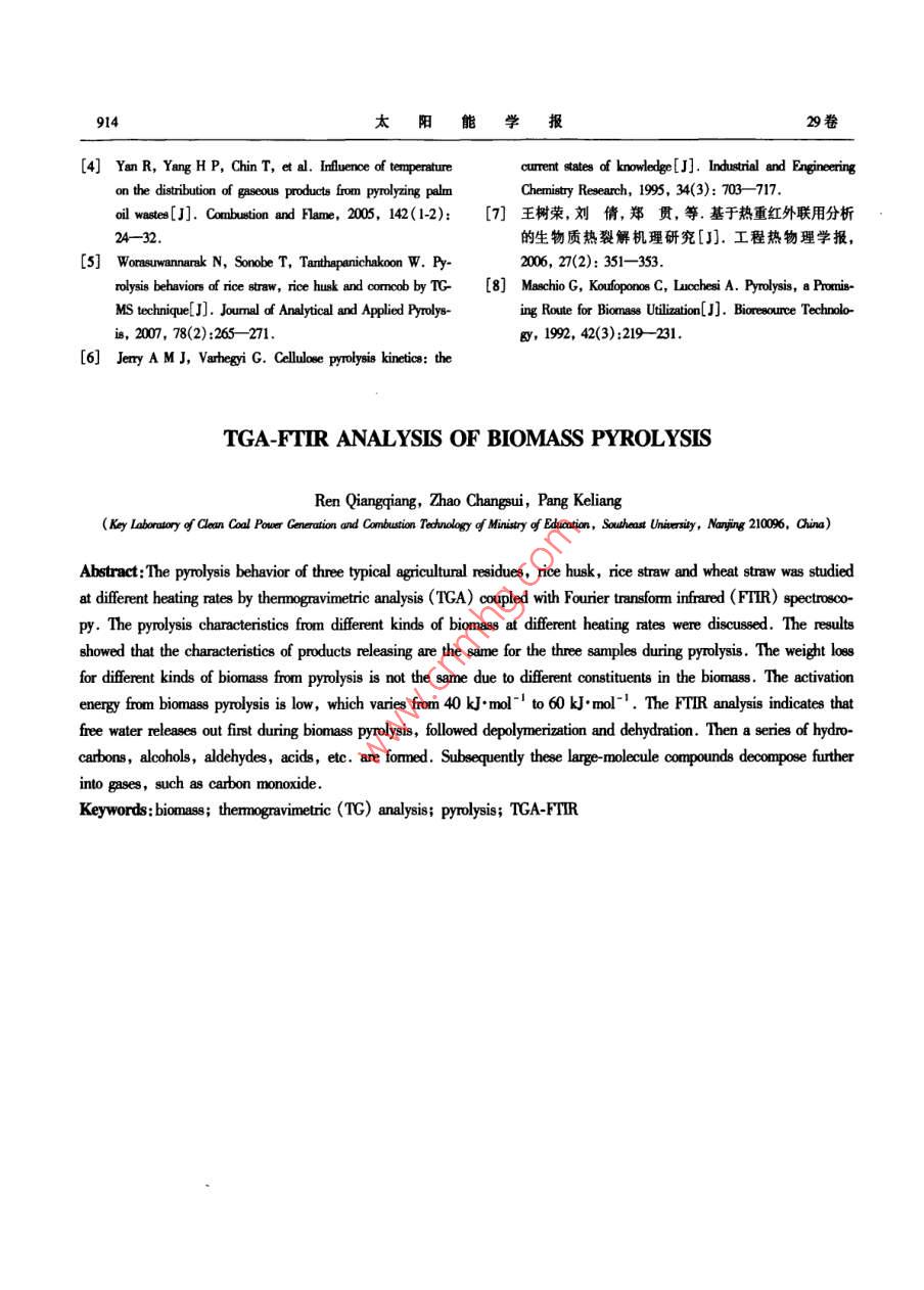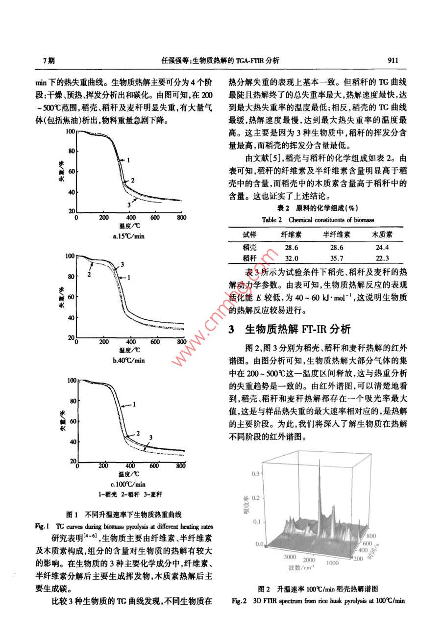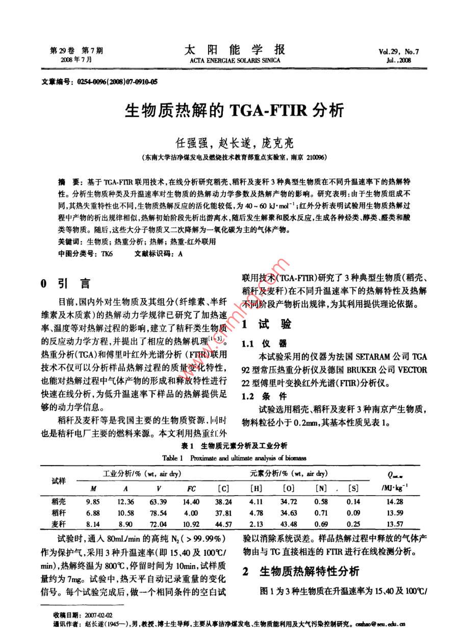 第29卷第7期太陽能學報vd.29,No.72008年7月ACTA ENERGIAE SOLARIS SINICAJl.,2008文章編號:02540096(2008)0701005生物質熱解的 TGA-FTIR分析任強強,趙長遂,龐克亮(東南大學潔凈煤發(fā)電及燃燒技術教育部重點實驗室,南京2100)摘要:基于 TGA-FTIR聯(lián)用技術,在線分析研究稻殼稻稈及麥稈3種典型生物質在不同升溫速率下的熱解特性。分析生物質種類及升溫速率對生物質的熱解動力學參數及熱解產物的影響。研究表明:由于生物質組成不同,其熱失重特性也不同,生物質熱解反應的活化能較低,為40-60kmll;紅外分析表明試驗用生物質熱解過程中產物的析出規(guī)律相似熱解初始階段先析出游離水隨后發(fā)生解豪和脫水反應生成各種烴類、醇類、醛類和酸類等物質。隨后,這些大分子物質又二次降解為一氧化碳為主的氣體產物關鍵詞:生物質;熱重分析;熱解;熱重紅外聯(lián)用中圖分類號:TK6文獻標識碼:A0引言聯(lián)用技術( TGA-FTIR)研究了3種典型生物質(稻殼稻稈及麥稈)在不同升溫速率下的熱解特性及熱解目前國內外對生物質及其組分(纖維素、半纖不同階段產物析出規(guī)律,為其利用提供理論依據。維素及木質素)的熱解動力學規(guī)律已研究了加熱速率、溫度等對熱解過程的影響,建立了秸稈類生物質1試驗的反應動力學方程并提出了相應的熱解機理3。11儀器熱重分析(TA)和傅里葉紅外光諧分析(FTR)聯(lián)用本試驗采用的儀器為法國 SETARAM公司TGA技術不僅可以分析樣品熱解過程的質量變化特性,9型常壓熱重分析儀及德國 BRUKER公司 VECTOR也能對熱解過程中氣體產物的形成和釋放特性進行2型傅里葉變換紅外光譜(FTR)分析儀快速在線分析為低升溫速率下樣品的熱解提供足1.2條件夠的動力學信息。試驗選用稻殼、稻稈及麥稈3種南京產生物質稻稈及麥稈等是我國主要的生物質資源,同時物料粒徑小于02m,其基本性質見表1也是秸稈電廠主要的燃料來源。本文利用熱重紅外表1生物質元素分析及工業(yè)分析Table 1 Proximate and ultimate analysis of biomass元素分析/%(w,ady)試樣工業(yè)分析/%(w,ar甸y)FC [C] [H] [O] [N]/M. kg稻殼98512.3663.3914.4038244.1134.720.580.1414.2868810.5878.544.0037814.7834.630.71l3.596925試驗時,通入80ml/mn的高純N2(>9999%)驗以消除系統(tǒng)誤差。樣品熱解過程中釋放的氣體產作為保護氣,采用3種升溫速率(即15、40及100℃/物由與T直接相連的TR進行在線檢測分析。min),熱解終溫為800℃C,停留時間為10min,試樣質量約為7mg試驗中,熱天平自動記錄重量的變化2生物質熱解特性分析信號。每個試驗完成后,做一個相同條件的空白試圖1為3種生物質在升溫速率為15、40及100/收稿日期:20070202通訊作者:趙長遂(145-),男教授博士生導師主要從事潔凈煤發(fā)電、生物質能利用及大氣污染控制研究。cha@s,d7期任強強等:生物質熱解的 TGA-FTIR分析911min下的熱失重曲線。生物質熱解主要可分為4個階熱分解失重的表現(xiàn)上基本一致。但稻稈的TG曲線段:干燥、預熱、揮發(fā)分析出和碳化。由圖可知,在200最陡且熱解終了的總失重率最大,熱解速度最快,達500℃范圍,稻殼稻稈及麥稈明顯失重有大量氣到最大熱失重率的溫度最低;相反,稻殼的TG曲線體(包括焦油)析出,物料重量急劇下降最緩,熱解速度最慢,達到最大熱失重率的溫度最高。這主要是因為3種生物質中,稻稈的揮發(fā)分含量最高,而稻殼的揮發(fā)分含量最低由文獻[5],稻殼與稻稈的化學組成如表2。由表可知,稻稈的纖維素及半纖維素含量明顯高于稻殼中的含量,而稻殼中的木質素含量高于稻稈中的含量。這也證實了上述結論。衰2原料的化學組成(%Table 2 Chemical constituents of biomass溫度Aa 15C/min試樣纖維素纖維素木質素稻殼28,6稻稈表3所示為試驗條件下稻殼稻稈及麥稈的熱解動力學參數。由表可知,生物質熱解反應的表觀活化能E較低,為40~60k·ml-,這說明生物質的熱解反應較易進行。3生物質熱解FTIR分析200400600800溫度℃圖2、圖3分別為稻殼、稻稈和麥稈熱解的紅外b40%/譜圖。由圖分析可知,生物質熱解大部分氣體的集中在200~500℃這一溫度區(qū)間釋放,這與熱重分析的失重趨勢是一致的。由紅外譜圖,可以清楚地看到,稻殼、稻稈和麥稈熱解都存在一個吸光率最大值,這是與樣品熱失重的最大速率相對應的,是熱解的主要階段。為此,我們將深入了解生物質在熱解不同階段的紅外譜圖。溫度c100℃C/min1-稻殼2-稻稈3-麥稈0.2圖1不同升溫速率下生物質熱重曲線Fig. I TG curves during biomass pyrolysis at different heating rates研究表明6,生物質主要由纖維素、半纖維素及木質素構成,組分的含量對生物質的熱解有較大的影響。在生物質的3種主要化學成分中纖維素300020001000半纖維素分解后主要生成揮發(fā)物,木質素熱解后主要生成碳。圖2升溫速率100℃/mn稻殼熱解譜圖比較3種生物質的T曲線發(fā)現(xiàn),不同生物質在Fg23 D FTIR spectrum from rice husk pyrolysis at00℃/min912太陽能學報29卷豪3不同升溫速率下生物質熱解動力學參數Table 3 Kine稻殼稻稈麥稈/℃·minE/k].molE/kJ·md-E/kmol-lA/min3.60x101.48x10557.66572×10549.7955.29591×107.52x1049.631.16×1073.1熱解初始階段分析稻殼稻稈和麥稈在熱解初始階段的產物析出譜圖(圖4a、圖4d圖4g),可以清晰地觀察到394-3500cm1,1300-1800cm處對應于水蒸汽的特征峰,說明稻殼、稻稈和麥稈在熱解初始階段,首先析出物理吸收的水分。所不同的是,由圖4a可知,稻殼在熱解初始階段,可以清