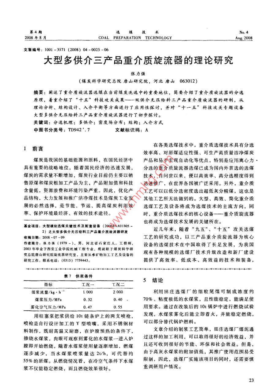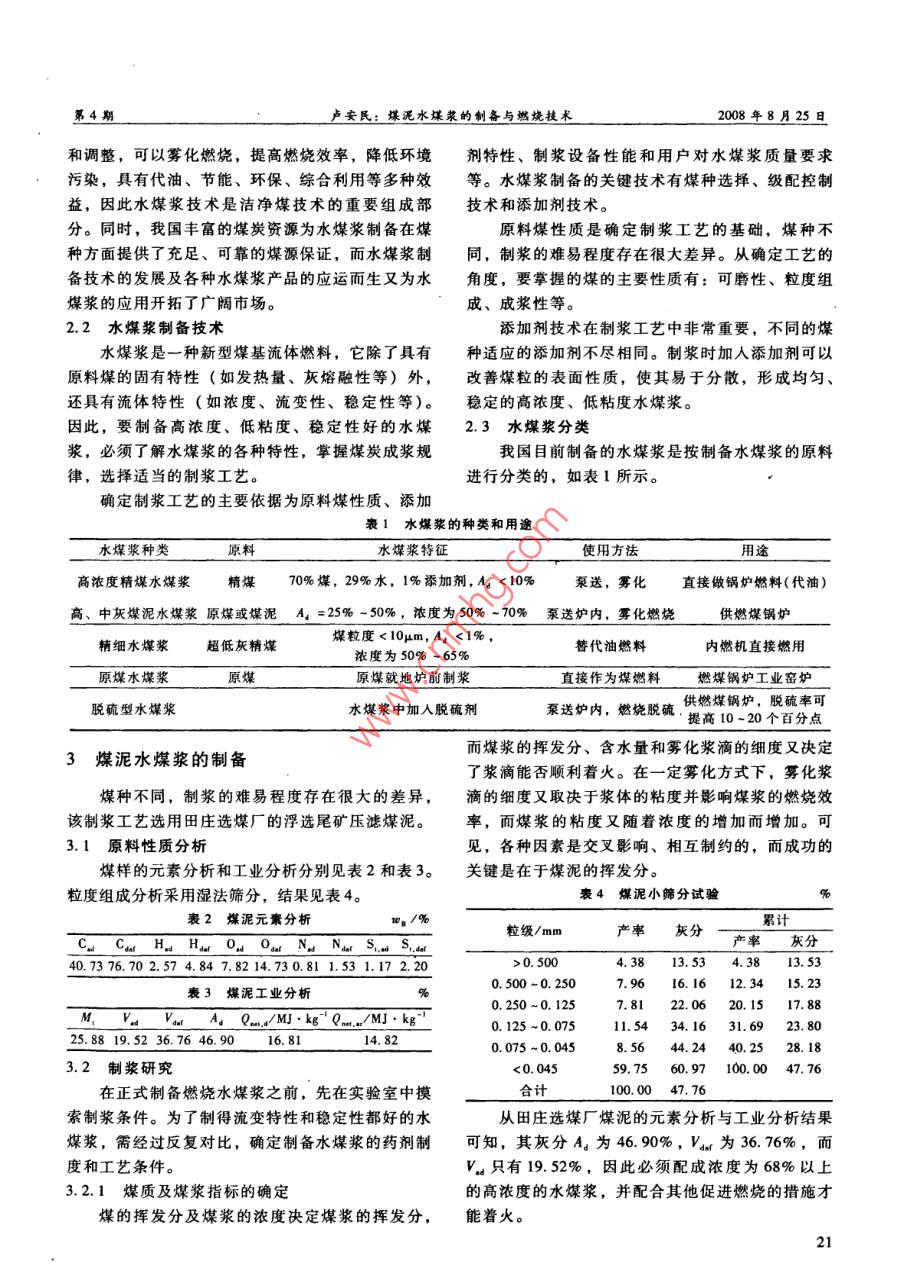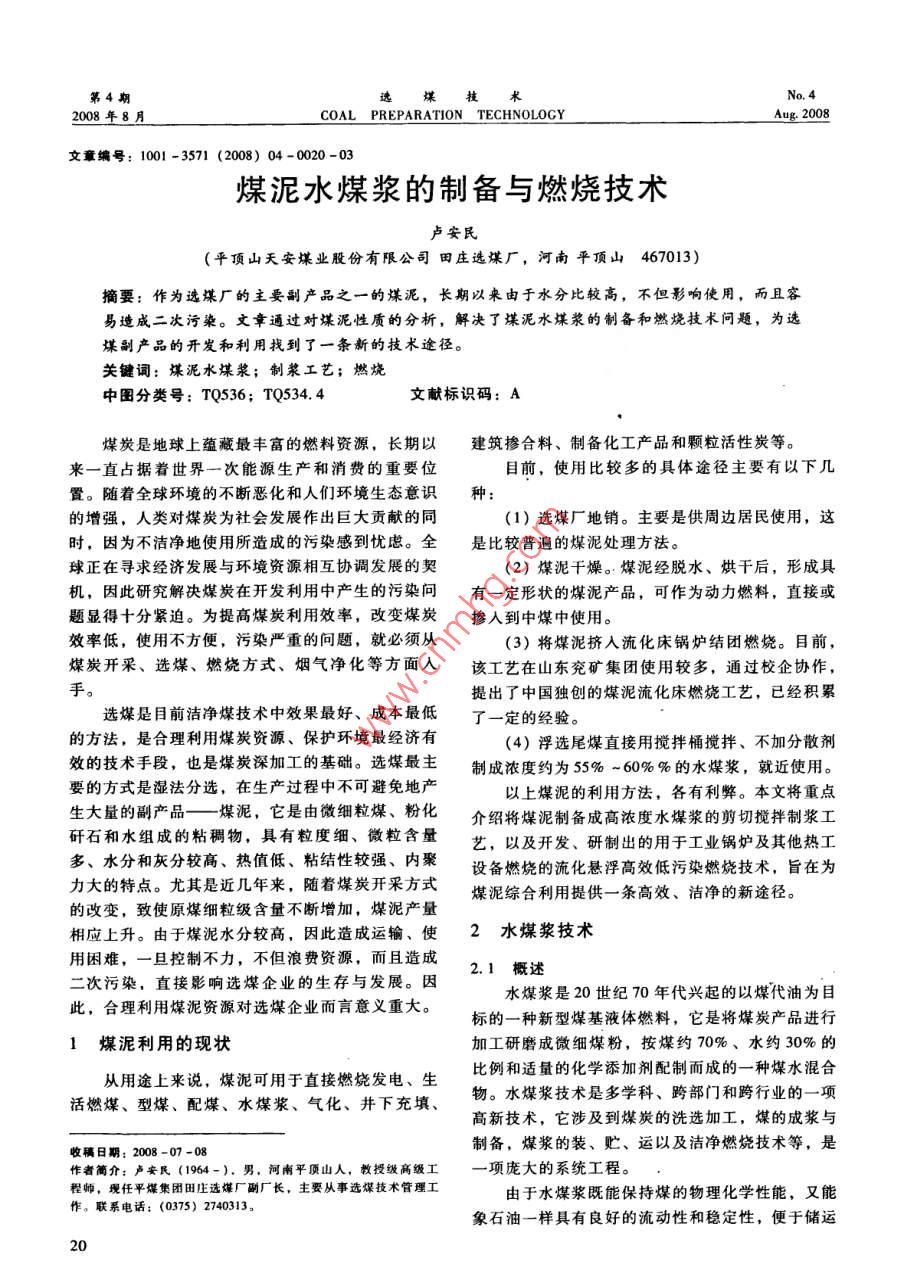 第4期選煤技2008年8月COAL PREPARATION TECHNOLOGYAug 2008文章編號:1001-3571(2008)04-0020-0煤泥水煤漿的制備與燃燒技術盧安民(平頂山天安煤業(yè)股份有限公司田莊選煤廠,河南平頂山467013)摘要:作為選煤廠的主要副產品之一的煤泥,長期以來由于水分比較高,不但影響使用,而且容易造成二次污染。文章通過對煤泥性質的分析,解決了煤泥水煤漿的制備和燃燒技術問題,為選煤副產品的開發(fā)和利用找到了一條新的技術途徑。關鍵詞:煤泥水煤漿;制漿工藝;燃燒中圖分類號;TQ536;TQ534.4文獻標識碼:A煤炭是地球上蘊藏最豐富的燃料資源,長期以建筑摻合料、制備化工產品和顆粒活性炭等。來一直占據(jù)著世界一次能源生產和消費的重要位目前,使用比較多的具體途徑主要有以下幾置。隨著全球環(huán)境的不斷惡化和人們環(huán)境生態(tài)意識種:的增強,人類對煤炭為社會發(fā)展作出巨大貢獻的同(1)選煤廠地銷。主要是供周邊居民使用,這時,因為不潔凈地使用所造成的污染感到憂慮。全是比較普遍的煤泥處理方法。球正在尋求經濟發(fā)展與環(huán)境資源相互協(xié)調發(fā)展的契(2)煤泥干燥。煤泥經脫水、烘干后,形成具機,因此研究解決煤炭在開發(fā)利用中產生的污染問有一定形狀的煤泥產品,可作為動力燃料,直接或題顯得十分緊迫。為提高煤炭利用效率,改變煤炭摻人到中煤中使用。效率低,使用不方便,污染嚴重的問題,就必須從(3)將煤泥擠入流化床鍋爐結團燃燒。目前,煤炭開采、選煤、燃燒方式、煙氣凈化等方面入該工藝在山東兗礦集團使用較多,通過校企協(xié)作,提出了中國獨創(chuàng)的煤泥流化床燃燒工藝,已經積累選煤是目前潔凈煤技術中效果最好、成本最低了一定的經驗。的方法,是合理利用煤炭資源、保護環(huán)境最經濟有(4)浮選尾煤直接用攪拌桶攪拌、不加分散劑效的技術手段,也是煤炭深加工的基礎。選煤最主制成濃度約為55%-60%%的水煤漿,就近使用。要的方式是濕法分選,在生產過程中不可避免地產以上煤泥的利用方法,各有利弊。本文將重點生大量的副產品—一煤泥,它是由微細粒煤、粉化介紹將煤泥制備成高濃度水煤漿的剪切攪拌制漿工矸石和水組成的粘稠物,具有粒度細、微粒含量藝,以及開發(fā)、研制出的用于工業(yè)鍋爐及其他熱工多、水分和灰分較高、熱值低、粘結性較強、內聚設備燃燒的流化懸浮高效低污染燃燒技術,旨在為力大的特點。尤其是近幾年來,隨著煤炭開采方式煤泥綜合利用提供一條高效、潔凈的新途徑。的改變,致使原煤細粒級含量不斷增加,煤泥產量相應上升。由于煤泥水分較高,因此造成運輸、使2水煤漿技術用困難,一旦控制不力,不但浪費資源,而且造成二次污染,直接影響選煤企業(yè)的生存與發(fā)展。因2.1概述水煤漿是20世紀70年代興起的以煤代油為目此,合理利用煤泥資源對選煤企業(yè)而言意義重大。標的一種新型煤基液體燃料,它是將煤炭產品進行1煤泥利用的現(xiàn)狀加工研磨成微細煤粉,按煤約70%、水約30%的從用途上來說,煤泥可用于直接燃燒發(fā)電、生比例和適量的化學添加劑配制而成的一種煤水混合活燃煤、型煤、配煤、水煤漿、氣化、井下充填、物。水煤漿技術是多學科、跨部門和跨行業(yè)的一項高新技術,它涉及到煤炭的洗選加工,煤的成漿與收稿日期:2008-07-08制備,煤漿的裝、貯、運以及潔凈燃燒技術等,是作者簡介:盧安民(1964-).男,河南平頂山人,教授級高級工項龐大的系統(tǒng)工程。程師,現(xiàn)任平煤集團田莊選煤廠副廠長,主要從事選煤技術管理工由于水煤漿既能保持煤的物理化學性能,又能作。聯(lián)系電話:(0375)2740313象石油一樣具有良好的流動性和穩(wěn)定性,便于儲運20盧安民:煤泥水煤漿的制備與燃燒技術8月25和調整,可以霧化燃燒,提高燃燒效率,降低環(huán)境劑特性、制漿設備性能和用戶對水煤漿質量要求具有代油、節(jié)能、環(huán)保、綜合利用等多種效等。水煤漿制備的關鍵技術有煤種選擇、級配控制益,因此水煤漿技術是潔凈煤技術的重要組成部技術和添加劑技術分。同時,我國豐富的煤炭資源為水煤漿制備在煤原料煤性質是確定制漿工藝的基礎,煤種不種方面提供了充足、可靠的煤源保證,而水煤漿制同,制漿的難易程度存在很大差異。從確定工藝的備技術的發(fā)展及各種水煤漿產品的應運而生又為水角度,要掌握的煤的主要性質有:可磨性、粒度組煤漿的應用開拓了廣闊市場。成、成漿性等。2.2水煤漿制備技術添加劑技術在制漿工藝中非常重要,不同的煤水煤漿是一種新型煤基流體燃料,它除了具有種適應的添加劑不盡相同。制漿時加人添加劑可以原料煤的固有特性(如發(fā)熱量、灰熔融性等)外,改善煤粒的表面性質,使其易于分散,形成均勻、還具有流體特性(如濃度、流變性、穩(wěn)定性等)。穩(wěn)定的高濃度、低粘度水煤漿。因此,要制備高濃度、低粘度、穩(wěn)定性好的水煤2.3水煤漿分類漿,必須了解水煤漿的各種特性,掌握煤炭成漿規(guī)我國目前制備的水煤漿是按制備水煤漿的原料律,選擇適當?shù)闹茲{工藝。進行分類的,如表1所示。確定制漿工藝的主要依據(jù)為原料煤性質、添加表1水煤漿的種類和用途水煤漿種類原料水煤漿特征使用方法用途高濃度精煤水煤漿精煤70%煤,29%水,1%添加劑,A<10%泵送,霧化直接做鍋爐燃料(