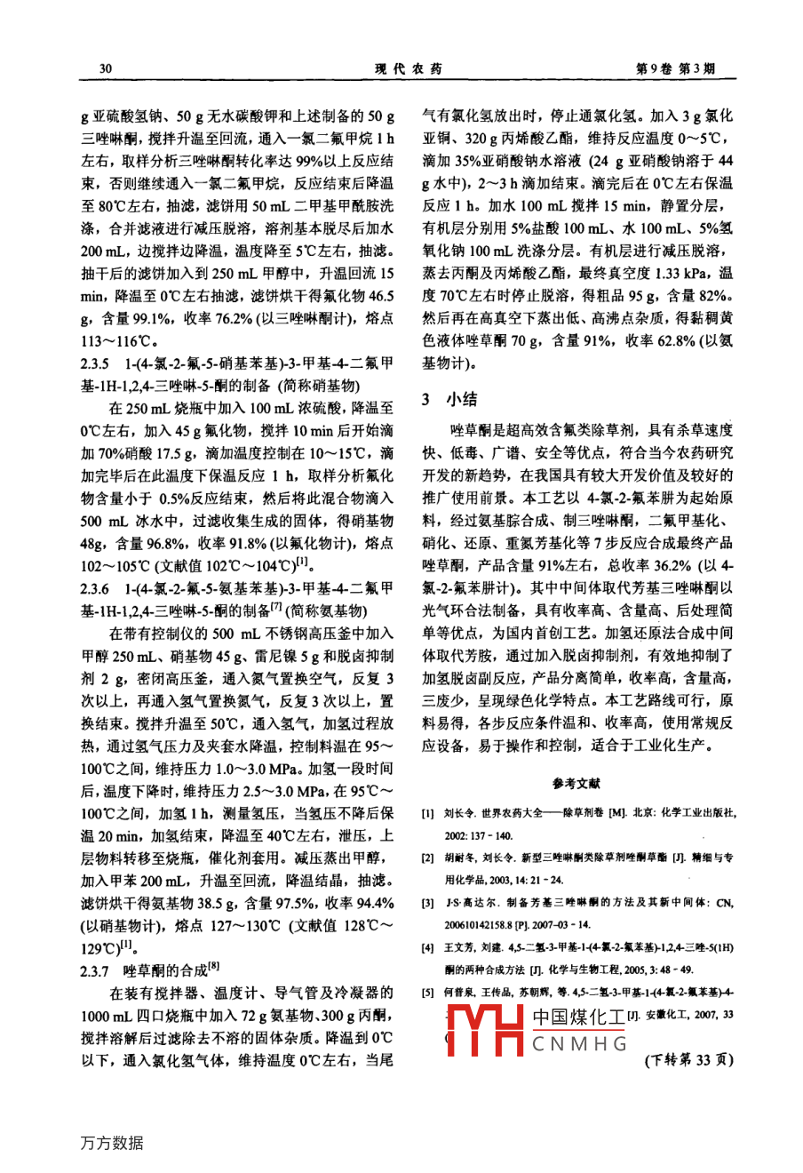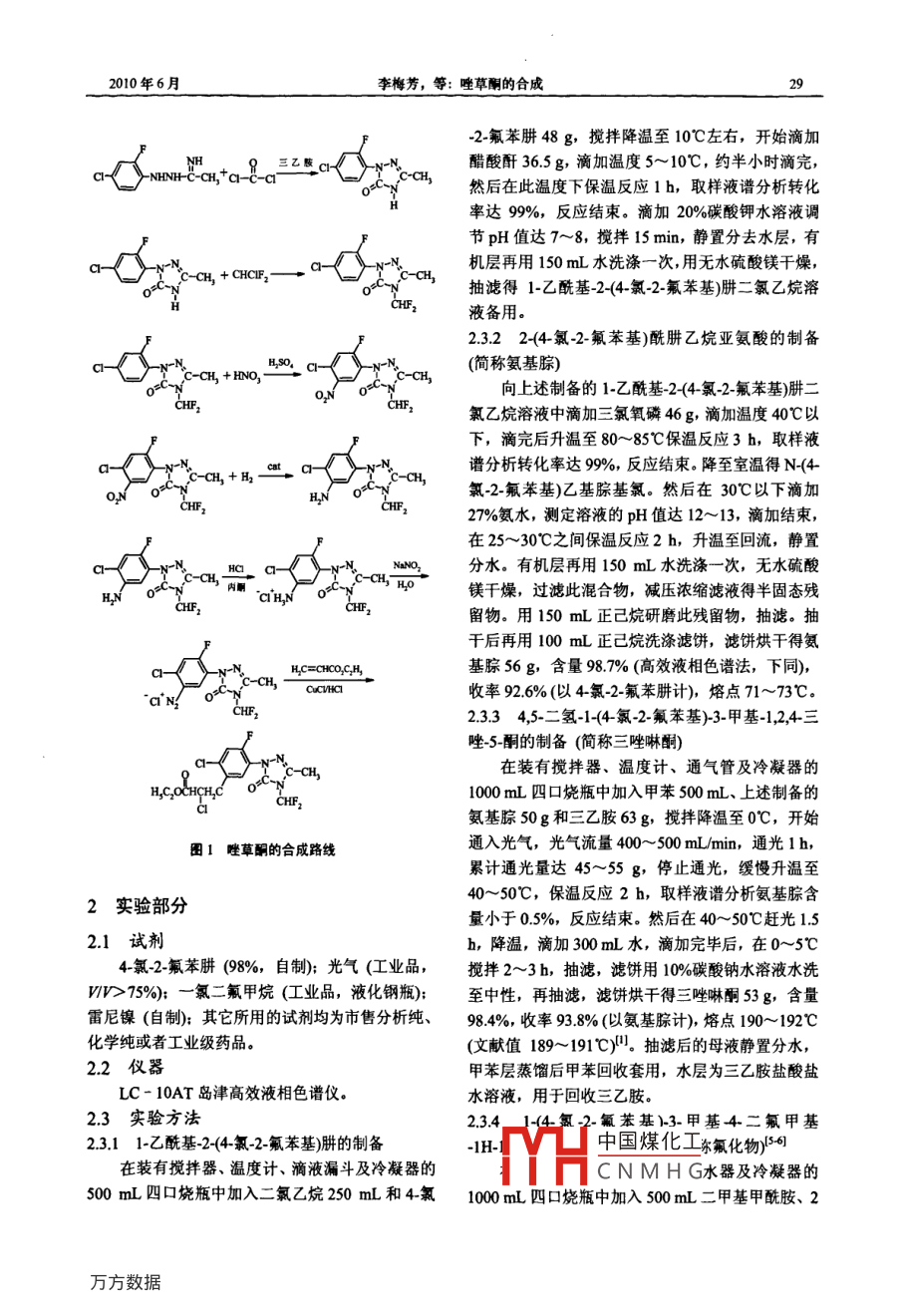 第9卷第3期現(xiàn)代農(nóng)藥Vol.9 No.32010年6月Modern AgrochemicalsJun. 2010一研究與開發(fā) o唑草酮的合成李梅芳,韓邦友(江蘇快達(dá)農(nóng)化股份有限公司,江蘇如東226401)摘要:改進(jìn)了除草劑唑草酮的合成工藝,以4氯2-氟苯肼為原料,經(jīng)氨基腙合成、光氣環(huán)合制成取代芳基三唑啉酮,再經(jīng)二氟甲基化、硝化、加氫還原合成中間體1-(5-氨基4_氯-2-氟苯基)-3-甲基4二氟甲基-1H-1,2,4-三唑啉~5_酮,重氮化后與丙烯酸乙酯反應(yīng),經(jīng)后處理得唑草酮。關(guān)鍵詞:唑草酮;三唑啉酮;合成路線;制備中圖分類號(hào): TQ 457.2+9文獻(xiàn)標(biāo)識(shí)碼: Adoi: 1.961/j.ss.1671-5284.2010.03.008Synthesis Process of Carfentrazone ethylLI Mei-fang, HAN Bang-you(iangsu Kuaida Agrochemnical Co, Ltd, Jiangsu Rudong 226401, China)Abstract: The syntbesis process of carfentrazone ethyl was greatly improved. Using 4-chloro -fluorophenylhydrazineas the raw material, substitutional aryl-triazolinones was prepared by synthesis of amidrazone and phosgene cyclization.Then intermediate product 1-5-amino-4-chloro-2-fluoropbeny1)-3-mthy1-4-difuoromnethyl-1H-2.4-triazole-5-one wasgot through difluoromethylation and nitration and hydrogenating reduction. By means of the process of diazotization andthen reacting with ethyI acrylate, carfentrazone ethyl was fnally obtained.Key words: carfentrazone ethy; triazolinones; synthesis route; preparation唑草酮"是1990 年由FMC公司開發(fā)的三唑啉以光氣環(huán)合法合成關(guān)鍵中間體取代芳基三唑啉酮, .酮類除草劑,試驗(yàn)代號(hào)F8426、F116426,通用名稱以低壓加氫法制得中間體取代芳胺,找到- -條適合carfentrazone-ethyl,商品名稱Aim、Affinity. Aurora、工業(yè)化生產(chǎn)的工藝路線。Platform、福農(nóng)、快滅靈等。該品種屬原卟啉原氧1唑草酮的合 成路線化酶抑制劑,即通過抑制葉綠素生物合成過程中原卟啉原氧化酶而引起細(xì)胞膜破壞,使葉片迅速干唑草酮的合成文獻(xiàn)報(bào)導(dǎo)較多,主要涉及到中枯、死亡。在噴藥后15分鐘內(nèi)即被植物葉片吸收,間體取代芳基三唑啉酮34)的合成。經(jīng)文獻(xiàn)檢索、工不受雨淋影響,主要用于防除闊葉雜草和莎草,防藝路線比較和小試技術(shù)攻關(guān),選擇唑草酮合成路線除對磺酰脲類除草劑產(chǎn)生抗性的雜草也具有很好如圖1所示。的活性,適用于小麥、大麥、燕麥、水稻、玉米、cH,?大豆、柑桔、咖啡、棉花、高粱、葡萄園、草坪等。-NINHC- '-NHNHCCH,of因其在土壤中的半衰期僅為幾小時(shí),故對下茬作物亦安全。該品種在美國、日本、法國、德國、南非等許多國家登記,由于其安全性好,使用劑量少,-NINHCH, + roC,一適用作物廣,因而引起農(nóng)業(yè)部門和農(nóng)藥生產(chǎn)廠家的極大興趣。目前該品種合成技術(shù)難點(diǎn)還有很多沒有-0 NBNE-NHNIHC -CH,公開,原料藥主要依靠進(jìn)口,我們通過技術(shù)攻關(guān),中國煤化工~收稿日期: 2010-02-02: 修回日期: 2010-02-24MHCNMH G作者簡介:李梅芳(1969 -),女江蘇省如東縣人,工程師,主要從事農(nóng)藥、化工產(chǎn)晶合成研究。Tel: 0513 - 84415508; E- mail: js182046@sobhu.com2010年6月李梅芳,等:唑草酮的合成29-2-氟苯肼48 g,攪拌降溫至10C左右,開始滴加謂t。 8_三乙股c-醋酸酐36.5g,滴加溫度5~10C,約半小時(shí)滴完,NENH-C-cH,+a-C-c1然后在此溫度下保溫反應(yīng)1 h,取樣液譜分析轉(zhuǎn)化率達(dá)9%,反應(yīng)結(jié)束。滴加20%碳酸鉀水溶液調(diào)節(jié)pH值達(dá)7~8,攪拌15 min,靜置分去水層,有機(jī)層再用150 mL水洗滌一次,用無水硫酸鎂干燥,- CH, + CHCIF2抽濾得1-乙?;?2-(4-氯-2-氟 苯基)肼二氯乙烷溶CHF2液備用。2.3.22-(4-氯-2-氟苯基)酰肼乙烷亞氨酸的制備(簡稱氨基腙)-CH, + HNO,向上述制備的1-乙?;?2-<4-氯-2-氟苯基)肼二CHEP2氯乙烷溶液中滴加三氯氧磷46 g,滴加溫度40C以下,滴完后升溫至 80~85C保溫反應(yīng)3 h,取樣液譜分析轉(zhuǎn)化率達(dá)99%,反應(yīng)結(jié)束。降至室溫得N-(4--cn,+ne. a-氯-2-氟苯基)乙基腙基氯。然后在30C以下滴加ONhnCHr,27%氨水,測定溶液的pH值達(dá)12~13,滴加結(jié)束,在25~30"C之間保溫反應(yīng)2 h,升溫至回流,靜置分水。有機(jī)層再用150 mL水洗滌- -次, 無水硫酸C-CHHOhN”內(nèi)酮CA'H,N鎂干燥,過濾此混合物,減壓濃縮濾液得半固態(tài)殘CHF,留物。用150 mL正己烷研磨此殘留物,抽濾。抽干后再用100 mL正己烷洗滌濾餅,濾餅烘干得氨HC=CIHCO.CH基腙56 g,含量98.7% (高效液相色譜法,下同),CCVHCI收率92.6%(以4氯-2-氟苯肼計(jì)),熔點(diǎn)71~73C。"a'N2.3.3 4,5-二氫-1-(4-氯-2- 氟苯基)-3-甲基-1,2,4三唑_5_酮的制備(簡稱三唑啉酮)a-在裝有攪拌器、溫度計(jì)、通氣管及冷凝器的HC.OCHCHC1000 mL四口燒瓶中加入甲苯500 mL、.上述制備的a氨基腙50g和三乙胺63g,攪拌降溫至0C,開始圖1唑草酮的合成路線通入光氣,光氣流量400~500 mL/min,通光1 h,累計(jì)通光量達(dá)45~55 g,停止通光,緩慢升溫至40~50C,保溫反應(yīng)2 h,取樣液譜分析氨基腙含2實(shí)驗(yàn)部分量小于0.5%,反應(yīng)結(jié)束。然后在40~50C趕光1.52.1試劑h,降溫,滴加300 mL水,滴加完畢后,在0~5C4~氯-2-氟苯肼(98%,自制); 光氣(工業(yè)品,攪拌2~3h,抽濾,濾餅用10%碳酸鈉水溶液水洗VIV> 75%); - -氯二氟甲烷(工業(yè)品,液化鋼瓶);至中性,再抽濾,濾餅烘干得三唑啉酮53g,含量雷尼鎳(自制);其它所用的試劑均為市售分析純、98.4%,收率93.8% (以氨基腙計(jì)),熔點(diǎn)190~192C化學(xué)純或者工業(yè)級藥品
