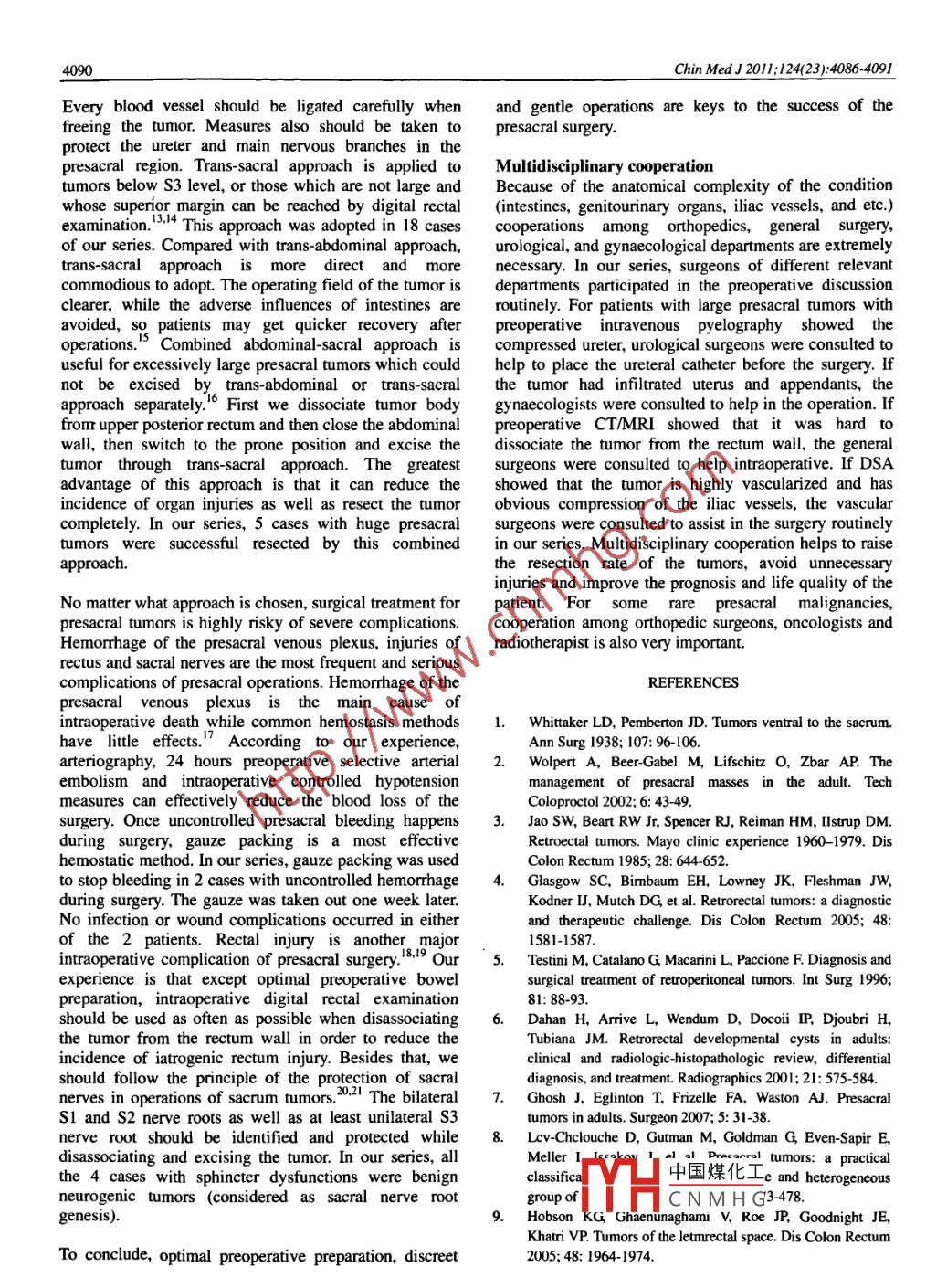 4086Chin Med J 2011;124(23):4086-4091Clinical experienceSurgical strategy for presacral tumors: analysis of 33 casesLI Guo dong, CHEN Kai, FU Dong, MA Xiao-jun, SUN Meng-xiong, SUN Wei and CAI Zheng-dongKeywords: presacral tumors; surgical strategy; diagnosisBackground Presacral tumors are highly infrequent tumors located in the space known as presacral or retrorectalspace. Although there have been substantial improvements in the prognosis of patients with malignant presacral tumors,the development of newer surgical strategy is likely to further improve the oncologic outcomes of malignant presacraltumors. The aim of this article was to report our experience in 33 cases, and to review the surgical stategy, pathologicalfeatures and the prevention of complications from our experience.Methods A retrospective analysis was conducted on 33 cases (20 male and 13 female) with presacral tumors surgicallytreated in our hospital between January 1998 and April 2009. The surgical approaches included trans-abdominal in 10cases (30%), trans-sacral in 18 cases (55%) and combined abdominal-sacral in 5 cases (15%). AII patients got followedup (14 123 months, mean of 45.1 months). At last, the general information, clinical symptoms, histodiagnosis, surgicaltypes and postoperative complications of all cases in our series were assessed.Results Ages of 33 patients ranged from 18 to 71 years, with an average of 48.5 years. Pathological findings: 6epidermoid cysts, 5 teratomas, 3 leiomyomas, 9 neurofibromas, 5 neurilemmomas, 1 enterogenous cyst, 1 liposarcoma,1 leiomyosarcoma, 1 angiosarcoma, and 1 neurofibrosarcoma. All tumors were excised with no perioperative death. Acolostomy was taken in one case with angiosarcoma involving the rectum because of the intraoperative injury of therectum. Blood loss during surgery was 400 -11000 ml (mean of 2400 ml). Four (12%) cases had local recurrence duringfollow-up: 2 because of inadequate drainage ater dermoidectomy, both of them were cured by surgical resection anddrainage; recurrence occurred in a case of teratoma in 18 months ater surgey, cured by a trans-sacral excision; localrecurrence and lung metastasis occurred simultaneously in a case of angiosarcoma in 6 months postoperatively and thepatient died one month later of respiratory failure.Conclusions The main treatment of most presacral tumors is surgical resection. Selection of surgical approach is veryimportant for complete resection of the presacral tumors. The location, size and peculiarities of tumors, conditions of theskin and soft tissues and the patients' somatotype are all determinative factors. Multidisciplinary cooperation is also verynecessary.Chin Med J 2011;124(23):4086- 4091Dresacral tumors are highly infrequent conditions.Departments of Orthopedics, General Surgery, andAlthough the true incidence of such tumors isGynecology respectively in 10th People's Hospital ofunknown, it is estimated at one in every 40 000 hospitalShanghai, China. The first symptom was variable,admissions.2 They are usually benign and located in theincluding abdominal mass in 9 (27%), defecationarea known as the presacral or retrorectal space. Thedisability in 6 (18%), diarrhea in 2 (6%), urinarytumors may derive from remains of embryologicalsymptoms (urinaryfrequency, urgent micturition,structures or may be a consequence of malignization indysuresia, and uroclepsia) in 3 (9%), sacrococcygealthe area.' In general, they are asymptomatic or haveregion pain in 3 (9%), lower extremity pain in 3 (9%) andunspecific symptomatology, making their diagnosislow back pain in 2 (6%), the other 5 cases (15%) withoutdifficult and on occasion by chance. The fact that the areaany symptoms were diagnosed by chance during a routinewhere they reside is asymptomatically occult and diffcultdigital rectal examination. The mean duration fromto access makes experience in surgical intervention abeginning of symptoms to diagnoses was 5.5 monthsrequisite for treating them.4 A good knowledge of its(1 week-1 year) (Table 1). The locations and circum-peculiarities is also important. The aim of this study wasto discuss the surgical strategy and pathological featuresDOL: 10.3760/cmaj.issn.0366 6999.201 1.23.044Department of Orthopaedics, Shanghai Tenth People's Hospital,from our experience of surgical treatment with 3Tongji University School of Medicine, Shanghai 200072, Chinaoperated cases.(LiGD,ChenK,FuD,MaXJ,SunMX,SunwandCaiZD)Correspondence to: Dr. CAI Zheng-dong,_ Department ofMETHODSOrthopaedics,Tongji UniversitySchool of中國煤化工72,China (Te:Patients86-21-56305CNMHGm)This researct:CYHun b, gians HIUI umunghai Natural ScienceFrom January 1998 to April 2009, 33 patients of presacralFund (No. 1IZR1428400), Shanghai Municipal HealthBureautumors (20 male and 13 female) with a median age ofFund (No. 2010163) and National Ministry of Education Fund48.5 years (18 -71 years) were surgically treated in the(No. 20100072120056)..4088Chin Med J 201;124(23):4086-4091exposed, digital rectal examination should be made againadjunctive therapy, and etc.to confirm the tumor extention. The dissociation ofpresacral tumor often started from distal margin and thenStatistical analysisthe bilateral margin. During this procedure, it wasBlood loss was analyzed with unpaired t test by the Stataimportant to make sure that sphincter and posterior rectal11 (College Station, Texas 77845, USA). A P value lesswall were protected. Attention should be paid to thethan 0.05 was considered statistically significant.possibility of presacral vessels bleeding when separatingthe cephalic margin. The key to dissociate anterior sacralRESULTSarea was pulling-down the tumor with left hand as toform a tension and then to find the presacral space usingWe adopted trans-sacral approach in 18 patients, simpleforceps. It is better to use ultrasound knife or APC (Argontrans- abdominal approach in 10 patients and 5 combinedPlasma Coagulation) to cut off the cephalic margin theabdominal-sacral cases.tum