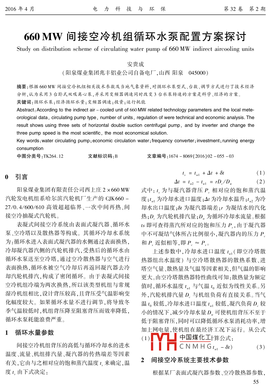 2016年4月電力科技與環(huán)保第32卷第2期660MW間接空冷機(jī)組循環(huán)水泵配置方案探討Study on distribution scheme of circulating water pump of 660 MW indirect aircooling units安貴成(陽泉煤業(yè)集團(tuán)兆豐鋁業(yè)公司自備電廠,山西陽泉045000)摘要:根據(jù)660 MW間接空冷機(jī)組相關(guān)技術(shù)參數(shù)及當(dāng)?shù)貧庀筚Y料,對(duì)循環(huán)水泵型式、臺(tái)數(shù)、調(diào)節(jié)方式進(jìn)行了技術(shù)經(jīng)濟(jì)分析,認(rèn)為采用3臺(tái)臥式雙吸離心泵,并采用變頻器調(diào)速同時(shí)改變3臺(tái)水泵轉(zhuǎn)速的方案是科學(xué)、經(jīng)濟(jì)的方案。關(guān)鍵詞:循環(huán)水泵;經(jīng)濟(jì)循環(huán)水量;變頻器調(diào)速;投資;運(yùn)行耗能Abstract: According to the indirect air - cooled unit of 660 MW related technology parameters and the local mete-orological data, circulating pump type,number of units , regulation of were technical and economic analysis. Theresult shows using three sets of horizontal double suction centrifugal pump, and by inverter and change thethree pump speed is the most scientific, the most economical solution.Key words:water circulating pump; economic circulation water; frequency converter ; investment; running energyconsumption中圖分類號(hào):TK264. 12文獻(xiàn)標(biāo)識(shí)碼:B文章編號(hào):1674 - 8069 (2016)02 -055 -03t,=tm+Ot+δt0引言O(shè)t = twm2-tm= rD./D陽泉煤業(yè)集團(tuán)有限責(zé)任公司西上莊2x660MW式中:t,為與凝汽器背壓P。相對(duì)應(yīng)的飽和蒸汽溫汽輪發(fā)電機(jī)組系哈爾濱汽輪機(jī)廠生產(chǎn)的CJK660 -度;Im為冷卻水進(jìn)口溫度;0t為冷卻水溫升:;n2為冷27/0.4/600/610高效超超臨界、-.次中間再熱間卻水出口溫度;8t為凝汽器端差;r為凝結(jié)水的汽化接空冷抽凝式汽輪機(jī)。熱;D。為汽輪機(jī)排汽量;D為循環(huán)冷卻水流量。根據(jù)表凝式間接空冷系統(tǒng)由表面式凝汽器、循環(huán)水ts即可查得蒸汽所對(duì)應(yīng)的飽和壓力P,, 由于凝汽器泵、空冷塔以及散熱器等構(gòu)成。其循環(huán)冷卻水系統(tǒng)中不可凝結(jié)氣體所占比例很小,凝汽器內(nèi)的壓力P。為:循環(huán)水進(jìn)人表面式凝汽器的水側(cè)通過表面換熱,和P,近似相等,即P。≈P,。冷卻凝汽器汽側(cè)的汽輪機(jī)排汽,受熱后的循環(huán)水由上述參數(shù)中,冷卻水進(jìn)口溫度tn(即空冷塔散.循環(huán)水泵送至空冷塔,通過空冷散熱器與空氣進(jìn)行熱器組出水溫度)與空冷塔散熱器的散熱系數(shù)、進(jìn)表面換熱,循環(huán)水被空氣冷卻后再返回凝汽器去冷塔空氣量、散熱量及氣溫等因素相關(guān),但氣溫的影響卻汽輪機(jī)排汽,構(gòu)成了密閉循環(huán)。由于表凝式間接更大。由空冷塔散熱器特性曲線可知:散熱量為額定空冷機(jī)組冷端為兩次換熱,所以該類型機(jī)組與常規(guī)值時(shí),循環(huán)水溫度tm與氣溫to近似為線性關(guān)系。另濕冷機(jī)組相比,設(shè)計(jì)背壓較高,且背壓受氣溫影響變外,汽輪機(jī)排汽量D.與機(jī)組負(fù)荷有直接關(guān)系。當(dāng)氣化幅度較大。如果循環(huán)水量不進(jìn)行調(diào)節(jié),將導(dǎo)致冬溫 。較低,冷卻水進(jìn)口溫度。較低.凝汽負(fù)荷D。較季氣溫較低時(shí),機(jī)組背壓降至阻塞背壓而效率降低,小的情況下,減少冷卻水量D可使機(jī)組背壓不至于循環(huán)水泵耗能浪費(fèi)嚴(yán)重。低于阻塞背壓,同時(shí)可以降低循環(huán)水泵消耗功率,增加上網(wǎng)電量,使機(jī)組在最經(jīng)濟(jì)工況下運(yùn)行。從公式1循環(huán)水量參數(shù)(1)]中國(guó)煤化工+算公式:間接空冷機(jī)組背壓的高低與循環(huán)冷卻水的進(jìn)水YHCNMHGtn - 8t)(3)溫度、流量、機(jī)組排汽量、凝汽器的傳熱端差等因素有關(guān),它由與之相對(duì)應(yīng)的飽和蒸汽溫度1,來確定,溫2間接空冷系統(tǒng)主要技術(shù)參數(shù)度t,由下式?jīng)Q定:根據(jù)某廠表面式凝汽器參數(shù)、空冷散熱器參數(shù),552016年4月電力科技與環(huán)保第32卷第2期循環(huán)水管徑及布置方案,對(duì)間接空冷系統(tǒng)進(jìn)行水力3.3循環(huán)水泵調(diào) 節(jié)方式優(yōu)化計(jì)算(相關(guān)參數(shù)見表1),得到TMCR工況下循環(huán)水目前,間接空冷系統(tǒng)循環(huán)水泵主要采用改變并系統(tǒng)阻力為23.97m。散熱器為025六排管鋁管鋁列水泵運(yùn)行的臺(tái)數(shù),采用雙速電機(jī)改變水泵轉(zhuǎn)速的翅片型式,塔外垂直布置, 102組。方案進(jìn)行調(diào)節(jié)循環(huán)水流量。水泵并列運(yùn)行的原則是表1660MW表凝式間接空冷系統(tǒng)主要技術(shù)參數(shù)水泵揚(yáng)程相等(或比較接近)。否則,將導(dǎo)致?lián)P程較小的水泵流量占總流量比例較小,并列運(yùn)行的所有項(xiàng)E數(shù)值水泵工況均偏離其設(shè)計(jì)高效區(qū),效率下降明顯,嚴(yán)重凝汽器換熱面積/m240000情況下將導(dǎo)致?lián)P程小的水泵被“悶死",流量為零,TMCR工況散熱量/MW707水泵快速起溫的事故。因此,采用雙速電機(jī),水泵的TMCR工況排汽量/1. h-I1 063聯(lián)合運(yùn)行方式只能采取高速并列或低速并列的運(yùn)行循環(huán)水進(jìn)口設(shè)計(jì)溫度/C .31.2方式。機(jī)組穩(wěn)定運(yùn)行期間,當(dāng)循環(huán)水泵需高低速切TMCR工況循環(huán)水溫升/C10.54換時(shí),水泵啟停操作較多。