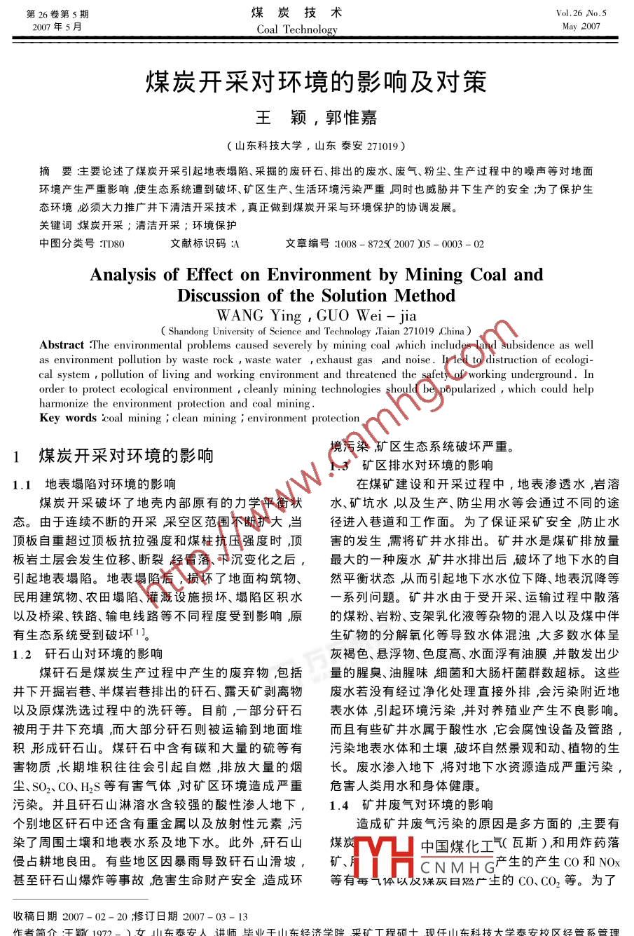 第26卷第5期煤炭技術(shù)Vol.26 ,No.52007年5月Coal TechnologyMay 2007煤炭開采對環(huán)境的影響及對策王穎,郭惟嘉(山東科技大學,山東泰安271019)摘要主要論述了煤炭開采引起地表塌陷、采掘的廢矸石、排出的廢水、廢氣、粉塵、生產(chǎn)過程中的噪聲等對地面環(huán)境產(chǎn)生嚴重影響使生態(tài)系統(tǒng)遭到破壞、礦區(qū)生產(chǎn)、生活環(huán)境污染嚴重,同時也威脅井下生產(chǎn)的安全;為了保護生態(tài)環(huán)境必須大力推廣井下清潔開采技術(shù),真正做到煤炭開采與環(huán)境保護的協(xié)調(diào)發(fā)展。關鍵詞煤炭開采;清潔開采;環(huán)境保護中圖分類號:TD80文獻標識碼A文章編號:1008 - 8725( 2007 )05 - 0003 - 02Analysis of Effect on Environment by Mining Coal andDiscussion of the Solution MethodWANG Ying , GUO Wei- jia( Shandong University of Science and Technology Taian 271019 China )Abstract :The environmental problems caused severely by mining coal ,which includes land subsidence as wellas environment pollution by waste rock,waste water , exhaust gas rand noise. It led to distruction of ecologi-:al system , pollution of living and working environment and threatened the safety of working underground. Inorder to protect ecological environment , cleanly mining technologies should be popularized , which could helpharmonize the environment protection and coal mining .Key words :coal mining ; clean mining ; environment protection境污染礦區(qū)生態(tài)系統(tǒng)破壞嚴重。1煤炭開 采對環(huán)境的影響1.3礦區(qū)排水對環(huán)境的影響1.1地表塌陷對環(huán)境的影響在煤礦建設和開采過程中, 地表滲透水,巖溶煤炭開采破壞了地殼內(nèi)部原有的力學平衡狀水、礦坑水,以及生產(chǎn)、防塵用水等會通過不同的途態(tài)。由于連續(xù)不斷的開采采空區(qū)范圍不斷擴大當徑進入巷道和工作面。為了保證采礦安全,防止水頂板自重超過頂板抗拉強度和煤柱抗壓強度時頂害的發(fā)生需將礦井水排出。礦井水是煤礦排放量板巖土層會發(fā)生位移、斷裂經(jīng)冒落、下沉變化之后,最大的一種廢水礦井水排出后破壞了地下水的自引起地表塌陷。地表塌陷后,損壞了地面構(gòu)筑物、然平衡狀態(tài),從而引起地下水水位下降、地表沉降等民用建筑物、農(nóng)田塌陷、灌溉設施損壞、塌陷區(qū)積水-系列問題。礦井水由于受開采、運輸過程中散落以及橋梁、鐵路、輸電線路等不同程度受到影響原的煤粉、巖粉、支架乳化液等雜物的混入以及煤中伴有生態(tài)系統(tǒng)受到破壞1]。生礦物的分解氧化等導致水體混濁,大多數(shù)水體呈1.2 矸石山對環(huán)境的影響灰褐色、懸浮物、色度高、水面浮有油膜并散發(fā)出少煤矸石是煤炭生產(chǎn)過程中產(chǎn)生的廢棄物,包括量的腥臭、油腥味細菌和大腸桿菌群數(shù)超標。這些井下開掘巖巷、半煤巖巷排出的矸石、露天礦剝離物廢水若沒有經(jīng)過凈化處理直接外排,會污染附近地以及原煤洗選過程中的洗矸等。目前,-部分矸石表水體,引起環(huán)境污染,并對養(yǎng)殖業(yè)產(chǎn)生不良影響。被用于井下充填,而大部分矸石則被運輸?shù)降孛娑讯矣行┑V井水屬于酸性水,它會腐蝕設備及管路,積形成矸石山。煤矸石中含有碳和大量的硫等有污染地表水體和土壤破壞自然景觀和動、植物的生害物質(zhì)長期堆積往往會引起自燃,排放大量的煙長。廢水滲入地下將對地下水資源造成嚴重污染,塵、SO2、CO、H2S等有害氣體,對礦區(qū)環(huán)境造成嚴重危害人類用水和身體健康。污染。并且矸石山淋溶水含較強的酸性滲人地下,1.4 礦井廢氣對環(huán)境的影響個別地區(qū)矸石中還含有重金屬以及放射性元素污造成礦井廢氣污染的原因是多方面的,主要有染了周圍土壤和地表水系及地下水。此外,矸石山煤炭中國煤化工氣(瓦斯)和用炸藥落侵占耕地良田。有些地區(qū)因暴雨導致矸石山滑坡,礦、YHCN MHG產(chǎn)生的產(chǎn)生co和NOx甚至矸石山爆炸等事故危害生命財產(chǎn)安全造成環(huán)等有每氣體以及?;胰杖紡V生的CO、CO2等。為了收稿日期2007-02- 20;修訂日期2007-03-13作者簡介:王穎( 1972- )女,山東泰安人講師畢業(yè)于山東經(jīng)濟學院采礦工程碩士現(xiàn)任山東科技大學泰安校區(qū)經(jīng)管系管理教研室主任E - mail :wje75 @ 163 .com。煤炭技術(shù).第26卷井下生產(chǎn)安全通常采用通風方式將井下的有害氣.送到井下矸石處理場破碎通過管道并利用風力運體排入大氣中。我國每年排入大氣中的CH4達100輸?shù)焦ぷ髅婊靥畈煽諈^(qū),做 到矸石不出井。矸石充億m3 ,約占世界總排放量的1/3。CH4及CO、CO2、填既消除了井下煤矸石的地面排放污染,又可達到NOx、H2S等廢氣污染導致氣候條件發(fā)生變化,破壞減少巖層和地表移動、減少塌陷區(qū)的目的。臭氧層產(chǎn)生溫室效應”還會形成酸雨嚴重影響了2.3礦 井廢水治理技術(shù)生態(tài)環(huán)境。另外排出的廢氣還是煤礦井下開采的礦井廢水的治理,可以采用分類排放、凈化處災害因素,由它引起的事故造成人員傷亡數(shù)占礦井理、回收復用等技術(shù)。在礦井水中巖溶水占60%之事故的1/3左右。因此,無論是從環(huán)境保護方面還多而巖溶水多為未被污染的地下水,若能將巖溶水是從煤礦安全生產(chǎn)的角度,都迫切需要解決井下有與其他礦井水分開排放則不會對環(huán)境造成污染還可
