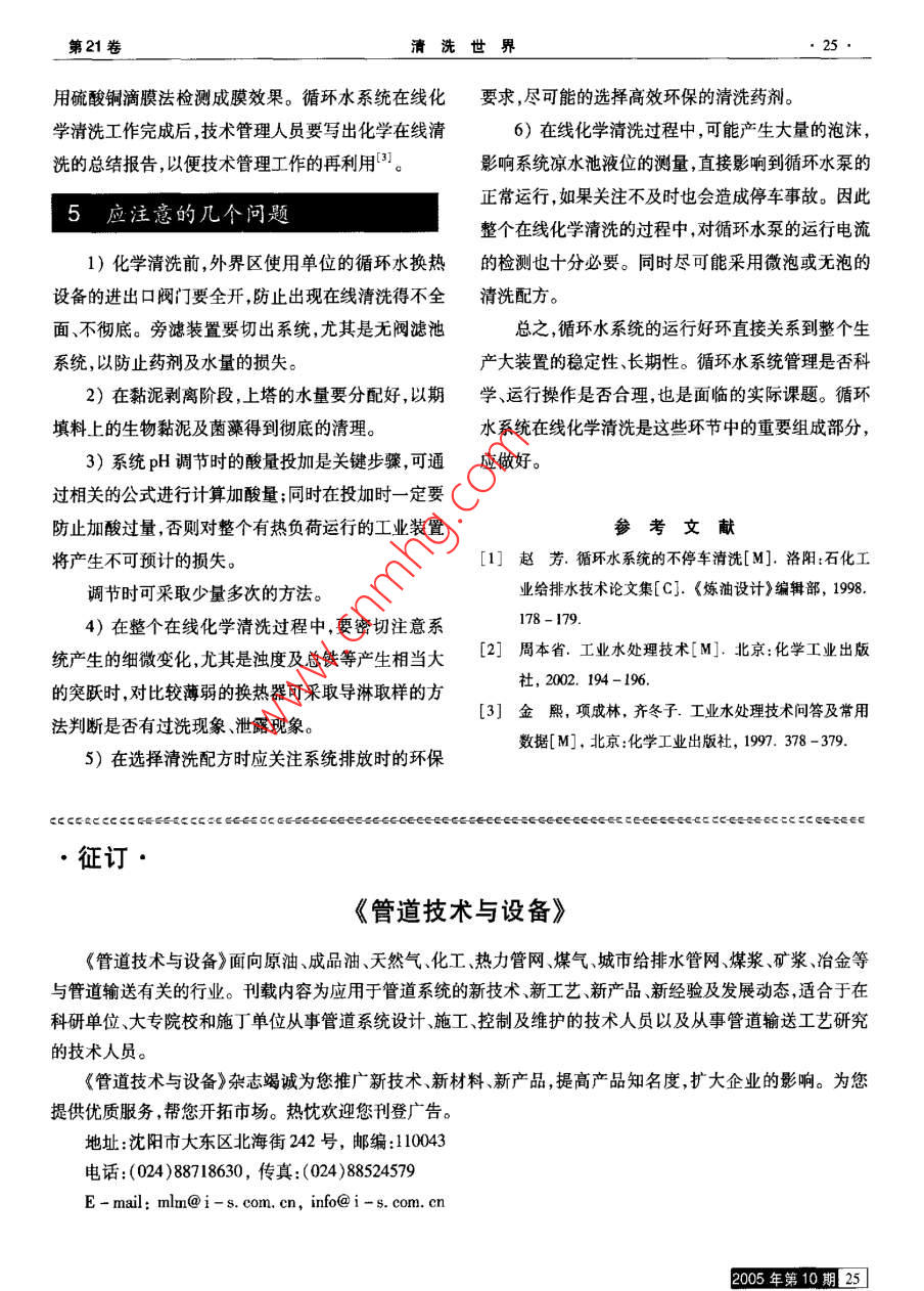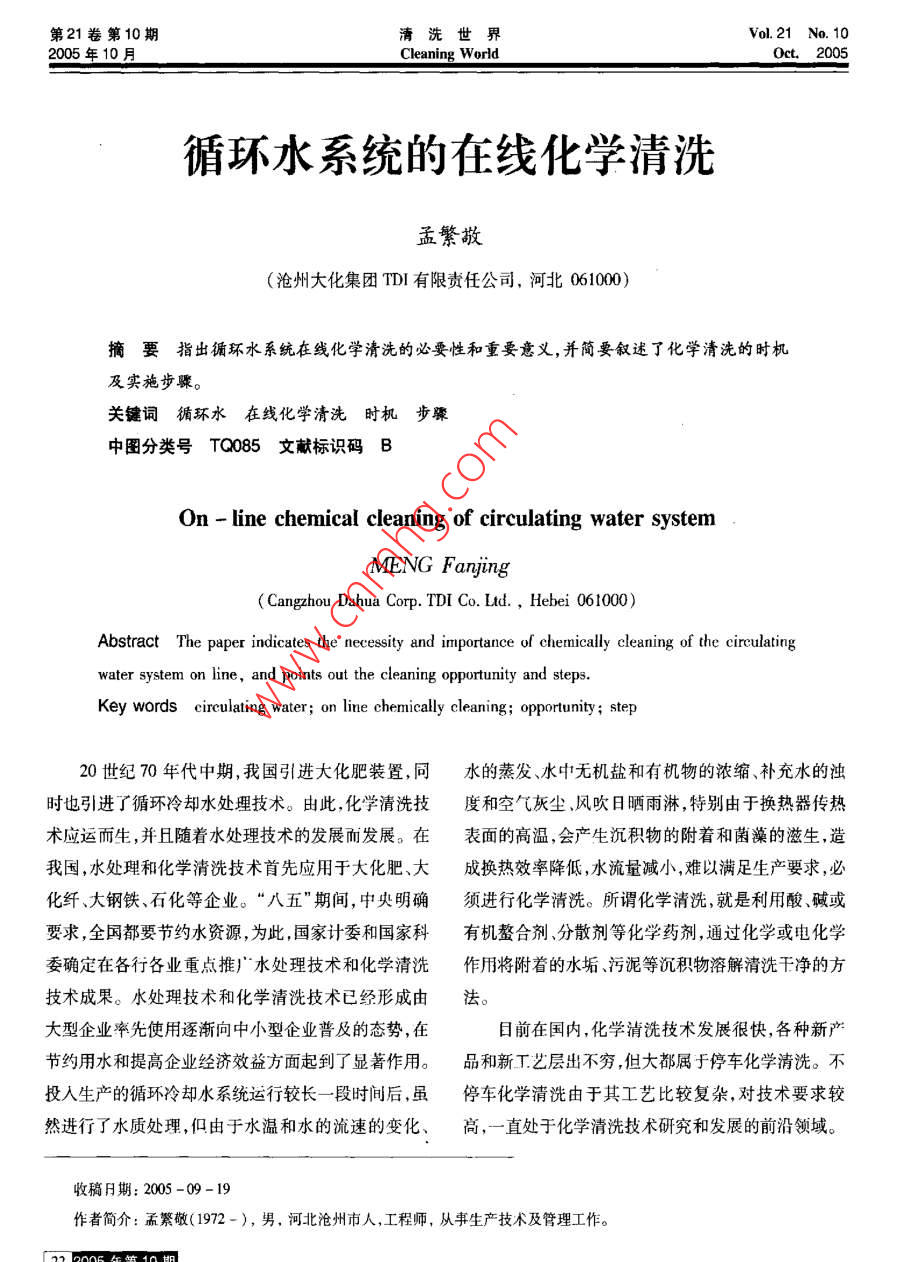 第21卷第10期清洗世界vol.21N0.102005年10月Cleaning Worid2005循環(huán)水系統(tǒng)的在線化學(xué)清洗孟繁敬(滄州大化集團(tuán)TD有限責(zé)任公司,河北061000)摘要指出循環(huán)水系統(tǒng)在線化學(xué)清洗的必要性和重要意義,并簡(jiǎn)要敘述了化學(xué)清洗的時(shí)機(jī)及實(shí)施步驟。關(guān)鍵詞循環(huán)水在線化學(xué)清洗時(shí)機(jī)步驟中圖分類號(hào)TQ085文獻(xiàn)標(biāo)識(shí)碼BOn-line chemical cleaning of circulating water systemMENG FaninDahua Corp TDI Co Ltd, Hebei 061000)Abstract The paper indicates the necessity and importance of chemically cleaning of the circulatinater system on line, and points out the cleaning opportunity and stepsKey words circulating water; on line chemically cleaning; opportunity; step20世紀(jì)70年代中期,我國(guó)引進(jìn)大化肥裝置,同水的蒸發(fā)、水中無(wú)機(jī)鹽和有機(jī)物的濃縮、補(bǔ)充水的濁時(shí)也引進(jìn)了循環(huán)冷卻水處理技術(shù)。由此,化學(xué)清洗技度和空氣灰塵、風(fēng)吹日曬雨淋,特別由于換熱器傳熱術(shù)應(yīng)運(yùn)而生,并且隨著水處理技術(shù)的發(fā)展而發(fā)展。在表面的高溫,會(huì)產(chǎn)生沉積物的附著和菌藻的滋生,造我國(guó),水處理和化學(xué)清洗技術(shù)首先應(yīng)用于大化肥、大成換熱效率降低,水流量減小,難以滿足生產(chǎn)要求,必化纖、大鋼鐵、石化等企業(yè)。“人五”期間,中央明確須進(jìn)行化學(xué)清洗。所謂化學(xué)清洗,就是利用酸、堿或要求,全國(guó)都要節(jié)約水資源,為此,國(guó)家計(jì)委和國(guó)家科有機(jī)螯合劑、分散劑等化學(xué)藥劑,通過(guò)化學(xué)或電化學(xué)委確定在各行各業(yè)重點(diǎn)推廣水處理技術(shù)和化學(xué)清洗作用將附著的水垢污泥等沉積物溶解清洗干凈的方技術(shù)成果。水處理技術(shù)和化學(xué)清洗技術(shù)已經(jīng)形成由法。大型企業(yè)率先使用逐漸向中小型企業(yè)普及的態(tài)勢(shì),在日前在國(guó)內(nèi),化學(xué)清洗技術(shù)發(fā)展很快,各種新產(chǎn)節(jié)約用水和提高企業(yè)經(jīng)濟(jì)效益方面起到了顯著作用。品和新工藝層出不窮,但大都屬于停車化學(xué)清洗。不投入生產(chǎn)的循環(huán)冷卻水系統(tǒng)運(yùn)行較長(zhǎng)一段時(shí)間后,雖停車化學(xué)清洗由于其工藝比較復(fù)雜,對(duì)技術(shù)要求較然進(jìn)行了水質(zhì)處理,但由于水溫和水的流速的變化、高,一直處于化學(xué)清洗技術(shù)研究和發(fā)展的前沿領(lǐng)域收稿月期:2005-09-19作者簡(jiǎn)介:孟繁敬(1972-),男,河北滄州市人,工程師,從事生產(chǎn)技不及管理工作。第21卷膏洗世界不停車化學(xué)清洗不影響企業(yè)正常的生產(chǎn),可節(jié)約企業(yè)必要的化學(xué)在線清洗。系統(tǒng)化學(xué)清洗的方法和步驟大量的人力物力,受到企業(yè)的廣泛歡迎。近年來(lái)由于應(yīng)在科學(xué)分析和系統(tǒng)取樣的基礎(chǔ)上進(jìn)行,有條件的話循環(huán)水處理技術(shù)的不斷發(fā)展,各種新藥劑的涌現(xiàn),使可進(jìn)行換熱設(shè)備的垢樣分析以期得到較為實(shí)際的結(jié)水質(zhì)明顯提高,換熱器的腐蝕結(jié)垢情況得到較好的控果,為化學(xué)清洗提供可靠的依據(jù)。同時(shí)作為規(guī)范的循制因此長(zhǎng)周期運(yùn)行有了可能。為了獲得更多的經(jīng)濟(jì)環(huán)水運(yùn)行單位,每次大檢修應(yīng)進(jìn)行多方位,多專業(yè)的效益,多數(shù)企業(yè)都采取延長(zhǎng)運(yùn)行周期的方式,一年甚分析取樣,為循環(huán)水的運(yùn)行進(jìn)行規(guī)范化、系統(tǒng)化的管至更長(zhǎng)的時(shí)間才進(jìn)行大檢修一次。能否保證冷換熱理,并建立循環(huán)水運(yùn)行檔案(包括:涼水池、換熱設(shè)備設(shè)備在長(zhǎng)運(yùn)行周期內(nèi)具有良好的換熱能力,這對(duì)循環(huán)的垢樣腐蝕情況、菌藻的繁殖及種類、藥劑投加、工水的處理提出了更高的要求。為了達(dá)到這一要求除藝操作以及采取拍照、留樣等)。這些運(yùn)行技術(shù)管理了選擇高效的緩蝕阻垢劑外,在運(yùn)行周期中進(jìn)行不停工作,對(duì)循環(huán)水系統(tǒng)優(yōu)化運(yùn)行及在線的化學(xué)清洗工作車化學(xué)清洗工作也是一種行之有效的方法。因?yàn)樵谟泻芎玫赝七M(jìn)作用,同時(shí)也為循環(huán)水系統(tǒng)進(jìn)行化學(xué)在生產(chǎn)運(yùn)行中,由于化工工藝的復(fù)雜性,同一循環(huán)水系線清洗的時(shí)機(jī)掌握提供科學(xué)依據(jù),防止了運(yùn)行的盲目統(tǒng)中總有不同形式的、不同材質(zhì)、不同運(yùn)行工況的熱性交換設(shè)備。對(duì)于流速較慢的換熱設(shè)備,如水走殼程的2配方的篩選及路線的確定換熱器或套管式、板式換熱器,還有材質(zhì)為銅、不銹鋼的換熱器,結(jié)垢趨勢(shì)十分明顯,那怕整個(gè)系統(tǒng)監(jiān)測(cè)情通過(guò)對(duì)整個(gè)循環(huán)冷卻水系統(tǒng)實(shí)時(shí)或全年的技術(shù)況很好,這些換熱設(shè)備仍會(huì)有不同程度的結(jié)垢或腐統(tǒng)計(jì)及樣品的分析,確定好整個(gè)系統(tǒng)產(chǎn)生不正常生產(chǎn)蝕。若等到長(zhǎng)周期運(yùn)行后再進(jìn)行停車清洗結(jié)垢腐蝕狀況的原因,分析確認(rèn)是否是因?yàn)榫?、黏泥無(wú)