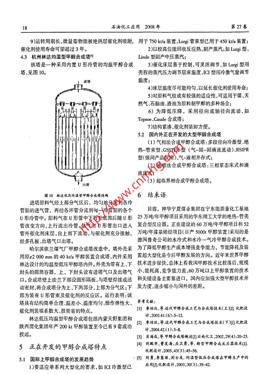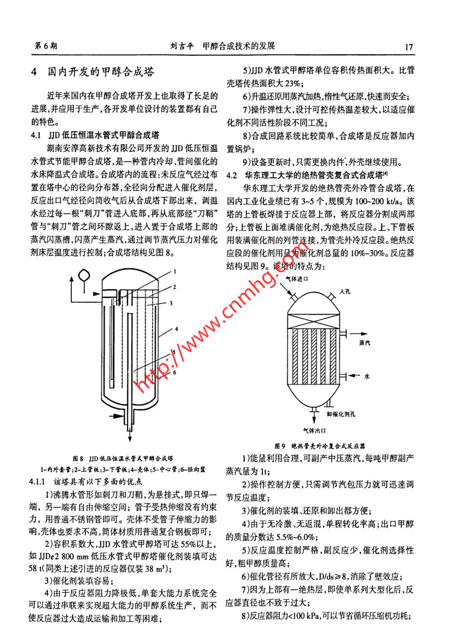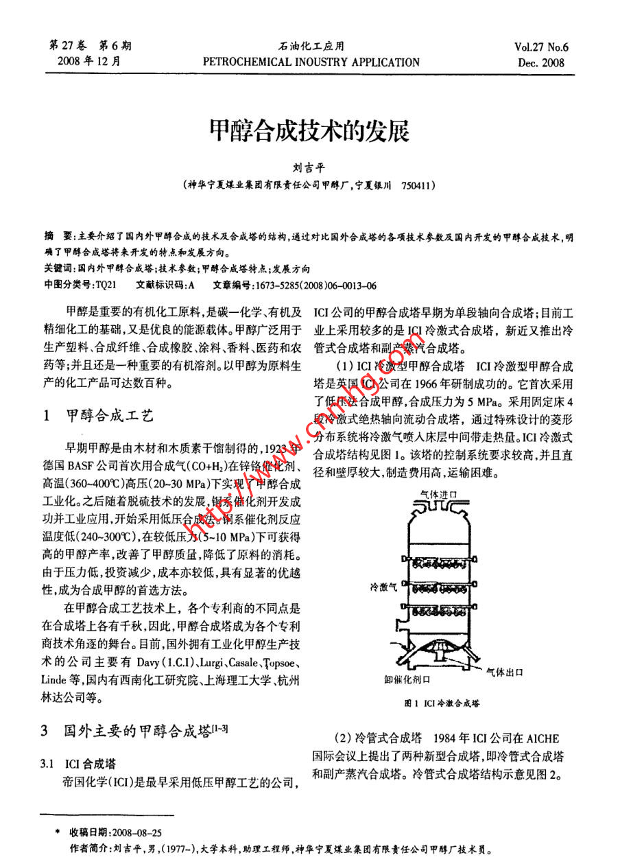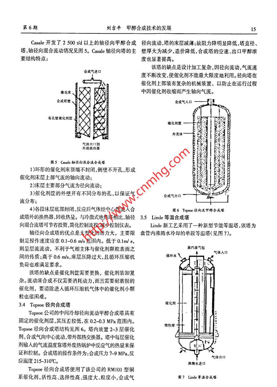 第27卷第6期石油化工應(yīng)用Vol.27 No.62008年12月PETROCHEMICAL INOUSTRY APPLICATIONDec. 2008甲醇合成技術(shù)的發(fā)展劉吉平.(神華寧夏謀業(yè)集團(tuán)有限責(zé)任公司甲醇廠,寧夏銀川750411)摘要:主要介紹了 國(guó)內(nèi)外甲醇合成的技術(shù)及合成塔的結(jié)構(gòu),通過(guò)對(duì)比國(guó)外合成塔的各項(xiàng)技術(shù)參數(shù)及國(guó)內(nèi)開(kāi)發(fā)的甲醇合成技術(shù),明確了甲醇合成塔將來(lái)開(kāi)發(fā)的特點(diǎn)和發(fā)展方向。關(guān)鍵詞:國(guó)內(nèi)外甲醇合成塔;技術(shù)參數(shù);甲醇合成塔特點(diǎn);發(fā)展方向中圖分類號(hào):TQ21.文獻(xiàn)標(biāo)識(shí)碼:A文章編號(hào):1673- -5285(2008)06 _0013-06甲醇是重要的有機(jī)化工原料,是碳一化學(xué)、有機(jī)及ICI 公司的甲醇合成塔早期為單段軸向合成塔;目前工精細(xì)化工的基礎(chǔ),又是優(yōu)良的能源載體。甲醇廣泛用于業(yè)上采用較多的是ICI冷激式合成塔,新近又推出冷生產(chǎn)塑料、合成纖維、合成橡膠、涂料、香料、醫(yī)藥和農(nóng)管式合 成塔和副產(chǎn)蒸汽合成塔。藥等;并且還是一種重要的有機(jī)溶劑。以甲醇為原料生(1) 1CI冷激型甲醇合成塔1CI 冷激型甲醇合成產(chǎn)的化工產(chǎn)品可達(dá)數(shù)百種。塔是英國(guó)ICI公司在1966年研制成功的。它首次采用了低壓法合成甲醇,合成壓力為5 MPa。采用固定床41甲醇合成工藝段冷激式絕熱軸向流動(dòng)合成塔,通過(guò)特殊設(shè)計(jì)的菱形早期甲醇是由木材和木質(zhì)素干餾制得的,1923年分布系統(tǒng)將冷激氣噴人床層中間帶走熱量。ICI冷激式德國(guó)BASF公司首次用合成氣(CO+H)在鋅鉻催化劑、合成塔結(jié)構(gòu)見(jiàn)圖1。該塔的控制系統(tǒng)要求較高,并且直高溫(360- -4009C)高壓(20-30 MPa)下實(shí)現(xiàn)了甲醇合成徑和壁厚較大,制造費(fèi)用高,運(yùn)輸困難。氣體進(jìn)口.工業(yè)化。之后隨著脫硫技術(shù)的發(fā)展,銅系催化劑開(kāi)發(fā)成功并工業(yè)應(yīng)用,開(kāi)始采用低壓合成法。銅系催化劑反應(yīng)溫度低(240~300C),在較低壓力(5~10 MPa)下可獲得高的甲醇產(chǎn)率,改善了甲醇質(zhì)量,降低了原料的消耗。由于壓力低,投資減少,成本亦較低,具有顯著的優(yōu)越性,成為合成甲醇的首選方法。冷激氣hotwwpo在甲醇合成工藝技術(shù)上,各個(gè)專利商的不同點(diǎn)是在合成塔上各有千秋,因此,甲醇合成塔成為各個(gè)專利商技術(shù)角逐的舞臺(tái)。目前,國(guó)外擁有工業(yè)化甲醇生產(chǎn)技術(shù)的公司主要有Darvy(.C.1l.Jurgi.Casale Tupsoe、氣體出口Linde等,國(guó)內(nèi)有西南化工研究院、上海理工大學(xué)、杭州卸催化劑口林達(dá)公司等。團(tuán)1 ICI冷激合成塔3國(guó)外主要的甲醇合成塔1[-3](2)冷管式合成塔1984 年ICI公司在AICHE國(guó)際會(huì)議上提出了兩種新型合成塔,即冷管式合成塔3.1 ICI 合成塔帝國(guó)化學(xué)(ICI)是最早采用低壓甲醇工藝的公司,和副產(chǎn)蒸汽合成塔。冷管式合成塔結(jié)構(gòu)示意見(jiàn)圖2。$收稿日期:2008-08-25作者簡(jiǎn)介:劉吉平,男,(1977-),大學(xué)本科,助理工程師,神華寧夏煤業(yè)集團(tuán)有限責(zé)任公司甲醇廠技術(shù)員。石油化工應(yīng)用2008 年第27卷143.2 Lurgi列管等溫合成塔pC20世紀(jì)70年代初,LurgiGmbH公司首先使用了管束型副產(chǎn)蒸汽合成塔,既是合成塔又是廢熱鍋爐。操作壓力為5 MPa,溫度為2509,合成塔形似列管式換熱器(見(jiàn)圖4)。在塔中,列管內(nèi)裝填催化劑,管間為沸騰水。甲醇合成反應(yīng)放出的熱很快被沸水移走。合成塔殼程的鍋爐水是自然循環(huán)的,這樣通過(guò)控制沸騰水的蒸汽壓力,來(lái)控制反應(yīng)溫度,有效地抑制了副反應(yīng),延長(zhǎng)了催化劑的使用壽命。反凰氣入口圍2 ICI冷管合成塔冷管式合成塔與單段內(nèi)冷式逆流合成塔相似。但冷管塔將換熱器移出,在合成塔簡(jiǎn)體之外,如塔氣靠管間催化劑層的反應(yīng)熱來(lái)預(yù)熱,溫度的調(diào)節(jié)是通過(guò)旁路]-蒸汽或調(diào)節(jié)合成塔下游進(jìn)出塔氣體交換量來(lái)控制;該塔不僅投資省,而且具有壓差小,操作穩(wěn)定的優(yōu)點(diǎn)。(3)副產(chǎn)蒸汽合成塔副產(chǎn)蒸汽合成塔結(jié)構(gòu)示意見(jiàn)圖3。該塔也屬于單-dFO-一水段內(nèi)冷式,但氣體流動(dòng)式徑向橫流,垂直于沸騰水冷卻D-反應(yīng)氣出口管。該合成塔是應(yīng)用了有限元分析法分析塔內(nèi)氣體流動(dòng)和溫度特性后設(shè)計(jì)的。偃化制箱將口!. 汽包田4 Lurgj合成塔軟水下降管Lurgi公司列管合成塔在使用含高銅的高活性催.膨脹圍化劑時(shí),可得到較高的單程轉(zhuǎn)化率。3.2.1 Lurgi列管塔的優(yōu)點(diǎn)端1)單位體積的傳熱面積較高(可達(dá)30 m2/cm2),管管束內(nèi)中心線與沸騰水之間的最大溫差可達(dá)10~12C,床進(jìn)氣分配板層溫差變化小,操作平穩(wěn);-催化床2)通過(guò)蒸汽壓力的調(diào)節(jié),簡(jiǎn)便地控制床層溫度,使,氣體進(jìn)口催化劑壽命延長(zhǎng);氣體出口-3 )熱能利用合理,每噸甲醇副產(chǎn)蒸汽最高達(dá)1.4t;S軟水從光包來(lái)4)反應(yīng)溫和、副反應(yīng)少,時(shí)空收率高達(dá)0.72Um2h;5)單程轉(zhuǎn)化率高,合成塔出口的甲醇含量達(dá)7%,圈3 ICI制產(chǎn)蒸汽合成塔因此循環(huán)