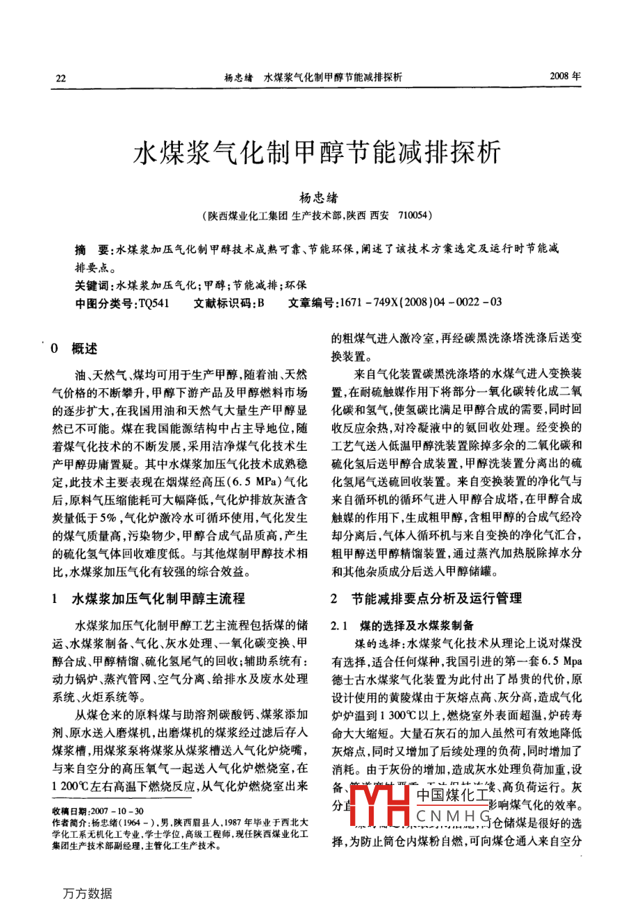 水煤漿氣化制甲醇節(jié)能減排探析