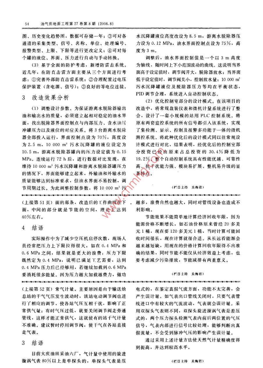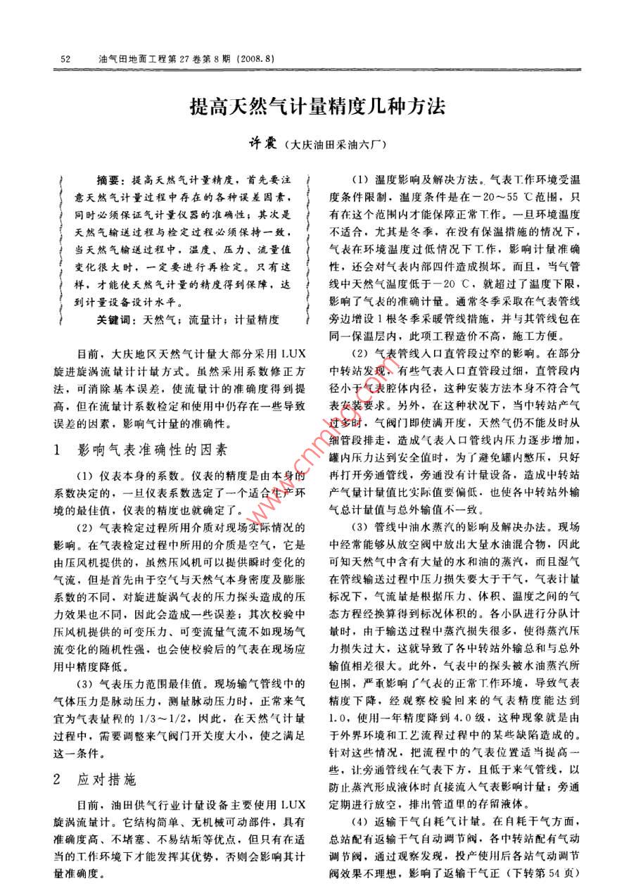 5油氣田地面工程第27卷第8期(2008. 8)提高天然氣計(jì)量精度幾種方法許震(大慶油田采油六廠)摘要:提高天然氣計(jì)量精度,首先要注(1)溫度影響及解決方法。氣表T.作環(huán)境受溫意天然氣計(jì)量過(guò)程中存在的各種誤差因素,度條件限制,溫度條件是在一20~55 C范圍,只同時(shí)必須保證氣計(jì)量?jī)x器的準(zhǔn)確性;其次是有在這個(gè)范圍內(nèi)才能保障正常工作。一旦環(huán)境溫度天然氣輸送過(guò)程與檢定過(guò)程必須保持一致,不適合,尤其是冬季,在沒有保溫措施的情況下,當(dāng)天然氣輸送過(guò)程中,溫度、壓力、流量值氣表在環(huán)境溫度過(guò)低情況下工作,影響計(jì)量準(zhǔn)確變化很大時(shí),一定要進(jìn)行再檢定。只有這性,還會(huì)對(duì)氣表內(nèi)部四件造成損壞。而且,當(dāng)氣管樣,才能使天然氣計(jì)量的精度得到保障,達(dá)線中天然氣溫度低于-20 C,就超過(guò)了溫度下限,到計(jì)量設(shè)備設(shè)計(jì)水平。影響了氣表的準(zhǔn)確計(jì)量。通常冬季采取在氣表管線關(guān)鍵詞:天然氣;流量計(jì);計(jì)量精度旁邊增設(shè)1根冬季采暖管線措施,并與其管線包在同-保溫層內(nèi),此項(xiàng)工程造價(jià)不高,施工方便。目前,大慶地區(qū)天然氣計(jì)量大部分采用LUX(2)氣表管線人口直管段過(guò)窄的影響。在部分旋進(jìn)旋渦流量計(jì)計(jì)量方式。雖然采用系數(shù)修正方中轉(zhuǎn)站發(fā)現(xiàn),有些氣表入口直管段過(guò)細(xì),直管段內(nèi)法,可消除基本誤差,使流量計(jì)的準(zhǔn)確度得到提徑小于氣表腔體內(nèi)徑,這種安裝方法本身不符合氣高,但在流量計(jì)系數(shù)檢定和使用中仍存在一些導(dǎo)致表安裝要求。另外,在這種狀況下,當(dāng)中轉(zhuǎn)站產(chǎn)氣誤差的因素,影響氣計(jì)量的準(zhǔn)確性。過(guò)多時(shí),氣閥門即使?jié)M開度,天然氣仍不能及時(shí)從細(xì)管段排走,造成氣表入口管線內(nèi)壓力逐步增加,1影響氣表準(zhǔn)確性的因素罐內(nèi)壓力達(dá)到安全值時(shí),為了避免罐內(nèi)憋壓,只好.(1)儀表本身的系數(shù)。儀表的精度是由本身的冉打開旁通管線,旁通沒有計(jì)量設(shè)備,造成中轉(zhuǎn)站系數(shù)決定的,一旦儀表系數(shù)選定了一個(gè)適合生產(chǎn)環(huán)產(chǎn)氣量計(jì)量值比實(shí)際值要偏低.也使各中轉(zhuǎn)站外輸境的最佳值,儀表的精度也就確定了。氣總計(jì)量值與總外輸值不一致。(2)氣表檢定過(guò)程所用介質(zhì)對(duì)現(xiàn)場(chǎng)實(shí)際情況的(3) 管線中油水蒸汽的影響及解決辦法?,F(xiàn)場(chǎng)影響。在氣表檢定過(guò)程中所用的介質(zhì)是空氣,它是中經(jīng)常能夠從放空閥中放出大量水油混合物,因此由壓風(fēng)機(jī)提供的,雖然壓風(fēng)機(jī)可以提供瞬時(shí)變化的可知天然氣中含有大量的水和油的蒸汽,而且濕氣氣流,但是首先由于空氣與天然氣本身密度及膨脹在管線輸送過(guò)程中壓力損失要大于干氣,氣表計(jì)量系數(shù)的不同,對(duì)旋進(jìn)旋渦氣表的樂力探頭造成的壓標(biāo)況下,氣流量是根據(jù)壓力、體積、溫度之間的氣力效果也不同,因此會(huì)造成一些誤差;其次校驗(yàn)中態(tài)方程經(jīng)換算得到標(biāo)況體積的。各小隊(duì)進(jìn)行分隊(duì)計(jì)壓風(fēng)機(jī)提供的可變壓力、可變流量氣流不如現(xiàn)場(chǎng)氣最時(shí),由于輸送過(guò)程中蒸汽損失很多,使得蒸汽壓流變化的隨機(jī)性強(qiáng),也會(huì)使校驗(yàn)后的氣表在現(xiàn)場(chǎng)應(yīng)力損失過(guò)大,這就導(dǎo)致了各中轉(zhuǎn)站外輸總和與總外用中精度降低。輸值相差很大。此外,氣表中的探頭被水油蒸汽所(3)氣表壓力范圍最佳值?,F(xiàn)場(chǎng)輸氣管線中的包圍,嚴(yán)重影響了氣表的正常工作環(huán)境,導(dǎo)致氣表氣體壓力是脈動(dòng)壓力,測(cè)量脈動(dòng)壓力時(shí),正常來(lái)氣精度下降,經(jīng)觀察校驗(yàn)回來(lái)的氣表精度能達(dá)到宜為氣表量程的1/3~1/2,因此,在天然氣計(jì)量1.0, 使用一年精度降到4.0級(jí),這種現(xiàn)象就是由過(guò)程中,需要調(diào)整來(lái)氣閥門開關(guān)度大小,使之滿足于外界環(huán)境和工藝流程過(guò)程中的某些缺陷造成的。這一條件。針對(duì)這些情況,把流程中的氣表位置適當(dāng)提高一些,讓旁通管線在氣表下方,且低于來(lái)氣管線,以2應(yīng)對(duì)措施防I止蒸汽形成液體時(shí)肖接流人氣表影響計(jì)量;旁通目前,油田供氣行業(yè)計(jì)量設(shè)備主要使用LUX定期進(jìn)行放空,排出管道里的存留液體。旋渦流量計(jì)。它結(jié)構(gòu)簡(jiǎn)單、無(wú)機(jī)械可動(dòng)部件,具有.(4)返輸干氣自耗氣計(jì)量。在自耗干氣方面,準(zhǔn)確度高、不堵塞、不易結(jié)垢等優(yōu)點(diǎn),但只有在適.總站配有返輸干氣自動(dòng)調(diào)節(jié)閥,各中轉(zhuǎn)站配有氣動(dòng)當(dāng)?shù)墓ぷ鳝h(huán)境下才能發(fā)揮其優(yōu)勢(shì),否則會(huì)影響其計(jì)調(diào)節(jié)閥,通過(guò)觀察發(fā)現(xiàn),投產(chǎn)使用后各站氣動(dòng)調(diào)節(jié)量準(zhǔn)確度。閥效果不理想,影響了返輸干氣正(下轉(zhuǎn)第54頁(yè))5油氣田地面工程第27卷第8期(2008. 8)圖、歷史變化趨勢(shì)圖,數(shù)據(jù)可存儲(chǔ)一年;③可對(d
