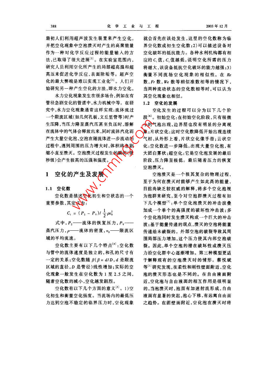 2003年12月化學(xué)工業(yè)與工程第20卷第6期Dec 2003CHEMICAL INDUSTRY AND ENGINEERING專題綜述水力空化及應(yīng)用武君,張曉冬,劉學(xué)武,夏遠(yuǎn)景,李志義(大連理工大學(xué)流體與粉體工程研究設(shè)計(jì)所,遼寧大連16012)摘要;本文對水力空化現(xiàn)象進(jìn)行了較全面的綜迷,包括空化的產(chǎn)生、發(fā)展及漬滅的過程,給出空泡潰滅時的三種模型假設(shè),并提出把空泡潰滅時產(chǎn)生的高壓高溫條件作為種能量輸入的方法用在化學(xué)反應(yīng)過程等領(lǐng)域,介紹了水力空化裝置及應(yīng)用前景等,并對空化及空蝕的產(chǎn)生機(jī)理進(jìn)行了初步探討,對進(jìn)一步深入研究空化現(xiàn)象及應(yīng)用有定的參考作用。關(guān)鍵詞:空化;流體流動;空泡;潰滅中圖分類號:0352.1文獻(xiàn)標(biāo)識碼:A文章編號:1004-9533(2003)06-0387-05Hydrodynamic Cavitation and Its ApplicationsWU Jun, ZHANG Xiao-dong, LIU Xue-wu, XIA Yuan-jing, LI Zhi- yi(R&D Institute of Fluid and Powder Engineening, Dalian University of technology, Liaoning Dalian 116012, China)Abstract: The hydrodynamic cavitation phenomenon included inception, development and thecollapse of the hydrodynamic cavitation has been reviewed. Three models have been proposed toexplain the cavity collapse. The high pressure and temperature which the collapsed cavitiesgenerated can be used as a method of energy imput. The paper also includes that the hydrodynamic equipment and the applications. This is important for the further researchKey words: cavitation; fluid now; bulb; collapse早在1753年, Euler注意到,當(dāng)水管中某空化可產(chǎn)生的種種不利影響,例如在泵中處的壓強(qiáng)若降低至蒸汽壓甚至到負(fù)值時,水產(chǎn)生的空蝕,它是由靠近固體表處的空泡漬即自管壁分離并在該處形成一個真空空間,滅時產(chǎn)生的高速液體射流沖擊所造成的通常人們將這種現(xiàn)象稱為空化。其后,發(fā)現(xiàn)與此同時,人們也在思考如何利用這種現(xiàn)象。收稿日期:2002-11-1作者簡介:武君(1979-),女,河北邯鄲人,在讀碩士,主要從事過程的空化強(qiáng)化研究化學(xué)工業(yè)與工程003年12月最初人們利用超聲波發(fā)生裝置來產(chǎn)生空化,就會首先在該處發(fā)生,這里的空化數(shù)稱為臨并把空化現(xiàn)象中空泡潰滅時產(chǎn)生的高聚能量界空化數(shù)或初生空化數(shù);2)可以描述設(shè)備對作為一種對化學(xué)反應(yīng)過程的能量輸入的方空化破壞的抵抗能力。各種水利機(jī)構(gòu)都有相法,已取得了很大進(jìn)展2。在實(shí)驗(yàn)室范圍內(nèi),應(yīng)的C值,C值越低,說明空化所需的壓力研究人員利用空化所產(chǎn)生的局部超高溫和超將越大,該設(shè)備抵抗空化破壞的能力越強(qiáng);3)高壓來促進(jìn)化學(xué)反應(yīng),表面除垢等。超聲空衡量不同流場空化現(xiàn)象的相似性。在Re大弊端是難以實(shí)現(xiàn)工業(yè)化。人們開數(shù),F數(shù),We數(shù)等相似準(zhǔn)數(shù)相等的情況下另一種產(chǎn)生空化的方法,即水力空化。當(dāng)兩種流動狀態(tài)的空化數(shù)相等時,可以認(rèn)為水力空化現(xiàn)象發(fā)生在很多場合,例如在有其空化現(xiàn)象也相似管徑急劇變化的管道中,水力機(jī)械中等。在研1.2空化的發(fā)展究中,水力空化現(xiàn)象通常這樣實(shí)現(xiàn):流體流過空化發(fā)生的過程可以分為以下幾個階一個限流區(qū)域(如幾何孔板文丘里管等)時產(chǎn)段6。初始空化:在初始空化階段,只有極微生壓降,當(dāng)壓力降至蒸汽壓甚至負(fù)壓時溶解小的氣泡出現(xiàn),邊界層也沒有明顯的分離現(xiàn)在流體中的氣體會釋放出來同時流體汽化而象;片狀空化:這時空化數(shù)降低開始出現(xiàn)連續(xù)產(chǎn)生大量空化泡空泡在隨流體進(jìn)一步流動的氣相,從外形上看,片狀空化像手指;云狀空過程中,遇到周圍的壓力增大時,體積將急劇化:空化數(shù)進(jìn)一步降低,出現(xiàn)大量空化泡,有縮小直至潰滅。空泡潰滅過程發(fā)生的瞬間(微大團(tuán)白霧狀;超空化:它是空化泡發(fā)展的最后秒級)會產(chǎn)生極高的壓強(qiáng)和溫度。階段,壓力降至極低。最后隨著壓力的恢復(fù)空泡漬滅空化的產(chǎn)生及發(fā)展空泡潰滅是一個極其復(fù)雜的物理過程,至于為何在潰滅時能夠產(chǎn)生如此高的能量,1.1空化數(shù)目前尚缺乏較權(quán)威的解釋,將多個空化泡視空化數(shù)是描述空化初生和空狀態(tài)的一個為泡群來研究,至今對空泡群潰滅過程有如重要參數(shù),其定義為下幾個模型”:單個空化泡潰滅的沖擊波疊C;=(P2-P、)5pob加成一個單個的高強(qiáng)度的破壞性沖擊波;多個空化泡同時發(fā)生潰滅構(gòu)成一個巨大的沖擊式中,P2—流體的恢復(fù)壓力,P波;基于能量傳遞的觀點(diǎn),潰滅的空泡將能量蒸汽壓力,P—流體的密度,—限流區(qū)傳遞給未破裂的。外部空泡的破裂導(dǎo)致其周域的平均流速。圍局部壓力增加,這個壓力使其內(nèi)部空泡破空化數(shù)主要有以下幾個特點(diǎn):空化數(shù)裂。因此,單個空泡的潛在破壞性或漬滅壓與管中的流體速度是獨(dú)立的,和孔的尺寸有力沿空化群中心逐漸增加。第三種模型更適定的關(guān)系;空化數(shù)隨R(B=d/D,d是限流于解釋現(xiàn)有的空泡潰滅時的情形。蔡悅斌區(qū)域的直徑,D是管徑)線性增加;實(shí)際的空等研究發(fā)現(xiàn),在柔性和剛性壁