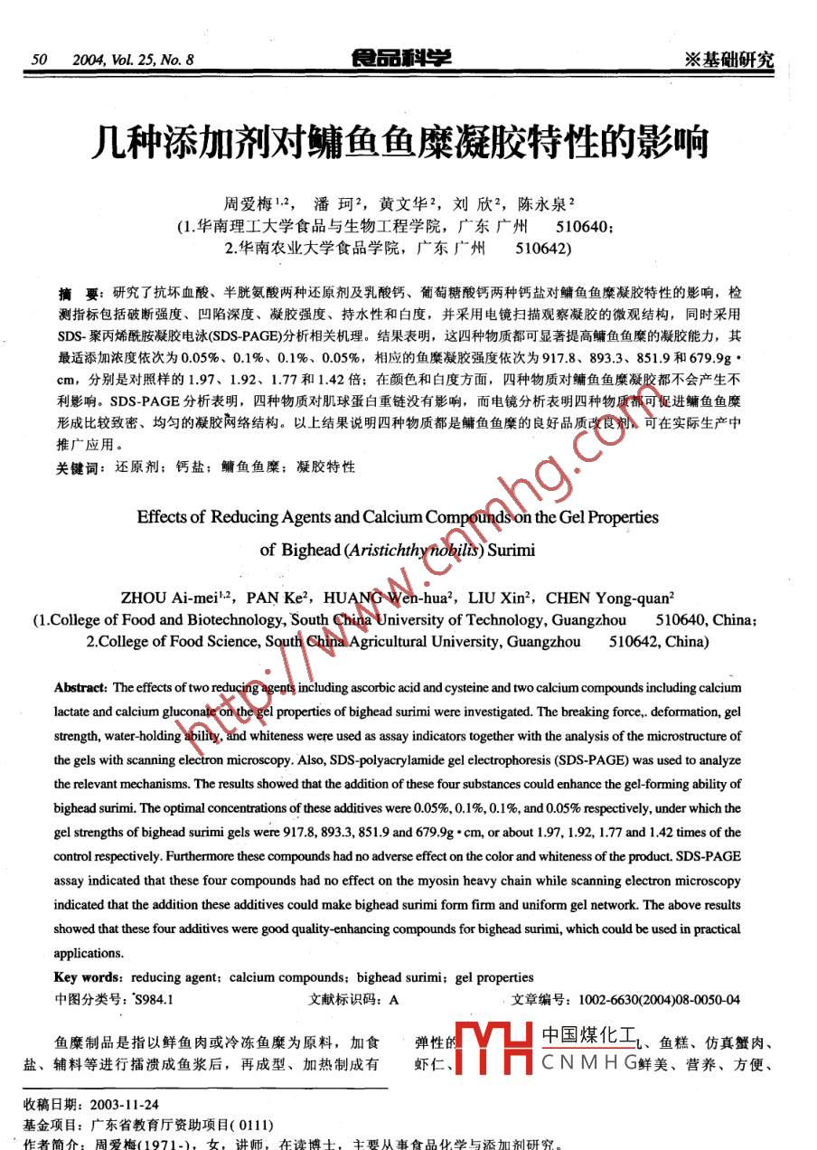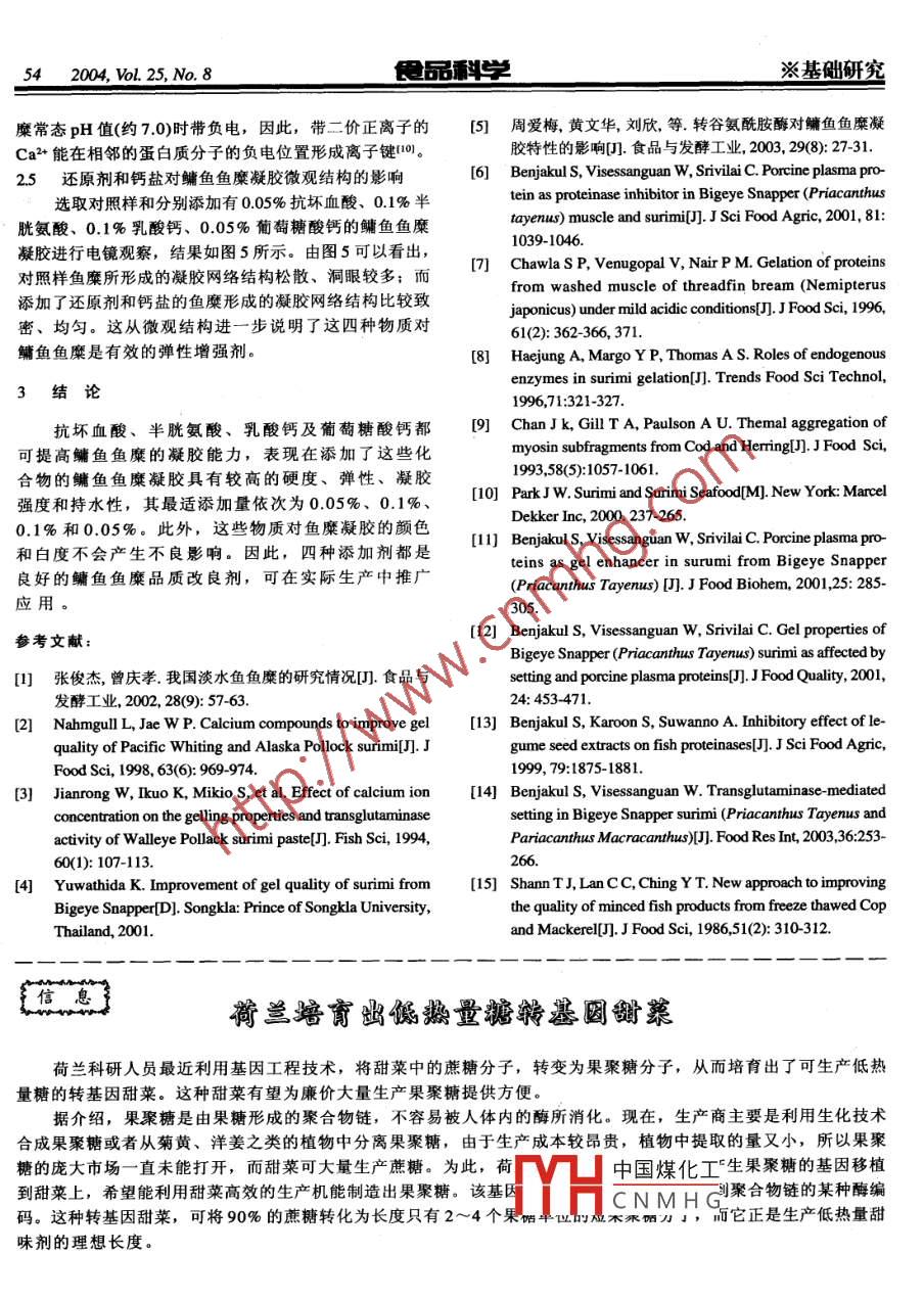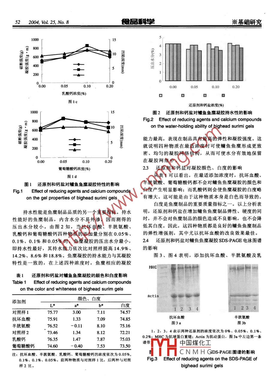 502004, Vol. 25, No. 8食品科學※基礎研究幾種添加劑對鳙魚魚糜凝膠特性的影響周愛梅1.2,潘珂2,黃文華2,劉欣",陳永泉2(1.華南理工大學食品與生物工程學院,廣東廣州510640;2.華南農業(yè)大學食品學院,廣東廣州5 10642)摘要:研究了抗壞血酸、半胱氨酸兩種還原劑及乳酸鈣、葡萄糖酸鈣兩種鈣鹽對鳙魚魚糜凝膠特性的影響,檢測指標包括破斷強度、凹陷深度、凝膠強度、持水性和白度,并采用電鏡掃描觀察凝膠的微觀結構,同時采用SDS-聚丙烯酰胺凝膠電泳(SDS-PAGE)分析相關機理。結果表明,這四種物質都可顯著提高鳙魚魚糜的凝膠能力,其最適添加濃度依次為0.05%、0.1%、 0.1%、 0.05%, 相應的魚糜凝膠強度依次為917.8、893.3、 851.9 和679.9g●cm,分別是對照樣的1.97、1.92、1.77和1.42 倍:在顏色和白度方面,四種物質對鳙魚魚糜凝膠都不會產生不利影響。SDS-PAGE 分析表明,四種物質對肌球蛋白重鏈沒有影響,而電鏡分析表明四種物質都可促進鳙魚魚糜形成比較致密、均勻的凝膠網絡結構。以上結果說明四種物質都是鳙魚魚糜的良好品質改良劑,可在實際生產中推廣應用。關鍵詞:還原劑:鈣鹽;鳙魚魚糜;凝膠特性Effects of Reducing Agents and Calcium Compounds on the Gel Propertiesof Bighead (Aristichthy nobilis) SurimiZHOU Ai-meil:2, PAN Ke2, HUANG Wen-hua?, LIU Xin2,CHEN Yong- quan2(1.College of Food and Biotechnology, South China University of Technology, Guangzhou510640, China;2.College of Food Science, South China Agricultural University, Guangzhou510642, China)Abstract: The efects of two reducing agents including ascorbic acid and cysteine and two calcium compounds including calciumlactate and calcium gluconate on the gel propertics of bighead surimi were investigated. The breaking force,. deformation, gelstrength, water-holding ability, and whiteness were used as assay indicators together with the analysis of the microstructure ofthe gels with scanning electron microscopy. Also, SDS polyacrylamide gel electrophoresis (SDS-PAGE) was used to analyzethe relevant mechanisms. The results showed that the addition of these four substances could enhance the gel-forming ability ofbighead surimi. The optimal concentrations of these additives were 0.05%, 0.1%, 0.1%, and 0.05% respectively, under which thegel strengths of bighead surimi gels were 917.8, 893.3, 851.9 and 679.9g●cm, or about 1.97, 1.92, 1.77 and 1.42 times of thecontrol respectively. Furthermore these compounds had no adverse effect on the color and whiteness of the product. SDS-PAGEassay indicated that these four compounds had no effect on the myosin heavy chain while scanning electron microscopyindicated that the addition these additives could make bighead surimi form firm and uniform gel network. The above resultsshowed that these four additives were good quality-enhancing compounds for bighead surimi, which could be used in practicalapplications.Key words: reducing agent; calcium compounds; bighead surimi; gel properties中圖分類號: 'S984.1文獻標識碼: A文章編號: 1002-6630(2004)08-0050-04魚糜制品是指以鮮魚肉或冷凍魚糜為原料,加食彈性的中國煤化工、魚糕、仿真蟹肉、鹽、輔料等進行擂潰成魚漿后,再成型、加熱制成有蝦仁、:MYHCNMH G鮮美、營養(yǎng)、方便、收稿日期: 2003-11-24基金項目:廣東省教育廳資助項目( 0111)作者簡介:周愛梅(1971-), 女,講師,在讀博士,主要從事食品化學與添加劑研究。※基礎研究食品科學2004, VoL. 25, No.851品種多等特點而廣泛被世界各國所接受,需求量日益增白度=100 -(100 - L')+a" +b"]I^長。目前魚糜制品的原料主要限于海水魚類,但由于1.2.4魚糜凝膠 SDS-聚丙烯酰胺凝膠電泳(簡稱SDS-近幾年海洋捕撈強度的加大,生產魚糜制品的優(yōu)質海水PAGE)魚的數(shù)量已逐漸下降。與此相反,世界淡水魚的養(yǎng)殖參考文獻[7]的方法并略作修改。稱取2g魚糜凝產量則持續(xù)增加。以我國為例,我國1997年的淡水魚膠,加入15ml 20mmol/L的Tris-HCl緩沖溶液(pH8.0,含產量為1420萬噸,到2000年已達1740.3萬噸川。因此,有2%SDS、8mol/L 尿素和2% β. 巰基乙醇),均質后在開發(fā)淡水魚麋制品是未來魚糜加工業(yè)的主流。100C沸水浴2min,然后在室溫磁力攪拌24h使蛋白質鳙魚是我國產量最大的淡水魚之一,但由于傳統(tǒng)飲充分溶解出來,離心后取一定量的清液(即20ug蛋白質)食習慣,多被用來煲“魚頭湯”,魚身的利用程度卻進行電泳(DYY- Il -8B穩(wěn)壓穩(wěn)流型電泳儀,上海標本模很低,如果能夠將其加工成魚糜制品,一方 面可實現(xiàn)型廠。其中濃縮膠質量分數(shù)為4%,分離膠質量分數(shù)為對鳙魚的綜合利用,提高鳙魚的經濟價值,另- 方面10%.又可為魚糜制品加工業(yè)提供-種新的原料。但本課題組2結果與討論的前期研究顯示,鳙魚魚糜的凝膠性能較差(尤其在冷凍貯藏后),與鱈魚、帶魚、草魚和鯪魚等相比,其2.1 還原劑和鈣鹽對鳙魚魚糜凝膠特性的影響加工出的魚糜制品在硬度、彈性和持水性等方面都要差在鳙魚魚糜中加入不同濃度的還原劑,其對鳙魚魚很多,因而有必要研究出適合于鳙魚魚糜的品質改良劑糜凝膠特性的影響如圖1所示。從圖1四個圖可以看出,以提高其凝膠性能。國外有資料表明,抗壞血酸、半鳙魚魚糜凝膠的破斷強度、凹陷深度和凝膠強度都隨著胱氨酸等還原劑及乳酸鈣、葡萄糖酸鈣等鈣鹽可顯著改抗壞血酸、半胱氨酸、乳酸鈣和葡萄糖酸鈣的添加量善某些海水魚糜的凝膠特性(2- 4),但這些物質對淡水魚增大而升高,但達到某- -濃度后, 繼續(xù)增大濃度,上糜的改良作用則在國內外都鮮見報道。為