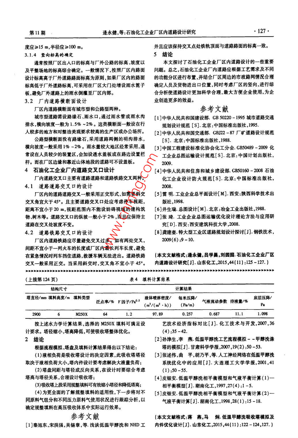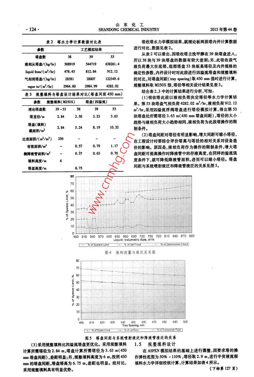 山東化工12SHANDONG CHEMICAL INDUSTRY015年第44卷低溫甲醇洗吸收塔模擬及內(nèi)件優(yōu)化設(shè)計(jì)蔣燕,馬炯(中石化南京工程有限公司,江蘇南京211100要:吸收塔是低溫甲醇洗工藝中的核心設(shè)備,內(nèi)件對(duì)吸收塔性能至關(guān)重要。本文采用規(guī)整填料替代以往設(shè)計(jì)中四溢流塔盤降低塔徑和塔高以優(yōu)化設(shè)計(jì)、節(jié)省投資;采用 Aspen Plug和DRP軟件分別對(duì)低溫甲醇洗吸收塔工藝參數(shù)和塔內(nèi)件進(jìn)行模擬和對(duì)比在流程工藝模擬基礎(chǔ)上對(duì)吸收塔進(jìn)行水力學(xué)計(jì)算。模擬計(jì)算結(jié)果表明,采用規(guī)整填料比四溢流塔盤具有優(yōu)勢(shì)。關(guān)鍵詞:低溫甲醇洗;塔內(nèi)件; ASPEN;過程模擬;吸收塔;規(guī)整填料中圖分類號(hào):TQ015.9文獻(xiàn)標(biāo)識(shí)碼:A文章編號(hào):1008-021X(2015)11-0122-03Simulation of Rectisol Aabsorber and Internals Optimal DesignJiang Yan, Ma jiongSINOPEC Nanjing Engineering Construction Inc ., Nanjing 211100, China)Abstract: The absorber is the key equipment and the column intemals is important for the absorber performance. The paperintroduce that use the structured packing to substitute the four low tray, to decrease the column diameter and the height, tooptimize deign and save investment. With the aid of software Aspen Plus and DRP, the rectisol unit was simulatedaccording to the process and the column intemals. The hydraulic performance of the absorber was calculated base onprocess simulation result. The simulation results indicated that, the structured packing is better than four flow tray.ey words: rectisol; column internals; ASPEN; process simulation; absorber; structured packing低溫甲醇洗( Rectisol)能夠有效脫除原料氣的H2S、CO2方程為基礎(chǔ)物性方法進(jìn)行計(jì)算,SRK方程描述如下:和C0s等組分,與其它吸收技術(shù)相比有一定的優(yōu)越性RT采用低溫甲醇洗技術(shù),凈化氣中總的硫含量可脫至1.0-b v(v+b)10-以下,CO2可脫至10×10-3以下。其中:a=+B1本文通過工藝模擬和內(nèi)件水力學(xué)計(jì)算,分析采用規(guī)整填是標(biāo)準(zhǔn)態(tài)混合二次函數(shù)立阿(4料后的優(yōu)勢(shì)和設(shè)計(jì)中需注意的問題,為吸收塔內(nèi)件工程設(shè)計(jì)提供依據(jù)。1吸收塔工藝模擬B1是極性附加函數(shù),1.1樸擬模型b=∑功本文采用 Aspen Plus軟件中的嚴(yán)格精餾模塊 RadFrac對(duì)a=fen(T, T, Pa, D,)低溫甲醇洗吸收塔進(jìn)行工藝模擬,因低溫甲醇洗吸收塔是脫b=知n(T,p)碳和脫硫分段吸收,雖采用一個(gè)塔殼體,但內(nèi)件設(shè)計(jì)時(shí)采用集液箱對(duì)各段液相進(jìn)行隔離,氣相通過升氣管進(jìn)行連通,模=+9+HT+R/T擬時(shí)其每段可以視作獨(dú)立的吸收塔,每段均為獨(dú)立的傳質(zhì)和氣液平衡過程。V=4+T+4/T在模擬過程中,為順利模擬并貼合吸收塔實(shí)際操作過通常:4=ln:b=l=0,程,吸收塔共采用4個(gè)模擬塔進(jìn)行計(jì)算,對(duì)低溫甲醇洗吸收其中RK狀態(tài)方程中純物質(zhì)的性質(zhì)系數(shù)a、b1根據(jù)下列塔模擬的現(xiàn)有文獻(xiàn)也均采用此種方法2-3。方程由軟件給定參數(shù)進(jìn)行計(jì)算得出:1.2基礎(chǔ)物性數(shù)據(jù)(熱力學(xué)方法和氣液相平衡)低溫甲醇洗物系主要含有CH3OH、CO、CO2、H2、H2S、q=a,0.42747-,H2O、CH4和N2等,該物系為極性物系,同時(shí)又含有非極性b=008664和極性締合組分的體系,如完全采用活度系數(shù)方程N(yùn)RTL,其模擬計(jì)算結(jié)果與實(shí)際情況會(huì)有較大的偏離,本系統(tǒng)采用狀態(tài)在采用狀態(tài)方程法計(jì)算此體系的相平衡時(shí),組分極性和方程作為基礎(chǔ)物性進(jìn)行模擬計(jì)算較為合適,系統(tǒng)模擬以SRK體積大小差別很大,采用常用線性混合規(guī)則就不適合。體系收稿日期:2015-04-17作者簡(jiǎn)介:蔣燕(1981—),女,江蘇宜興人,碩士,工程師從事化學(xué)工程與工藝設(shè)計(jì)第11期蔣燕等:低溫甲醇洗吸收塔模擬及內(nèi)件優(yōu)化設(shè)計(jì)123中甲醇和水都是強(qiáng)極性組分,另有CO2、H2等輕組分必須采方法。CO2在甲醇液中的溶解熱是模擬正確與否的重要參用更為精確的超額自由能CE型混合規(guī)則,Huon-idl混數(shù),對(duì)甲醇循環(huán)量有重要影響;另外甲醇液在高壓低溫下的合規(guī)則是考慮了組分間強(qiáng)烈的非理想性的混合規(guī)則,如下述熱焓也是吸收塔熱量平衡計(jì)算的重要基礎(chǔ)參數(shù);因高壓低溫方程所示:甲醇洗體系的特殊性,軟件模擬有一定的偏離,這就需要參GF=Rln-∑xRTl考文獻(xiàn)數(shù)據(jù)-5),對(duì)軟件中的物性進(jìn)行回歸、修正,其中調(diào)整計(jì)算CO2蒸發(fā)焙值公式中的 DHVVLWT(汽化熱)參數(shù)之第Aspen Plus中的FSRK模型是經(jīng)Hurn- Vidal混合規(guī)則項(xiàng),以使模擬結(jié)果更貼近實(shí)測(cè)結(jié)果。修正的純物質(zhì)物性基于SRK方程描述的狀態(tài)方程物性方1.3模擬結(jié)果分析法,該模型可用于計(jì)算高溫高壓、接近臨界點(diǎn)等操作條件下粗原料氣輸人參數(shù)凈化氣計(jì)算結(jié)果具體參數(shù)如表1。的極性和非極性混合物。本文模擬以PSRK為基礎(chǔ)的物性表1粗原料氣輸入及凈化氣計(jì)算結(jié)果參數(shù)氣體種類操作壓力操作溫流量組分MPa BU/c (kmol/h) H, N CO AR CH CO2 H,s cos H,0 NH, HCN CH40粗原料氣4.22-23.810477.4255.430.220.40906×10-250×10-243.420.153.0×1040.2495×10-5凈