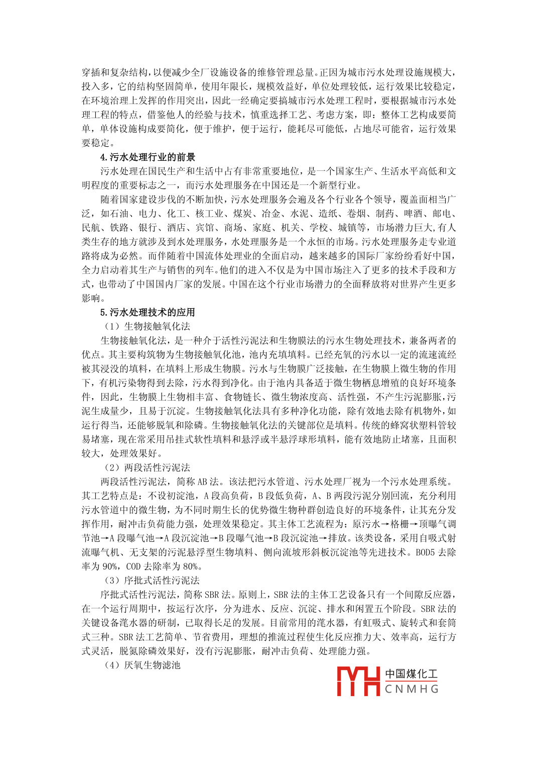 淺談污水處理技術(shù)的應(yīng)用郭新超博天環(huán)境集團股份有限公司廣東廣州510610摘要:城市污水處理工藝選擇的水質(zhì)因素進水水質(zhì)水量特性和出水水質(zhì)標準的確定是城市污水處理工藝選擇的關(guān)鍵環(huán)節(jié),也是我國當前城市污水處理工程設(shè)計中存在的薄弱環(huán)節(jié)。同時針對在污泥處置、再生水利用方面普遍存在的技術(shù)問題,做出了研究分析。關(guān)鍵詞:污水處理技術(shù)運用;特點;應(yīng)用中圖分類號: R123. 3文獻標識碼: A1.引言隨著污水排放標準的不斷嚴格,對污水中氮、磷等營養(yǎng)物質(zhì)的排放要求較高,傳統(tǒng)的具有脫氮除磷功能的污水處理工藝多以活性污泥法為主,往往需要將多個厭氧和好氧反應(yīng)池串聯(lián),形成多級反應(yīng)池,通過增加內(nèi)循環(huán)來達到脫氨除磷的目的,這勢必增加基建投資的費用及能耗,并且使運行管理較為復(fù)雜;目前城市污水的處理多以集中處理為主,龐大的污水收集系統(tǒng)的投資遠遠超過污水處理廠本身的投資,因此建設(shè)大型的污水處理廠,集中處理生活污水,從污水再生回用的角度來說不一定是唯一可取的方案 。2.污水處理后的運用(1)工業(yè)用水的回用經(jīng)處理的污水可以回用于各種不需要符合飲用水水質(zhì)要求的工業(yè)企業(yè)。各種工業(yè)生產(chǎn)過程中的冷卻水、鍋爐用水、生產(chǎn)和加工用水、清洗和輔助用水(如除塵和澆地)等,都可以利用經(jīng)處理的污水??梢允褂媒?jīng)過處理的污水的行業(yè)包括商業(yè)洗車、造紙廠、礦山、石油精煉廠、電站、商業(yè)洗衣、道路建設(shè)企業(yè)、旅游點、釀酒廠,以及混凝土、磚、紡織品、金屬及涂料的生產(chǎn)廠。日本近40%經(jīng)處理的市政污水被用于工業(yè)用途,而美國的佛羅里達州和加利福尼亞洲分別為2%和5%。(2)居民及社區(qū)的非飲用水回用對居民來說,污水回用可以用于沖洗馬桶、洗車、清洗和澆灌花園.從社區(qū)的角度來看,污水回用的非飲用水用途還包括室外的灌溉及各種娛樂場所用水。美國加利福尼亞洲早在1961年就將經(jīng)處理的污水用于有游船及可垂釣的湖泊。提供非飲用水的一-種有效辦法是建立分質(zhì)供水系統(tǒng)。美國佛羅里達州阿爾塔蒙特城的一項分質(zhì)供水工程, 解決了4.5萬人的非飲用水使用問題,其供水量占全城總供水量的30%。3.污水處理技術(shù)特點我國的污水治理工作是從工業(yè)廢水治理開始的,近30年來,我們建造和運行了成千上萬座工業(yè)廢水處理站,這些技術(shù)和經(jīng)驗在今后大規(guī)模的城市污水處理工程中是可以借鑒的。工業(yè)廢水處理的特點是:針對性強,技術(shù)變化多。主要技術(shù)有隔油、氣浮、混凝、沉淀、重力過濾和膜過濾、活性炭吸附、臭氧氧化、離子交換、電解、電滲析、反滲透等專用技術(shù)來分離減少工業(yè)廢水中的油、色、重金屬、有毒有害物質(zhì),在工業(yè)廢水治理中也常常用到水解酸化、接觸氧化、表面曝氣、純氧曝氣、厭氧和好氧活性污泥法等生化技術(shù)。由于工業(yè)廢水處理設(shè)施一般規(guī)模小、 技術(shù)性強,工藝組合靈活,結(jié)構(gòu)通常為鋼制,即使內(nèi)部管線穿插較多,運行維護也不太困難。工業(yè)廢水處理在技術(shù)上是與城市污水處理類同的,但是如果把工業(yè)廢水處理設(shè)施的設(shè)計思路簡單地套用在城市污水處理工程中會帶來很多預(yù)想不到的問題。城市污水處理廠的特點是規(guī)模大、占地大、設(shè)施尺寸大、單元名外珊沿齒通黨為鋼筋混凝土結(jié)構(gòu),因此相應(yīng)地要求整體工藝構(gòu)成要簡單,單體設(shè)施中國煤化工鄉(xiāng)管線fHCNMHG穿插和復(fù)雜結(jié)構(gòu),以便減少全廠設(shè)施設(shè)備的維修管理總量。正因為城市污水處理設(shè)施規(guī)模大,投入多,它的結(jié)構(gòu)堅固簡單,使用年限長,規(guī)模效益好,單位處理較低,運行效果比較穩(wěn)定,在環(huán)境治理上發(fā)揮的作用突出,因此一經(jīng)確定要搞城市污水處理工程時,要根據(jù)城市污水處理工程的特點,借鑒他人的經(jīng)驗與技術(shù),慎重選擇工藝、考慮方案,即:整體工藝構(gòu)成要簡單,單體設(shè)施構(gòu)成要簡化,便于維護,便于運行,能耗盡可能低,占地盡可能省,運行效果要穩(wěn)定。4.污水處理行業(yè)的前景污水處理在國民生產(chǎn)和生活中占有非常重要地位,是一- 個國家生產(chǎn)、生活水平高低和文明程度的重要標志之一,而污水處理服務(wù)在中國還是-一個新型行業(yè)。隨著國家建設(shè)步伐的不斷加快,污水處理服務(wù)會遍及各個行業(yè)各個領(lǐng)導(dǎo),覆蓋面相當廣泛,如石油、電力、化工、核工業(yè)、煤炭、冶金、水泥、造紙、卷煙、制藥、啤酒、郵電、民航、鐵路、銀行、酒店、賓館、商場、家庭、機關(guān)、學(xué)校、城鎮(zhèn)等,市場潛力巨大,有人類生存的地方就涉及到水處理服務(wù),水處理服務(wù)是--個永恒的市場。污水處理服務(wù)走專業(yè)道路將成為必然。而伴隨著中國流體處理業(yè)的全面啟動,越來越多的國際廠家紛紛看好中國,全力啟動著其生產(chǎn)與銷售的列車。他們的進入不僅是為中國市場注入了更多的技術(shù)手段和方式,也帶動了中國國內(n