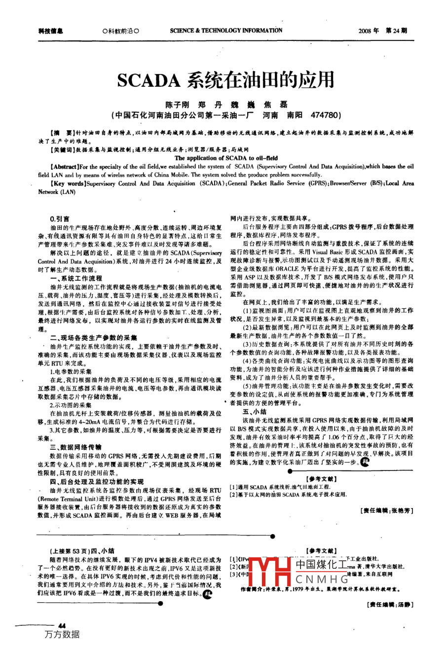科技信息科救前沿SCIENCE TECHNOLOGY INFORMATION2008年第24期SCADA系統(tǒng)在油田的應(yīng)用陳子剛鄭丹魏巍焦磊(中國(guó)石化河南油田分公司第一采油一廠河南南陽(yáng)474780)【擴(kuò)要】針對(duì)油田自身的特點(diǎn),以油田內(nèi)部局域網(wǎng)為基礎(chǔ),借助移動(dòng)的無(wú)線通訊網(wǎng)絡(luò),建立起油井的數(shù)據(jù)采集與監(jiān)測(cè)控制系,成功地解決了生產(chǎn)中的難題【關(guān)鍵詞】數(shù)據(jù)采集與監(jiān)視控制;通用分組無(wú)線業(yè)務(wù);瀏覽器/服務(wù)器;局域網(wǎng)The application of SCADA to oil-fieldAbstract] For the specialty of the oil field, we established the system of SCADA (Supervisory Control And Data Acquisition), which bases the oilfield LAN and by mereiss network of China Mobile. The system solved the produce problem successfully[ Key words ]Supervisory Control And Data Aequisition (SCADA); General Packet Radio Service (GPRS): Browser/Server(B/S): Local Area0引盲網(wǎng)內(nèi)進(jìn)行發(fā)布,實(shí)現(xiàn)數(shù)據(jù)共享。油田的生產(chǎn)現(xiàn)場(chǎng)存在地處野外、高度分散、連續(xù)運(yùn)轉(zhuǎn)、周邊環(huán)境復(fù)后臺(tái)服務(wù)程序主要由四部分組成:GPRS撥號(hào)程序后臺(tái)數(shù)據(jù)處理雜有線通訊資源有限等具有油田自身特色的顯著特點(diǎn),這給口常生程序數(shù)據(jù)庫(kù)程序網(wǎng)絡(luò)發(fā)布程序產(chǎn)管理帶來(lái)生產(chǎn)參數(shù)采集難、突發(fā)事件難以及時(shí)發(fā)現(xiàn)等諸多難題。后臺(tái)程序采用網(wǎng)絡(luò)斷線自動(dòng)監(jiān)測(cè)與重?fù)芗夹g(shù),保證了系統(tǒng)的連續(xù)解決以上問(wèn)題的途徑,就是建立抽油井的 SCADA (Supervisory運(yùn)行的穩(wěn)定性和可靠性。采用 Visual Basi形成 SCADA監(jiān)控畫(huà)面實(shí)Control And Data Acquisition)系統(tǒng),對(duì)油井進(jìn)行24小時(shí)連續(xù)監(jiān)控,及現(xiàn)故障診斷與報(bào)警,示功圖測(cè)試以及手動(dòng)遙測(cè)現(xiàn)場(chǎng)油井?dāng)?shù)據(jù)。采用大時(shí)了解生產(chǎn)動(dòng)態(tài)數(shù)據(jù)型企業(yè)級(jí)數(shù)據(jù)庫(kù) ORACLE為平臺(tái)進(jìn)行開(kāi)發(fā),提高了監(jiān)控系統(tǒng)的性能。、系統(tǒng)工作流程采用ASP以及數(shù)據(jù)庫(kù)技術(shù),開(kāi)發(fā)了BNS模式網(wǎng)絡(luò)發(fā)布系統(tǒng),使用戶只油井無(wú)線監(jiān)測(cè)的工作流程就是將現(xiàn)場(chǎng)生產(chǎn)數(shù)據(jù)(抽油機(jī)的電流電需借助瀏覽器,通過(guò)網(wǎng)頁(yè)即可快速、便捷地對(duì)油井的的生產(chǎn)狀況進(jìn)行壓、載荷、油井的壓力溫度套壓等)進(jìn)行采集,經(jīng)處理及模數(shù)轉(zhuǎn)換后,監(jiān)控發(fā)送到通訊網(wǎng)絡(luò),然后在監(jiān)控中心通過(guò)接收裝置對(duì)信號(hào)進(jìn)行接受處在網(wǎng)頁(yè)上,我們給出了豐富的功能,以滿足生產(chǎn)需求理,根據(jù)生產(chǎn)需要,由后臺(tái)監(jiān)控系統(tǒng)對(duì)各種信號(hào)參數(shù)加T、處理、分析(1)監(jiān)視圖畫(huà)面:用戶可以在監(jiān)視圖上直觀地觀察到油井的工作最終進(jìn)行網(wǎng)絡(luò)發(fā)布,以實(shí)現(xiàn)對(duì)油井各運(yùn)行參數(shù)的實(shí)時(shí)在線監(jiān)測(cè)及管狀況是否發(fā)生異常以及監(jiān)視到最基本的生產(chǎn)參數(shù)(2)最新數(shù)據(jù)測(cè)覽:用戶可以在此網(wǎng)頁(yè)上及時(shí)監(jiān)測(cè)到油井的全部二、現(xiàn)場(chǎng)各類生產(chǎn)參數(shù)的采集最新生產(chǎn)數(shù)據(jù),油井生產(chǎn)的各個(gè)參數(shù)數(shù)值一日了然油井生產(chǎn)監(jiān)控系統(tǒng)功能的實(shí)現(xiàn),主要依賴于油井生產(chǎn)參數(shù)及時(shí)(3)歷史數(shù)據(jù)查詢:本系統(tǒng)提供了對(duì)所有油井不同歷史時(shí)刻的各準(zhǔn)確的采集而該功能主要由現(xiàn)場(chǎng)數(shù)據(jù)采集儀器儀表以及現(xiàn)場(chǎng)監(jiān)控個(gè)參數(shù)數(shù)值的查詢功能各種故障報(bào)警功能,以及各類報(bào)表功能單元RTU來(lái)完成(4)各類曲線☆詢功能:實(shí)現(xiàn)電流曲線以及示功圖等的圖形查詢電參數(shù)的采集功能,為油井的智能分析及應(yīng)該進(jìn)行何種作業(yè)措施提供了詳細(xì)的基礎(chǔ)在此,我們根據(jù)油井的負(fù)荷及不同的電壓等級(jí),采用相應(yīng)的電流資料,成為了油井分析人員的重要幫手互感器、電壓互感器采集油井的電流電壓等電參數(shù),再由通訊模塊讀(5)油井管理功能:該功能主要是在油井參數(shù)發(fā)生變化時(shí),需要改取數(shù)據(jù)采集芯片中存儲(chǔ)的數(shù)變參數(shù)的設(shè)定值,從而使系統(tǒng)的報(bào)警功能更加準(zhǔn)確,專門(mén)為系統(tǒng)管理2示功圖的采集者提供的方便的管理平臺(tái)。在抽油機(jī)光桿上安裝載荷位移傳感器,測(cè)量抽油機(jī)的載荷及位五、小結(jié)生成標(biāo)準(zhǔn)的4-20mA電流信號(hào),并整合為代碼進(jìn)行存儲(chǔ)該油井無(wú)線監(jiān)測(cè)系統(tǒng)采用GPRs網(wǎng)絡(luò)實(shí)現(xiàn)數(shù)據(jù)傳輸,利用局域網(wǎng)3其它參數(shù),如油井的溫度、壓力等,可根據(jù)需要決定是否要進(jìn)行以BS模式實(shí)現(xiàn)數(shù)據(jù)共享,在投入使用以來(lái),由于抽油機(jī)故障的及時(shí)發(fā)現(xi