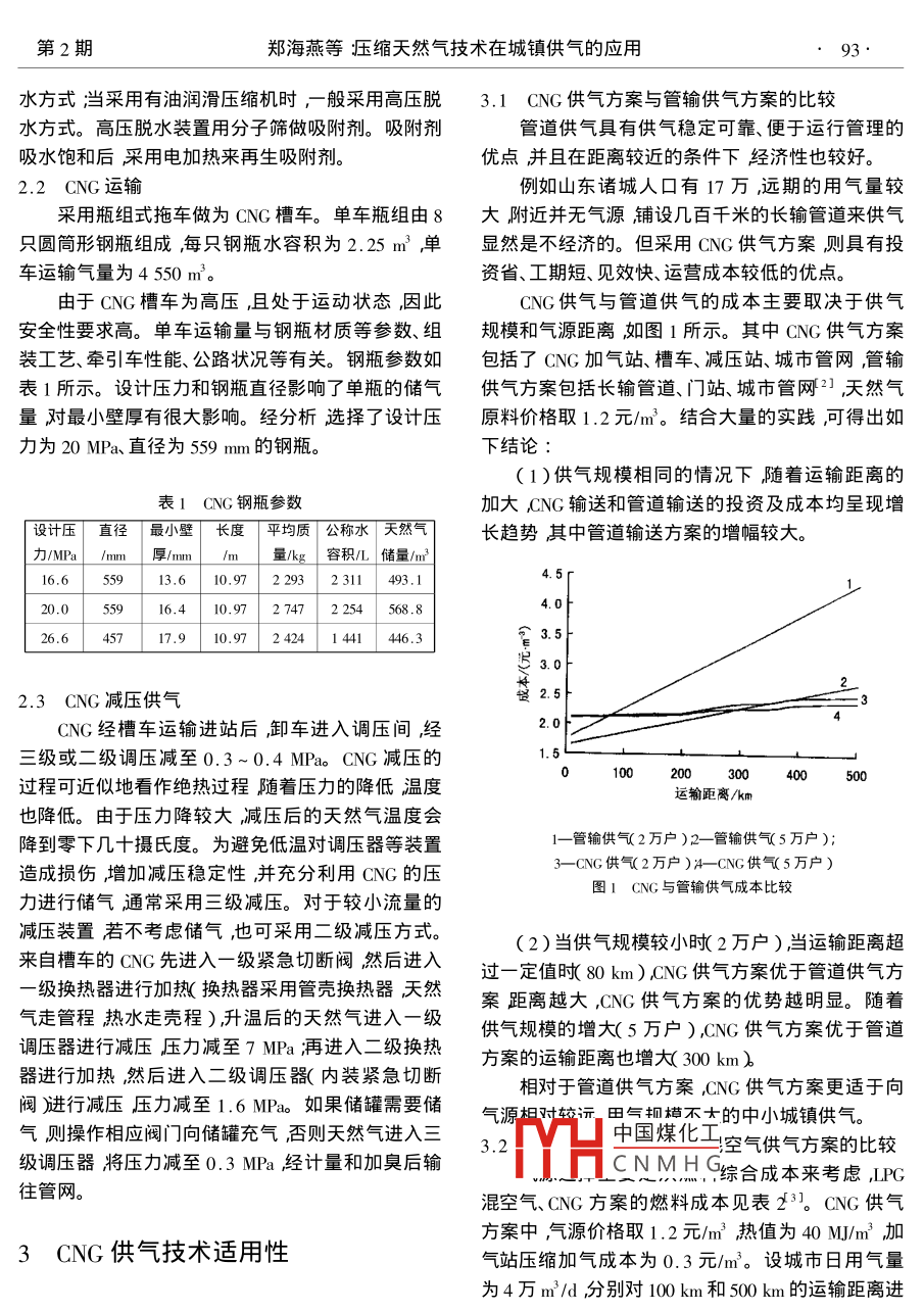 第23卷第2期煤氣與熱力Vol. 23 No. 22003年2月Gas heatFeb.2003文章編號:000-4416(20032-0092-03壓縮天然氣技術(shù)在城鎮(zhèn)供氣的應(yīng)用鄭海燕付吉國楊俊杰新奧集團(tuán)股份有限公司河北廊坊065000摘要介紹了城鎮(zhèn)壓縮天然氣CNG舶生產(chǎn)、運(yùn)輸和減壓等技術(shù)結(jié)合實(shí)踐分析了城鎮(zhèn)CNG供氣技術(shù)的適用性關(guān)鍵詞壓縮天然氣液化石油氣混空氣液化天然氣中圖分類號TU996文獻(xiàn)標(biāo)識碼BApplication of CNG Technology in City Gas SupplyZHENG Hai-yan FU Ji-guo, YANG Jun-jie(Xin'ao Group Co., Ltd. Langfang 065000, ChinaAbstract CNG technology in city gas supply includes 3 parts: the production transportation and decompreson. On the base of practice, CNG technology in city gas supply is introduced synthetically and its applicaKey words: compressed natural gas LPG-air mixture i liquefied natural gas2.1CNG生產(chǎn)CNG加氣站主要生產(chǎn)工藝系統(tǒng)由過濾、計量、天然氣是我國大力發(fā)展的城市氣源。由于受氣壓縮、脫水、儲存等組成。源和地理?xiàng)l件的限制,距離氣源或輸氣干線較遠(yuǎn)而(1)天然氣壓縮用氣量不大的中小城市因鋪設(shè)長輸管道投資較大,壓縮工藝是CNG生產(chǎn)技術(shù)的核心。氣源的壓無法采用管輸供氣因此采用了非管輸供氣做為過力一般較低需要經(jīng)壓縮機(jī)壓縮至20Ma。采用了渡氣源或永久氣源。綜合起來,我國采用的非管輸水冷活塞式壓縮機(jī)四級壓縮流程。供氣技術(shù)主要有壓縮天然氣(CNG)供氣技術(shù)、LPG(2)天然氣脫水混空氣供氣技術(shù)及液化天然氣(LNG)供氣技術(shù)3天然氣在高壓狀態(tài)下容易析出水分和形成水化種。CNG供氣技術(shù)在一定條件下有著明顯的優(yōu)越物。水和二氧化碳、硫化氫結(jié)合會對鋼質(zhì)容器和管性。新奧集團(tuán)股份有限公司已將該技術(shù)應(yīng)用于城鎮(zhèn)道造成腐蝕冰化物在聚集狀態(tài)下類似冰或致密的供氣,下面綜合介紹城鎮(zhèn)CNG供氣技術(shù)并對其適雪縮小管道流通截面堵塞管路、閥件和設(shè)備。因用性進(jìn)行分析。此的中國煤化龍其是運(yùn)輸用高壓鋼瓶女低于7.8mg/mo2城鎮(zhèn)CNG供氣技術(shù)帛沉小月高壓脫水和低壓脫水兩種1。當(dāng)采用無油潤滑式壓縮機(jī)時應(yīng)采用低壓脫*收稿日期2001-11-10作者簡介鄭海燕196—-)男河北廊坊人工程師頑士生從事燃?xì)饧夹g(shù)管理工作。第2期鄭海燕等壓縮天然氣技術(shù)在城鎮(zhèn)供氣的應(yīng)用93水方式當(dāng)采用有油潤滑壓縮機(jī)時,般采用高壓脫3.1CNG供氣方案與管輸供氣方案的比較水方式。高壓脫水裝置用分子篩做吸附劑。吸附劑管道供氣具有供氣穩(wěn)定可靠、便于運(yùn)行管理的吸水飽和后采用電加熱來再生吸附劑優(yōu)點(diǎn)并且在距離較近的條件下經(jīng)濟(jì)性也較好2.2CNG運(yùn)輸例如山東諸城人口有17萬遠(yuǎn)期的用氣量較采用瓶組式拖車做為CNG槽車。單車瓶組由8大附近并無氣源鋪設(shè)幾百千米的長輸管道來供氣只圓筒形鋼瓶組成每只鋼瓶水容積為2.25m3單顯然是不經(jīng)濟(jì)的。但采用CNG供氣方案則具有投車運(yùn)輸氣量為4550m。資省、工期短、見效快、運(yùn)營成本較低的優(yōu)點(diǎn)。由于CNG槽車為高壓,且處于運(yùn)動狀態(tài)因此CNG供氣與管道供氣的成本主要取決于供氣安全性要求高。單車運(yùn)輸量與鋼瓶材質(zhì)等參數(shù)、組規(guī)模和氣源距離如圖1所示。其中CNG供氣方案裝工藝、牽引車性能、公路狀況等有關(guān)。鋼瓶參數(shù)如包括了CNG加氣站、槽車、減壓站、城市管網(wǎng),管輸表1所示。設(shè)計壓力和鋼瓶直徑影響了單瓶的儲氣供氣方案包括長輸管道、門站、城市管網(wǎng)2,天然氣量對最小壁厚有很大影響。經(jīng)分析選擇了設(shè)計壓原料價格取1.2元/m。結(jié)合大量的實(shí)踐可得岀如力為20MPa直徑為559mm的鋼瓶。下結(jié)論:1)供氣規(guī)模相同的情況下隨著運(yùn)輸距離的表1CNG鋼瓶參數(shù)加大CNG輸送和管道輸送的投資及成本均呈現(xiàn)增計壓直徑最小壁長度平均質(zhì)公稱水天然氣長趨勢其中管道輸送方案的增幅較大力MP/m厚/m/m量/kg容積儲量m16,613.610.9722932311493.120.055916.410.9727472254568,826645717.910.97242414146.33.52.3CNG減壓供氣CNG經(jīng)槽車運(yùn)輸進(jìn)站后卸車進(jìn)入調(diào)壓間經(jīng)級或二級調(diào)壓減至0.3~0.4 MPa. cng減壓的100200過程可近似地看作絕熱過程隨著壓力的降低溫度300運(yùn)輸距離/km也降低。由于壓力降較大減壓后的天然氣溫度會降到零下幾十?dāng)z氏度。為避免低溫對調(diào)壓器等裝置1—管輸供氣2萬戶)2—管輸供氣5萬戶)造成損傷增加減壓穩(wěn)定性并充分利用CNG的壓3CNG供氣2萬戶)斗CNG供氣5萬戶)圖1CNG與管輸供氣成本比較力進(jìn)行儲氣通常采用三級減壓。對于較小流量的減壓裝置若不考慮儲氣也可采用二級減壓方式。來自槽車的CNG先進(jìn)入一級緊急切斷閥然后進(jìn)入(2)當(dāng)供氣規(guī)模較小時2萬戶)當(dāng)運(yùn)輸距離超過一定值時80km)CNG供氣方案優(yōu)于管道供氣方級換熱器進(jìn)行加熱換熱器采用管殼換熱器天然案距離越大,CNG供氣方案的優(yōu)勢越明顯。隨著氣走管程熱水走殼程)升溫后的天然氣進(jìn)入一級供氣規(guī)模的增大(5萬戶),CNG供氣方案優(yōu)于管道調(diào)壓器進(jìn)行減壓壓力減至7