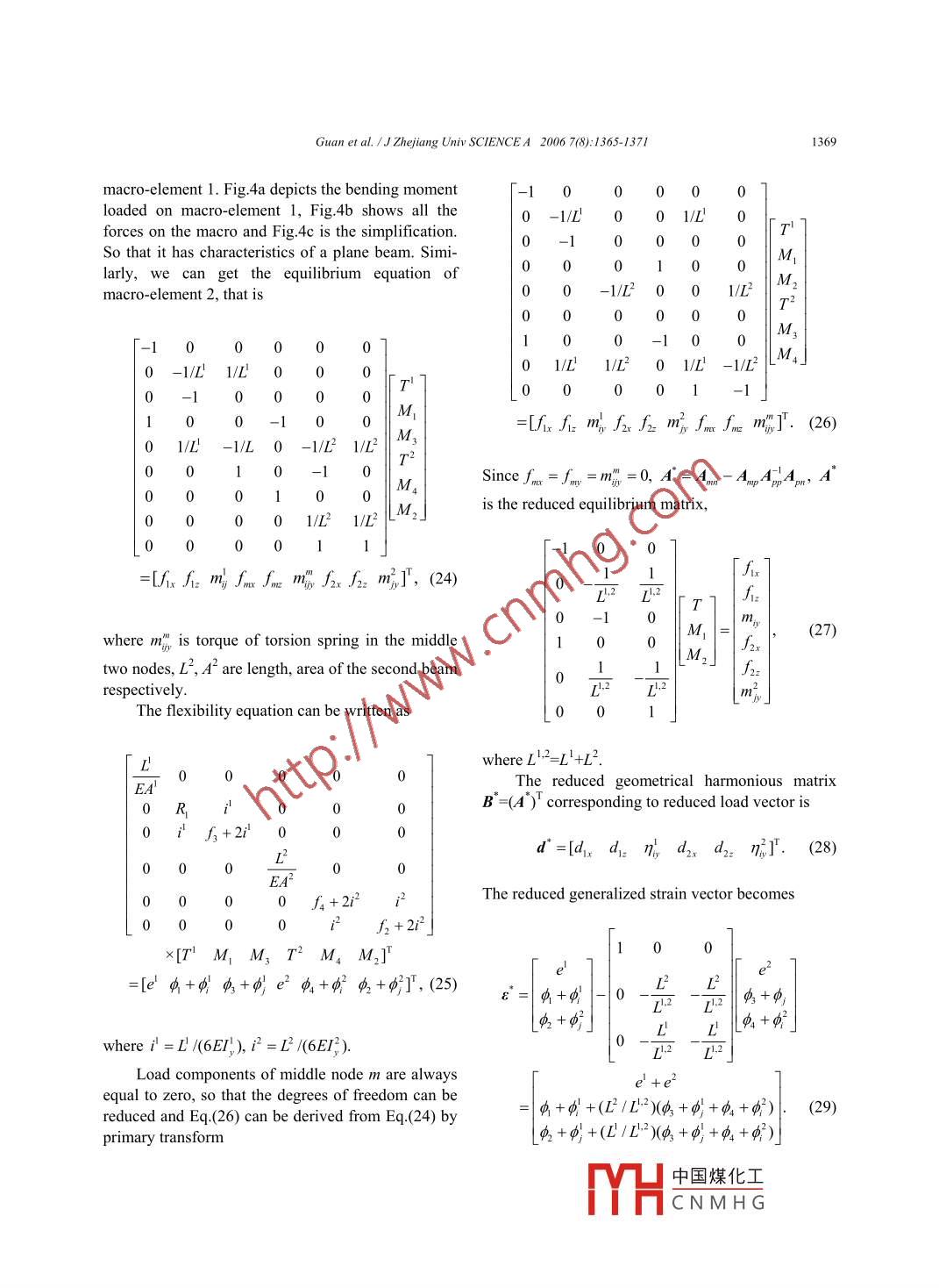 Guan et al.1J Zhejiang Univ SCIENCEA 2006 7(8):1365-13711365Jourmal of Zhejiang University SCIENCE AISSN 1009-3095 (Print); ISSN 1862-1775 (Online)www.zju.edu.cn/jzus; www.springerlink.comJzuSE-mail: jzus@zju.edu.cnStatic analysis of synchronism deployable antennaGUAN Fu-ling"', SHOU Jian-jun', HOU Guo-yong', ZHANG Jing-jie('Department of Civil Engering, Zhejiang Universiy, Hangzhou 310027, China)(Chongqing Research Institute of Building Science, Chongqing 400015, China)'E-mail: ciegfl@zju.edu.cnReceived Mar.17, 2006; revision accepted Apr. 23, 2006Abstract: A 3D synchronism deployable antenna was designed, analyzed, and manufactured by our research group. This an-tenna consists of tetrahedral elements from central element. Because there are springs at the ends of some of the rods, spider jointsare applied. For analysis purpose, the structure is simplified and modelled by using 2D beam elements that have no bendingstifness. Displacement vectors are defined to include two translational displacements and one torsional displacement. The stiff-ness matrix derived by this method is relatively simple and well defined. The analysis results generated by using software de-veloped by our research group agreed very well with available test data.Key words: Space deployable structures, Analysis design, Reflector antennadoi: 10.1631jzus.2006.A1365CLC number: V414.2INTRODUCTION .values using both finite difference and finite elementtechniques. Armero and Ehrlich (2006) proposedLarge antennas for space applications have some some new finite elements for thin Euler-Bernoullidifferences as compared to their counterparts de- beams that incorporate the softening hinges to de-signed and manufactured for ground usage. For a scribe the beam's deformation. Yau (2006) suggestedlarger space antenna, the applied loads in space canbe a finite element model for buckling analysis of ta-several orders of magnitude less than the gravity pered I-beams subjected to torsional moments. Maloading it is subjected to when being fabricated and (2006) analyzed the ideal displacement amplificationassembled on the ground. Since the effect of gravity ratio of a bridge-type flexure hinge based on the ki-cannot be removed from any experimental verifica- nematic theory.tion performed on the ground, we must rely on the useTwo types of special beam elements developedof efficient and highly accurate analysis methods for specifically for modelling and analyzing largedesigning and verifying large space antennas. Tibert 3D-synchronism deployable space antennas will be(2002) provided the state-of-the-art of deployable studied in this paper. The first type is a one-beamantenna. And many researches have been trying to element with torsion springs formed by two elementsanalyze the beam with torsion moments.of the first type that are linked by a pin joint. As someNa and Kim (2006) analyzed the deployment of loads are always zero, the stiffness matrices can bea multi-link flexible structure with the Timoshenko simplified and used to perform static and dynamicbeam theory and determined the equations of motion analyses of the antenna.using Hamilton's principle. Serna et al.(2006) pre-sented a set of equivalent uniform moment factorREDUCTION FORMULATIONProject (No. 863-2-4) supported by the National Basic ResearchFig.1 show中國(guó)煤化工。e analyzed.Program (863) of ChinaYHCNM HG.1366Guan et al. IJ Zhejiang Univ SCIENCE A 2006 7(8):1365-1371[In+ptp{}n+) = {}(+p),(3)If the number of zero load is p, i.e., l,=0, thesystem of equilibrium Eq.(1) can be split into thefollowing two coupled systems of m and p linearequations, respectivelyA.σ。+A.σp=lm,(4.1)A.σ+A.σ,=0.(4.2)a)If App is not singular, system Eq.(4.2) can be solvedfor σp, in terms of σnσ,=-ApAmσ。(5)Subtituting Eq.(5) into Eq.(4.1) yields .(Am-A.AbpA.m)σ,=Iw(6)b)Fig.1 Antenna structure model. (a) Stowed state;That is(b) Deployable stateA°o*=l',(7)This is a beam-and-truss structure (Yue et al., 2001; whereZhao and Guan, 2005). The equilibrium equation of(8)this structure can be derived in terms of generalizedstresses in a Cartesian coordinate system. Formula-So that we can obtain (Zhang, 2001)tions are rewritten as follows (Pellegrino and Cal-ladine, 1986; Zhang, 2001):(Am -AMATA)d. =8,-AAPTe。(9)[I0+pxp}m+t) = {)m+p,(1)This is a new system of compatibility equations, withwhere A is flexibility rectangular matrix, σ is gener- an nxm coefficient matrix. The internal work isalized stress, l is generalized loads. The equilibriumequation can also be expressed in terms of generalizedσ ε=σ%e, +σjep.(10)displacements[AT ]m+p)iqm8o8u8qmop) = E}a+p),)(2)The reduced flexibility matrix iswhere AT is gomeric compatibilit (m+p)(n+p) F"=Fm - rmAGAm -AAFm+AHATpACHAmmatrix, d is displacement of node (m+p), ε is gener-(11)alized strain. This equation is valid only for smalldeformation.The reduced sifness matrix isFor a linear-elastic material, the generalizedstresses σ are related to the generalized strains ε byK'=(F*)-'=Fml-AApFmpthe matrix of member F, or just flexibility matrix by中國(guó)煤化工(12)the relationshipYHCNMHG.Guan et al.1J Zhejiang Univ SCIENCEA 2006 7(8):1365-13711367MATRIX OF FIRST TYPE OF MACRO-ELEMENTwhere M;, M} are torsion moments of the spring, mi,Fig.2 shows a one-beam element that has torsionmi2, mjl, m;2 are generalized stresses loaded at the endsspring. joints at each end. The torsion spring joints canof torsion spring, T is axile force, L is length of thebe connected to other elements or spider frictionlessbeam, superscript 1 represents the number of macro-pins. A torsion spring joint transmits the force com-element. At the nodes in Fig.3c, force equilibrium andponent and bending moment. When the joint revolvesdisplacement compatibility must be maintained. Theequilibrium equation is(turns), it also transmits shear force.The beam is a 3D structure of a plane beam.0]nn0fix0 0 -1/L 1/LrlfFig.2 First type of macro-element-1Mm,2 + myEquilibrium matrixM,fx
