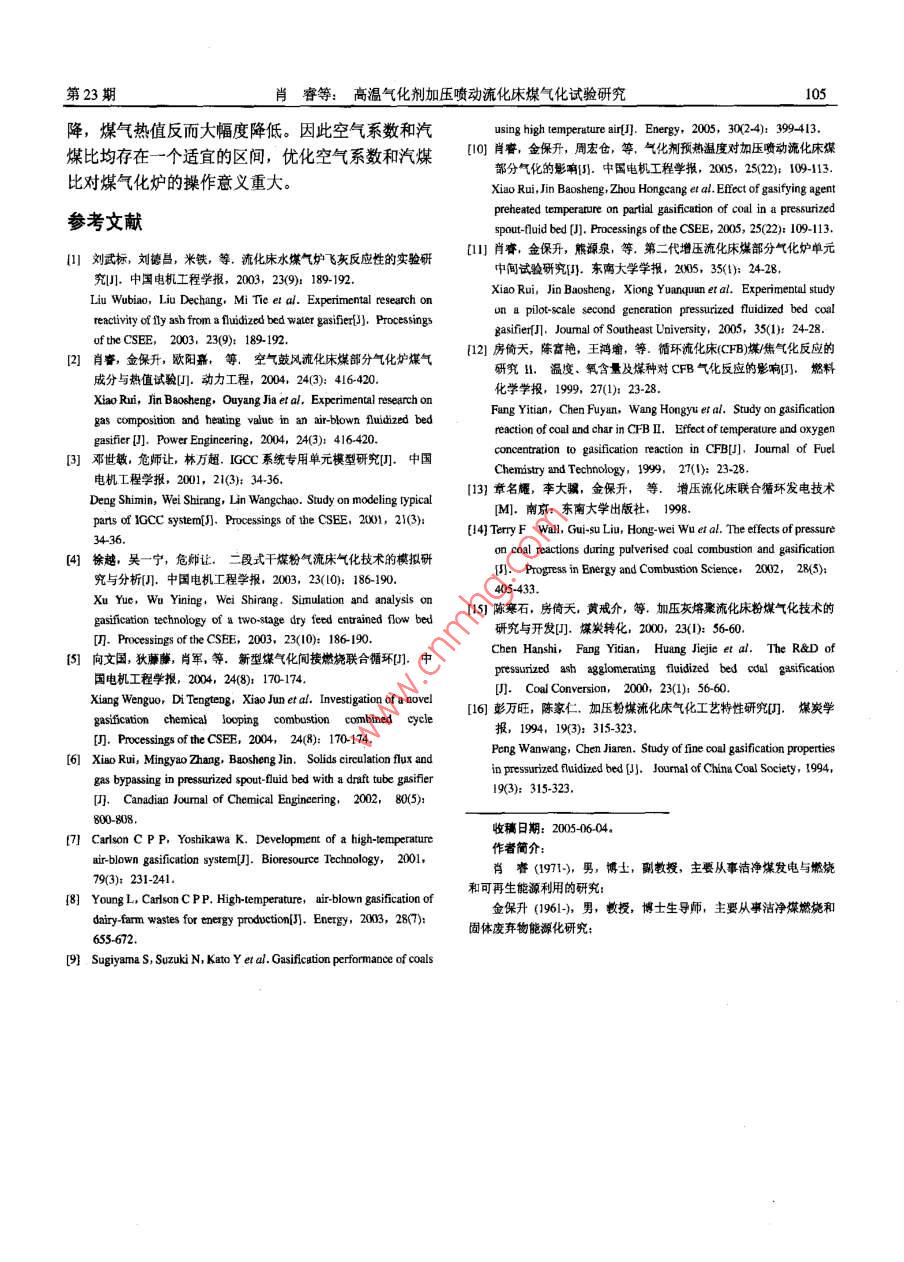 第25卷第23期中國(guó)電機(jī)工程學(xué)報(bào)Vol.25 No.23 Dec.20052005年12月Proceedings of the CSEE62005 Chin.Soc.for Ele Eng文章編號(hào): 0258-8013 (2005) 23-0100-06中團(tuán)分類號(hào): TK224文獻(xiàn)標(biāo)識(shí)碼: A學(xué)科分類號(hào): 470.20高溫氣化劑加壓噴動(dòng)流化床煤氣化試驗(yàn)研究肖睿,金保升,周宏倉(cāng),黃亞繼,仲兆平,章名耀(東南大學(xué)潔凈煤燃燒與發(fā)電技術(shù)教育部重點(diǎn)實(shí)驗(yàn)室,江蘇省南京市210096)COAL GASIFICATION USING HIGH TEMPERATURE PREHEATED GASIFYINGAGENT IN A PRESSURIZED SPOUT-FLUD BEDXIAO Rui, JIN Bao-sheng, ZHOU Hong-cang, HUANG Yaji, ZHONG Zhao-ping, ZHANG Ming-yao(Education Ministry Key Laboratory on Clean Coal Power Generation and Combustion Technology, SoutheastUniversity, Nanjing 210096, Jiangsu Province, China)ABSTRACT: High temperature gasifying agent gasification of1引言coal was performned in a 0.1MW thermal input pressurized煤氣化技術(shù)是未來(lái)潔凈煤發(fā)電技術(shù)的基礎(chǔ),如spout-fluid. Effects of gasification temperature, pressure,equilibrium ratio, and the ratio of steam to coal on coal整體煤氣化聯(lián)合循環(huán),第二代增壓流化床聯(lián)合循環(huán),gasification behaviors were studied. The experimental results整體煤氣化一燃料電池和以煤 氣化為核心的多聯(lián)indicated that gasification temperature was the most important產(chǎn)系統(tǒng)等等,國(guó)內(nèi)外研究者對(duì)此進(jìn)行大量的研究工factor influenced coal gasification in the spout-0luid bed gasifier.作"+6。依據(jù)煤的不同組分和不同轉(zhuǎn)化階段的反應(yīng)特The gasification performance was improved at elevated性不同的特點(diǎn),采用溫和的部分氣化方式將煤中高pressure due to the better fluidization in the reactor. The effects活性的部分轉(zhuǎn)化成煤氣,殘余的低活性半焦通過(guò)燃o(jì)f equilibrium ratio, and the ratio of steam to coal on coal燒方式加以利用,從而在總體投資和運(yùn)行成本降低gasification were realized by changing the reaction temperalure,and the two parameters had an optimum operating range for a的前提下,達(dá)到提高系統(tǒng)碳利用率目的,第二代增壓流化床聯(lián)合循環(huán)發(fā)電技術(shù)正是基于此。提高氣化certain coal gasification process.劑預(yù)熱溫度,可大幅度提高煤氣熱值,提高燃?xì)馔窴EY WORDS: Thermal power engineering; High temperature平入口溫度和燃燒穩(wěn)定性。隨著緊湊蜂窩式陶瓷蓄gasifying agent; Coal gasification; Spout-fluid bed; Process熱體高溫空氣預(yù)熱器等新工藝的開(kāi)發(fā)成功,最近出parameters; Pressure現(xiàn)了應(yīng)用該加熱器產(chǎn)生的高溫空氣在卵石氣流床反摘要:在熱輸入0.1MW的小型加壓噴動(dòng)流化床試驗(yàn)裝置上應(yīng)器內(nèi)對(duì)生物質(zhì)7、動(dòng)物排泄物8)和煤氣化的研究進(jìn)行了高溫氣化劑煤氣化特性的試驗(yàn)研究,考察了氣化溫報(bào)導(dǎo)。噴動(dòng)流化床氣化爐由于存在中心高速射流,度、壓力、空氣系數(shù)和汽煤質(zhì)量比等工藝參數(shù)對(duì)高溫空氣1特別適合處理強(qiáng)粘結(jié)性煤,此外,該反應(yīng)器對(duì)煤中蒸汽作為氣化介質(zhì)的煤氣化行為的影響。試驗(yàn)結(jié)果表明,在灰含量不敏感,爐溫又適宜脫硫劑進(jìn)行爐內(nèi)脫硫,所研究的工藝參數(shù)中,氣化溫度對(duì)高溫空氣煤氣化特性影響因此是高灰、高硫的劣質(zhì)煤氣化較理想的反應(yīng)器,最為顯著。壓力對(duì)氣化性能的影響主要體現(xiàn)在改善流化床氣而這些煤在我國(guó)儲(chǔ)量豐富,與其它流化床氣化爐類化爐床內(nèi)流化質(zhì)量??諝庀禂?shù)及汽煤比的影響從本質(zhì)上看是似,噴動(dòng)流化床氣化爐碳轉(zhuǎn)化率較低,而采用部分通過(guò)改變氣化反應(yīng)溫度來(lái)實(shí)現(xiàn)的,對(duì)于-一個(gè)特定的流化床氣氣化-半焦燃燒的方式正好彌補(bǔ)該缺陷。此前我們研化工藝,空氣系數(shù)及汽煤比均存在一個(gè)適宜的操作區(qū)域。究了氣化劑預(yù)熱溫度對(duì)煤部分特性的影響,研究結(jié)關(guān)鍵詞:熱能動(dòng)力工程;高溫氣化劑;煤氣化;噴動(dòng)流化床;果表明,氣化劑預(yù)熱溫度從300"C提高到700C后,工藝參數(shù):加壓煤氣熱值提高幅度達(dá)23%10]。由于目前對(duì)高溫氣化基金項(xiàng)目:國(guó)家重點(diǎn)基礎(chǔ)研究發(fā)展規(guī)劃(2005CB221202)。劑煤氣化研究甚少,在高溫氣化劑條件下氣化工藝Project Subsidized by the Special Funds for Major State Basic Research參數(shù)(如氣化溫度、壓力、空氣系數(shù)及汽煤比等)匹Projcts of China (2005CB221202).第23期肖睿等:高溫氣化劑加壓噴動(dòng)流化床煤氣化試驗(yàn)研究101配與優(yōu)化尚不清楚,基于此,本研究采用700°C的生成,溫度較高時(shí)甲烷濃度下降主要是由于生成的高溫空氣/蒸汽作為氣化劑對(duì)煤流化床氣化工藝特甲烷在高溫下分解所致。氣化溫度較低時(shí),雖然對(duì)性進(jìn)行研究,旨在通過(guò)對(duì)高溫氣化劑下氣化工藝參甲烷的生成有利,但焦炭與氣化劑的氣化反應(yīng)變慢,數(shù)與煤氣化行為關(guān)系的研究,掌握該新工藝優(yōu)化運(yùn)尤其是焦炭與CO2發(fā)生的非均相反應(yīng)是強(qiáng)吸熱反行區(qū)間,為較大規(guī)模氣化裝置的設(shè)計(jì)與運(yùn)行提供指應(yīng),溫度愈高,愈利于反應(yīng)的進(jìn)行,此外,高溫也導(dǎo)。利于水煤氣反