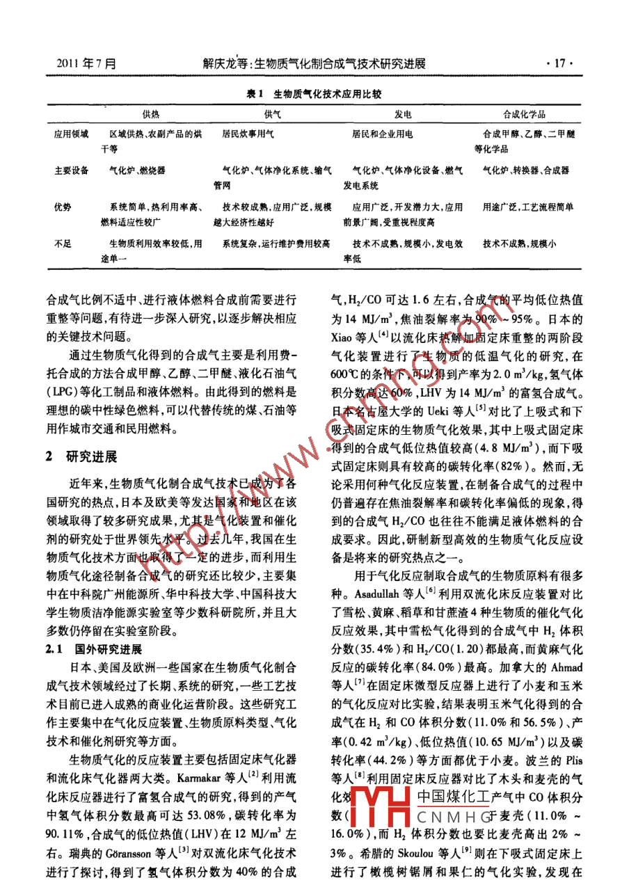 July 2011現(xiàn)代化工第31卷第7期16Modem Chemical Industry20l1年7月生物質(zhì)氣化制合成氣技術(shù)研究進展解慶龍',孔絲紡',劉陽生2,曾輝13(1.北京大學(xué)深圳研究生院,深圳市循環(huán)經(jīng)濟重點實驗室,廣東深圳5180552.北京大學(xué)環(huán)境科學(xué)與工程學(xué)院,北京100871;3.北京大學(xué)城市與環(huán)境學(xué)院,北京100871)摘要:介紹了生物質(zhì)氣化制合成氣技術(shù)的優(yōu)勢和主要用途著重論述了國內(nèi)外生物質(zhì)氣化制合成氣技術(shù)的研究進展,對存在的主要問題進行f分析和探討,并對該技術(shù)的前景進行了展望,指出新型氣化合成技術(shù)、高效氣化反應(yīng)器以及高效催化劑是今后研究的重點關(guān)鍵詞:生物質(zhì);氣化;合成氣中圖分類號:X382文獻標識碼:A文章編號:0253-4320(201)07-0016-05Recent advances in technologies of biomass gasification to produce syngasXIE Qing-Long, KONG Si-fang, LIU Yang-sheng, ZENG Hui(1. Shenzhen Key laboratory of Recycling Economy, School of Urban Planning and DesignBeijing University Shenzhen Graduate School, Shenzhen 518055, China; 2. College of EnvironmentalSciences and Engineering, Beijing University, Beijing 100871, China;3. College of Urban and Environmental Sciences, Beijing University, Beijing 100871, China)Abstract: The technology of syngas production through biomass gasification is a kind of clean energy transitiontechnology, in which the greenhouse effect caused by fossil fuels combustion can be reduced. In this paper, the advantagesnd main applications of the technology of biomass gasification to syngas are introduced. The research progress of thetechnology is emphasized. Moreover, the main problems of the technology of biomass gasification to syngas are analyzedand discussed. The prospect of this technology is also proposed. It is pointed out that the new technology, efficientsification reactors and excellent catalysts will be focused in the futureKey words: biomass; gasification; syngas生物質(zhì)能資源具有硫含量低、資源廣泛、可以永進展,分析和探討了目前該技術(shù)存在的主要問題,并久利用且不增加地表CO2循環(huán)總量等特點,日益受對其前景進行了展望到人們的廣泛關(guān)注和世界各國的高度重視。生物質(zhì)能量密度低,屬于低品位能源,其直接利用具有一定1比較優(yōu)勢和主要用途的局限性。生物質(zhì)氣化制備合成氣技術(shù)是將低品位生物質(zhì)氣化技術(shù)主要應(yīng)用于4個方面供熱供的固體生物質(zhì)原料轉(zhuǎn)化為高品位的潔凈氣體燃料的氣發(fā)電及合成化學(xué)品。各方面應(yīng)用的主要領(lǐng)域和熱處理手段,可以有效地減少溫室氣體排放問題是優(yōu)缺點比較如表1所示一種可持續(xù)的清潔的能源轉(zhuǎn)化技術(shù)。生物質(zhì)制合成從表1的比較可以看出,利用生物質(zhì)氣化進行氣技術(shù)作為一種能源開發(fā)的新技術(shù),至今已有了較供熱和供氣的技術(shù)比較成熟,是當前國內(nèi)很多城市快的發(fā)展,尤其是近年來國外很多研究人員在該領(lǐng)供暖、供熱的重要途徑,但是這2種方式對生物質(zhì)的域進行了不同技術(shù)的研究,并取得了一定的成果。利用效率都不高,是限制其進一步發(fā)展的主要因素但目前相關(guān)研究得到的產(chǎn)氣中HC比偏低以及焦利用生物質(zhì)氣化進行發(fā)電的技術(shù)雖然開發(fā)潛力很油含量較高是生物質(zhì)氣化制合成氣技術(shù)面臨的主要大,但是目前尚處于實驗室研究階段需要進一步研問題。過去幾年我國研究人員在生物質(zhì)氣化領(lǐng)域究,以實現(xiàn)其大規(guī)模的工業(yè)應(yīng)用。利用生物質(zhì)氣化開展了一系列的研究工作,主要集中于生物質(zhì)氣化制備合成氣,進而合成醇、醚和各種烴類燃料,是生制備燃料氣發(fā)電等領(lǐng)域而利用生物質(zhì)氣化途徑制物能源利用的新途徑,有利于緩解傳統(tǒng)化石能源危備合成氣的研究還很少。機,在這幾種氣化技術(shù)中具有更好的應(yīng)用前景。但本文討論了生物質(zhì)氣化制合成氣技術(shù)的優(yōu)勢,是這一技術(shù)路線還存在熱解焦油含量高制得的合重點介紹了國內(nèi)外生物質(zhì)氣化制合成氣技術(shù)的研究成收稿日期2011-03-10YHs中國煤化工及氣化效率較低、CNMHG基金項目:國家自然科學(xué)基金項月(21077002)作者簡介:解慶龍(1988-),男,碩士生;劉陽生(1968-)男博士教授博士生導(dǎo)師從事固體廢棄物資源化及生物質(zhì)能利用的研究通訊聯(lián)系人,010-62751756,yehliu@pku.edu.cn2011年7月解慶龍等:生物質(zhì)氣化制合成氣技術(shù)研究進展衰1生物質(zhì)氣化技術(shù)應(yīng)用比較合成化學(xué)品應(yīng)用領(lǐng)域區(qū)域供熱農(nóng)副產(chǎn)品的烘居民炊事用氣居民和企業(yè)用電合成甲醇、乙醇、二甲醚干等等化學(xué)品主要設(shè)備氣化爐燃燒器氣化爐、氣體凈化系統(tǒng)、輸氣氣化爐、氣體凈化設(shè)備、燃氣氣化爐、轉(zhuǎn)換器、合成器管網(wǎng)發(fā)電系統(tǒng)優(yōu)勢系統(tǒng)簡單,熱利用率高、技術(shù)較成熟應(yīng)用廣泛,規(guī)模應(yīng)用廣泛,開發(fā)潛力大,應(yīng)用用途廣泛,工藝流程簡單燃料適應(yīng)性較廣越大經(jīng)濟性越好前景廣闊受重視程度高不足生物質(zhì)利用效率較低,用系統(tǒng)復(fù)雜運行維護費用較高技術(shù)不成熟,規(guī)模小,發(fā)電效技術(shù)不成熟,規(guī)模小率低合成氣比例不適中