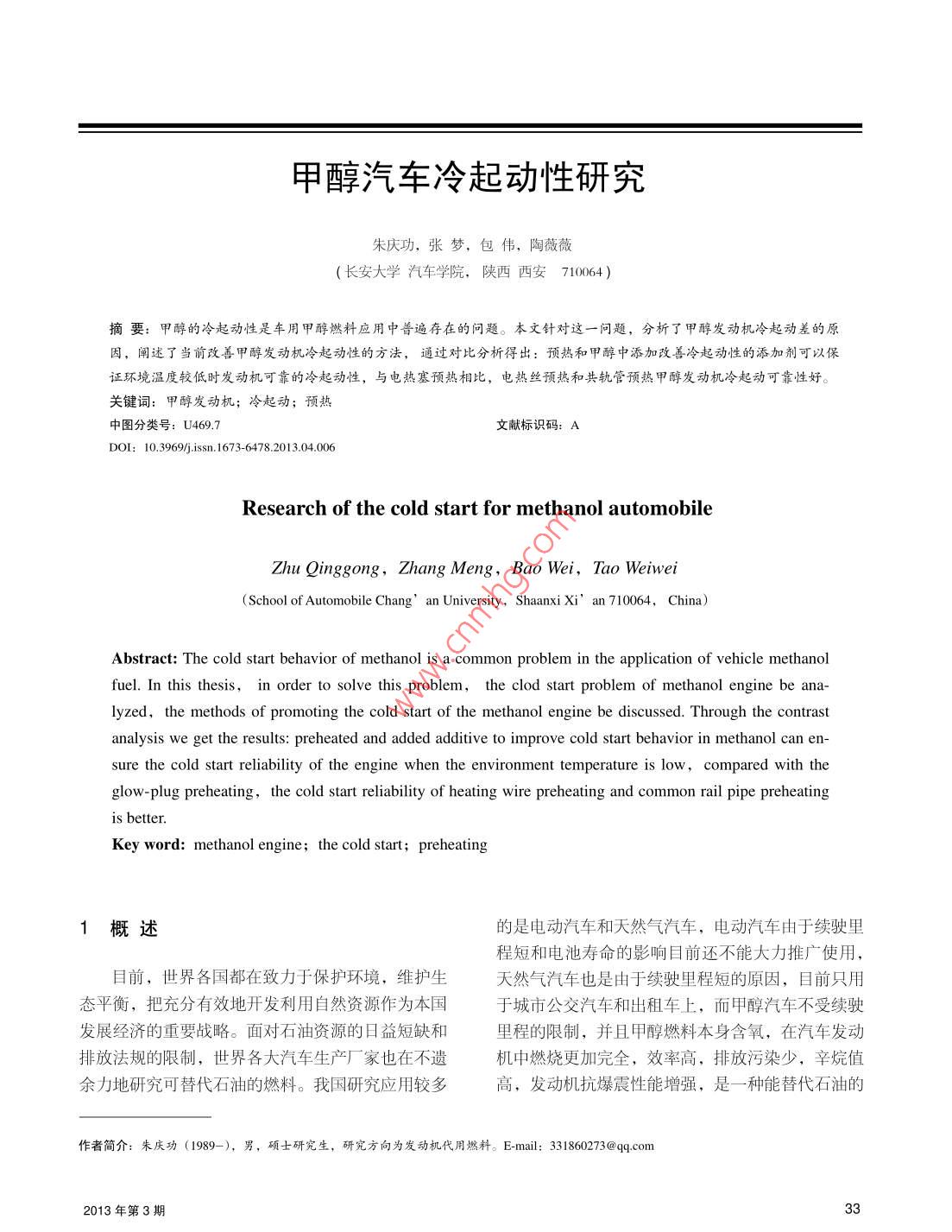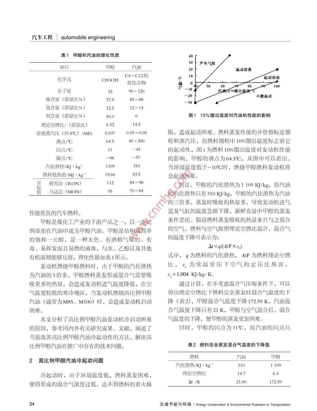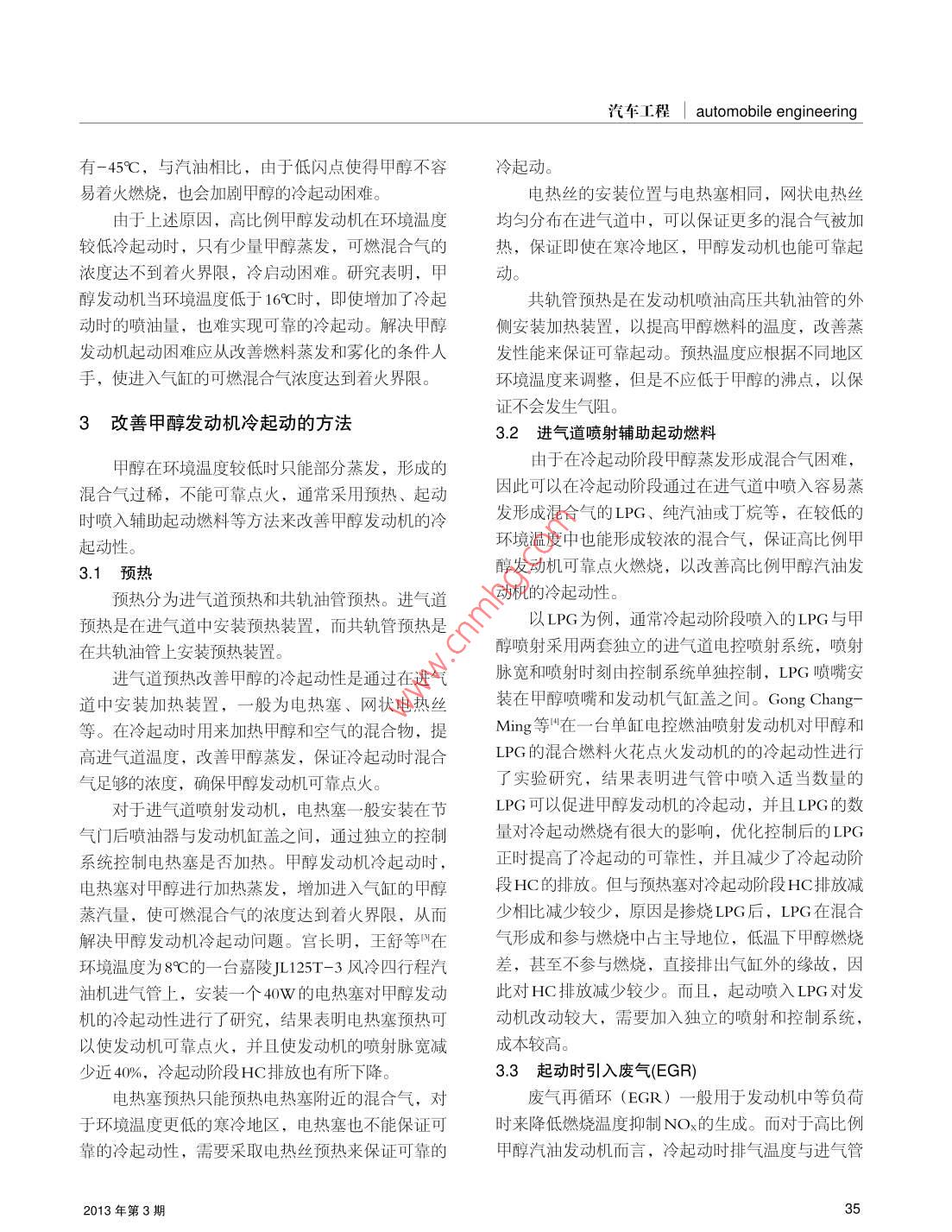 甲醇汽車?yán)淦饎有匝芯恐鞈c功,張夢,包偉,陶薇薇(長安大學(xué)汽車學(xué)院,陜西西安710064)摘要:甲醇的冷起動性是車用甲醇然料應(yīng)用中普遍存在的問題。本文針對這一問題,分析了甲醇發(fā)動機(jī)冷起動差的原因,闡述了當(dāng)前改善甲醇發(fā)動?xùn)i冷起動性的方法,通過對比分析得岀:預(yù)熱和甲醇中添加改善冷起動性的添加劑可以保證環(huán)境溫度較低時發(fā)動機(jī)可靠的冷起動性,與電熱塞預(yù)熱相比,電熱絲預(yù)熱和共軌管預(yù)熱甲酹發(fā)動?xùn)i冷起動可靠性好。關(guān)鍵詞:甲醇發(fā)動機(jī);冷起動;預(yù)熱中圖分類號:U469.7文獻(xiàn)標(biāo)識碼:ADOI:10.3969/isn.1673-6478201304.006Research of the cold start for methanol automobileZhu Qinggong, Zhang Meng, Bao Wei, Tao WeiweiSchool of Automobile Changan University, Shaanxi Xi'an 710064, China)Abstract: The cold start behavior of methanol is a common problem in the application of vehicle methanolfuel. In this thesis, in order to solve this problem, the clod start problem of methanol engine be analyzed, the methods of promoting the cold start of the methanol engine be discussed. Through the contrastanalysis we get the results: preheated and added additive to improve cold start behavior in methanol can ensure the cold start reliability of the engine when the environment temperature is low, compared with theglow-plug preheating, the cold start reliability of heating wire preheating and common rail pipe preheatingKey word: methanol engine; the cold start; preheating1概述的是電動汽車和天然氣汽車,電動汽車由于續(xù)駛里程短和電池壽命的影響目前還不能大力推廣使用目前,世界各國都在致力于保護(hù)環(huán)境,維護(hù)生天然氣汽車也是由于續(xù)駛里程短的原因,目前只用態(tài)平衡,把充分有效地開發(fā)利用自然資源作為本國于城市公交汽車和出租車上,而甲醇汽車不受續(xù)駛發(fā)展經(jīng)濟(jì)的重要戰(zhàn)略。面對石油資源的日益短缺和里程的限制,并且甲醇燃料本身含氧,在汽車發(fā)動排放法規(guī)的限制,世界各大汽車生產(chǎn)廠家也在不遺機(jī)中燃燒更加完全,效率高,排放污染少,辛烷值余力地硏究可替代石油的燃料。我國硏究應(yīng)用較多高,發(fā)動機(jī)抗爆震性能増強(qiáng),是一種能替代石油的作者簡介:朱慶功(1989-),男,碩士研究生,研究方向為發(fā)動機(jī)代用燃料。E-mail:331860273@ q9 con2013年第3期汽車工程| automobile engineering表1甲醇和汽油的理化性質(zhì)30產(chǎn)生項目甲醇汽油20起動容易化學(xué)式4~C12的10CH3OH起動困難烴化合物0分子量出溫度不能起動碳含量(質(zhì)量比%)氫含量(質(zhì)量比%)12.5氧含量(質(zhì)量比%)圖110%餾出溫度對汽油機(jī)性能的影響理論空燃比/(質(zhì)量比)14.9雷德蒸汽壓(37.8℃)/MPa限,造成起動困難。燃料蒸發(fā)性能的評價指標(biāo)是餾沸點/℃C64.5程和蒸汽壓,而燃料餾程中10%餾岀溫度標(biāo)志著它閃點/℃的起動性,圖1為燃料10%餾出溫度對發(fā)動機(jī)性能凝點/℃C的影響,甲醇的沸點為64.5℃,從圖中可以看出汽化潛熱/KJ當(dāng)環(huán)境溫度低于-10℃時,燃燒甲醇燃料發(fā)動機(jī)將燃料低熱值MJ·kg43.5會起動困難。研究法(RON)而且,甲醇的汽化潛熱為1109KJ/kg,而汽油值馬達(dá)法(MON)70~84的汽化潛熱只有310KJ/kg,甲醇的汽化潛熱為汽油的三倍多,蒸發(fā)時吸收的熱量多,導(dǎo)致發(fā)動機(jī)進(jìn)氣性能優(yōu)良的汽車燃料。道及氣缸的溫度急劇下降,新鮮充量中甲醇的蒸發(fā)甲醇是煤化工產(chǎn)業(yè)的下游產(chǎn)品之一,以一定比條件惡化。假設(shè)燃料蒸發(fā)吸收的熱量來自與之混合例添加在汽油中成為甲醇汽油。甲醇是結(jié)構(gòu)最簡單的空氣,燃料與空氣按照理論空燃比混合,混合氣的飽和一元醇,是一種無色、有酒精氣味的、有的溫度下降可表示為毒、易揮發(fā)而且易燃的液體,與水、乙醇以及其他q/(A/FX cp)有機(jī)溶劑能夠互溶,理化性能如表1所示。式中,q為燃料的汽化潛熱,A/F為燃料理論空燃發(fā)動機(jī)燃燒甲醇燃料時,由于甲醇的汽化潛熱比,c為常溫常壓下空氣的定壓比熱容為汽油的3倍多,甲醇燃料蒸發(fā)形成混合氣需要吸cn=1.004K/kg·K。收更多的熱量,會造成發(fā)動機(jī)進(jìn)氣溫度降低,在空通過計算,在不考慮混合氣壓縮條件下,可以氣溫度較低的寒冷地區(qū),當(dāng)發(fā)動?xùn)i燃燒髙比例甲醇得出理論空燃比下燃料完全蒸發(fā)時混合氣溫度的下汽油(通常為M85、M100)時,會造成發(fā)動機(jī)啟動降(表2),甲醇混合氣溫度下降172.59K,汽油混困難。合氣溫度下降只有21K,甲醇與空氣混合后,混合本文分析了高比例甲醇汽油發(fā)動機(jī)冷啟動困難氣溫度的下降,使甲醇的蒸發(fā)更加困難。的原因,參考國內(nèi)外有關(guān)研究成果、文獻(xiàn),闡述了同時,甲醇的閃點為11℃,而汽油的閃點只當(dāng)前改善高比例甲醇汽油冷起動性的方法,解決高比例甲醇汽油在推廣中存在的技術(shù)問題表2燃料完全蒸發(fā)混合氣溫度的下降值2高比例甲醇汽油冷起動問題燃然料汽油甲醇汽化潛熱/KJ·kg1109冷起動時,由于環(huán)境溫度低,燃料蒸發(fā)困難,理論空燃比使得形成的混合氣濃度過低,達(dá)不到燃料的著火極At/K21.00172.59交通節(jié)能與環(huán)保| Energy Conservation& Environmental Protection in Transportation汽車程| automobile engineering有-45℃,與汽油相比,由于低閃點使得甲醇不