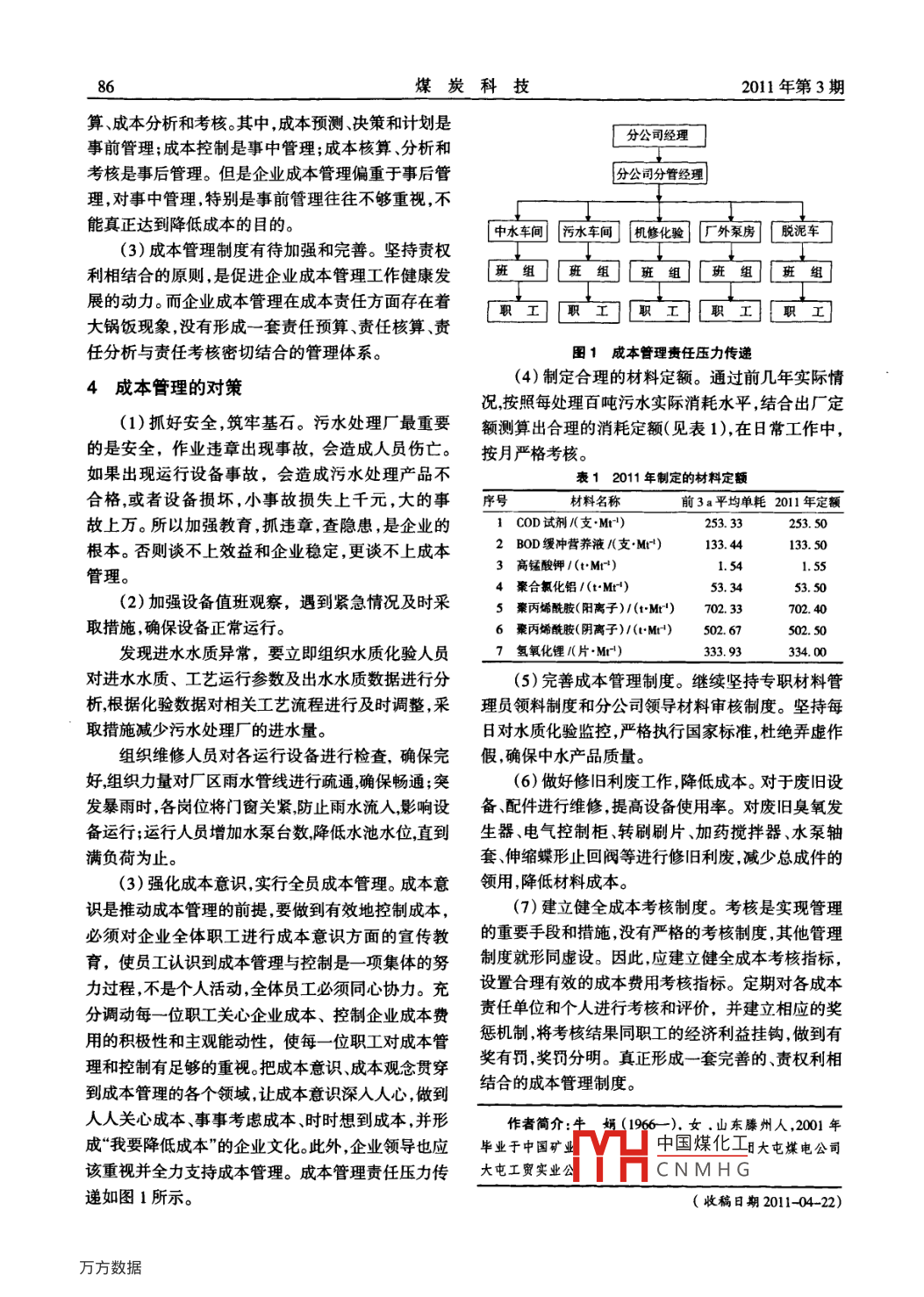 2011年第3期炭科技No.32011COAL SCIENCE & TECHNOLOGY MAGAZINE85文章編號(hào):1008- 3731(2011 )03-0085-02科學(xué)I好4管理污水處理成本管理與控制牛娟(中煤集團(tuán)大屯煤電公司大屯工貿(mào)實(shí)業(yè)公司,江蘇沛縣221611)摘要:加強(qiáng)成本管理控制具有非常 重要的作用。針對(duì)目前污水處理企業(yè)成本管理中存在的一些問(wèn)題,公司采取了一系列科學(xué)的管理措施,制定合理的材料成本,加強(qiáng)企業(yè)成本管理。關(guān)鍵詞:污水;成本;管理.中圖分類(lèi)號(hào):X703文獻(xiàn)標(biāo)志碼:B近年來(lái),污水處理生產(chǎn)成本隨著電費(fèi)、藥劑費(fèi)和計(jì)處理量為1萬(wàn)t/d,深度處理后的水質(zhì)達(dá)到《城員工工資不斷上漲,影響了企業(yè)的發(fā)展。深人分析污市污水再生利用工業(yè)用水水質(zhì)[GB1T 19923-水處理運(yùn)行成本的結(jié)構(gòu)和特點(diǎn),合理安排和控制各2005 ]》標(biāo)準(zhǔn)。中水深度工藝運(yùn)行以來(lái),氧化溝工藝項(xiàng)處理費(fèi)用成為當(dāng)務(wù)之急。本文針對(duì)污水處理企業(yè)處理后的出水90%左右進(jìn)入深度處理系統(tǒng),經(jīng)過(guò)深在成本管理工作中存在的主要問(wèn)題,根據(jù)污水處理度處理后供給矸石熱電廠作為冷卻循環(huán)水,其余供成本發(fā)生的特點(diǎn),提出了針對(duì)污水處理成本控制措給大屯選煤廠用于洗選,以及本公司污泥壓濾車(chē)間反沖洗用水和大屯公司垃圾處理站沖洗車(chē)用水,二級(jí)出水和中水全部回用。近年來(lái),污水年處理量超1成本管理的意義過(guò)300萬(wàn)t,中水年處理量超過(guò)290萬(wàn)to多年來(lái),公成本管理是企業(yè)生產(chǎn)經(jīng)營(yíng)過(guò)程中各項(xiàng)成本核司一直堅(jiān)持執(zhí)行國(guó)家有關(guān)標(biāo)準(zhǔn),堅(jiān)持以保護(hù)生態(tài)環(huán)算分析、決策和控制等一系列科學(xué)管理行為的總境、治污為本、循環(huán)再利用為原則,致力于礦區(qū)環(huán)境,稱(chēng)。作為企業(yè)管理的一一個(gè)重要組成部分,它在企業(yè)保護(hù)事業(yè),曾多次榮獲市級(jí)、縣級(jí)環(huán)境保護(hù)先進(jìn)單的經(jīng)濟(jì)活動(dòng)中具有非常重要的作用,是企業(yè)抵抗位榮譽(yù)稱(chēng)號(hào)。.內(nèi)外壓力,求得生存的主要保障,是企業(yè)增加利3存在的問(wèn)題潤(rùn)、提升競(jìng)爭(zhēng)能力的關(guān)鍵。因此,在當(dāng)前的經(jīng)濟(jì)環(huán)境下,必須進(jìn)行更科學(xué)、更嚴(yán)格和更精細(xì)的成本管目前企業(yè)對(duì)于成本的管理和控制比較薄弱,成本意識(shí)淡薄。成本管理觀念落后,管理內(nèi)容片面,手段比較單- ,造成材料成本增加,制約著企業(yè)的生存2企業(yè)現(xiàn)狀和發(fā)展。為此,加強(qiáng)企業(yè)成本管理就成為目前亟待解徐州大屯工貿(mào)實(shí)業(yè)公司沛縣水處理分公司承決的問(wèn)題。擔(dān)著大屯煤電公司中心區(qū)全部生活污水處理和少(1)成本管理意識(shí)淡薄。很多企業(yè)的職工對(duì)企量工業(yè)廢水處理的任務(wù),始建于20世紀(jì)80年代業(yè)成本管理存在認(rèn)識(shí)上的誤區(qū),認(rèn)為成本管理是財(cái)初,采用表面加速曝氣工藝,設(shè)計(jì)污水處理量1萬(wàn)務(wù)科和供應(yīng)科少數(shù)管理人員的事,成本控制是領(lǐng)導(dǎo)m'/d。90年代末進(jìn)行了改擴(kuò)建,擴(kuò)建工程為二級(jí)生的事。職工缺乏成本意識(shí)。降低成本的主動(dòng)性,積極物處理Passveer氧化溝工藝,設(shè)計(jì)處理量為1.5萬(wàn)性也很差。對(duì)于哪些成本應(yīng)該控制、怎樣控制等問(wèn)題t/d,實(shí)際污水量0.7萬(wàn)~0.9萬(wàn)t/d,處理后的出無(wú)意也無(wú)力過(guò)中國(guó)煤化工、福利過(guò)多,水達(dá)到CB8978- 1996中的第二類(lèi)污染物的一級(jí)標(biāo)花錢(qián)欲望過(guò)大CNMHG準(zhǔn)。污水三級(jí)深度處理(即中水深度處理)工程于(2)成本管理內(nèi)容片面。成本管理的內(nèi)容包括2005年開(kāi)始設(shè)計(jì)建設(shè),2006年9月投入試運(yùn)行,設(shè)成本預(yù)測(cè)、成本決策、成本規(guī)劃、成本控制、成本核86煤炭科技2011年第3期算成本分析和考核。其中,成本預(yù)測(cè)決策和計(jì)劃是分公司經(jīng)理事前管理;成本控制是事中管理;成本核算、分析和考核是事后管理。但是企業(yè)成本管理偏重于事后管分公司分管經(jīng)理理,對(duì)事中管理,特別是事前管理往往不夠重視,不;能真正達(dá)到降低成本的目的。中水車(chē)間污水車(chē)間]機(jī)修化驗(yàn)廠外泵房[脫泥車(chē)_(3)成本管理制度有待加強(qiáng)和完善。堅(jiān)持責(zé)權(quán)利相結(jié)合的原則,是促進(jìn)企業(yè)成本管理工作健康發(fā)班組][班組][班組][班組][班組]展的動(dòng)力。而企業(yè)成本管理在成本責(zé)任方面存在著[職邛[職幻[職工[職工[職工大鍋飯現(xiàn)象,沒(méi)有形成-套責(zé)任預(yù)算、責(zé)任核算、責(zé)任分析與貴任考核密切結(jié)合的管理體系。圖1成本管理責(zé)任壓力傳遞(4)制定合理的材料定額。通過(guò)前幾年實(shí)際情4成本管理的對(duì)策況,按照每處理百?lài)嵨鬯畬?shí)際消耗水平,結(jié)合出廠定(1)抓好安全,筑牢基石。污水處理廠最重要額測(cè)算出合理的消耗定額(見(jiàn)表1),在日