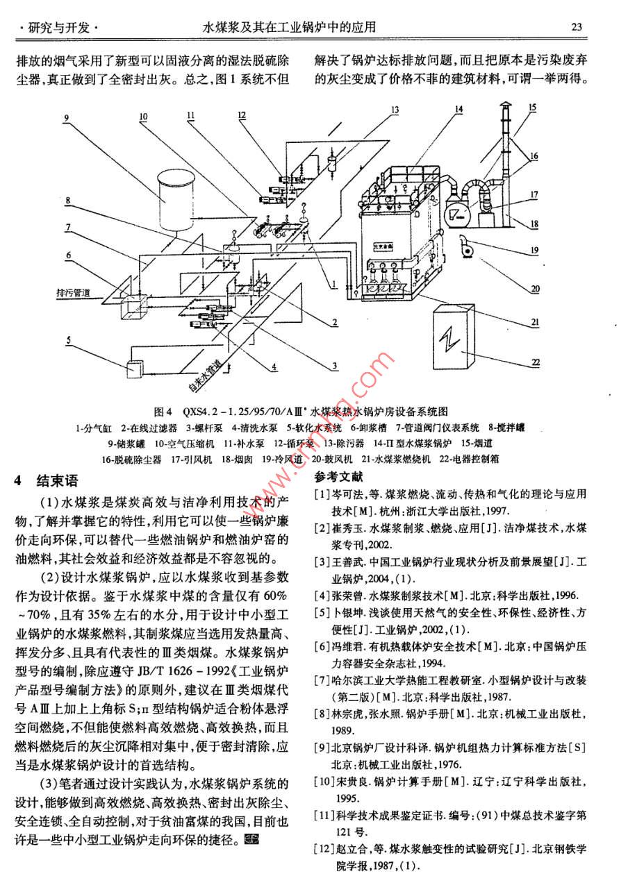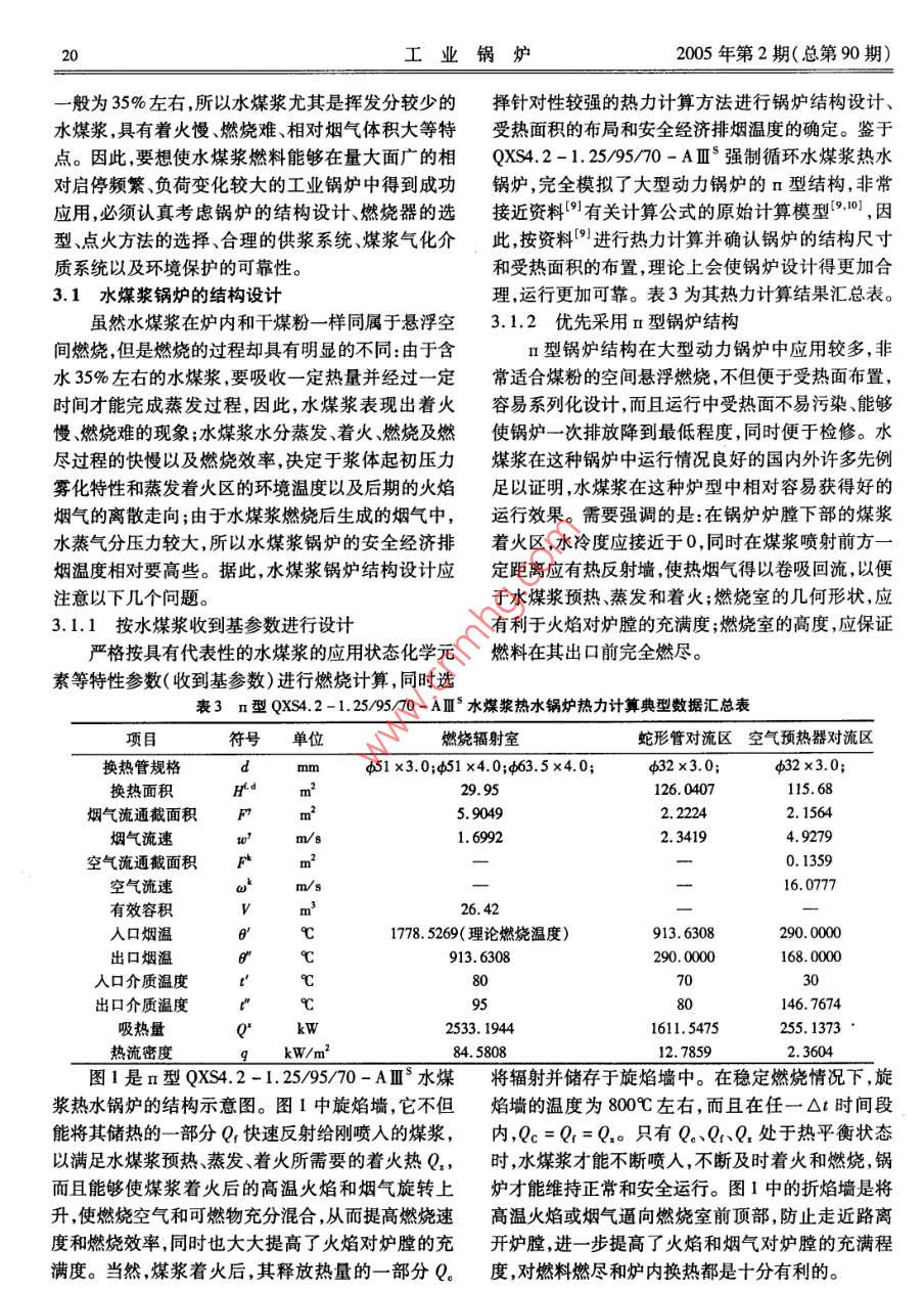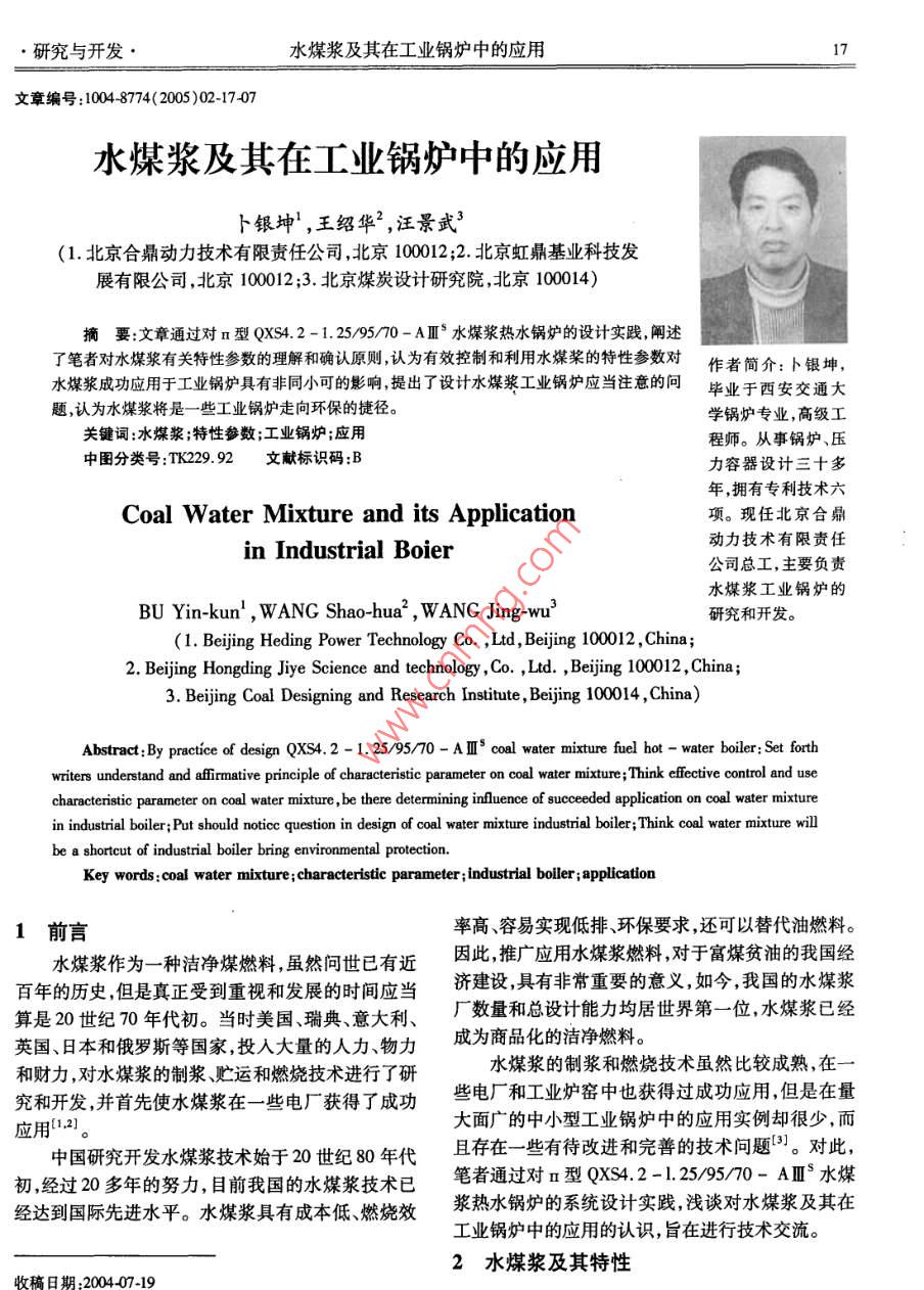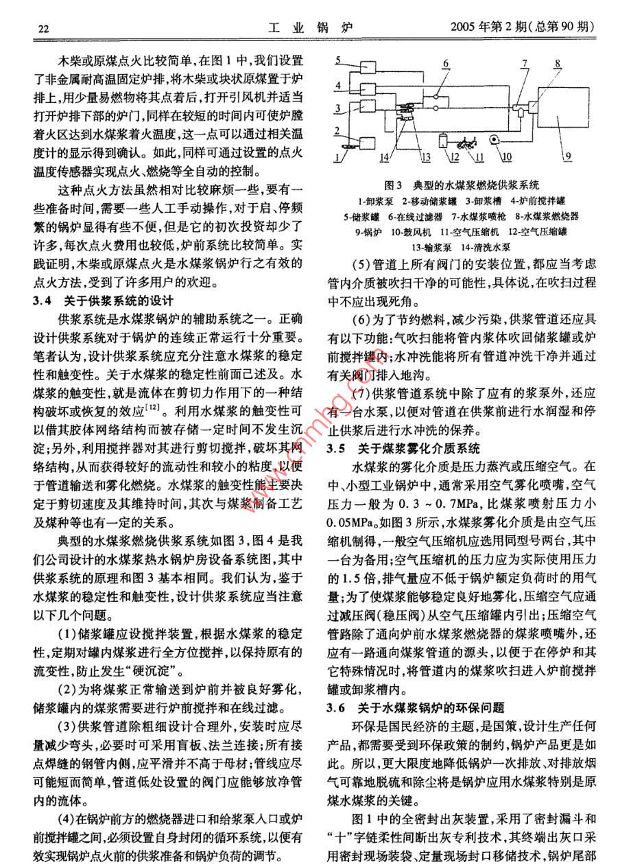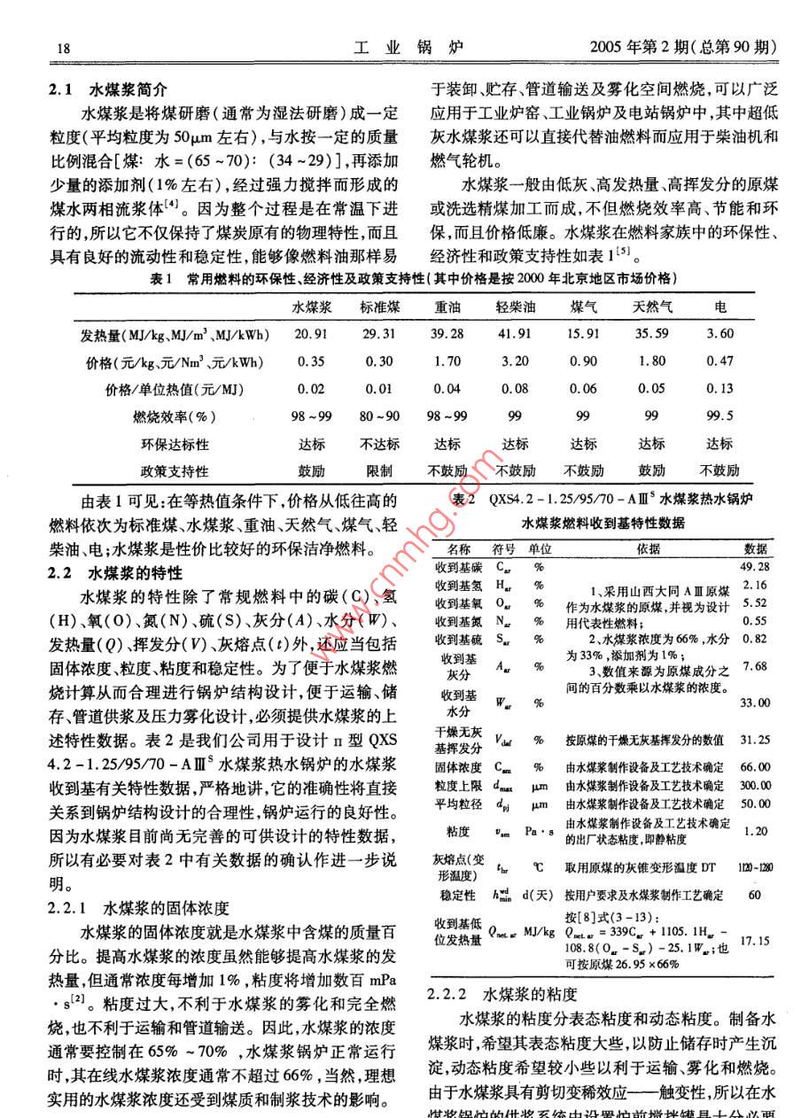 研究與開(kāi)發(fā)·水煤漿及其在工業(yè)鍋爐中的應(yīng)用文章編號(hào):10048774(2005)02-1707水煤漿及其在工業(yè)鍋爐中的應(yīng)用卜銀坤',王紹華2,汪景武3(1北京合鼎動(dòng)力技術(shù)有限責(zé)任公司,北京10002;2.北京虹鼎基業(yè)科技發(fā)展有限公司,北京100012;3.北京煤炭設(shè)計(jì)研究院,北京100014)摘要:文章通過(guò)對(duì)n型QXS4.2-1.25/9570-AⅢ°水煤漿熱水鍋爐的設(shè)計(jì)實(shí)踐闡述了筆者對(duì)水煤漿有關(guān)特性參數(shù)的理解和確認(rèn)原則,認(rèn)為有效控制和利用水煤槳的特性參數(shù)對(duì)作者簡(jiǎn)介:卜銀坤水煤漿成功應(yīng)用于工業(yè)鍋爐具有非同小可的影響提出了設(shè)計(jì)水煤漿工業(yè)鍋爐應(yīng)當(dāng)注意的問(wèn)畢業(yè)于西安交通大題,認(rèn)為水煤漿將是一些工業(yè)鍋爐走向環(huán)保的捷徑。學(xué)鍋爐專(zhuān)業(yè),高級(jí)工關(guān)鍵詞:水煤漿;特性參數(shù);工業(yè)鍋爐;應(yīng)用程師。從事鍋爐、壓中圖分類(lèi)號(hào):TK229文獻(xiàn)標(biāo)識(shí)碼:B力容器設(shè)計(jì)三十多年,擁有專(zhuān)利技術(shù)六Coal Water Mixture and its application項(xiàng)?,F(xiàn)任北京合鼎in industrial boier動(dòng)力技術(shù)有限責(zé)任公司總工,主要負(fù)責(zé)水煤漿工業(yè)鍋爐的BU Yin-kun', WANG Shao-hua, WANG Jing-wu'研究和開(kāi)發(fā)。(1. Beijing Heding Power Technology Co, Ltd, Beijing 100012, China;2. Beijing Hongding Jiye Science and technology, Co, Ltd, Beijing 100012, China3. Beijing Coal Designing and Research Institute, Beijing 100014, ChinaAbstract: By practice of design QXS42-1 25/95/70-A coal water mixture fuel hot-water boiler: Set forthwriters understand and affirmative principle of characteristic parameter on coal water mixture; Think effective control and usecharacteristic parameter on coal water mixture, be there determining influence of succeeded application on coal water mixturein industrial boiler Put should notice question in design of coal water mixture industrial boiler; Think coal water mixture willbe a shortcut of industrial boiler bring environmental protectionKey words: coal water mixture; characteristic parameter; industrial boller; application前言率高、容易實(shí)現(xiàn)低排、環(huán)保要求,還可以替代油燃料。水煤漿作為一種潔凈煤燃料雖然問(wèn)世已有近因此,推廣應(yīng)用水煤漿燃料,對(duì)于富煤貧油的我國(guó)經(jīng)百年的歷史,但是真正受到重視和發(fā)展的時(shí)間應(yīng)當(dāng)算是20世紀(jì)70年代初。當(dāng)時(shí)美國(guó)、瑞典、意大利、「數(shù)量和總設(shè)計(jì)能力均居世界第一位水煤漿已經(jīng)英國(guó)、日本和俄羅斯等國(guó)家投入大量的人力物力成為商品化的潔凈燃料。和財(cái)力,對(duì)水煤漿的制漿、貯運(yùn)和燃燒技術(shù)進(jìn)行了研水煤漿的制漿和燃燒技術(shù)雖然比較成熟,在究和開(kāi)發(fā),并首先使水煤漿在一些電廠獲得了成功些電廠和工業(yè)爐窯中也獲得過(guò)成功應(yīng)用,但是在量應(yīng)用12。大面廣的中小型工業(yè)鍋爐中的應(yīng)用實(shí)例卻很少,而中國(guó)研究開(kāi)發(fā)水煤漿技術(shù)始于20世紀(jì)80年代且存在一些有待改進(jìn)和完善的技術(shù)問(wèn)題。對(duì)此,初經(jīng)過(guò)20多年的努力,目前我國(guó)的水煤漿技術(shù)已筆者通過(guò)對(duì)n型QX42-1.25/95/70-AⅢ水煤經(jīng)達(dá)到國(guó)際先進(jìn)水平。水煤漿具有成本低、燃燒效漿熱水鍋爐的系統(tǒng)設(shè)計(jì)實(shí)踐淺談對(duì)水煤漿及其在工業(yè)鍋爐中的應(yīng)用的認(rèn)識(shí),旨在進(jìn)行技術(shù)交流。2水煤漿及其特性稿日期:20040工業(yè)鍋爐2005年第2期(總第90期)2.1水煤漿簡(jiǎn)介于裝卸、貯存、管道輸送及霧化空間燃燒,可以廣泛水煤漿是將煤研磨(通常為濕法研磨)成一定應(yīng)用于工業(yè)爐窯、工業(yè)鍋爐及電站鍋爐中,其中超低粒度(平均粒度為50μm左右),與水按一定的質(zhì)量灰水煤漿還可以直接代替油燃料而應(yīng)用于柴油機(jī)和比例混合[煤:水=(65~70):(34~29)],再添加燃?xì)廨啓C(jī)。少量的添加劑(1%左右),經(jīng)過(guò)強(qiáng)力攪拌而形成的水煤漿一般由低灰高發(fā)熱量、高揮發(fā)分的原煤煤水兩相流漿體4。因?yàn)檎麄€(gè)過(guò)程是在常溫下進(jìn)或洗選精煤加工而成,不但燃燒效率高、節(jié)能和環(huán)行的,所以它不僅保持了煤炭原有的物理特性,而且保,而且價(jià)格低廉。水煤漿在燃料家族中的環(huán)保性、具有良好的流動(dòng)性和穩(wěn)定性,能夠像燃料油那樣易經(jīng)濟(jì)性和政策支持性如表15。表1常用燃料的環(huán)保性、經(jīng)濟(jì)性及政策支持性(其中價(jià)格是按2000年北京地區(qū)市場(chǎng)價(jià)格)水煤漿標(biāo)準(zhǔn)煤重油輕柴油煤氣天然氣發(fā)熱量(M/kg、MJ/m3MkWh)20.9129.31392841.915.9135.593.60價(jià)格(元/kg元/Nm3元/kWh)0.353,200.47價(jià)格/單位熱值(元/M)0.020.010.080.060.050.13燃燒效率(%)98~9980-9098-999999環(huán)保達(dá)標(biāo)性達(dá)標(biāo)不達(dá)標(biāo)達(dá)標(biāo)達(dá)標(biāo)達(dá)標(biāo)達(dá)標(biāo)政策支持性鼓勵(lì)限制不鼓勵(lì)不鼓勵(lì)不鼓勵(lì)鼓勵(lì)不鼓勵(lì)由表1可見(jiàn):在等熱值條件下,價(jià)格從低往高的表2QXs4.2-1.2595/70-AⅢ水煤漿熱水鍋爐燃料依次為標(biāo)準(zhǔn)煤、水煤漿、重油、天然氣煤氣