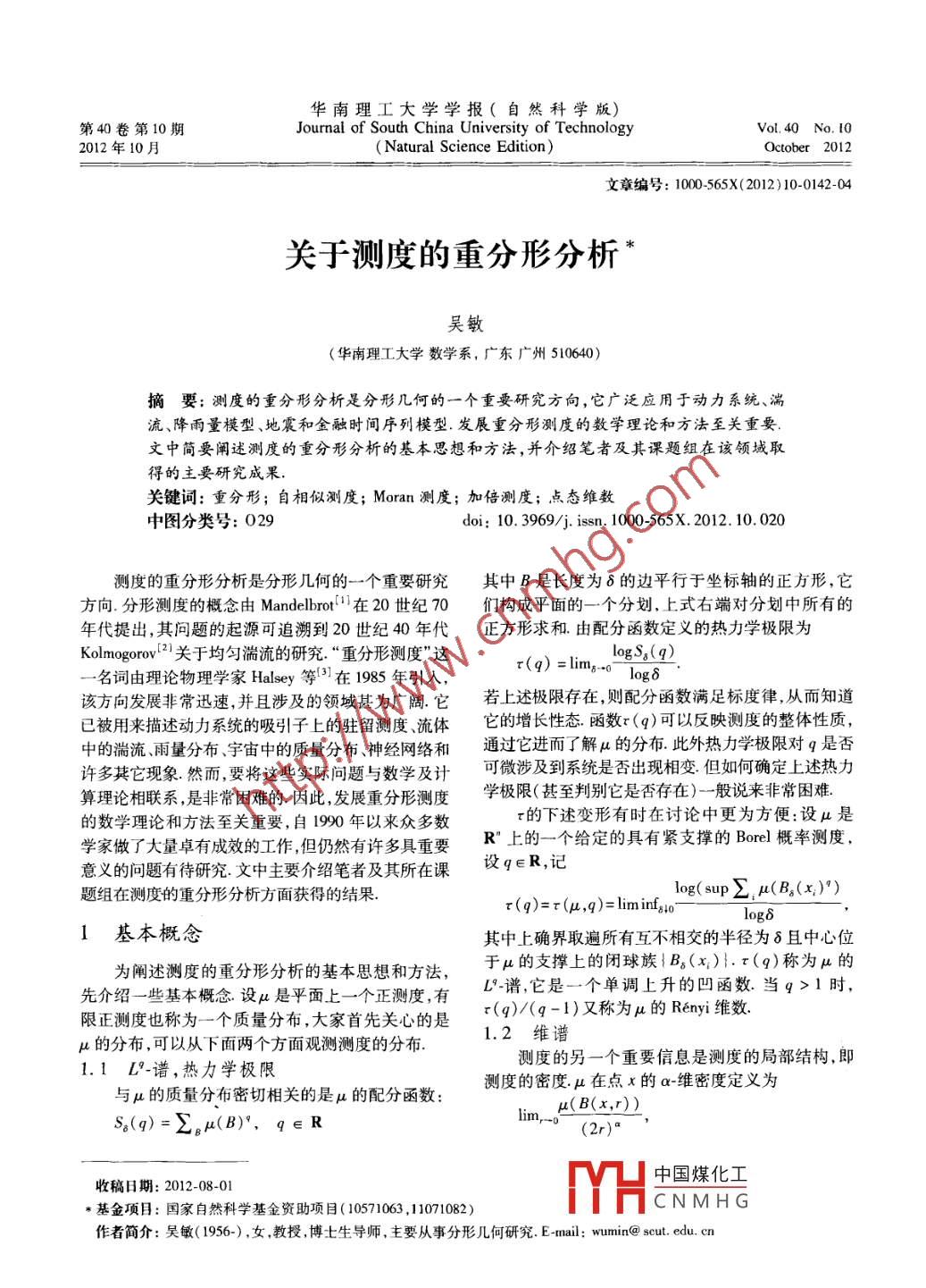 華南理工大學學報(自然科學版)第40卷第10期Journal of South China University of TechnologyVoL, 40 No 102012年10月Natural Science Edition)October 2012文章編號:1000-565X(2012)10-0142-04關于測度的重分形分析吳敏(華南理工大學數(shù)學系,廣東廣州510640)摘要:測度的重分形分析是分形幾何的一個重要研究方向,它廣泛應用于動力系統(tǒng)、湍流、降雨量模型、地震和金融時間序列模型.發(fā)展重分形測度的數(shù)學理論和方法至關重要文中簡要闡述測度的重分形分析的基本思想和方法,并介紹筆者及其課題組在該領域取得的主要研究成果關鍵詞:重分形;自相似測度; Moran測度;加倍測度;點態(tài)維數(shù)中圖分類號:029doi:10.3969/ J. Issn.1000565X.2012.10.020測度的重分形分析是分形幾何的一個重要研究其中B是長度為δ的邊平行于坐標軸的正方形,它方向分形測度的概念由 Mandelbrot l在20世紀70們構成平面的一個分劃,上式右端對分劃中所有的年代提出,其問題的起源可追溯到20世紀40年代正方形求和由配分函數(shù)定義的熱力學極限為Kolmogorov2關于均勻湍流的研究.“重分形測度”這log Sa(q)名詞由理論物理學家 Halsey等在1985年引人,t(9)=limg--o log 8該方向發(fā)展非常迅速,并且涉及的領域甚為廣闊它若上述極限存在則配分函數(shù)滿足標度律從而知道已被用來描述動力系統(tǒng)的吸引子上的駐留測度、流體它的增長性態(tài)函數(shù)x(q)可以反映測度的整體性質,中的湍流、雨量分布、宇宙中的質量分布神經網絡和通過它進而了解H的分布此外熱力學極限對q是否許多共它現(xiàn)象.然而,要將這些實際問題與數(shù)學及計可微涉及到系統(tǒng)是否出現(xiàn)相變.但如何確定上述熱力算理論相聯(lián)系是非常困難的因此,發(fā)展重分形測度學極限(甚至判別它是否存在)一般說來非常困難的數(shù)學理論和方法至關重要,自1990年以來眾多數(shù)的下述變形有時在討論中更為方便:設是學家做了大量卓有成效的工作,但仍然有許多具重要R上的一個給定的具有緊支撐的 Borel概率測度,意義的問題有待研究.文中主要介紹筆者及其所在課沒q∈R,記題組在測度的重分形分析方面獲得的結果.log(sup∑H(B2(x))r()=r(u, q)=lim infs4ologδ1基本概念其中上確界取遍所有互不相交的半徑為8且中心位為闡述測度的重分形分析的基本思想和方法,于的支撐上的閉球族B(x)}.r(q)稱為μ的先介紹一些基本概念設是平面上一個正測度,有L”譜,它是一個單調上升的凹函數(shù).當q>1時,限正測度也稱為一個質量分布,大家首先關心的是(q)/(q-1)又稱為H的 Renyi維數(shù)的分布,可以從下面兩個方面觀測測度的分布2維譜1.1L9-譜,熱力學極限測度的另一個重要信息是測度的局部結構,即與μ的質量分布密切相關的是的配分函數(shù)測度的密度在點x的a-維密度定義為B(x, r))S8(q)=∑H(B),q∈R(2r)4收稿日期:2012-08-01中國煤化工基金項目:國家自然科學基金資助項目(10571063,11071082)CNMHG作者簡介:吳敏(1956-),女,教授,博士生導師,主要從事分形幾何研究.E-mail:wumin@seut.edu.cn第10期吳敏:關于測度的重分形分析143其中B(x,r)表示以點x為中心、r為半徑的球.在此情形,對于很小的r,(B(x,))≈r,因此若知道2測度的重分形分析研究成果在每一點的密度,的分布就清楚了但是,確定測2.1自相似測度研究成果度在一點的密度是一個非常困難的問題,除非它像自相似測度的研究成果主要包括以下幾個方面正 Lebesgue測度那樣均勻分布.下面介紹一種目前(1)對滿足開集條件的自相似測度, Arbeiter在重分形分析中經常遇到同時也更容易處理的情等證明了其L譜存在并等于其重分形譜.當開集形設n為一個正整數(shù),是R上的一個具有緊支條件不滿足時,其L譜的存在性及上、下L譜的估撐的 Borel概率測度.設x∈R",記計都是困難的Oen在q≥1時給出了不滿足任logu(B,(x))d(u, x)=lim,-0-何分離條件的自相似測度的上、下L-譜的估計.我們希望知道當q<1時的相應結果事實上,當q<如果上述極限存在,則稱d(,x)為測度在點x處時,L譜對測度μ的微小變化非?!懊舾小?此時對的點態(tài)維數(shù)(或局部維數(shù)).如果不存在,則分別用譜的研究更加困難, Olsen的方法已不再適用d(μ,x)、d(μ,x)表示相應的上、下極限,并稱它們?yōu)樵谖墨I[9]中,通過引進上覆蓋和上填充 Renyi維數(shù),μ在點x處的上、下點態(tài)維數(shù)點態(tài)維數(shù)的大小反映并建立它們與上、下L譜的關系,將問題轉化為較了測度的局部分布性態(tài).為進一步分析測度的點態(tài)易處理的上覆蓋和上填充 Renyi維數(shù),從而得到q<1維數(shù)的分布規(guī)律,對于a≥0,定義時上、下L→譜的非平凡的上、下界估計.作為一個應E(a)=|x∈R";d(u,x)=a用,筆者及其課題組得到任意自相似測度重分形譜M (a)=dimu(e(a)),的一個非平凡上界,還討論了一些有趣的例子.稱f(a)為的 Hausdorff維譜.這樣,整個空間R(2)當q>0時,若開集條件滿足, Olsen10得到被分解為R"=Ua0E2(a)由于在E(a)上的任了自相似測度的L.譜的收斂速率,并證明了其重分點的局部分布性態(tài)相近我們希望知道E(a)的形矩測度弱收斂到規(guī)范重分形測度.當q<0時,O大小”、變化規(guī)律以及它與μ整體性質的聯(lián)系.這sen給出了兩個猜想確實,當q<0時L譜對測度正是測度的重分形分析的主要研究內容之μ的微小變化相當敏感,因此對其的分析一般被認1.3 Legendre變換與重分形機理為相當困難,此時 Olsen的處理方法已失